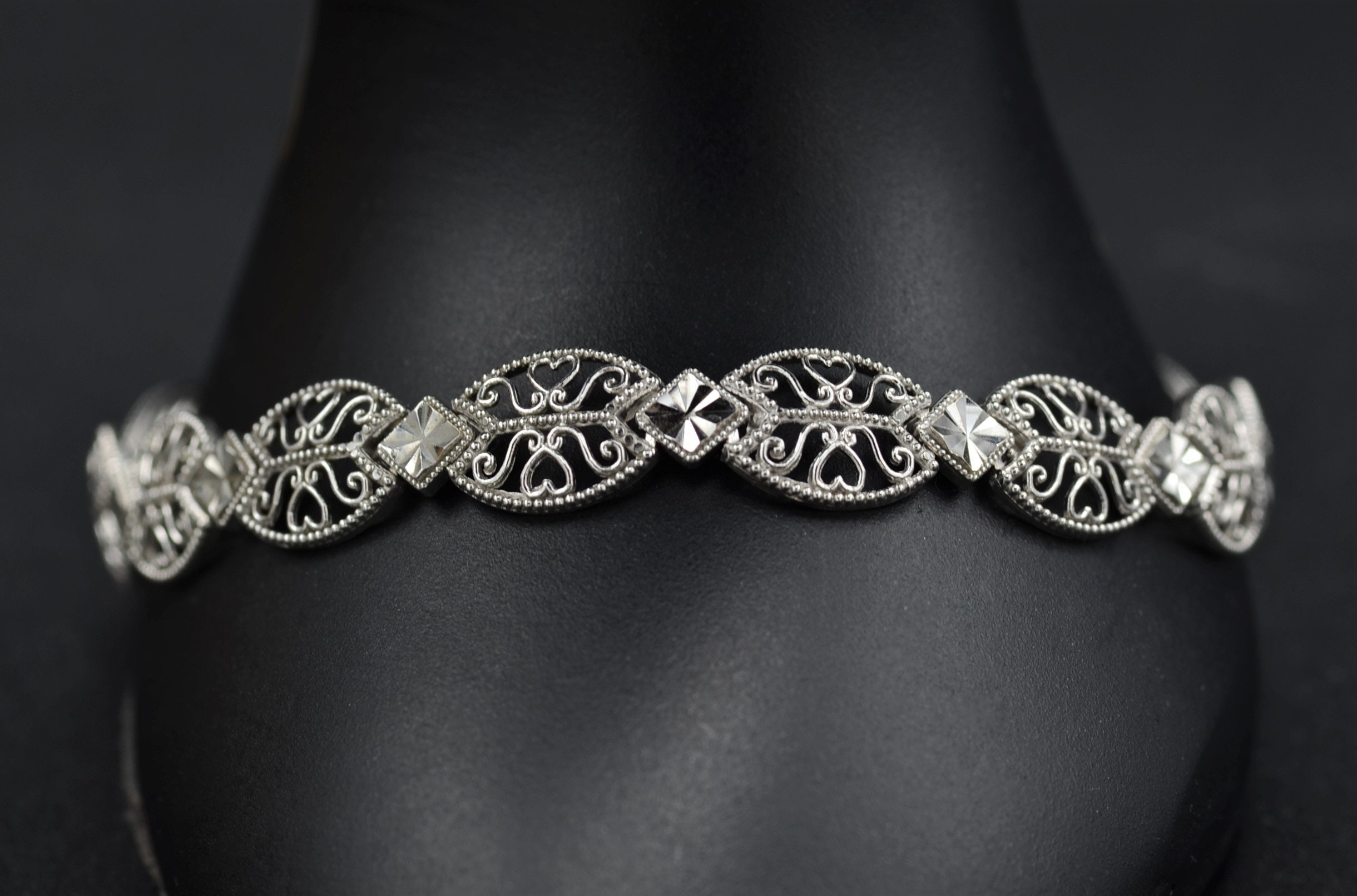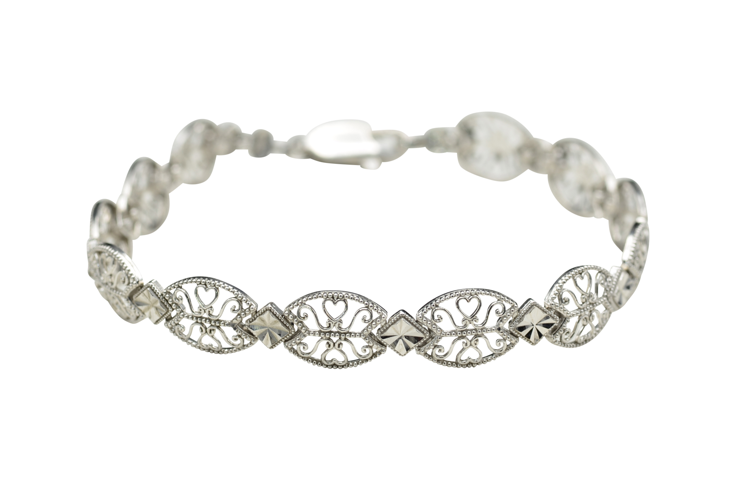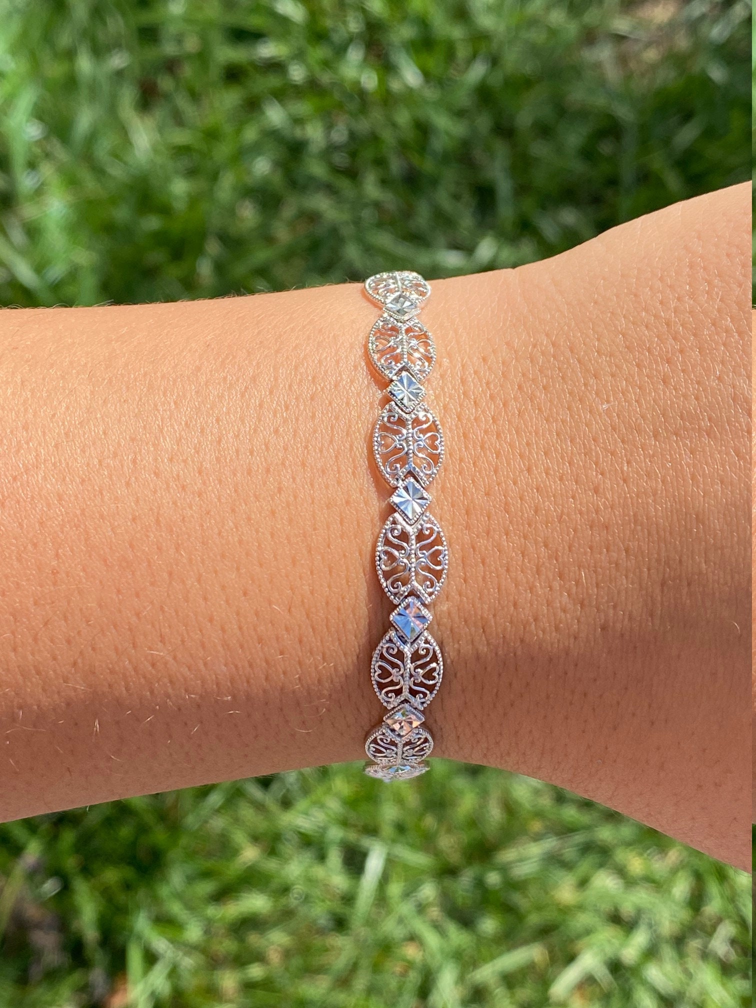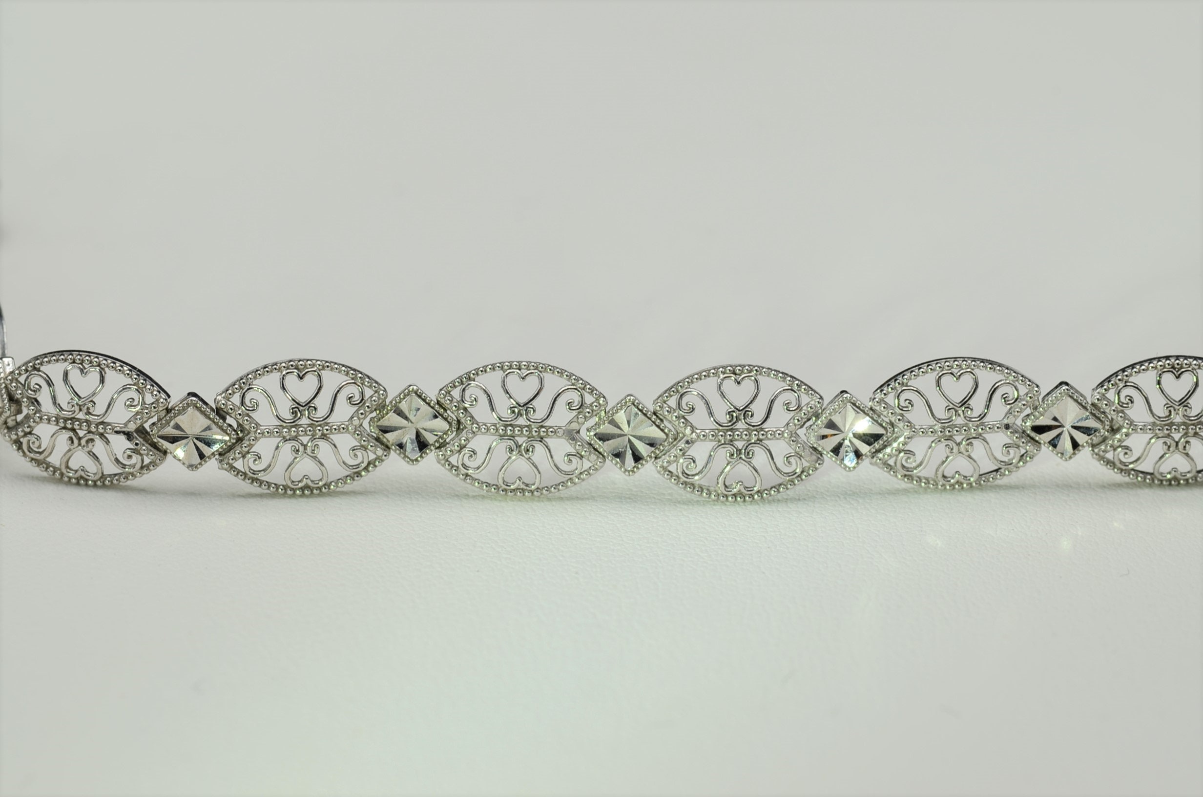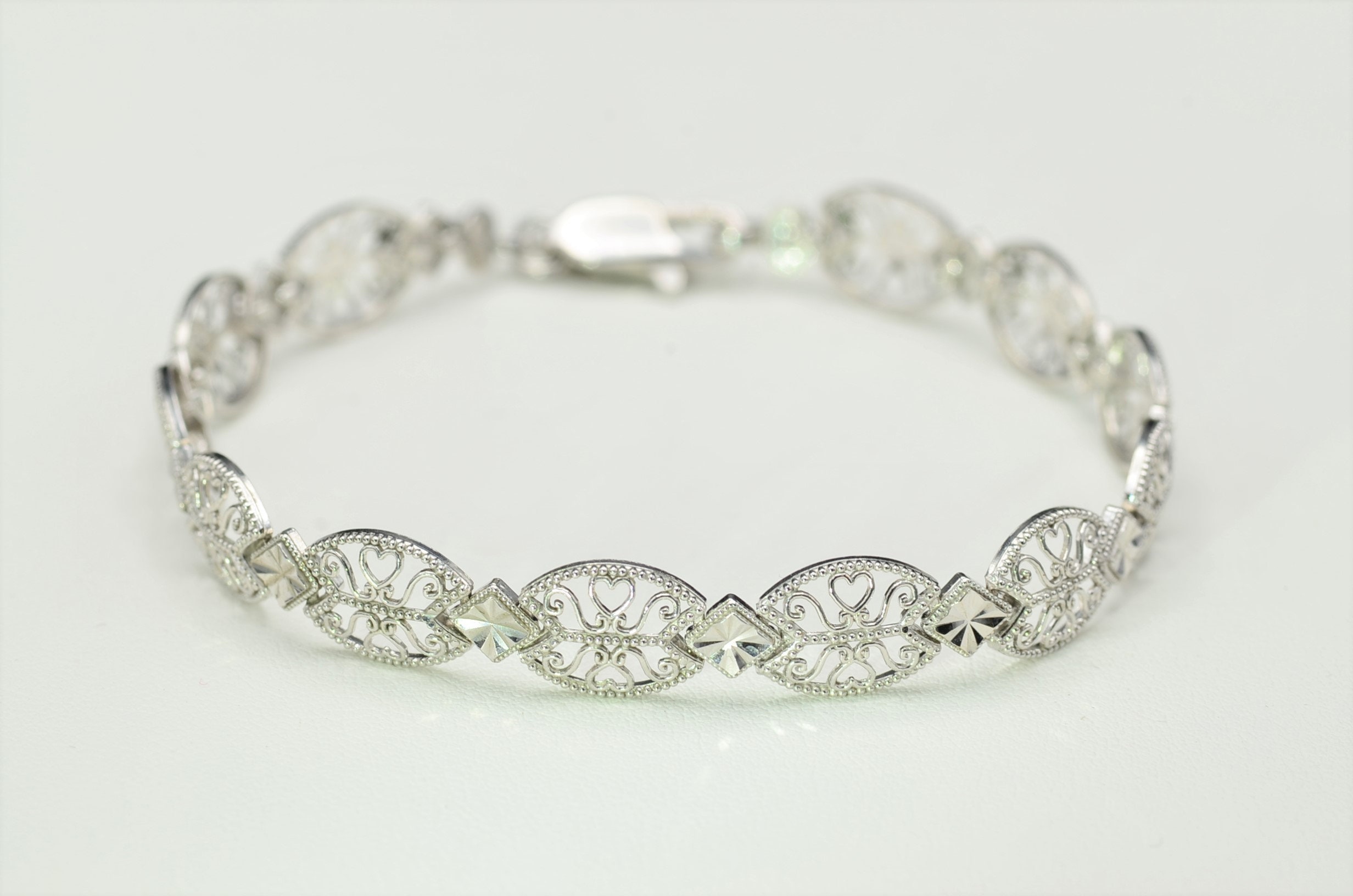 Vintage 14K White Gold Filigree and Diamond Cut Bracelet. Crafted in 14 karat white gold, this delicate bracelet makes the perfect bridal piece or something for that special occasion. Measuring 7 inches in length, this bracelet is decorated throughout with astounding filigree and milgrain work. The art of diamond cutting gives the piece a stunning glow in the light.