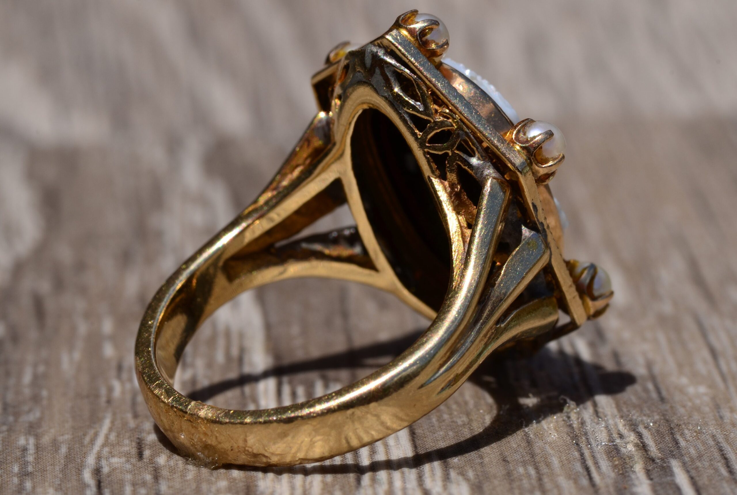 Antique Filigree Cameo Ring finished with six Pearls surrounding the center. The center is a hand carved cameo. Surrounding the center between the pearls is an intricate filigree pattern. The ring is crafted in 14 karat yellow gold and is very comfortable to wear. This ring is currently a finger size 6 3/4, but can be adjusted in size.