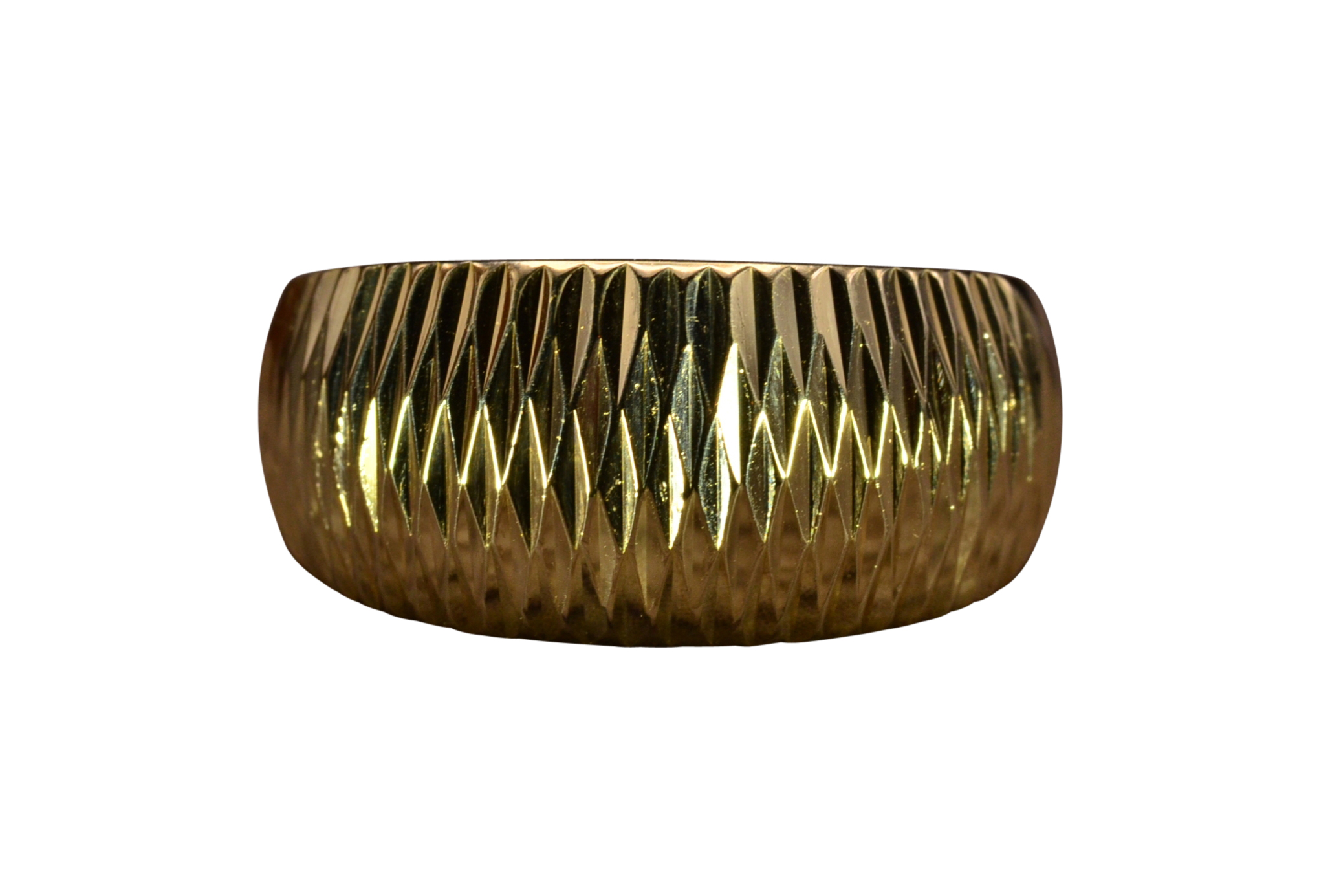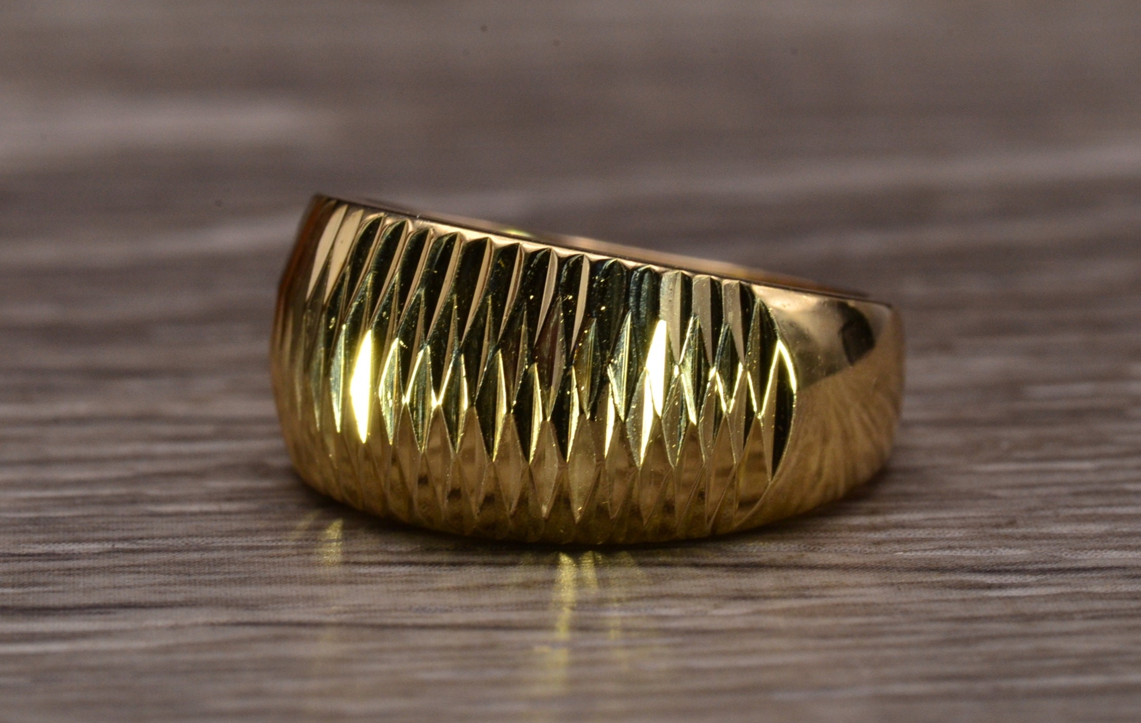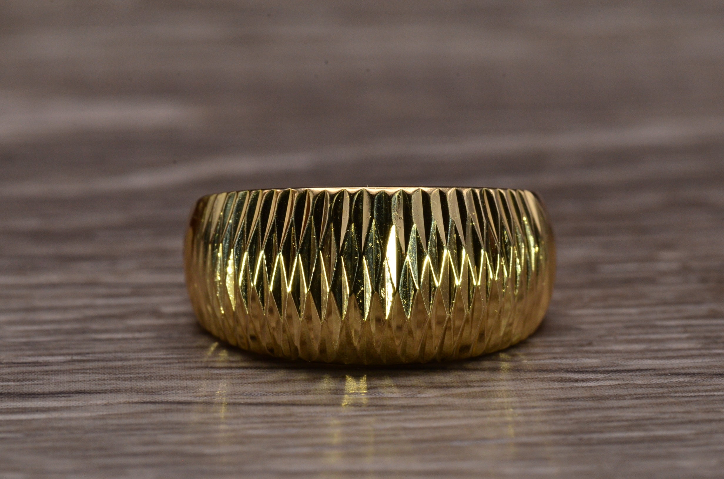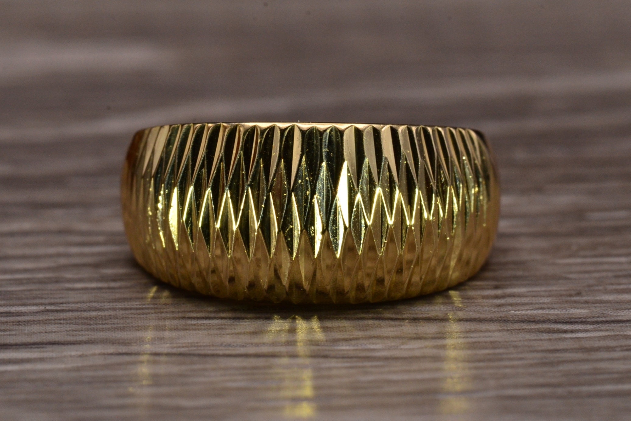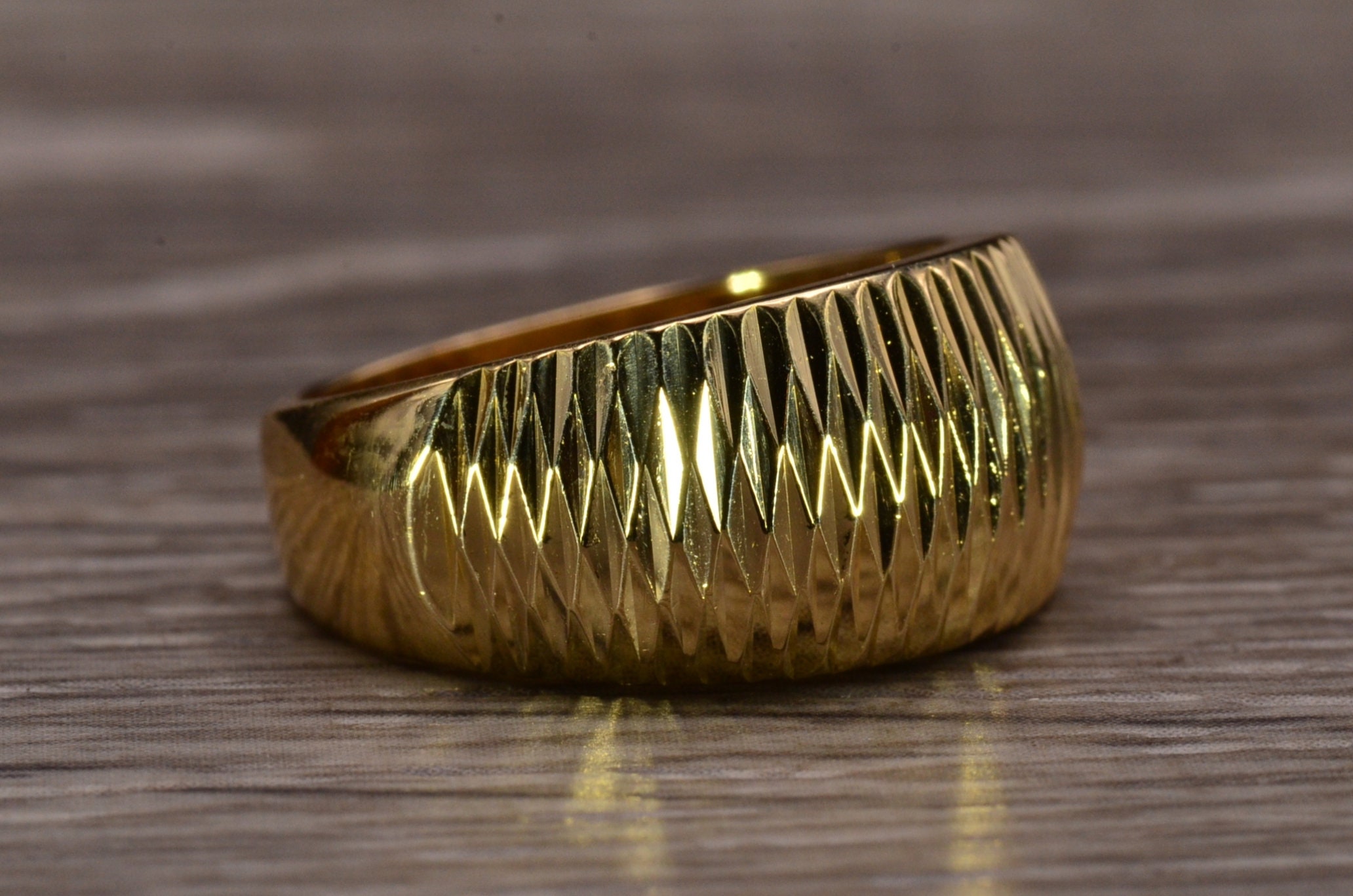 The Haugton Street: Ladies 14K Diamond Cut Wide Band. Crafted in 14 karat yellow gold, this wide band features a diamond cut design across the top, catching the light at every angle. Measuring 10.5mm at it’s widest part, this band is a statement piece that is also comfortable to wear. Currently a finger size 8, this ring can be resized for an additional charge.