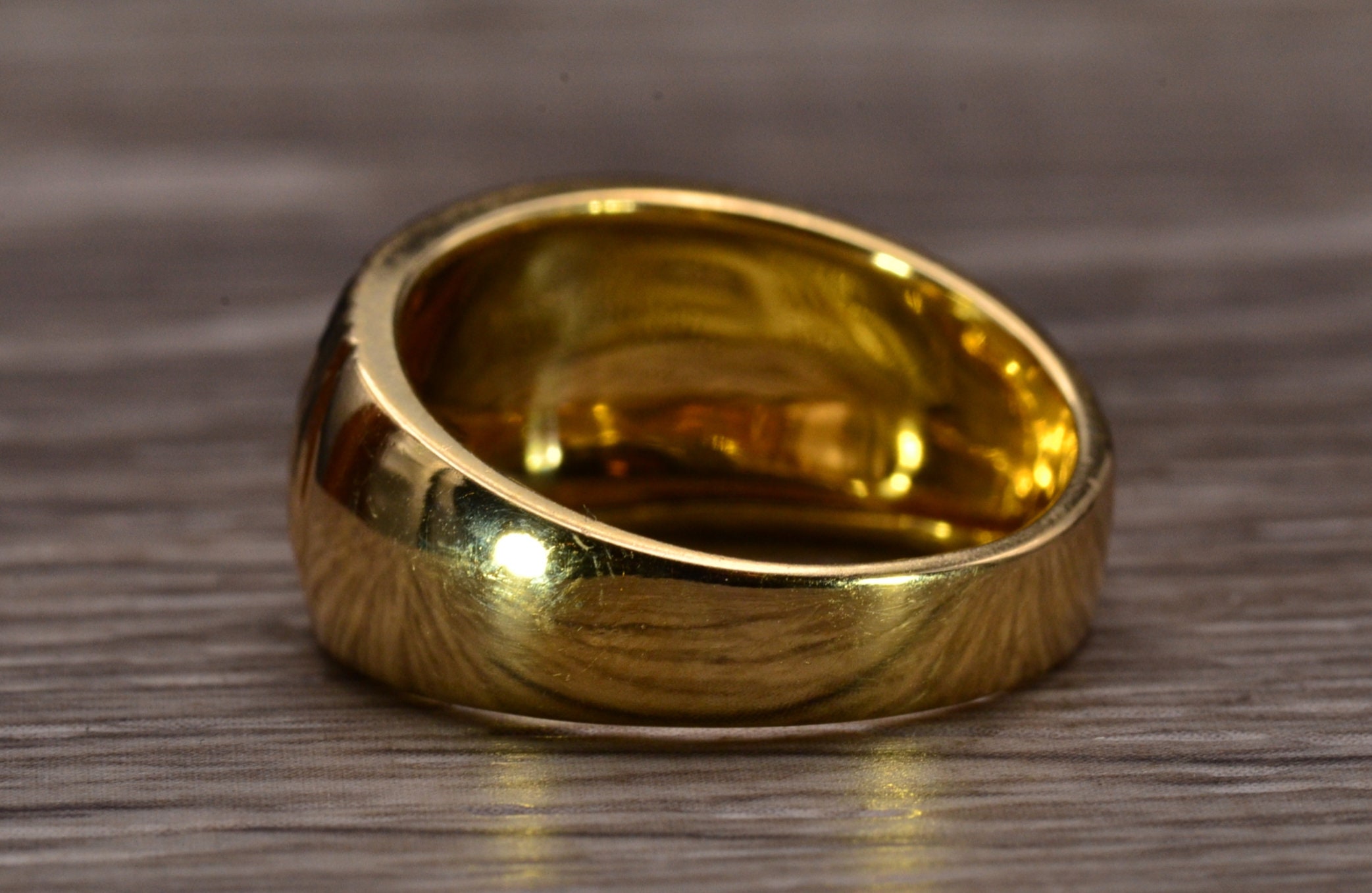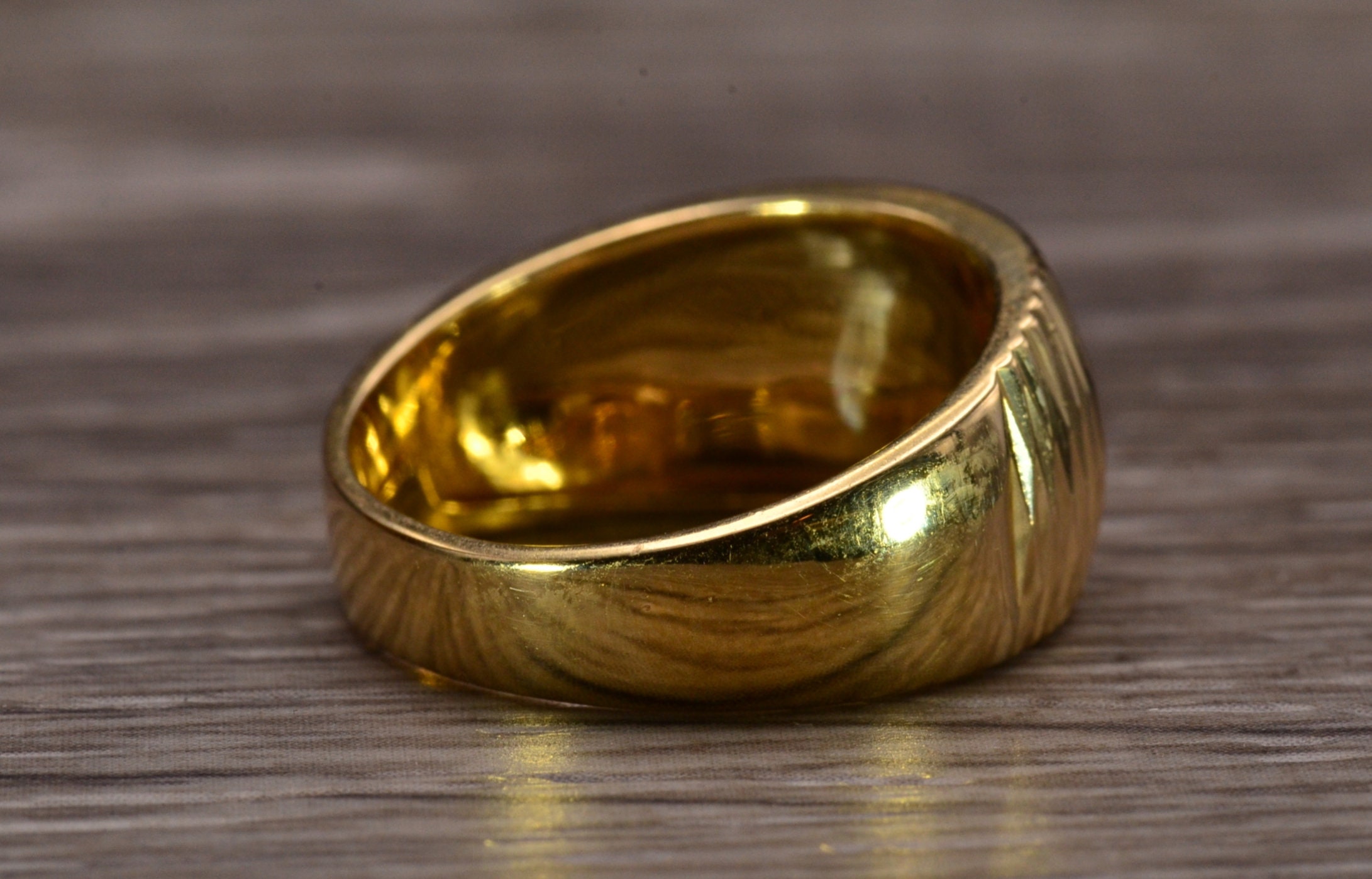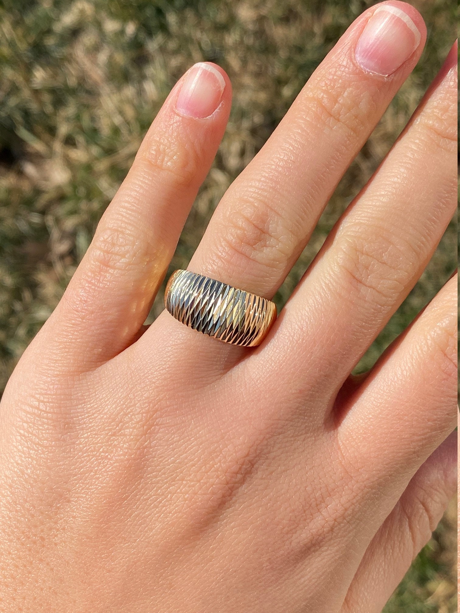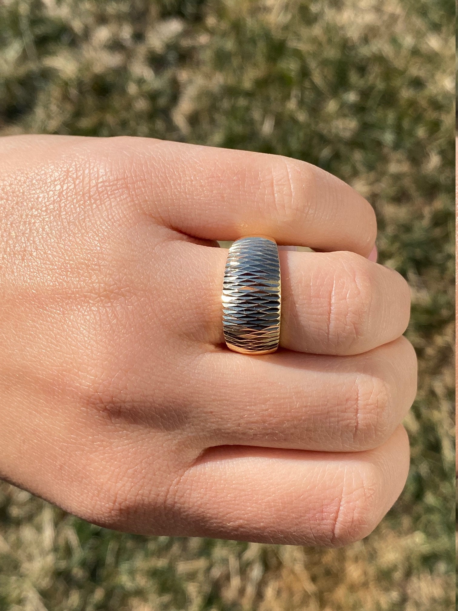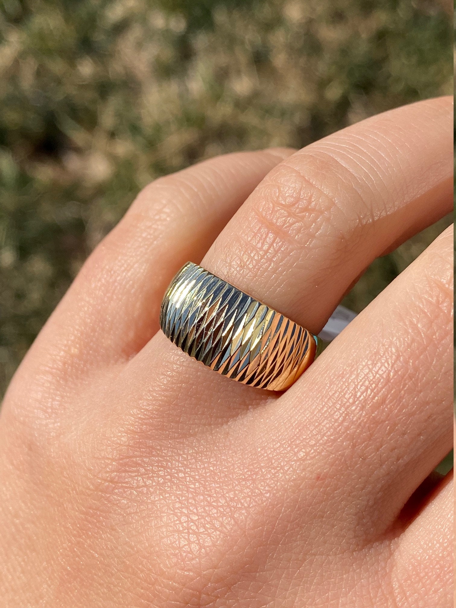 The Haugton Street: Ladies 14K Diamond Cut Wide Band. Crafted in 14 karat yellow gold, this wide band features a diamond cut design across the top, catching the light at every angle. Measuring 10.5mm at it’s widest part, this band is a statement piece that is also comfortable to wear. Currently a finger size 8, this ring can be resized for an additional charge.