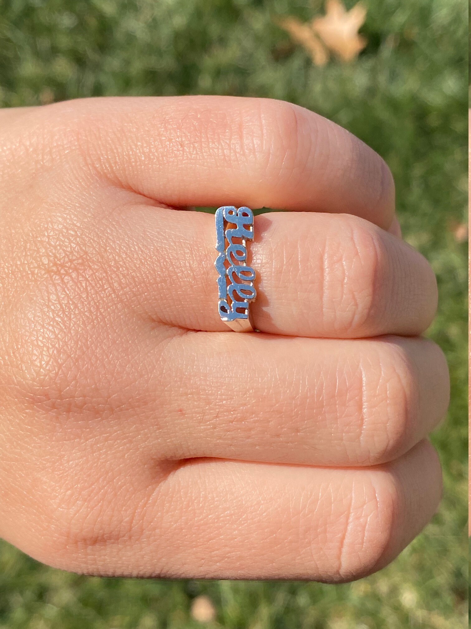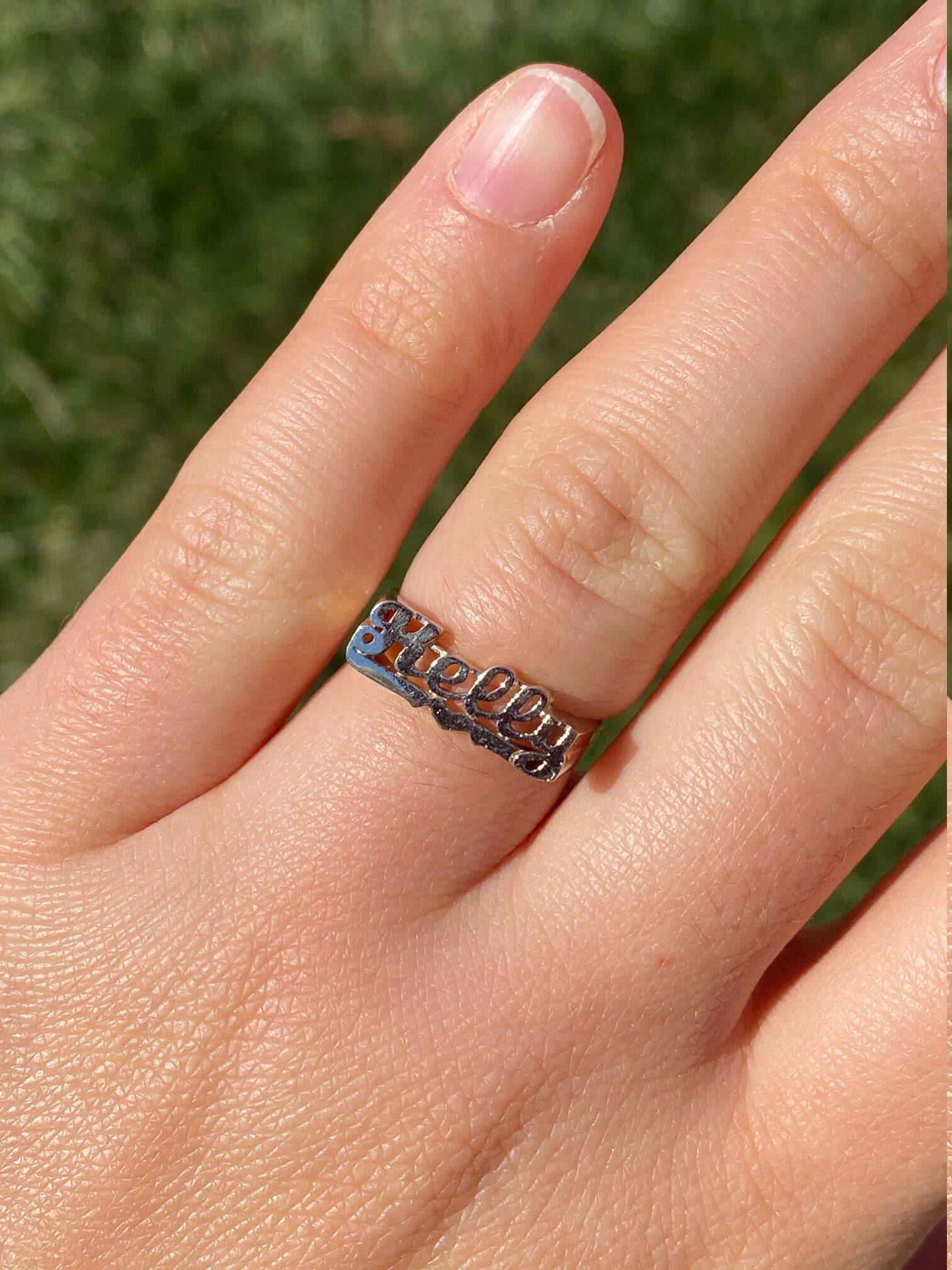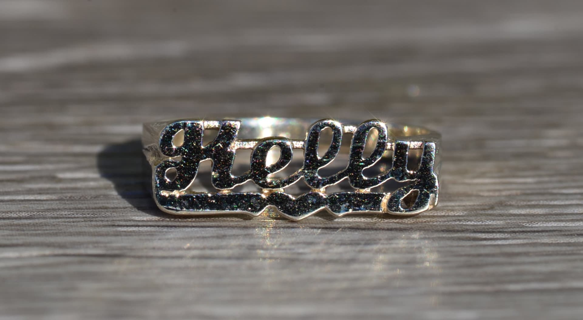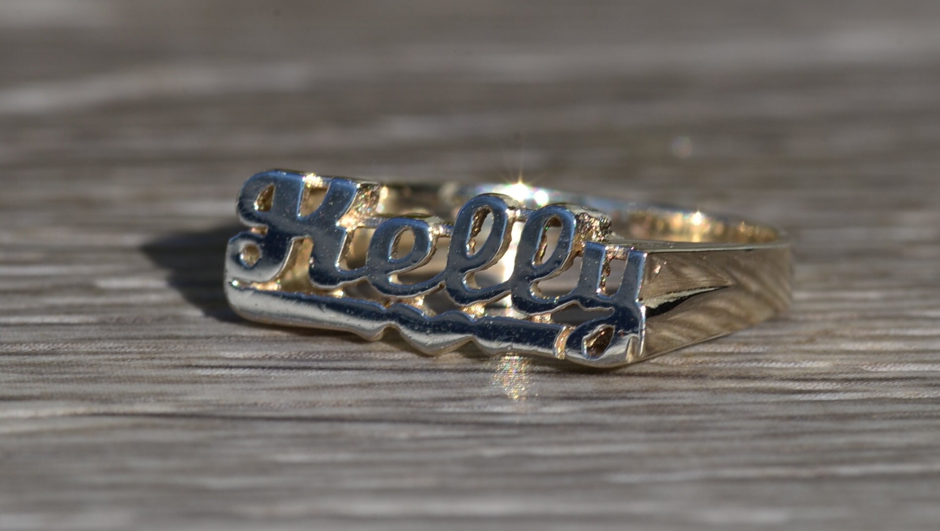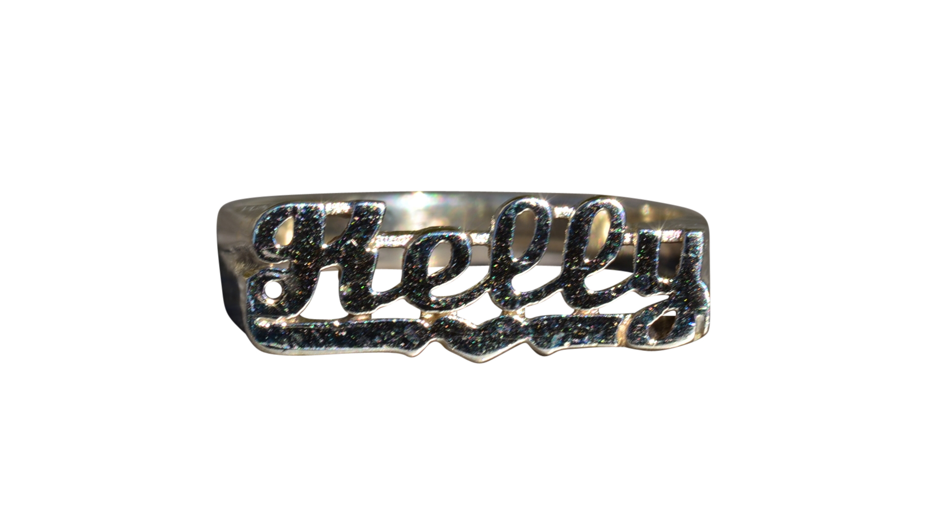 The Kelly: Ladies 14K White Gold Kelly Name Ring. Crafted in 14 karat white gold, this ladies name ring features the name Kelly in script font. Currently a finger size 6, this ring can be resized for an additional charge.