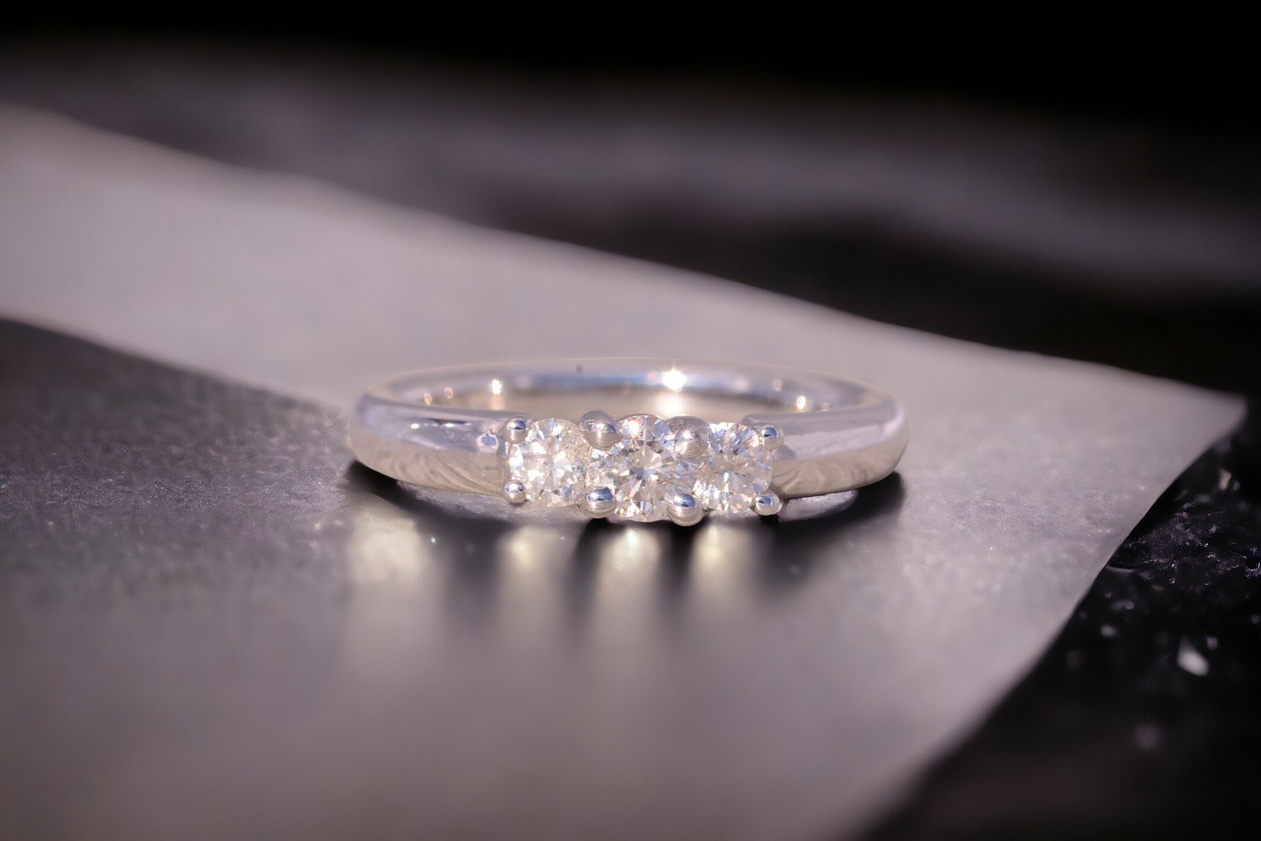The Kelowna: Three-Stone Natural Diamond Ring in White Gold. This elegant trilogy ring showcases a stunning 0.22 carat round brilliant cut natural diamond at its center, flanked by two smaller round brilliant cut natural diamonds, each weighing approximately 0.12 carats. The diamonds boast an approximate Gemological Institute of America clarity grade of I1 and a color grade of I, radiating brilliance and sparkle. Crafted with precision in lustrous 14 karat white gold, this ring exudes sophistication and charm. Currently sized at 6.75, it offers the option for adjustment to any finger size for an additional fee upon request.