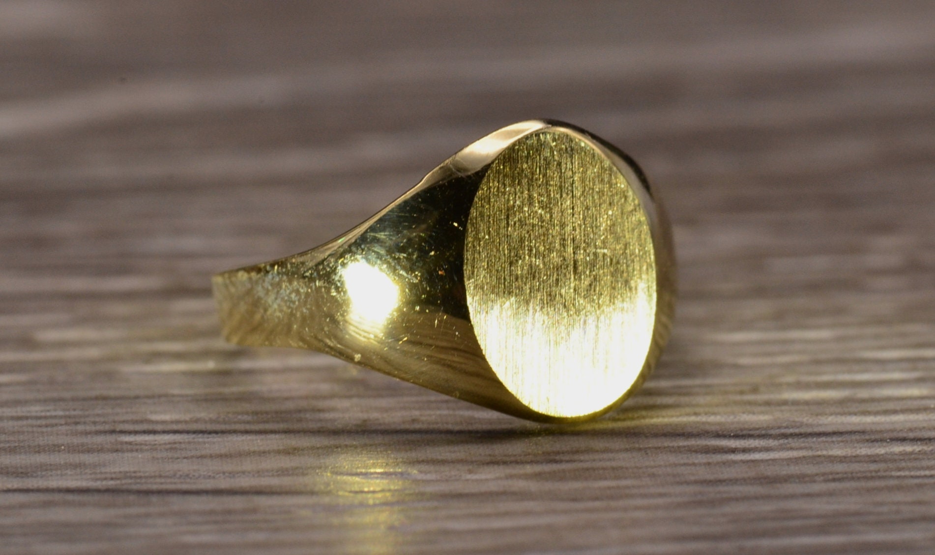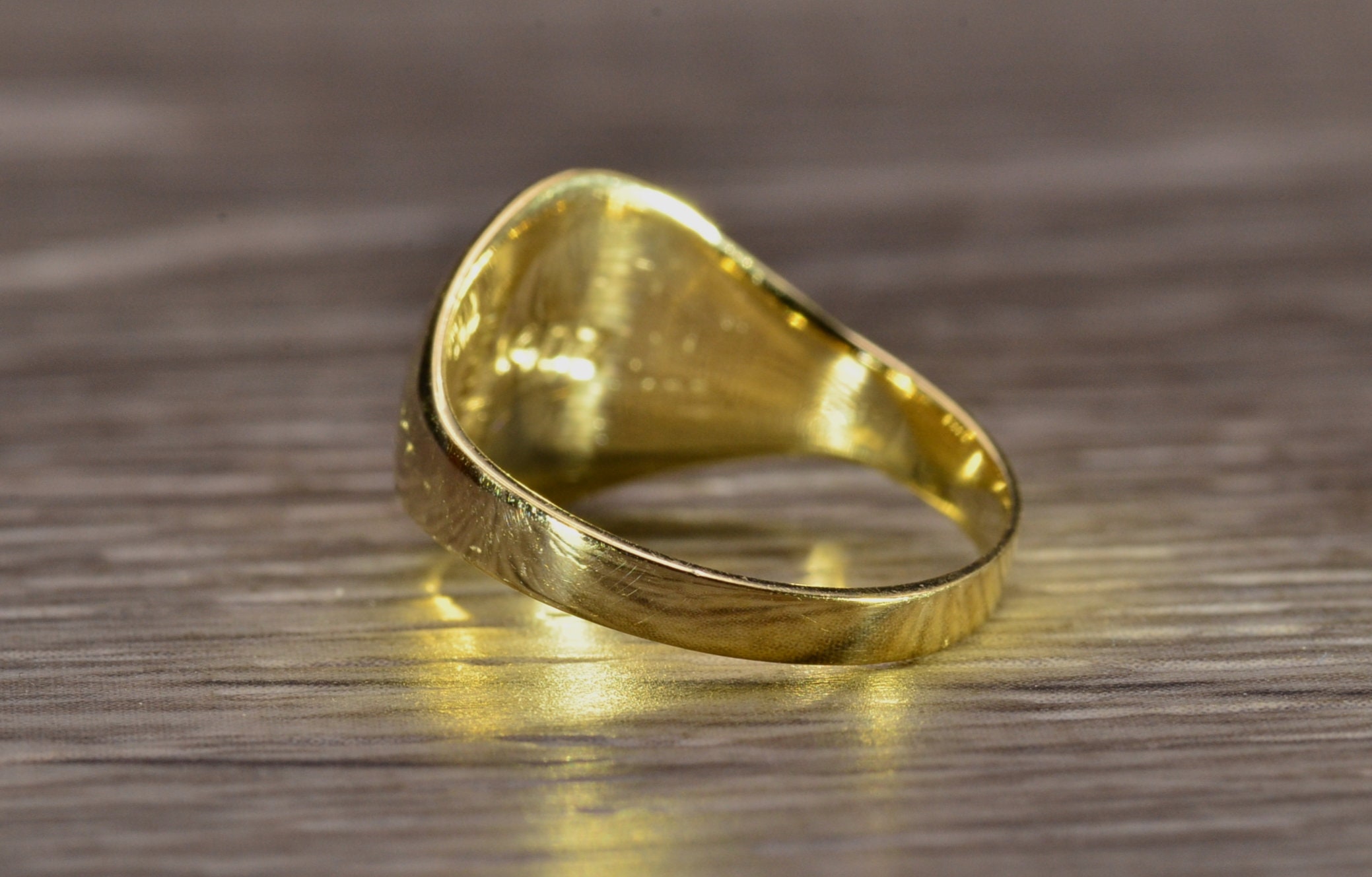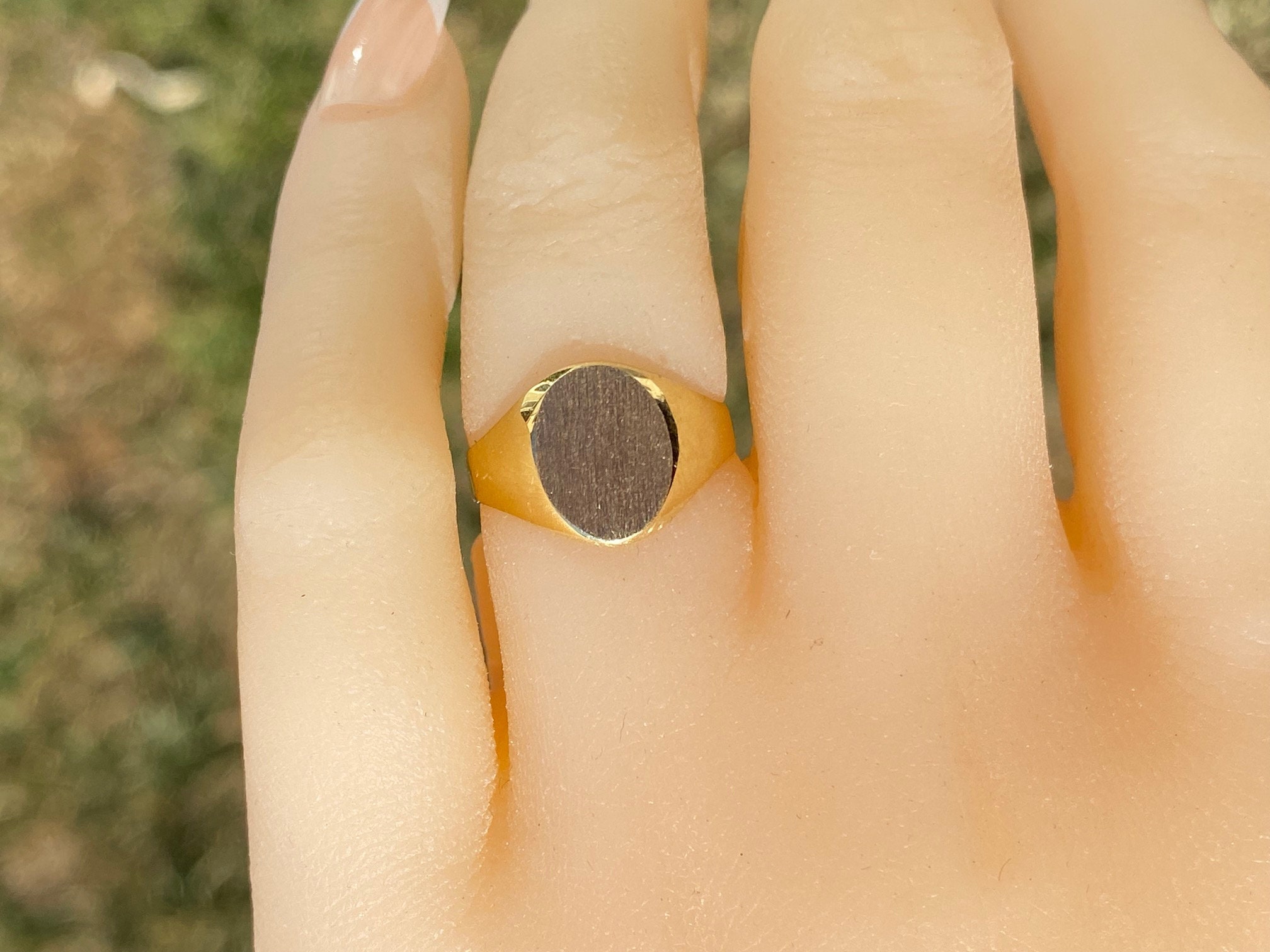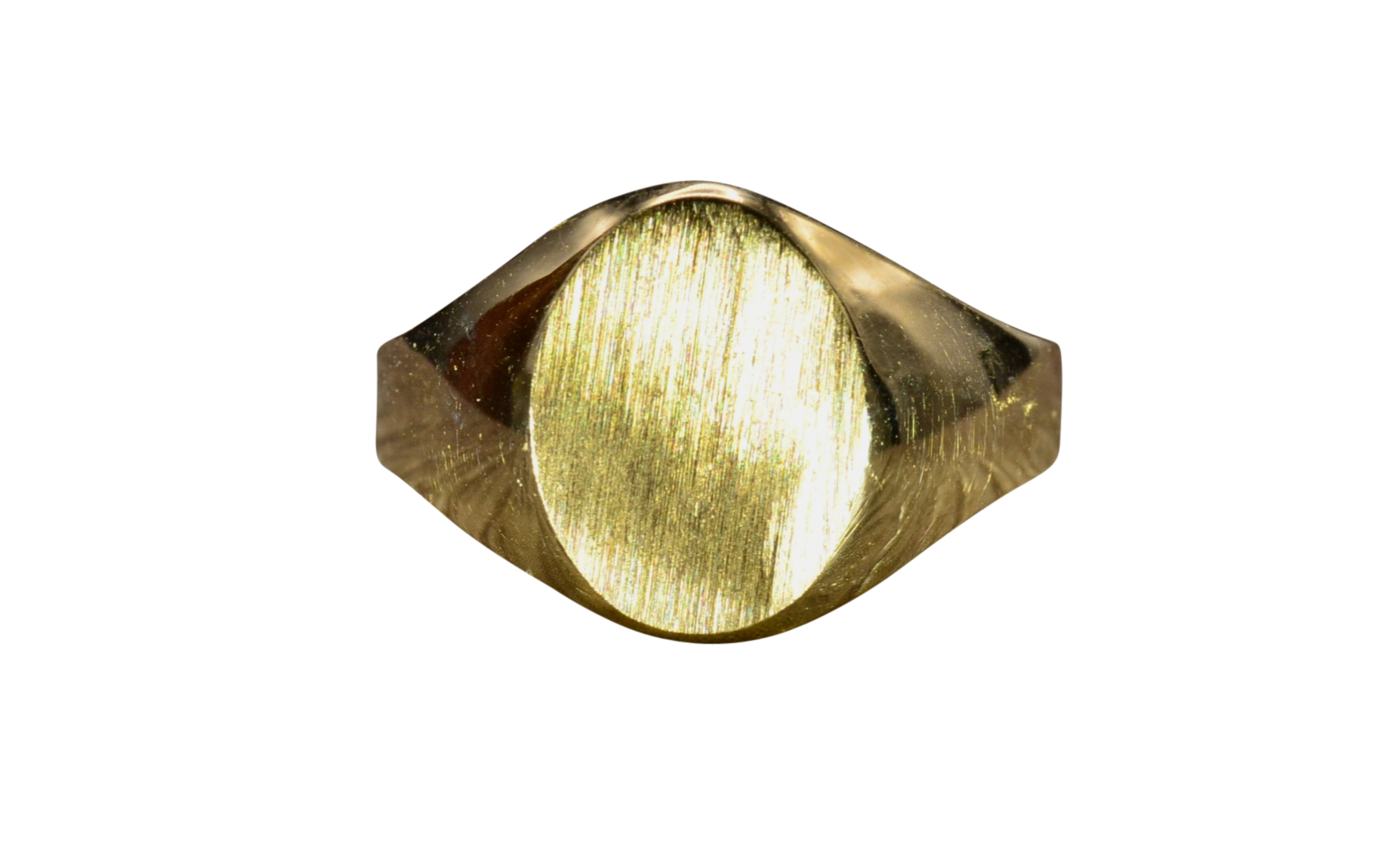 The Kenner: 14K Yellow Gold Engravable Signet Ring. Wonderfully crafted in 14 karat yellow gold, this signet ring features an untouched textured top ready to be engraved with whatever you would like. Currently a finger size 4.5, this ring can be resized for an additional charge. Inquire today regarding engraving options and prices!