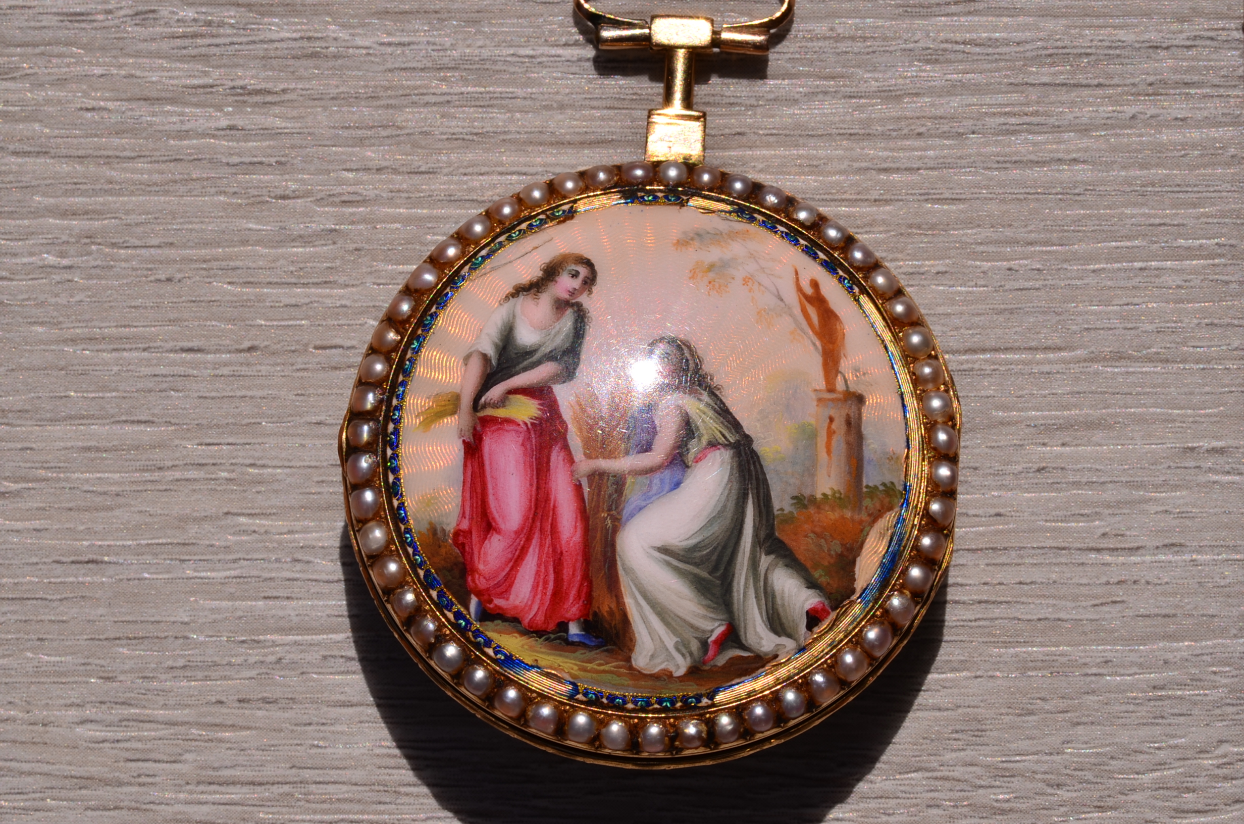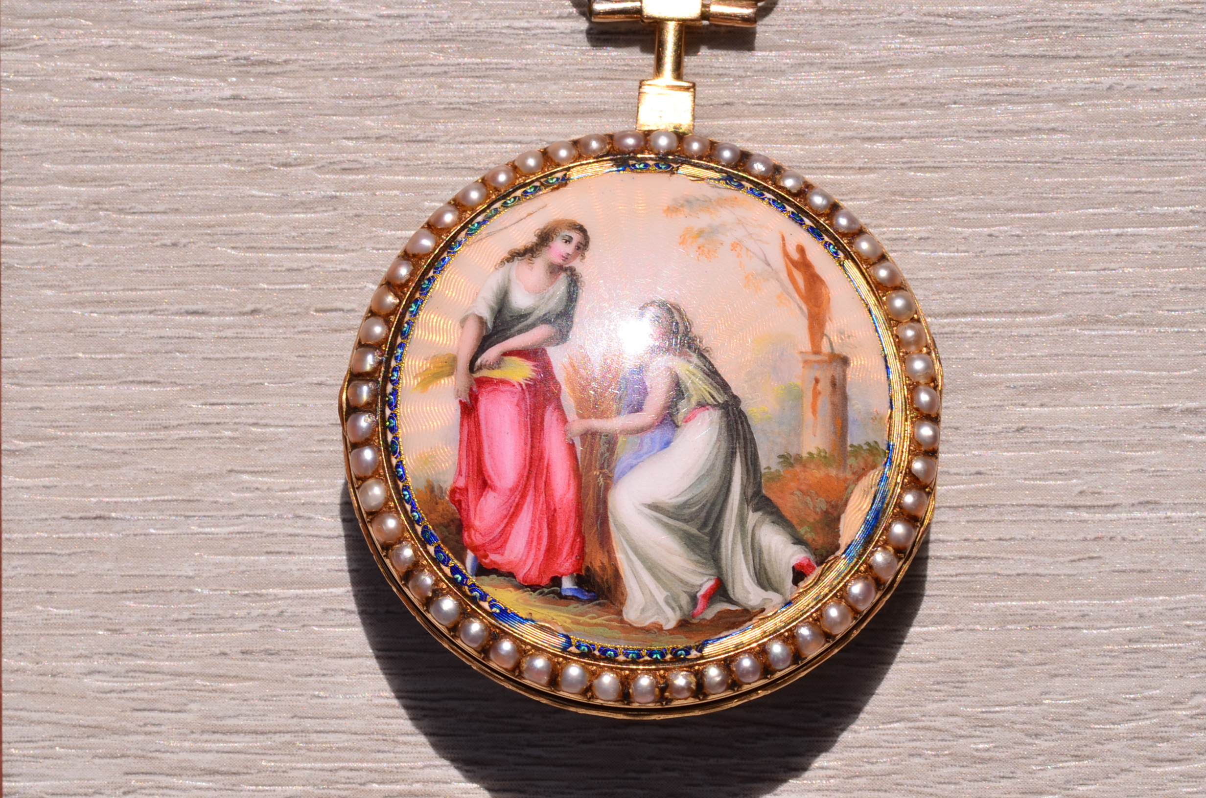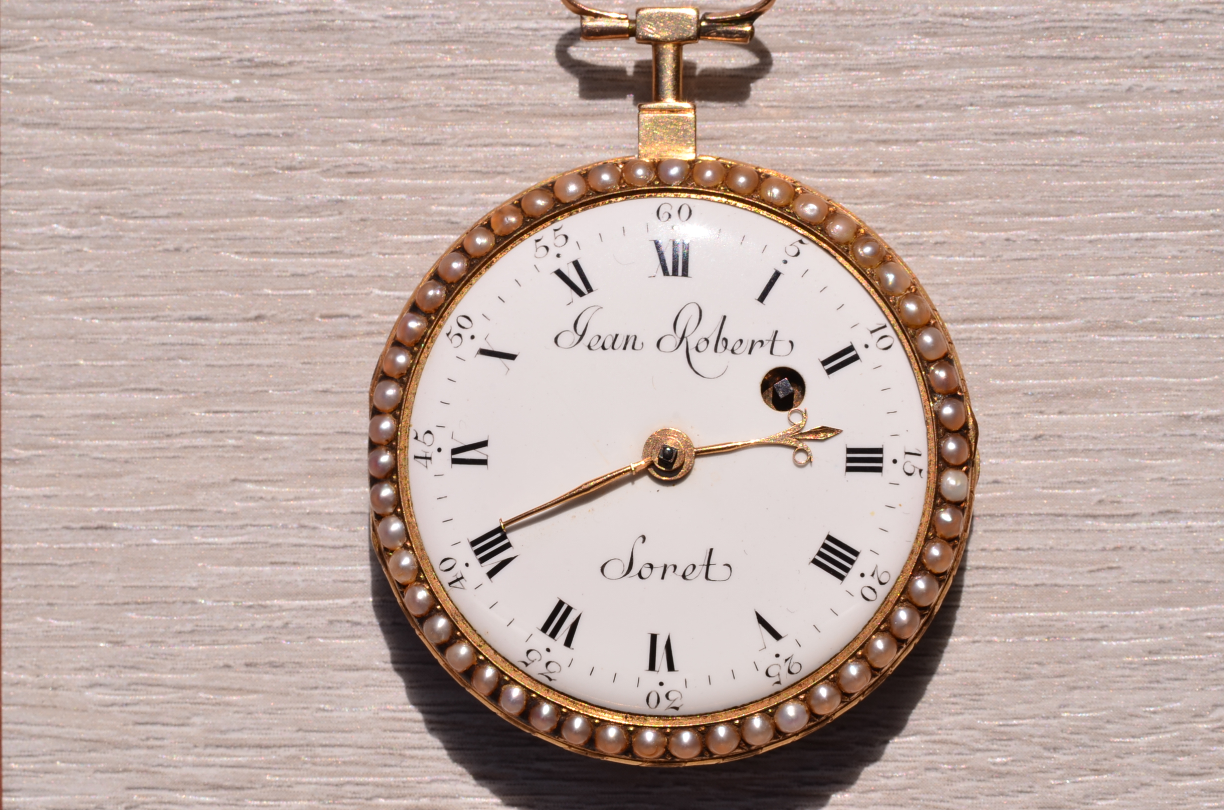 The Key Wind: Jean Robert Soret Pocket Watch in Yellow Gold. The timepiece features a white porcelain dial with roman and arabic numerals with curvex dial. A halo of seed pearls exists around the frame of the dial on the bezel while a hand painted enamel scene exists on the reverse case. The watch is not currently keeping time and would need service which can be purchased separately for an additional $1500 which would include the missing crystal, and full overhaul. Note there is slight enamel loss on the reverse yet it is mostly intact. The watch is sold as is where is and is extremely rare.