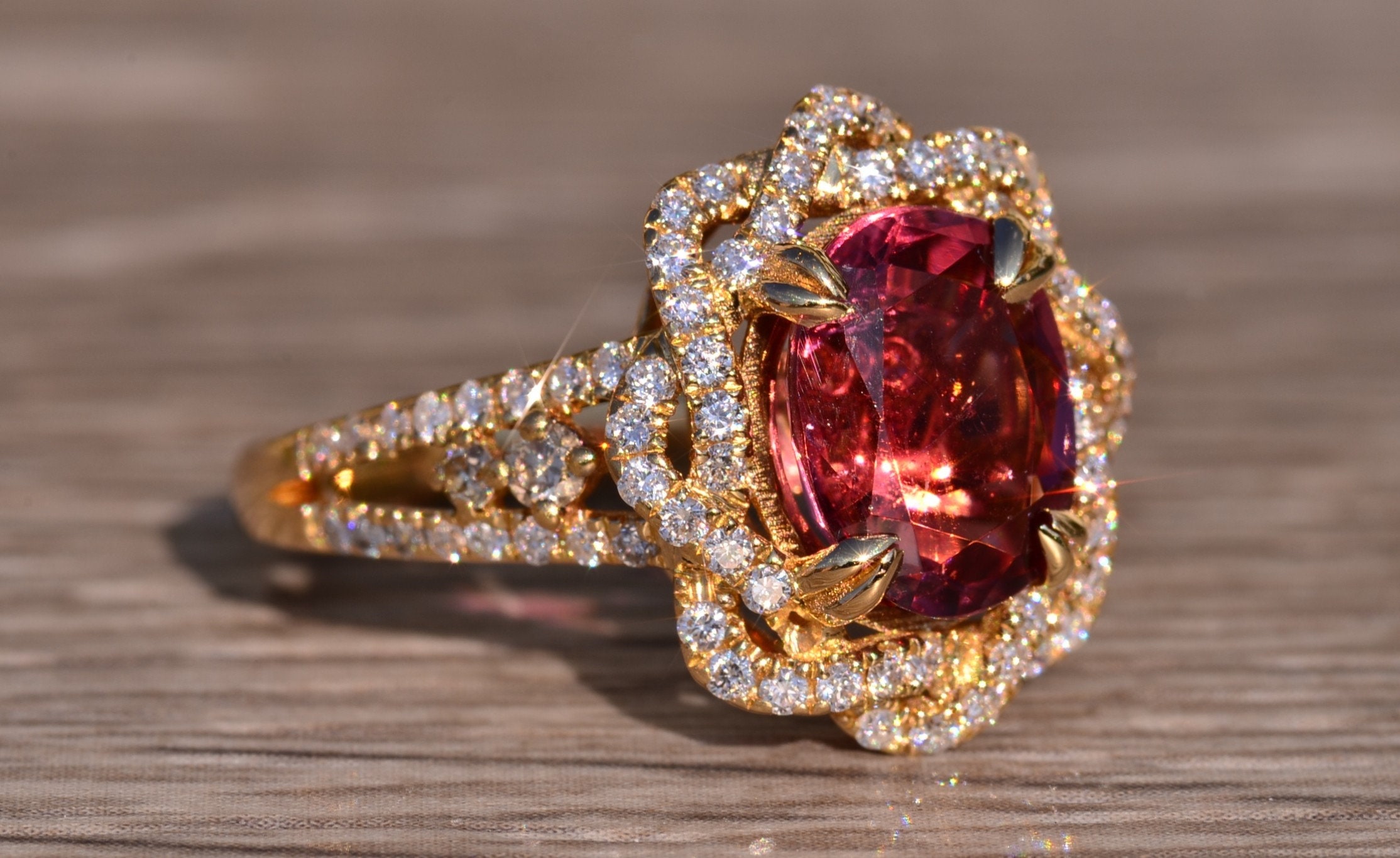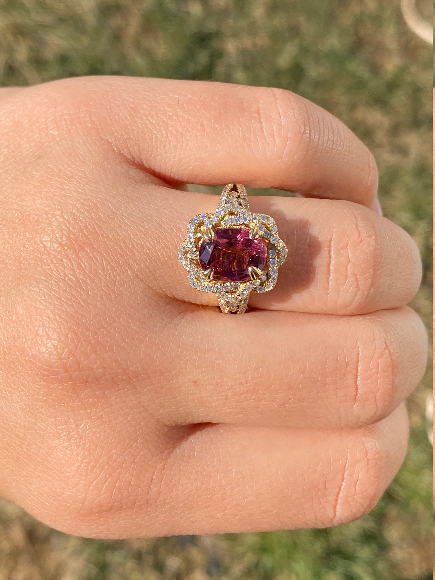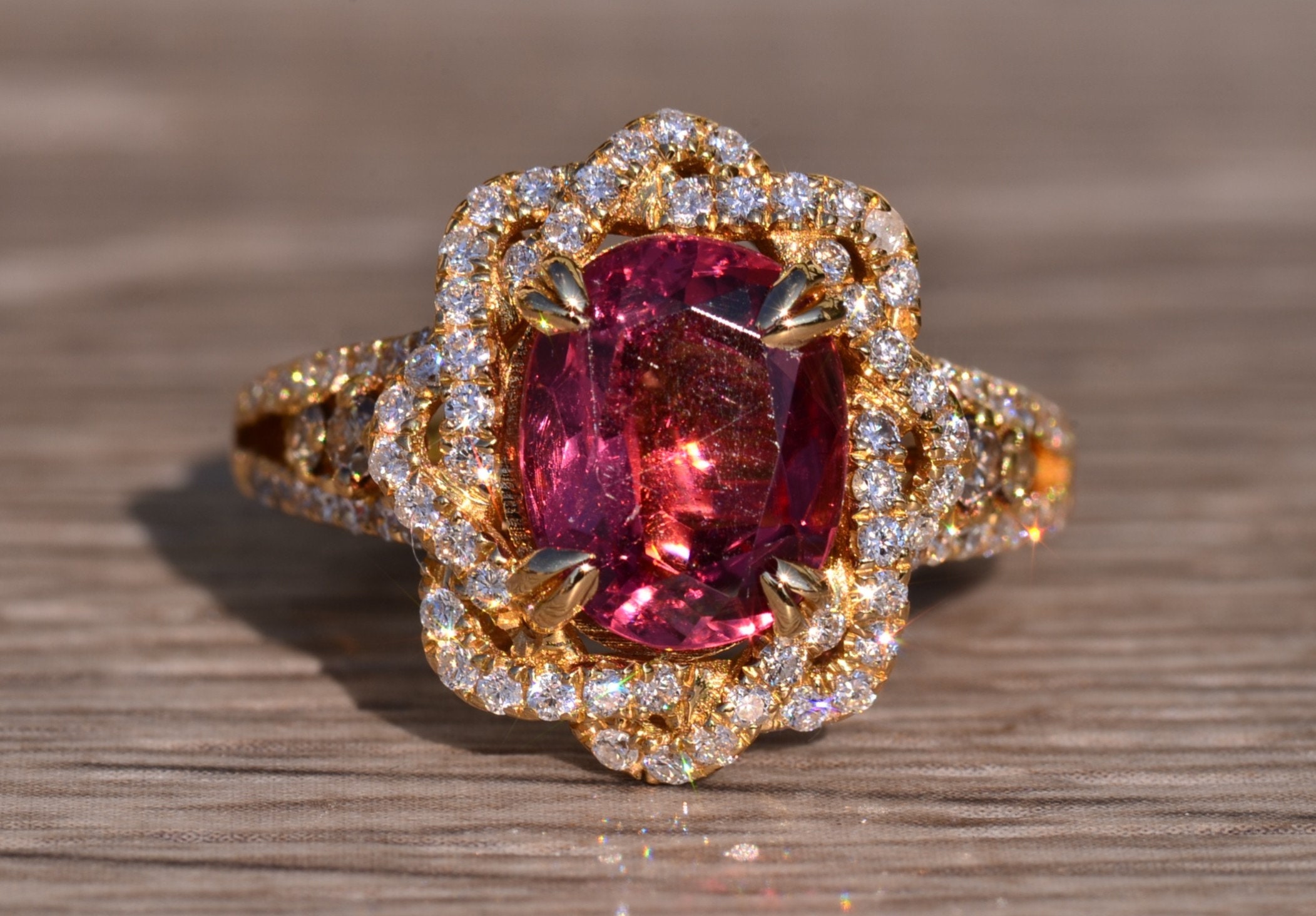 The Kinsey: Ladies Signed Levian 18K Gold Cocktail Ring set with 2.65 CT Tourmaline. Crafted in 18 karat yellow gold, this ladies ring centers on a 2.65 carat oval tourmaline. Surrounding the center in a twisted halo and continuing down the sides is 1 carat of shimmering diamonds. The ring is signed Levian and is currently a finger size 7.25 and is able to be resized for an additional charge.