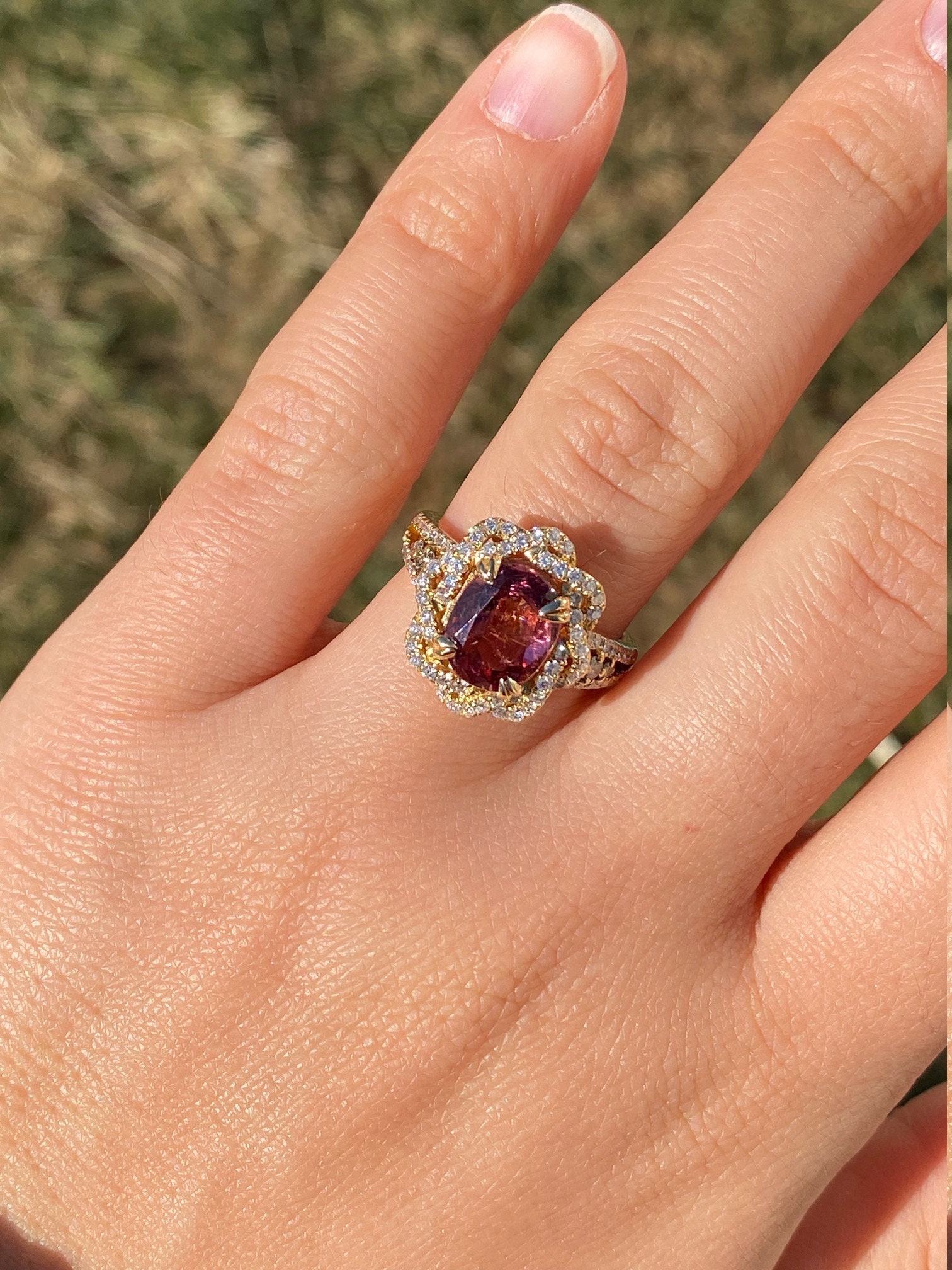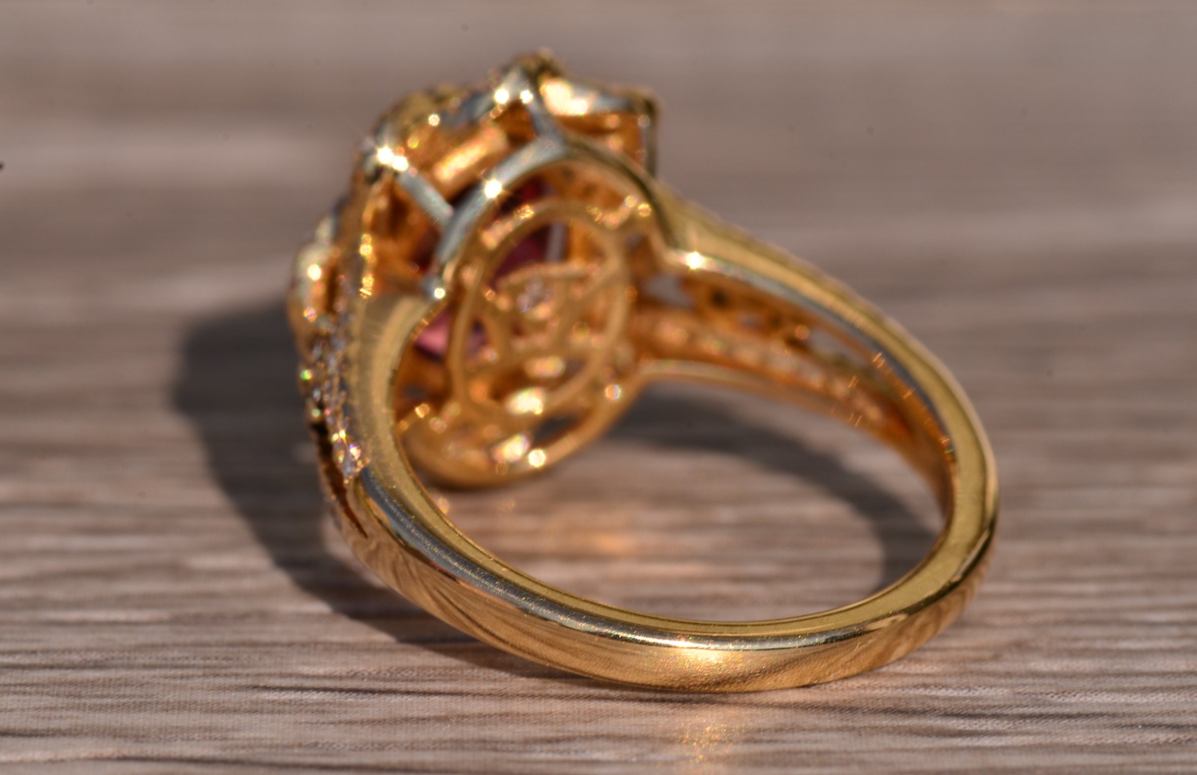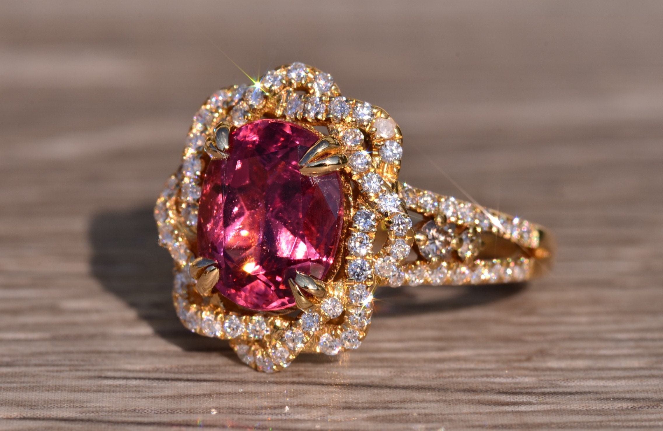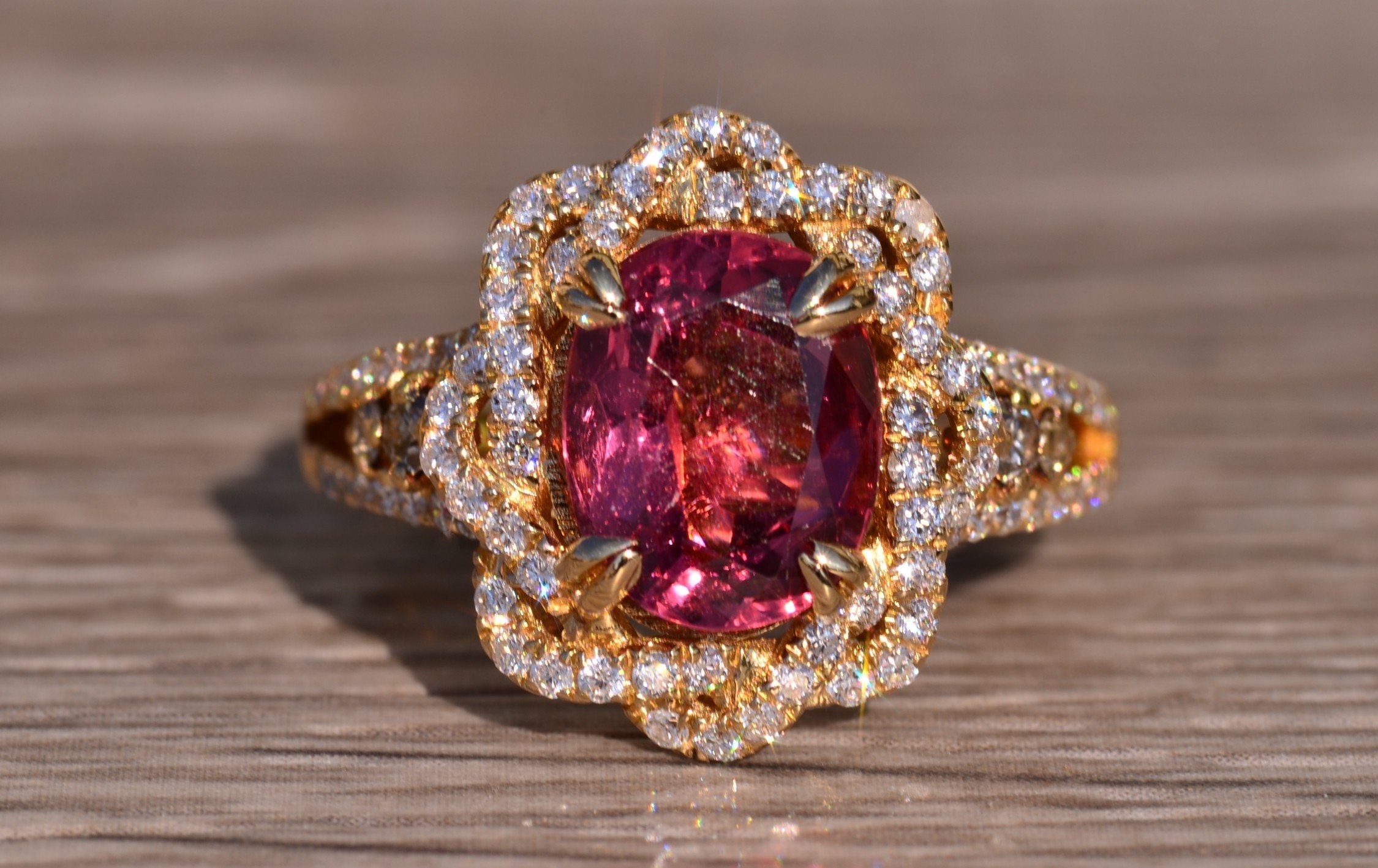 The Kinsey: Ladies Signed Levian 18K Gold Cocktail Ring set with 2.65 CT Tourmaline. Crafted in 18 karat yellow gold, this ladies ring centers on a 2.65 carat oval tourmaline. Surrounding the center in a twisted halo and continuing down the sides is 1 carat of shimmering diamonds. The ring is signed Levian and is currently a finger size 7.25 and is able to be resized for an additional charge.
