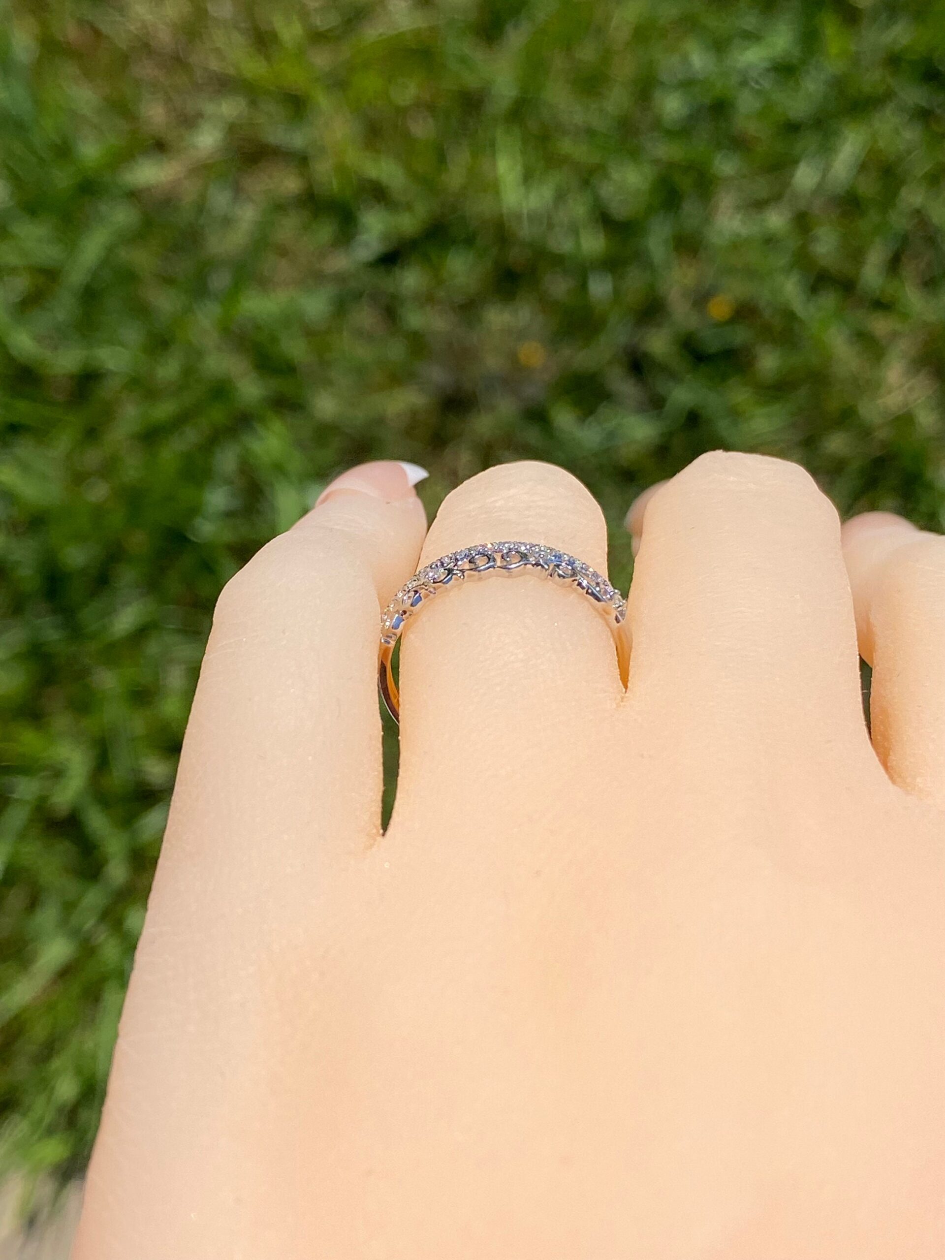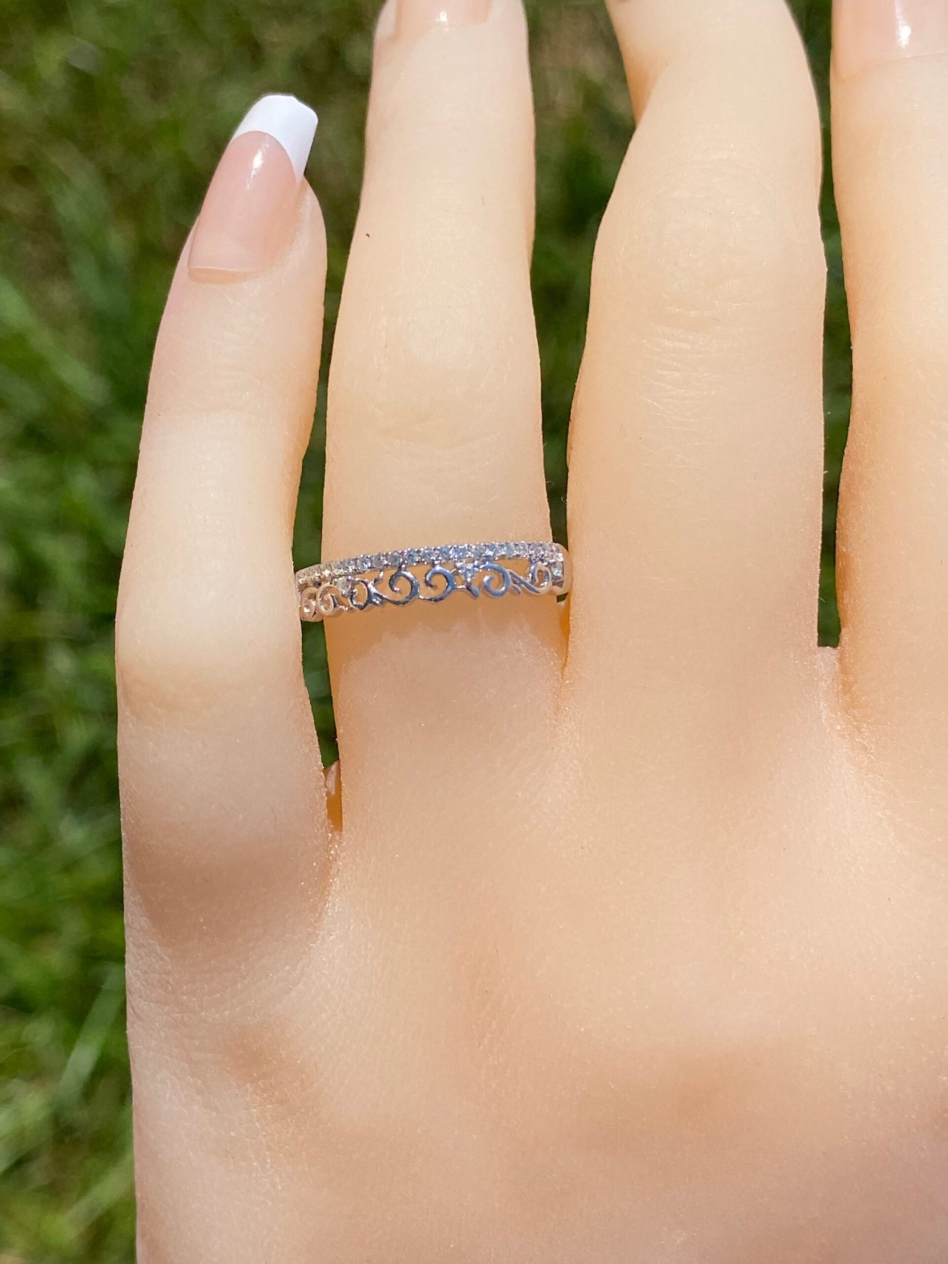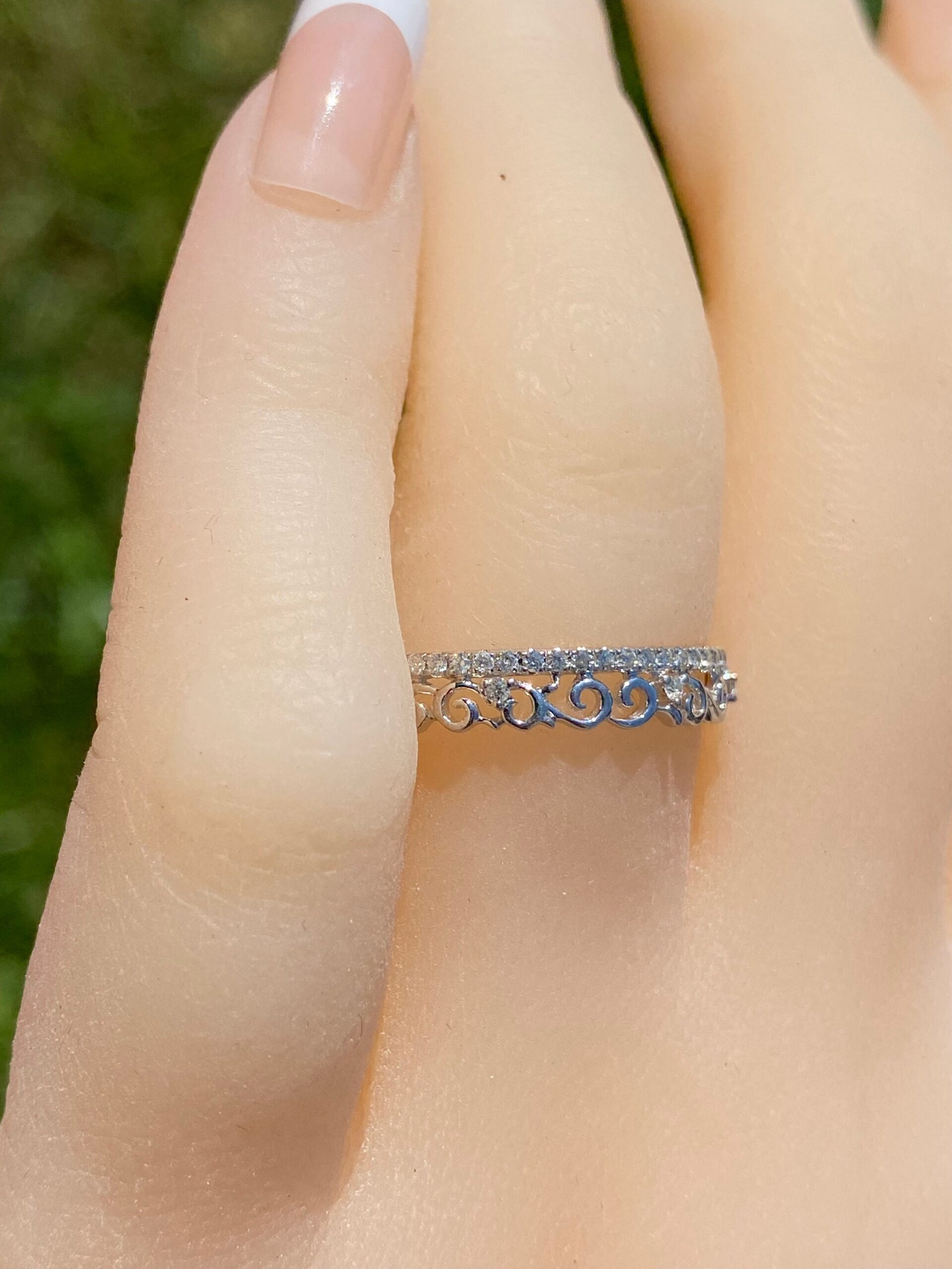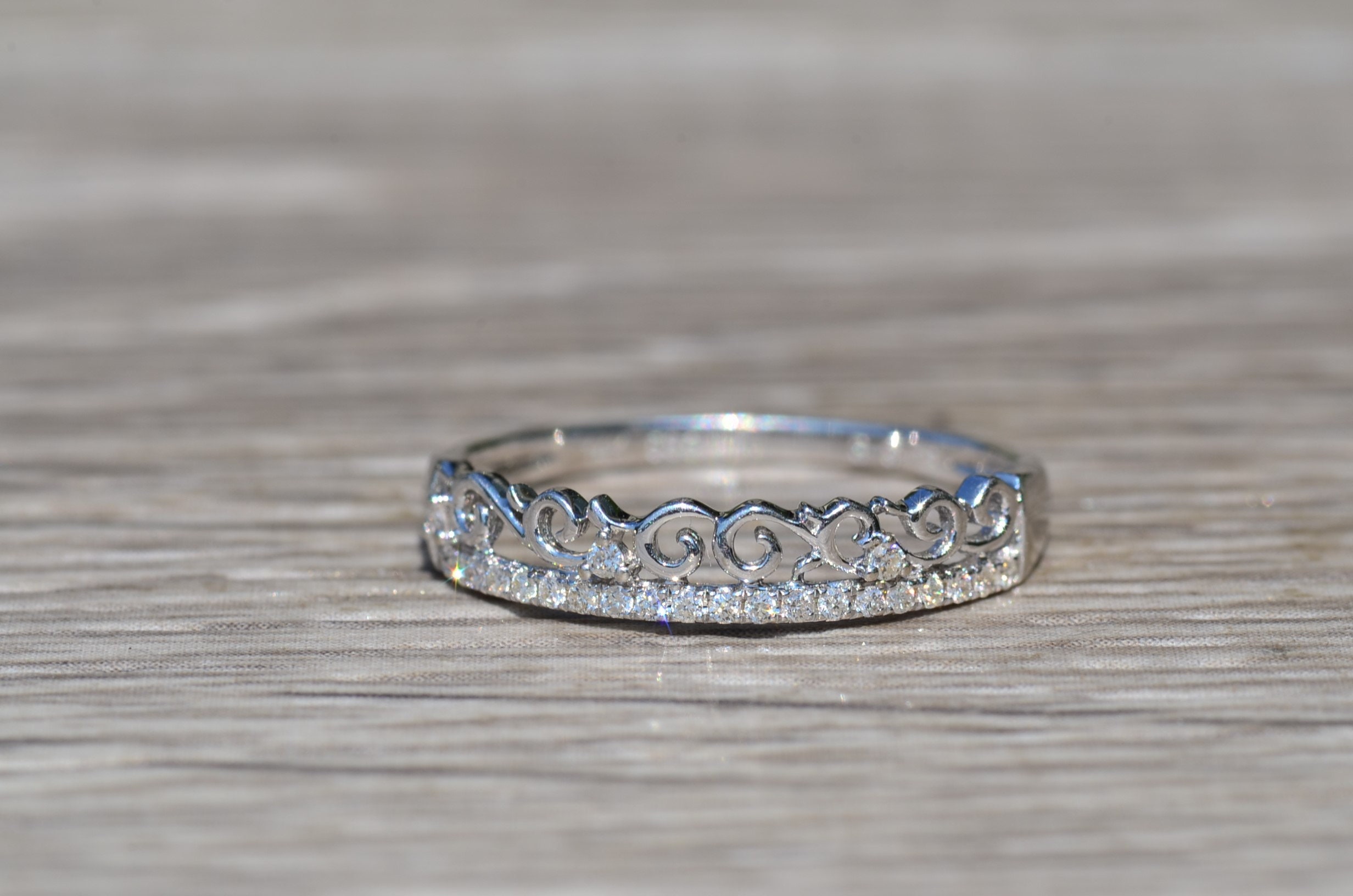 The Lauderdale Lakes: Ladies Specialty Diamond Band With Filigree. The ring features a row of round brilliant cut diamonds with an interesting swirled filigree pattern on the top also sprinkled with diamonds. The ring is made in 14 karat white gold and is currently a finger size 7 yet can be adjusted to any finger size for an additional charge.