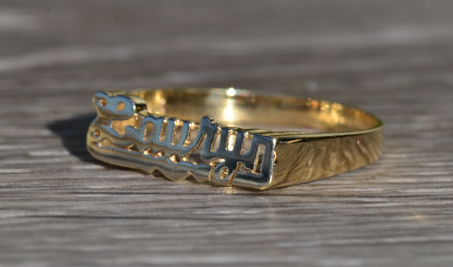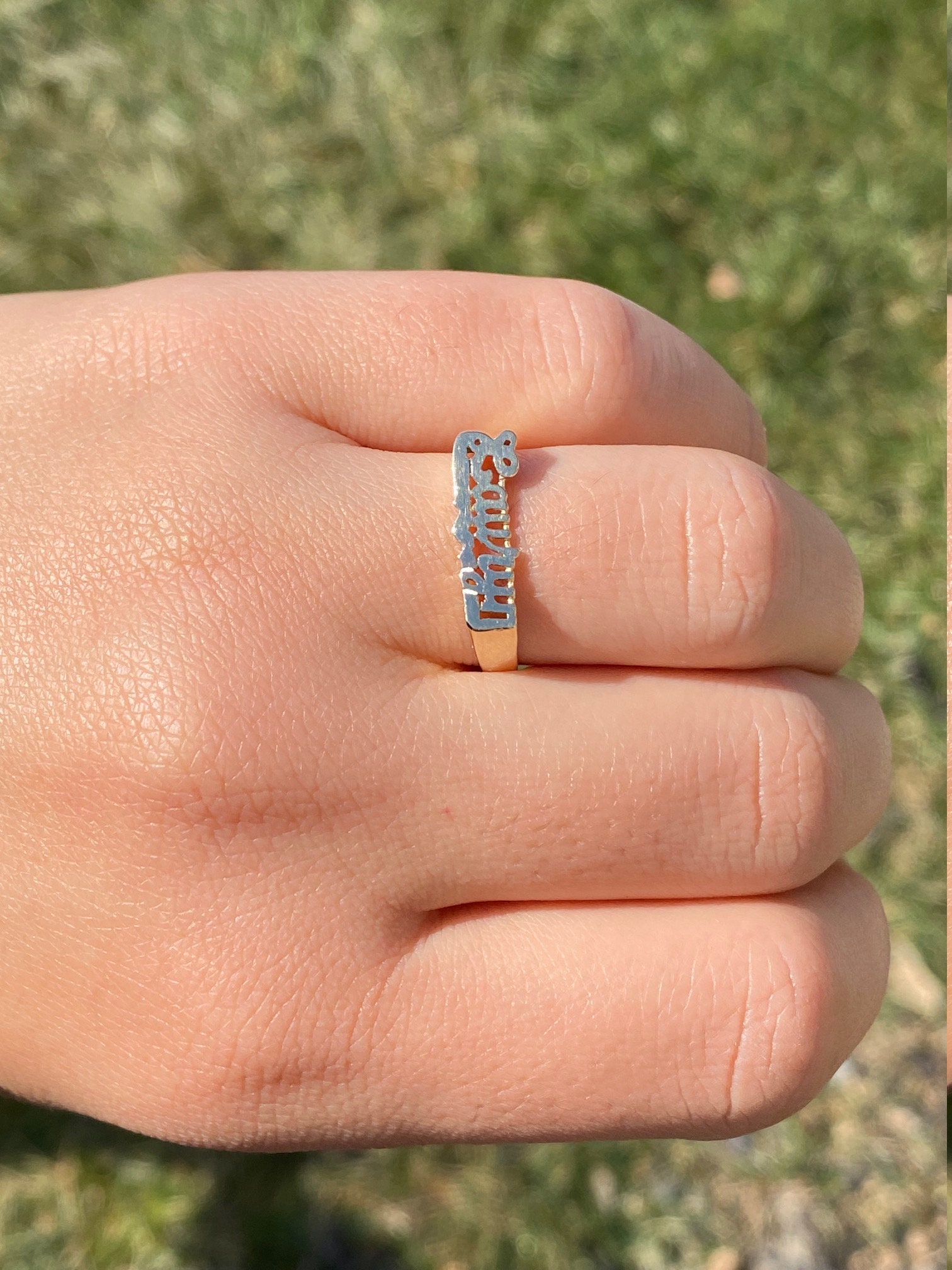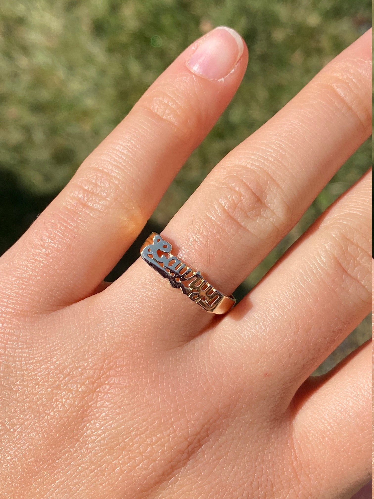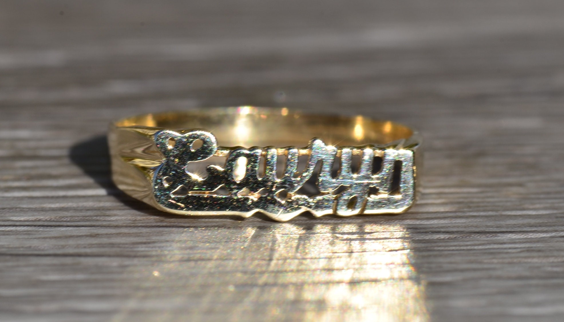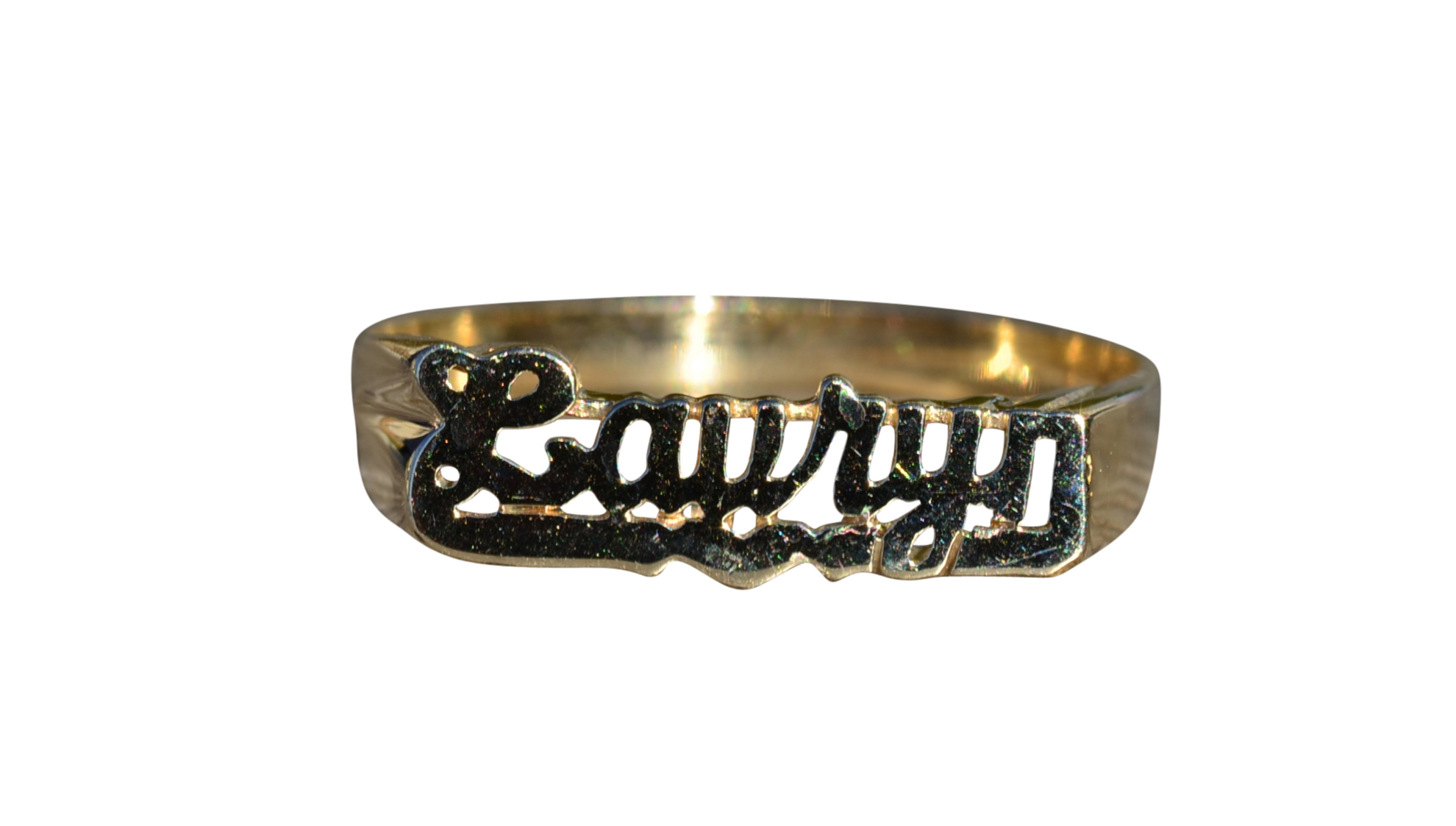 The Laury: Ladies Lauryn Name Ring in 14K Yellow Gold. Crafted in 14 karat yellow gold, this trendy name ring is perfect for the lady who has everything. Currently a finger size 9, this ring can be resized for an additional charge.