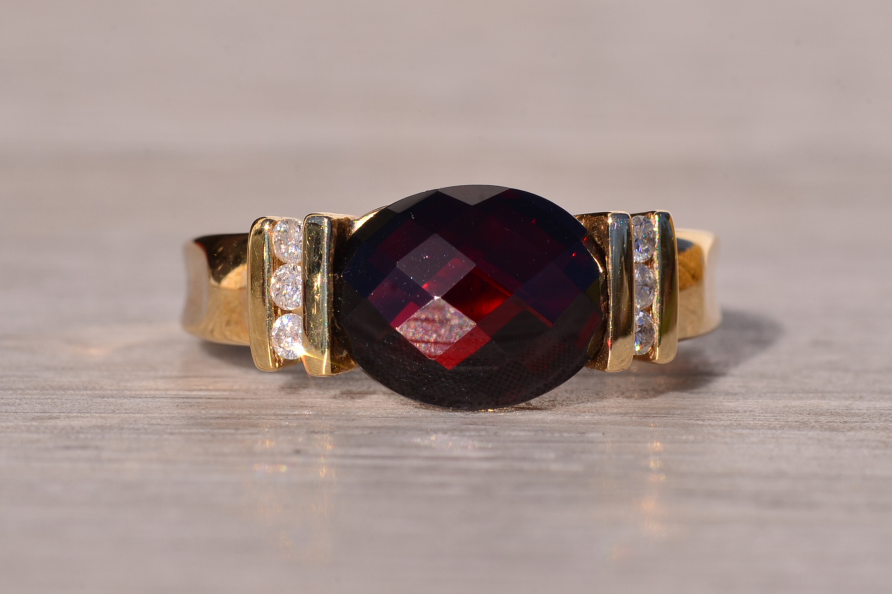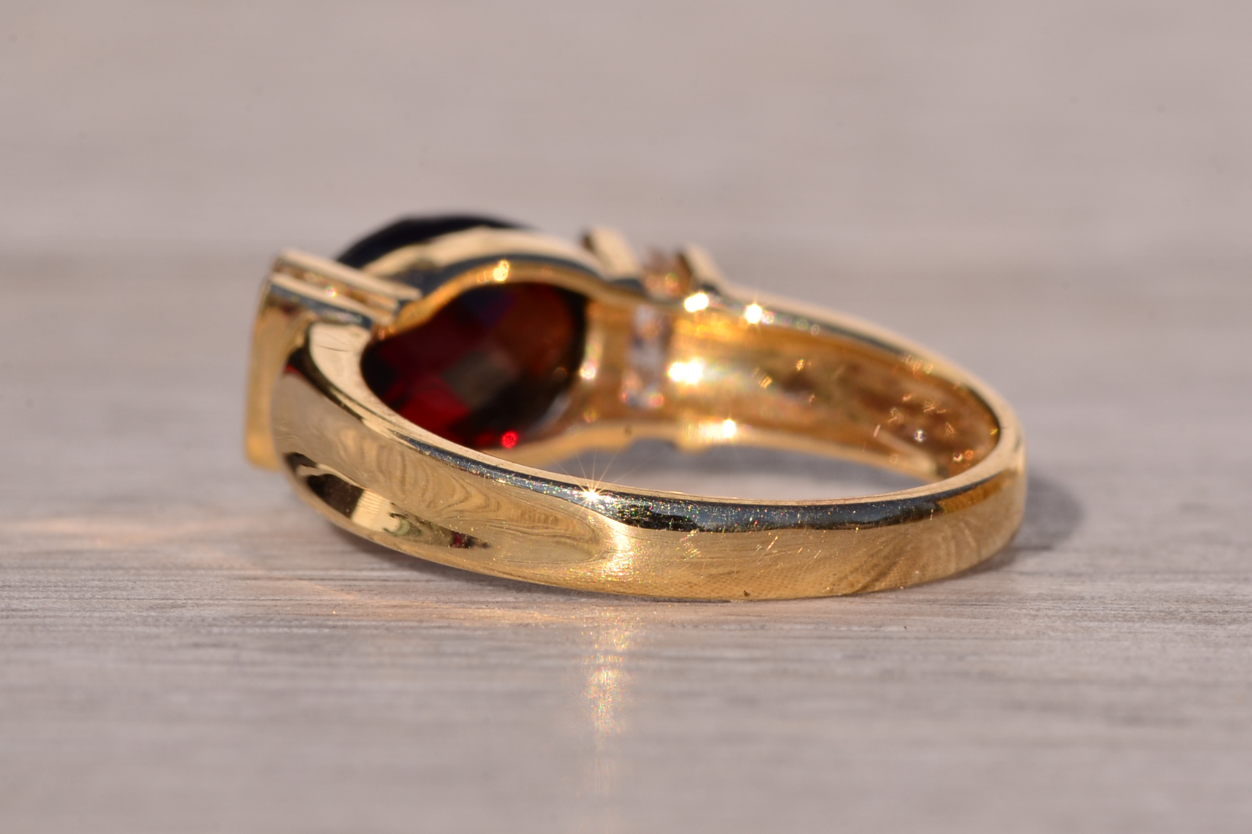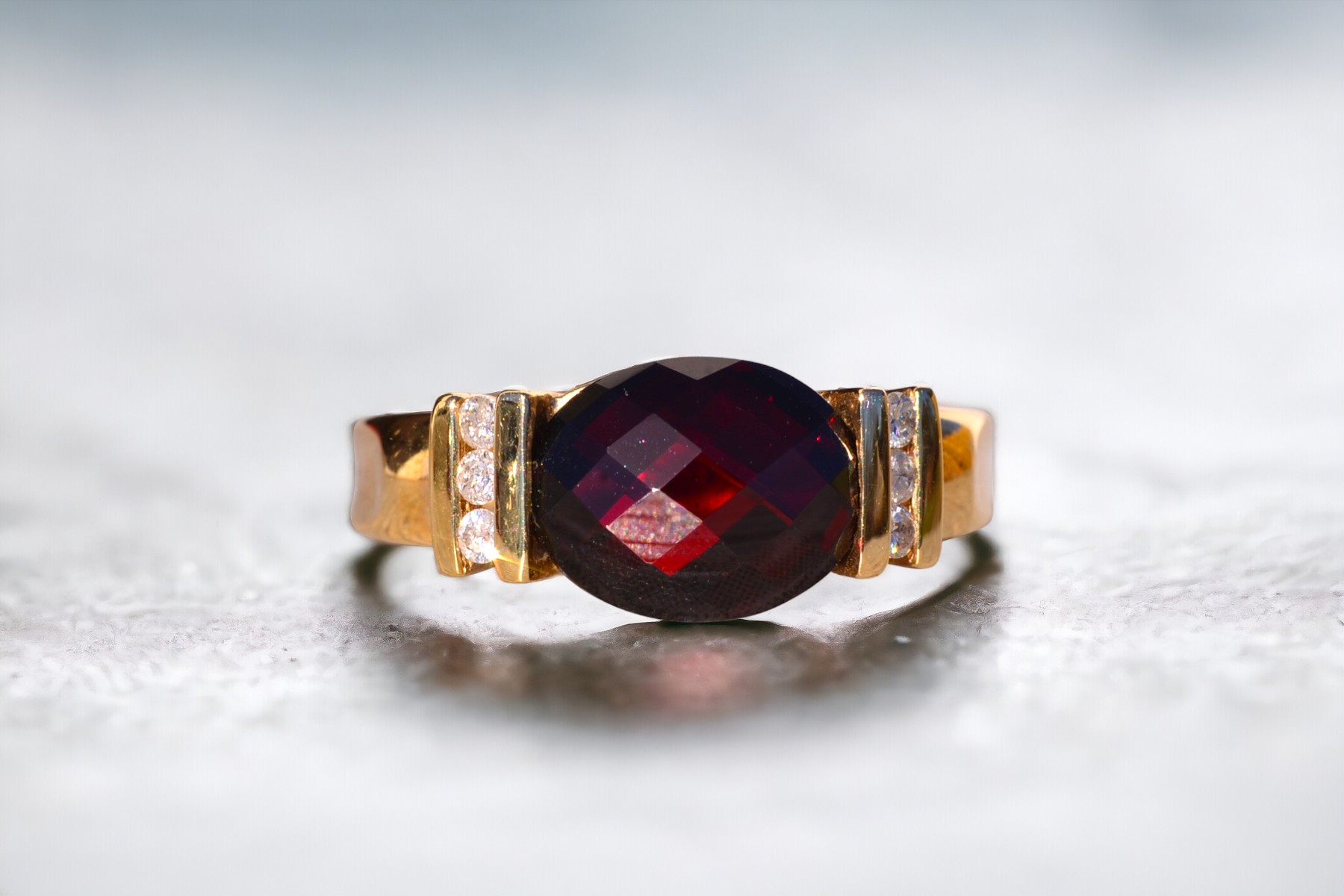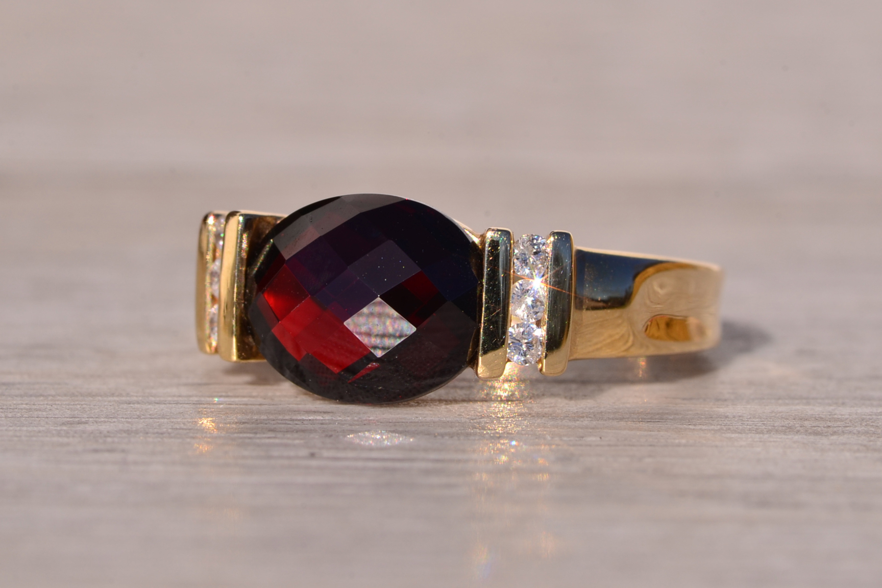 The Lawley: Checkerboard Cut Natural Garnet and Diamond Ring in Yellow Gold. This captivating ring features a central oval checkerboard cut natural deep orangish-red garnet, elegantly bar-set in an East to West orientation, drawing attention with its rich and vibrant hue. Surrounding the center are three round brilliant cut natural diamonds, channel-set to enhance the overall allure of the piece. Crafted with precision in 14 karat yellow gold, this ring exudes warmth and sophistication. Currently sized at 7.25, it can be adjusted to fit any finger size upon request for an additional charge, ensuring a perfect and comfortable fit for the wearer.