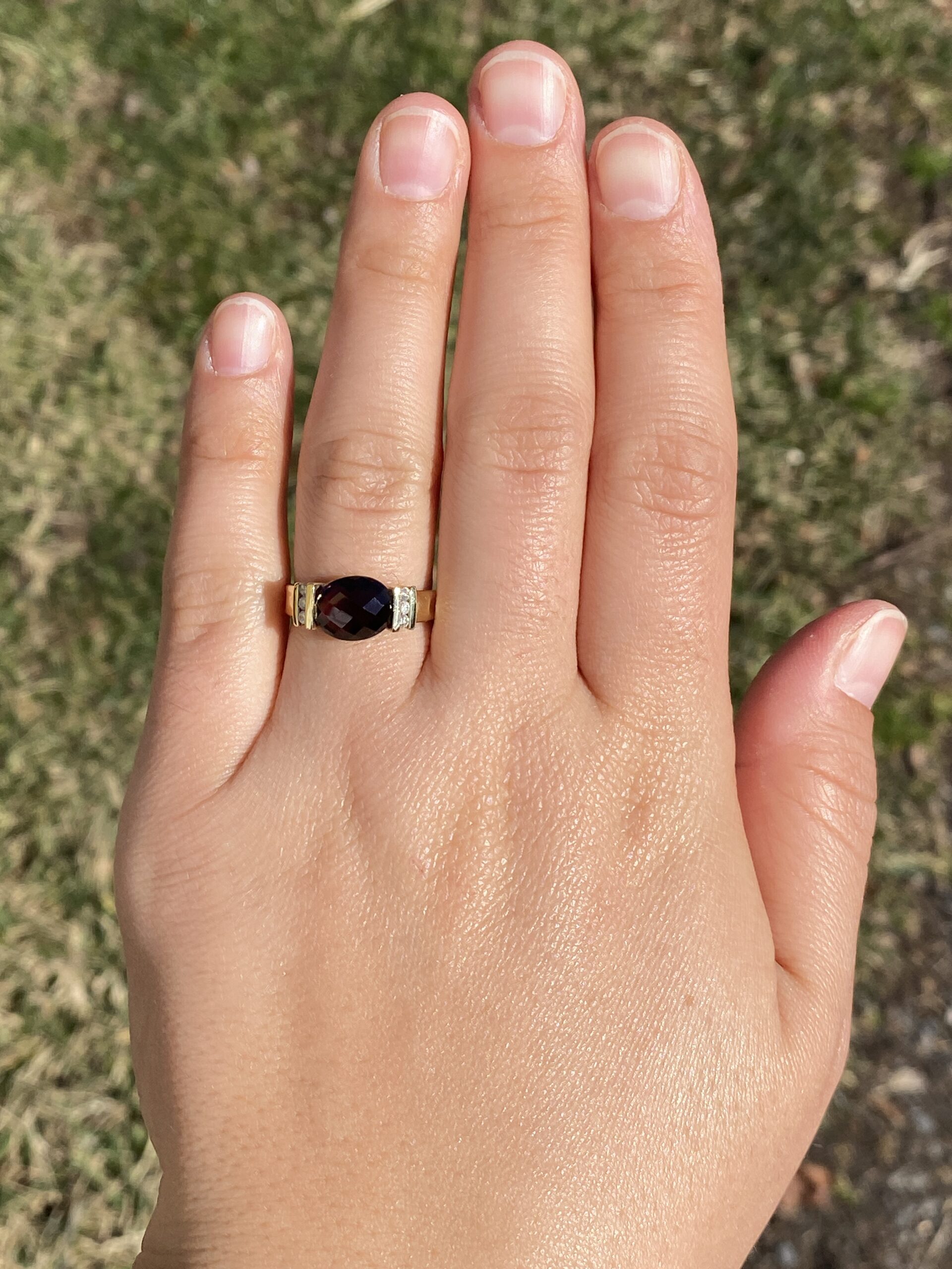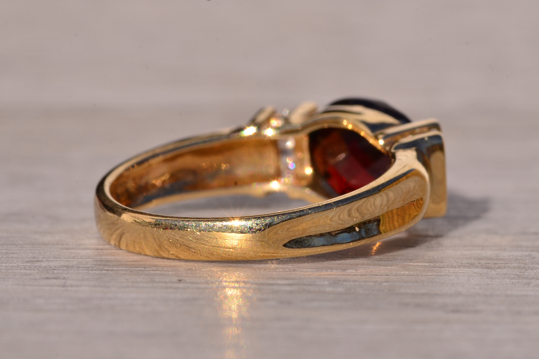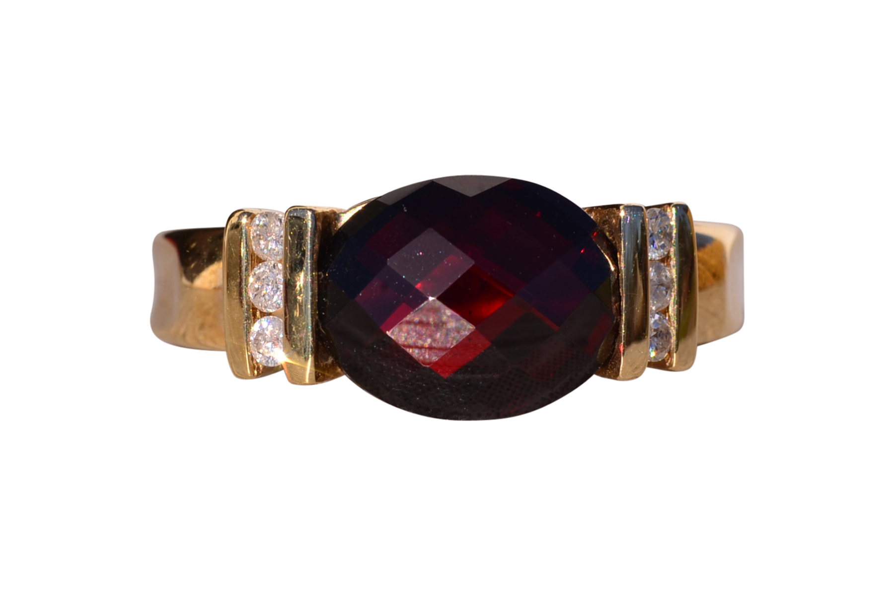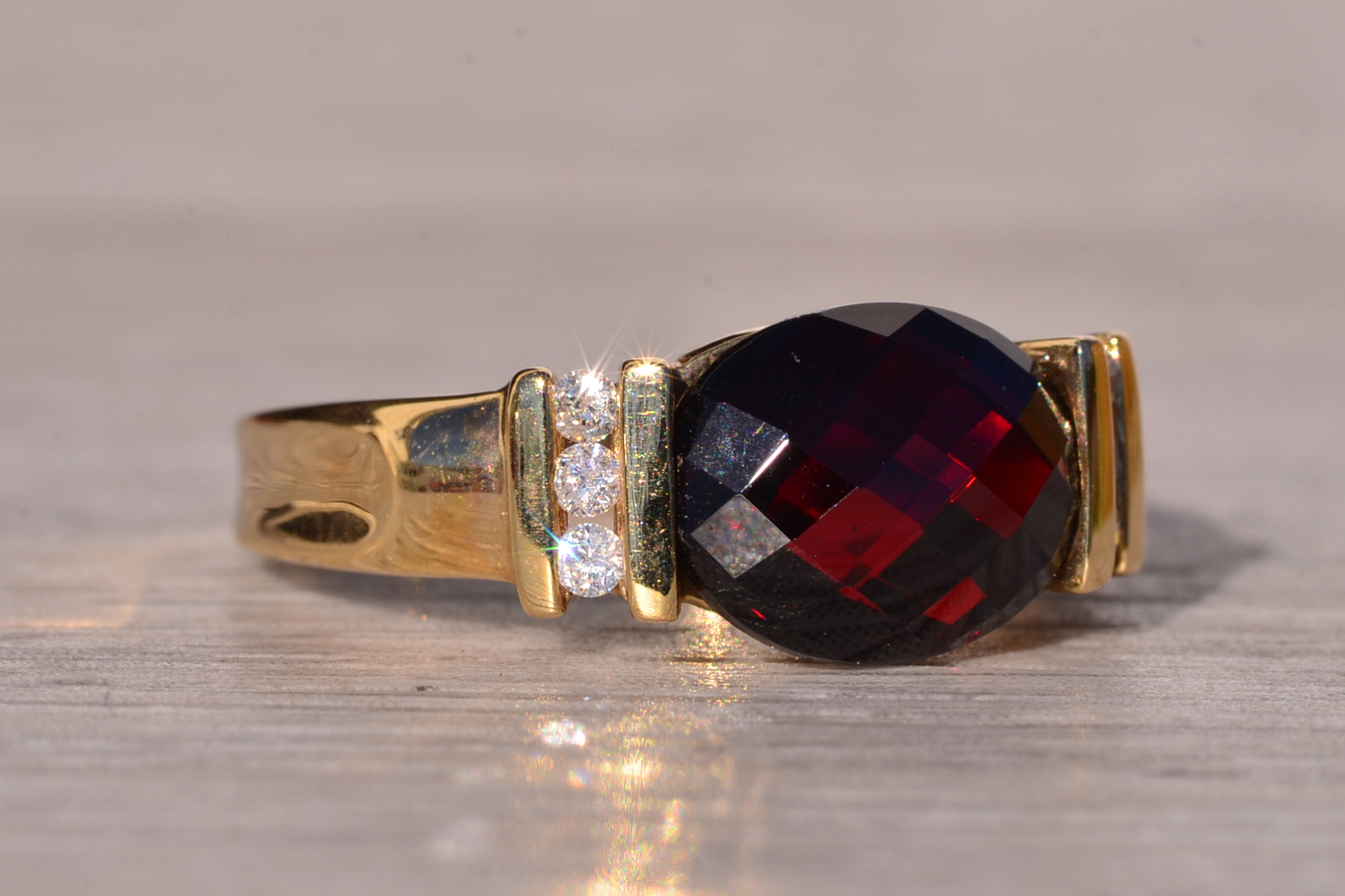The Lawley: Checkerboard Cut Natural Garnet and Diamond Ring in Yellow Gold. This captivating ring features a central oval checkerboard cut natural deep orangish-red garnet, elegantly bar-set in an East to West orientation, drawing attention with its rich and vibrant hue. Surrounding the center are three round brilliant cut natural diamonds, channel-set to enhance the overall allure of the piece. Crafted with precision in 14 karat yellow gold, this ring exudes warmth and sophistication. Currently sized at 7.25, it can be adjusted to fit any finger size upon request for an additional charge, ensuring a perfect and comfortable fit for the wearer.