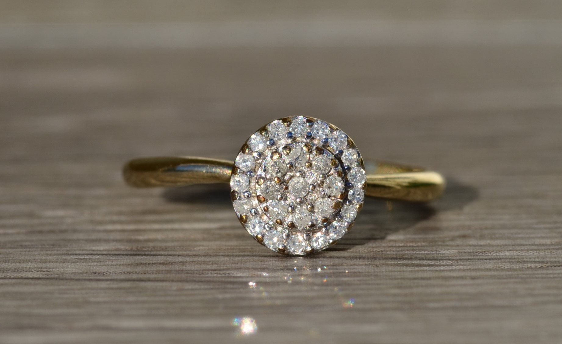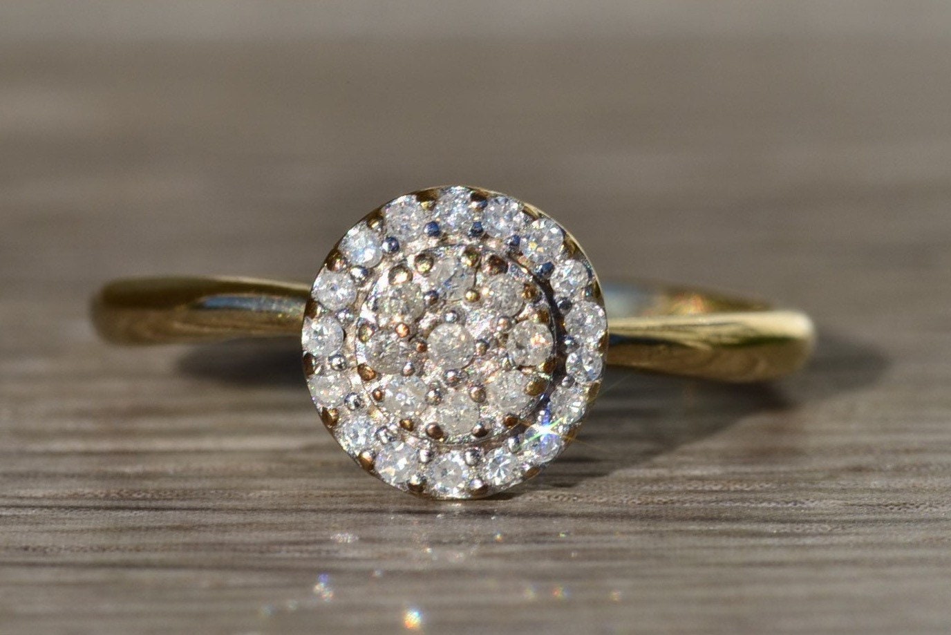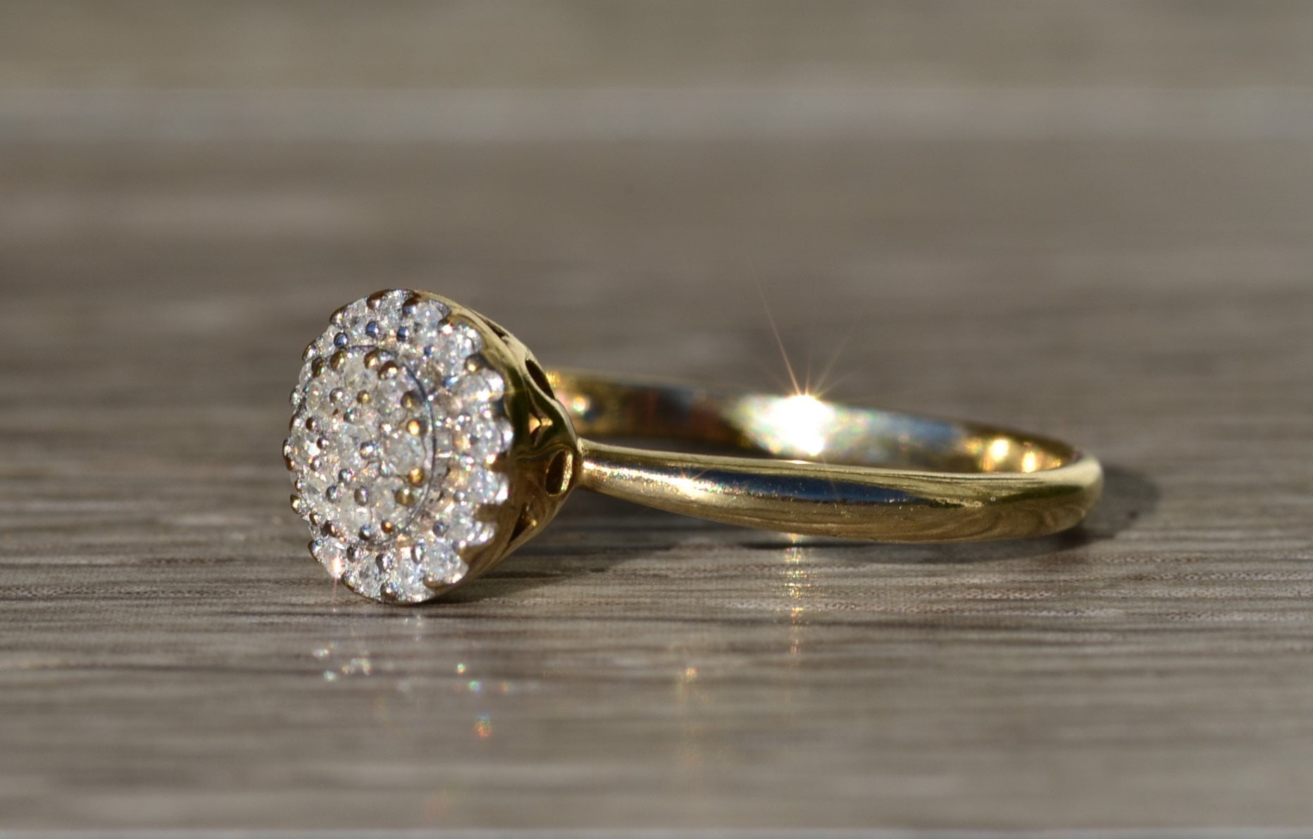 Ladies Vintage Yellow Gold Engagement Ring set with Diamonds. Crafted in yellow gold, this simple and classic engagement ring features 0.15 carats in total diamond weight. The raised center features a small cluster of diamonds with a diamond halo surrounding the outside giving the appearance of a larger center stone. Currently a finger size 6.75, this ring can be resized for an additional charge.