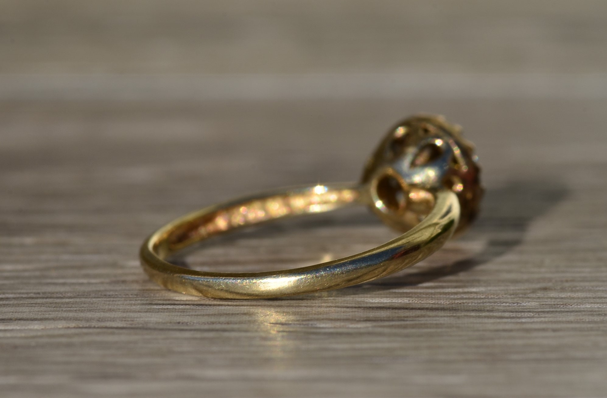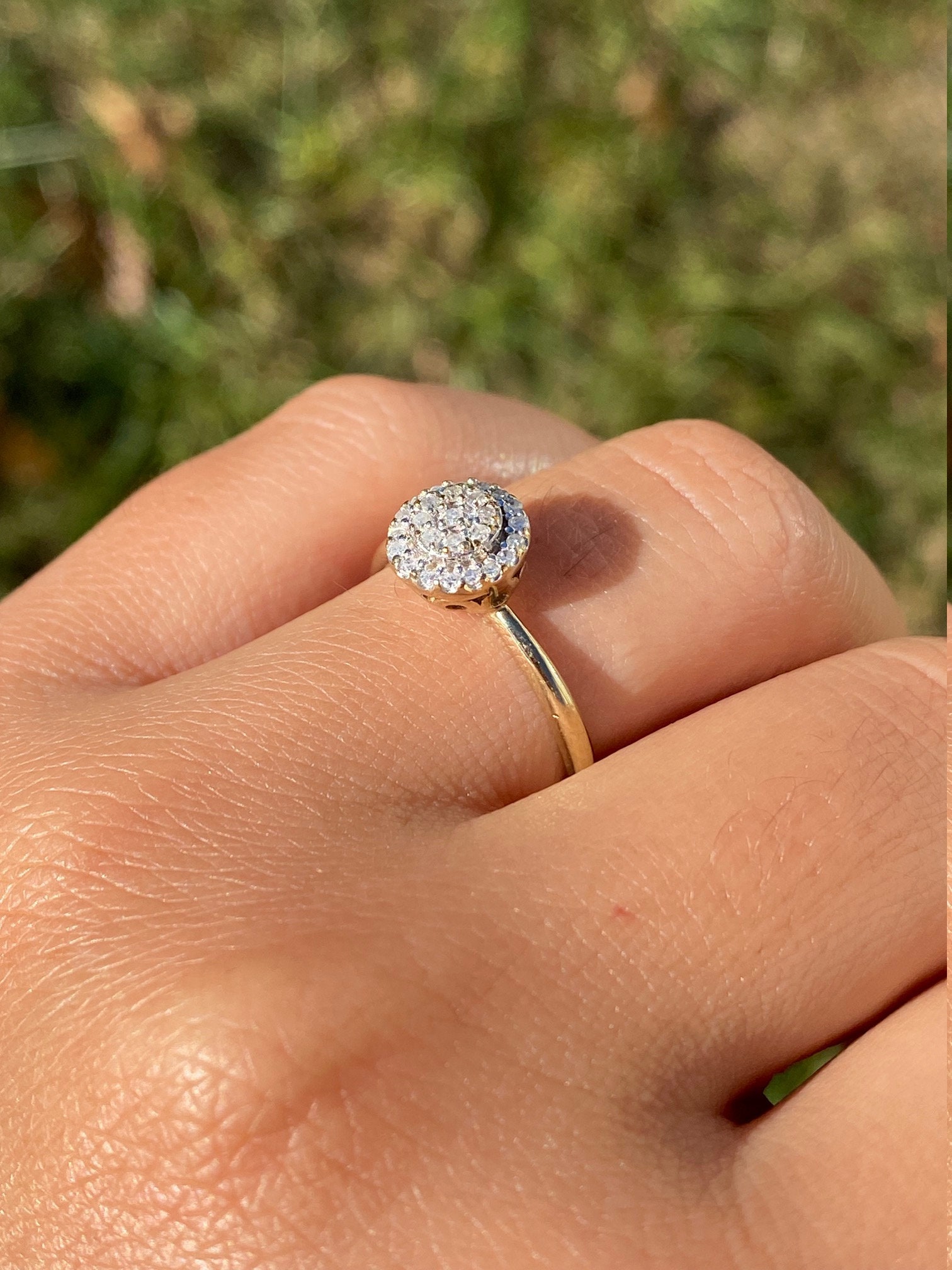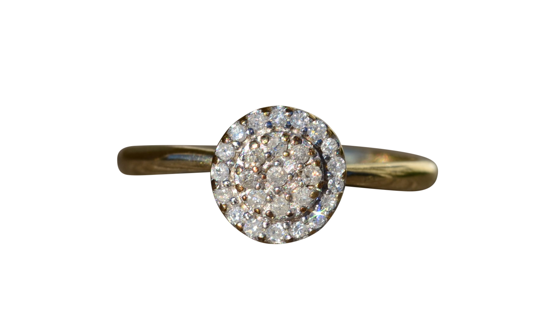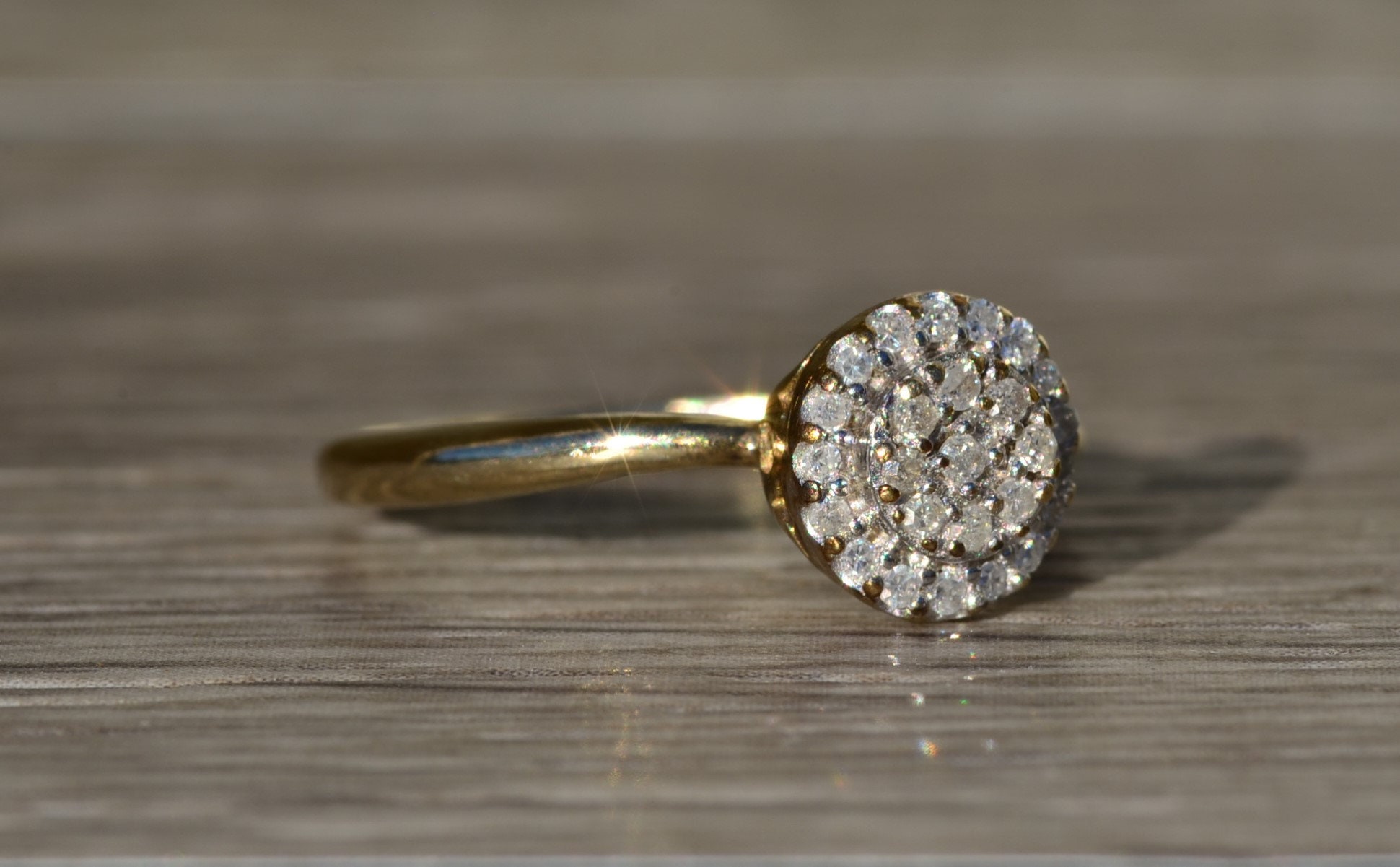 Ladies Vintage Yellow Gold Engagement Ring set with Diamonds. Crafted in yellow gold, this simple and classic engagement ring features 0.15 carats in total diamond weight. The raised center features a small cluster of diamonds with a diamond halo surrounding the outside giving the appearance of a larger center stone. Currently a finger size 6.75, this ring can be resized for an additional charge.