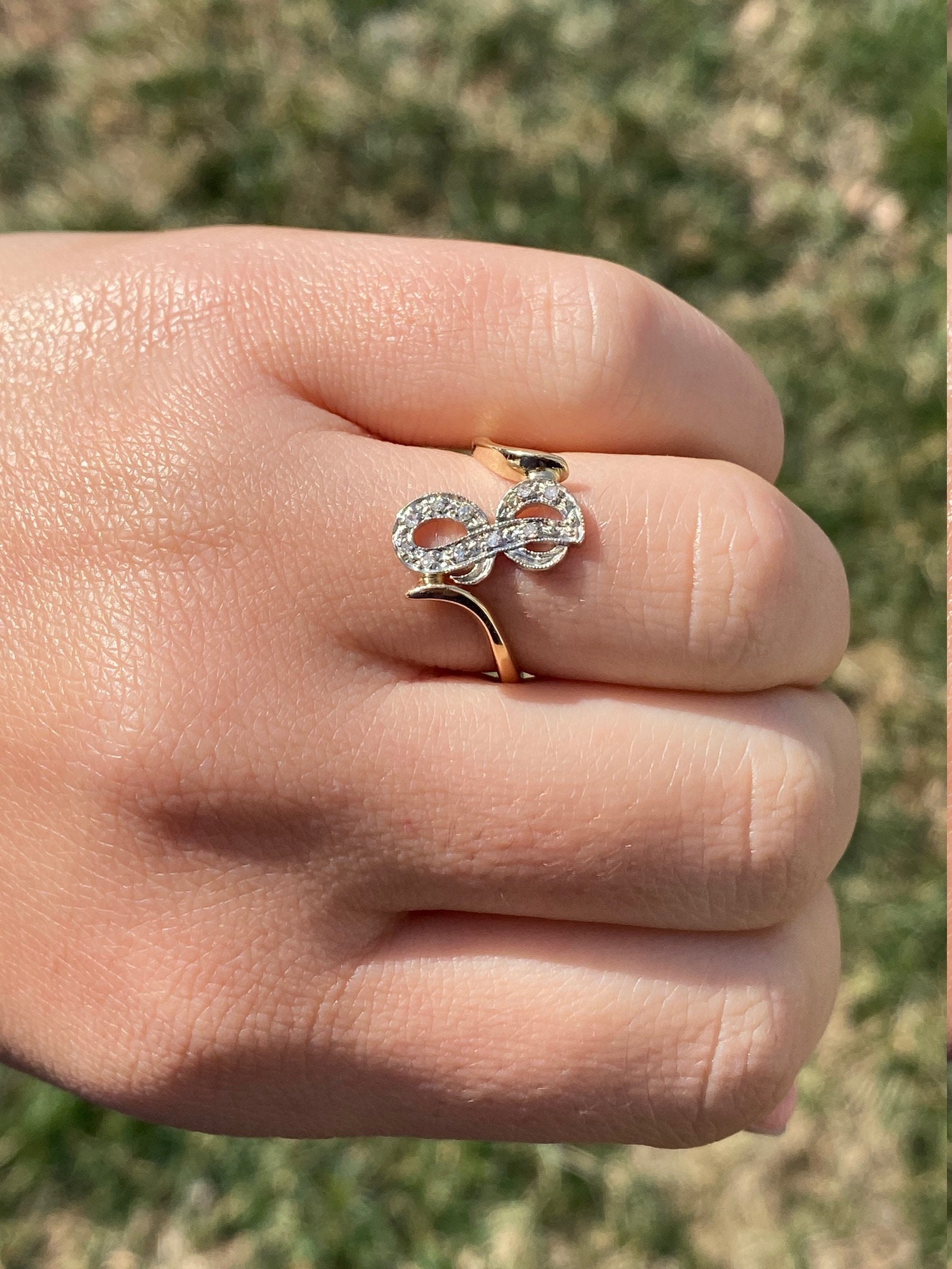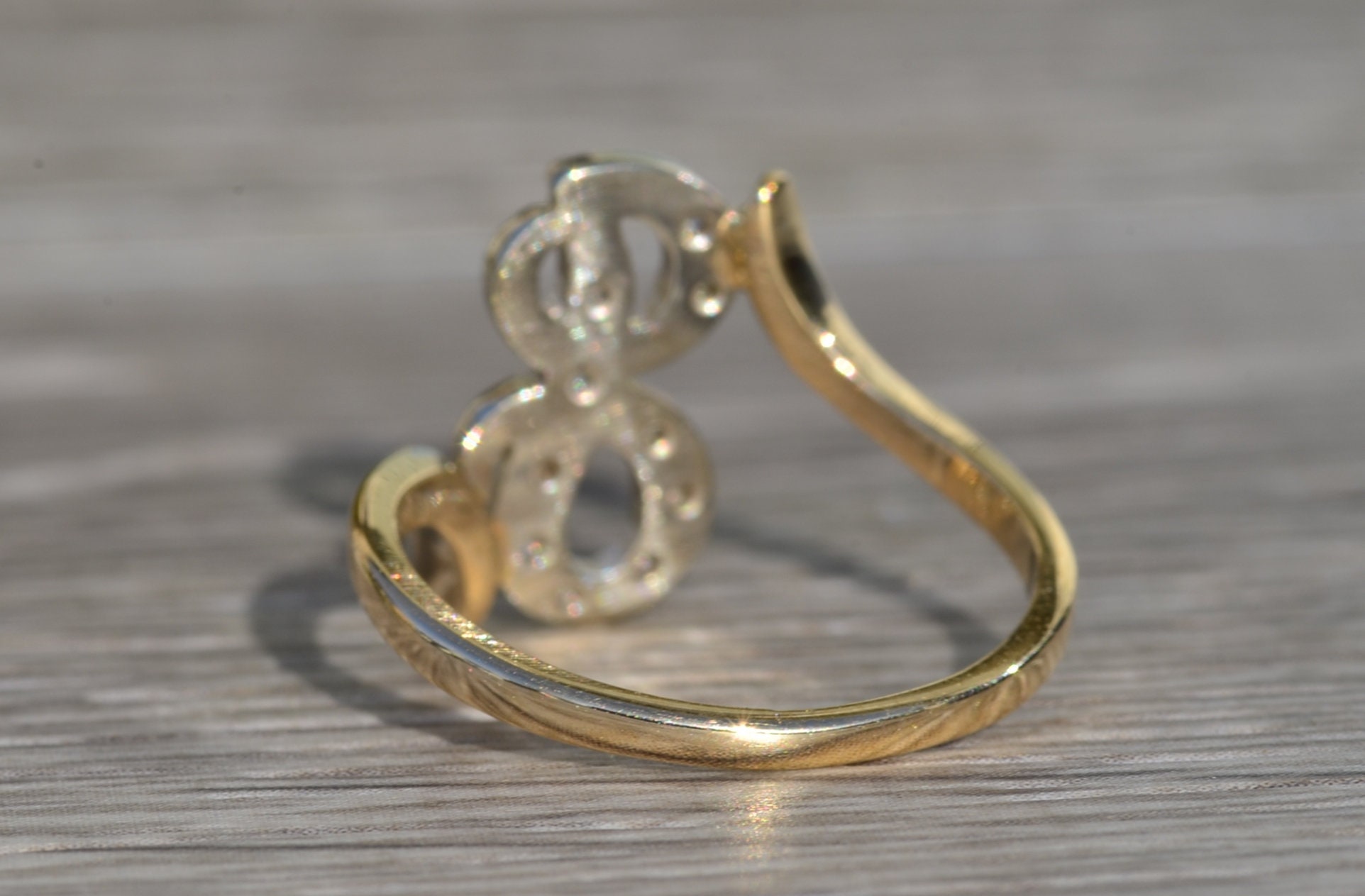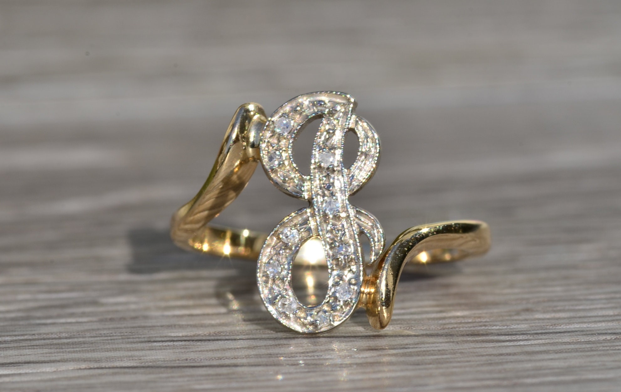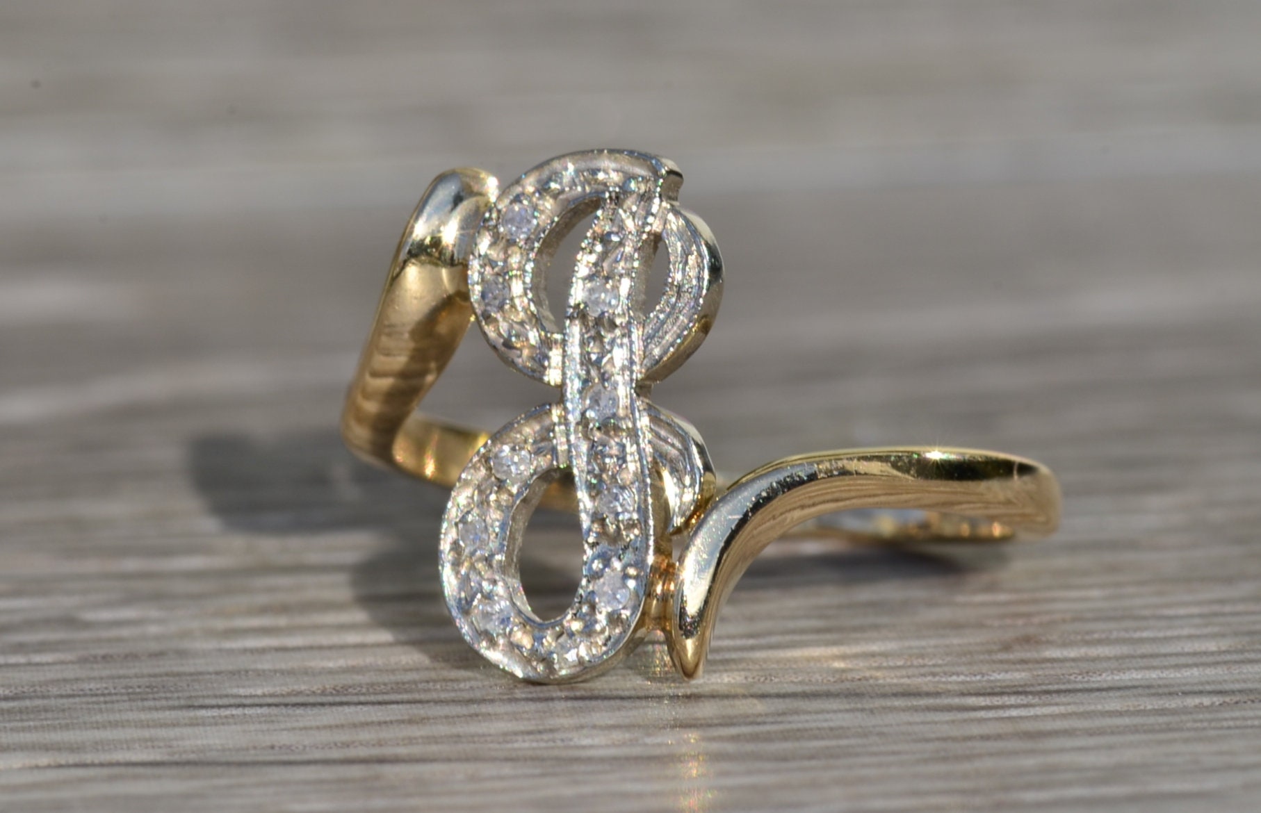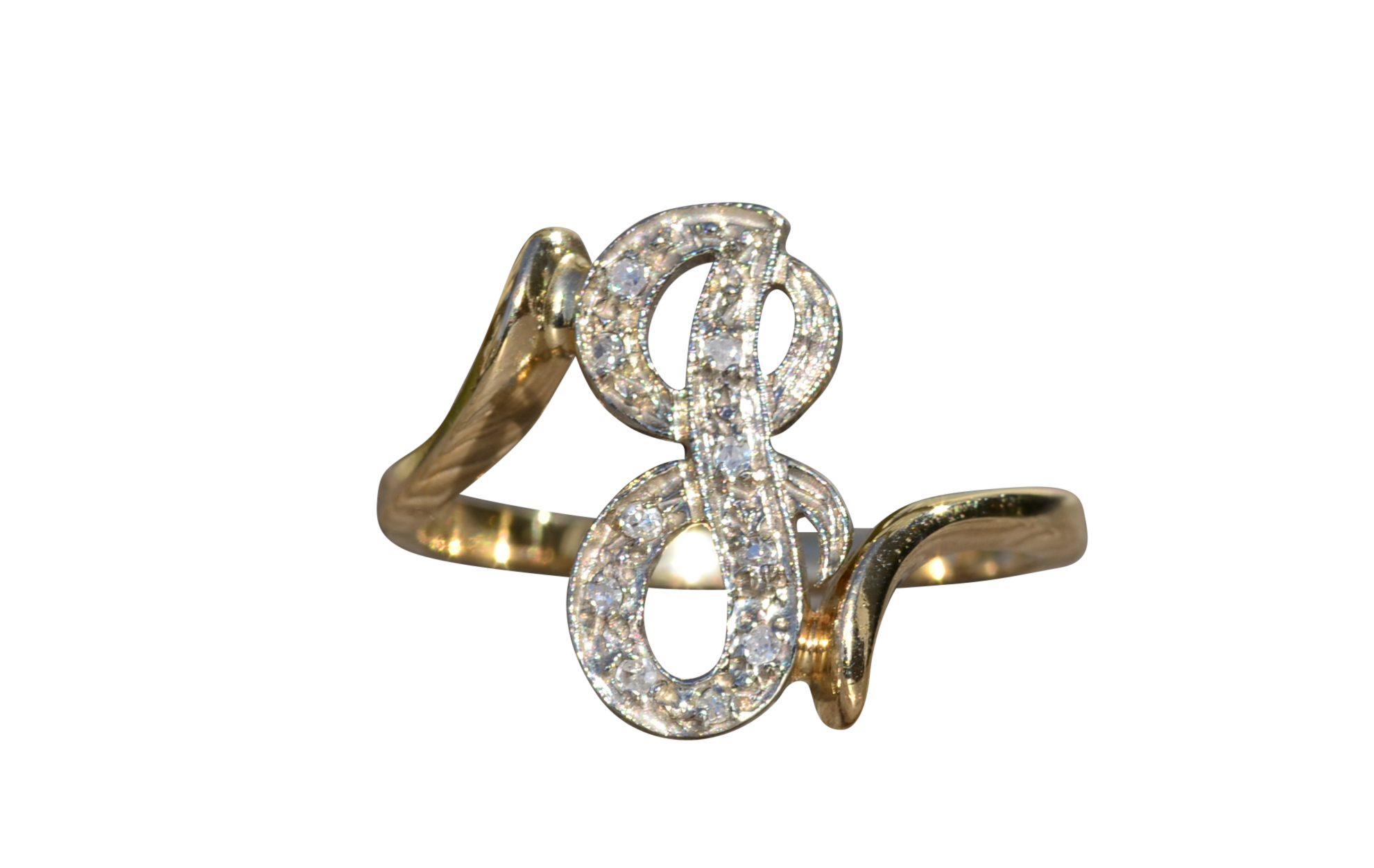 The Lenette: Ladies 14K Two Tone Script J Ring with Diamonds. With the band crafted in 14 karat yellow gold, this ring features a diamond filled script letter J set in white gold. The ring is low set and perfect for the person who has everything. Currently a finger size 7.25, this ring can be resized for an additional charge.