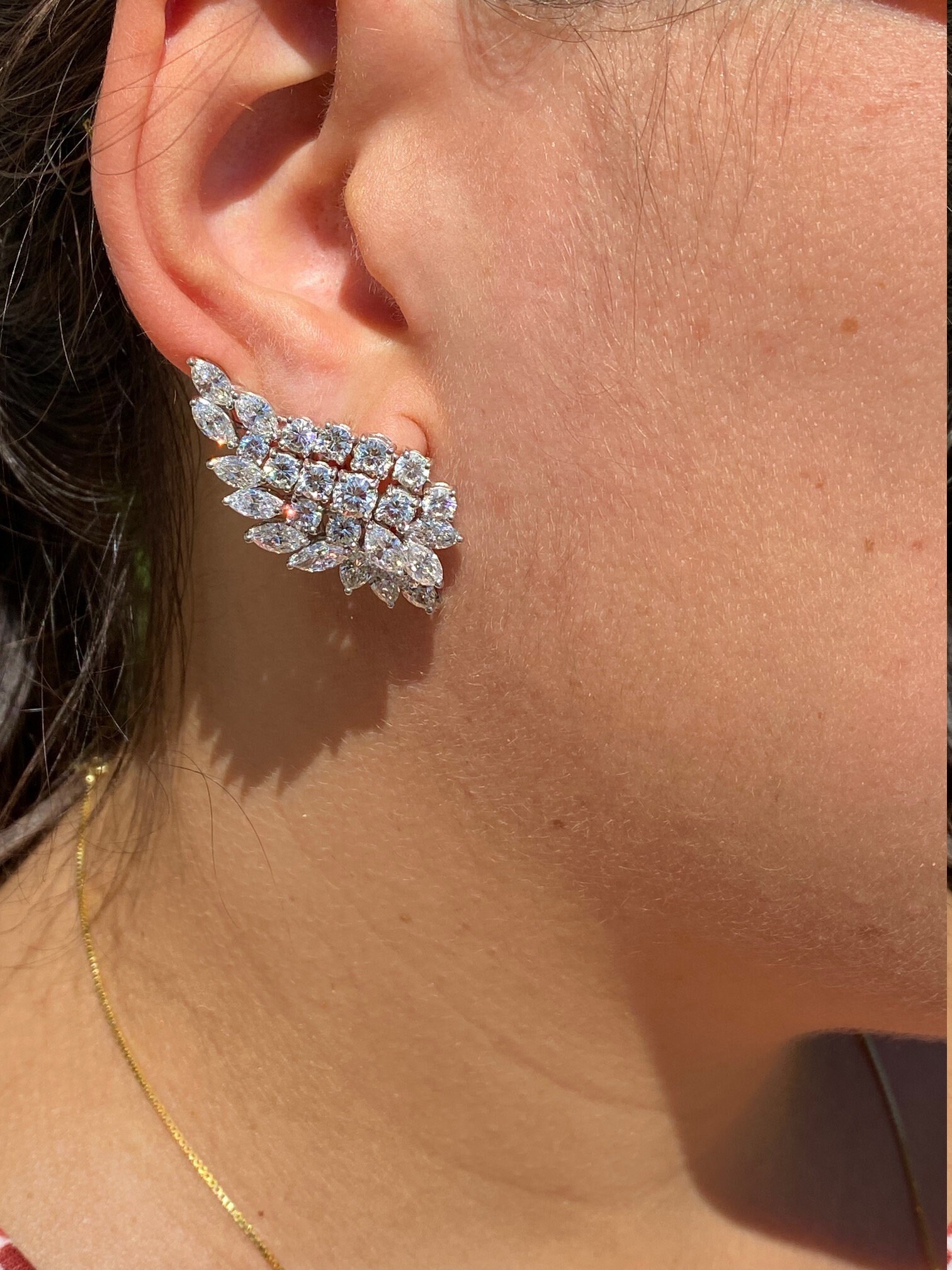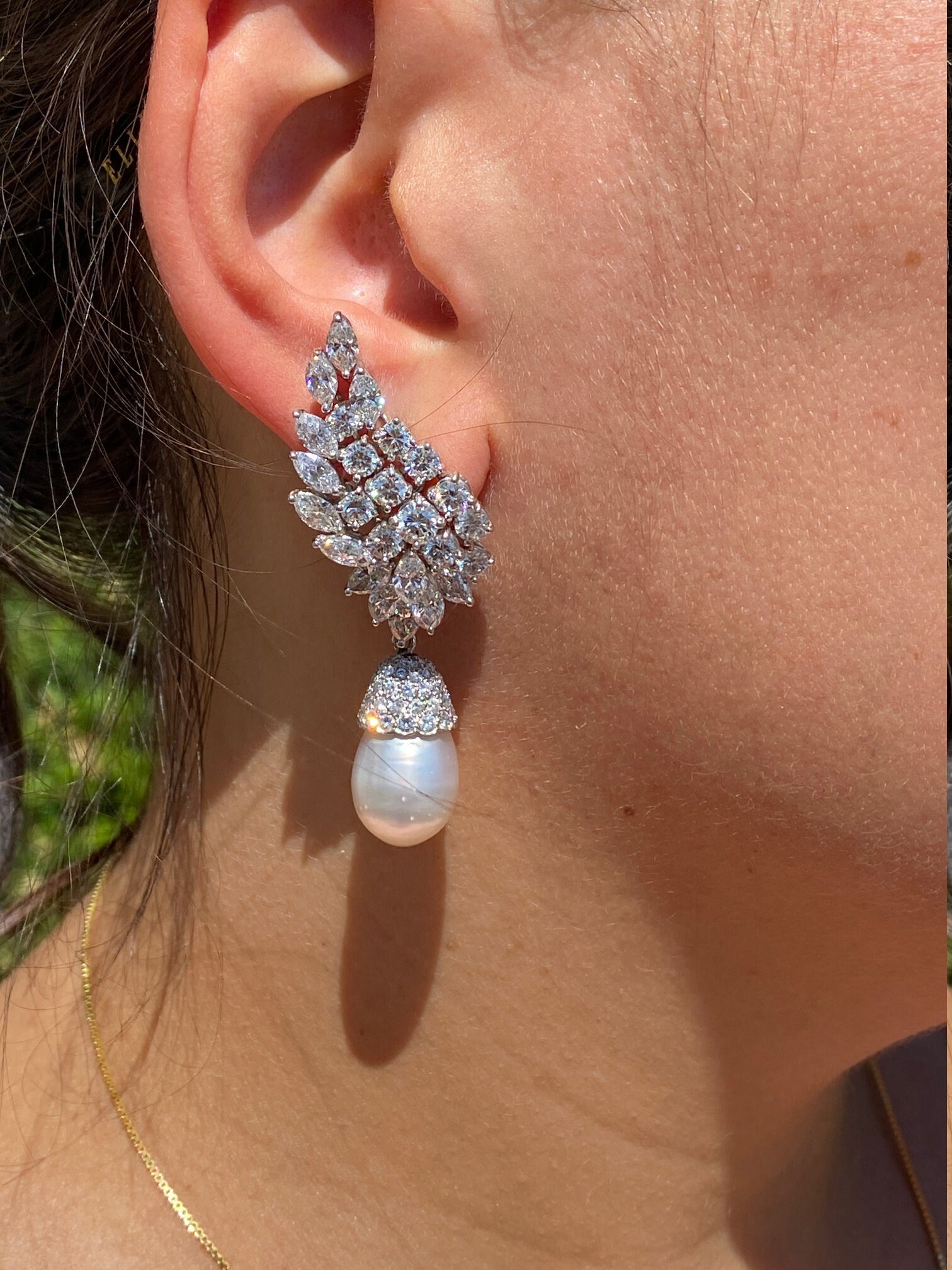 Platinum and Diamond Dangling Pearl Drop Earrings. These earrings are set with approximately 11.84 carats of diamonds between marquise brilliant cuts and round brilliant cuts. The earrings have the day to night conversion and are able to be worn with or without the removable pearl drops. The drops have round brilliant cut diamonds pave set in the cap and South Sea pearls that measure 12mm by 17.5mm all of which are set in platinum. The earrings are a very comfortable weight to wear. Amazing earrings from the Hollywood glamour days of the 1940’s-1960’s.