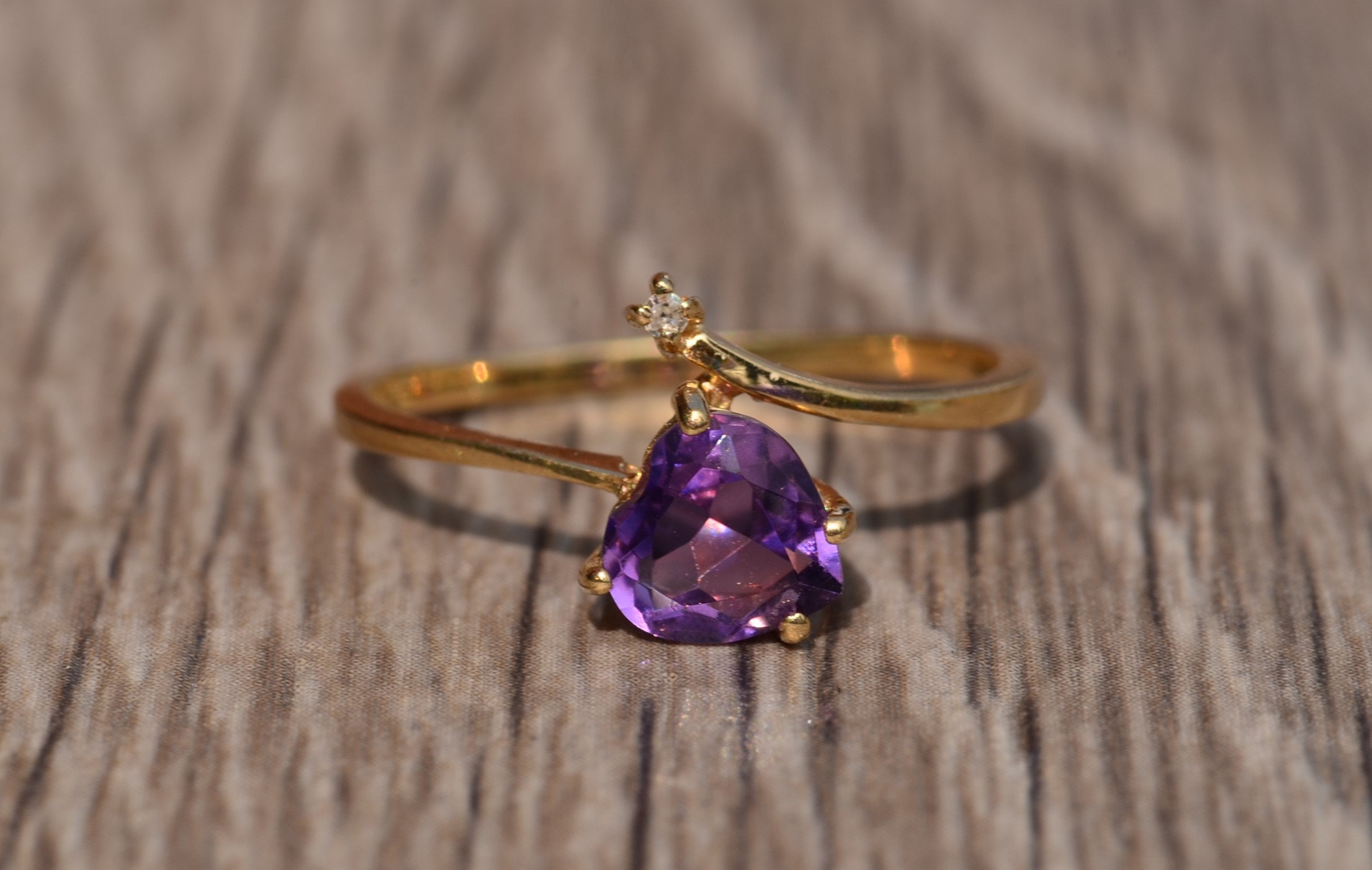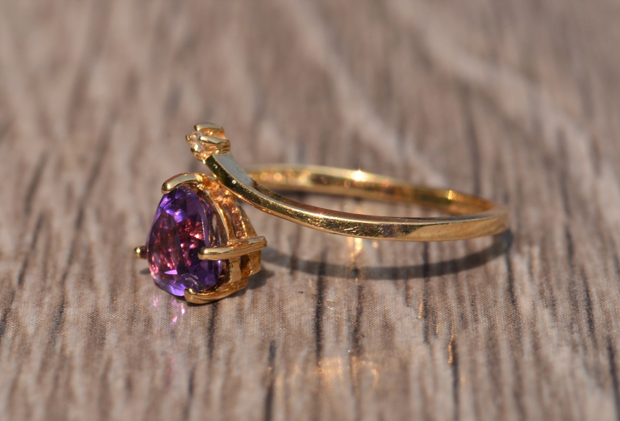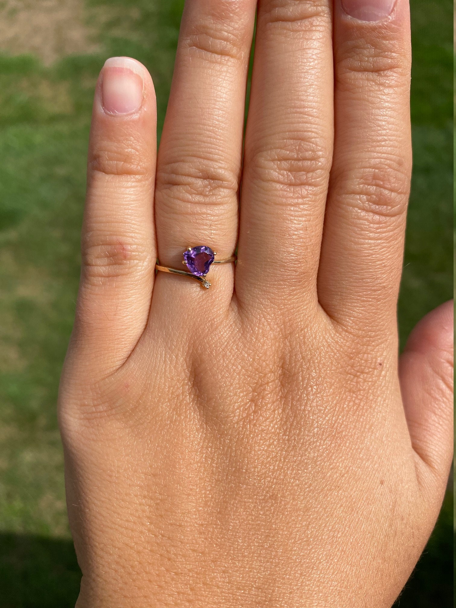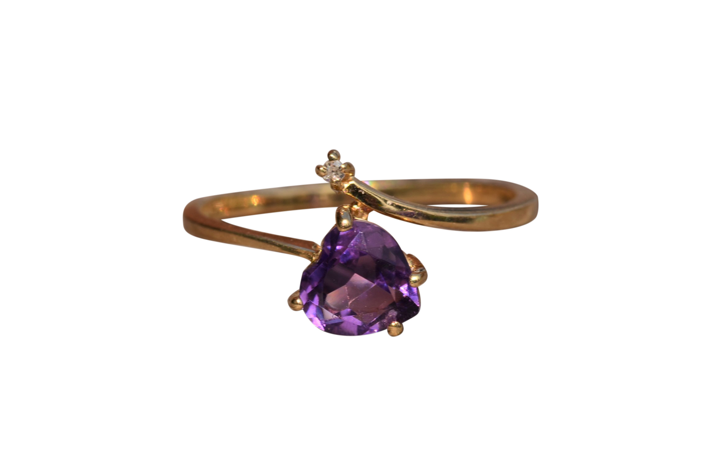 Vintage Yellow Gold Amethyst and Diamond Bypass Ring. This trendy ring features a heart shaped amethyst and small diamond in a bypass style setting. Wear this ring in either direction! Currently this ring is a finger size 6 1/4, yet can be adjusted in size.