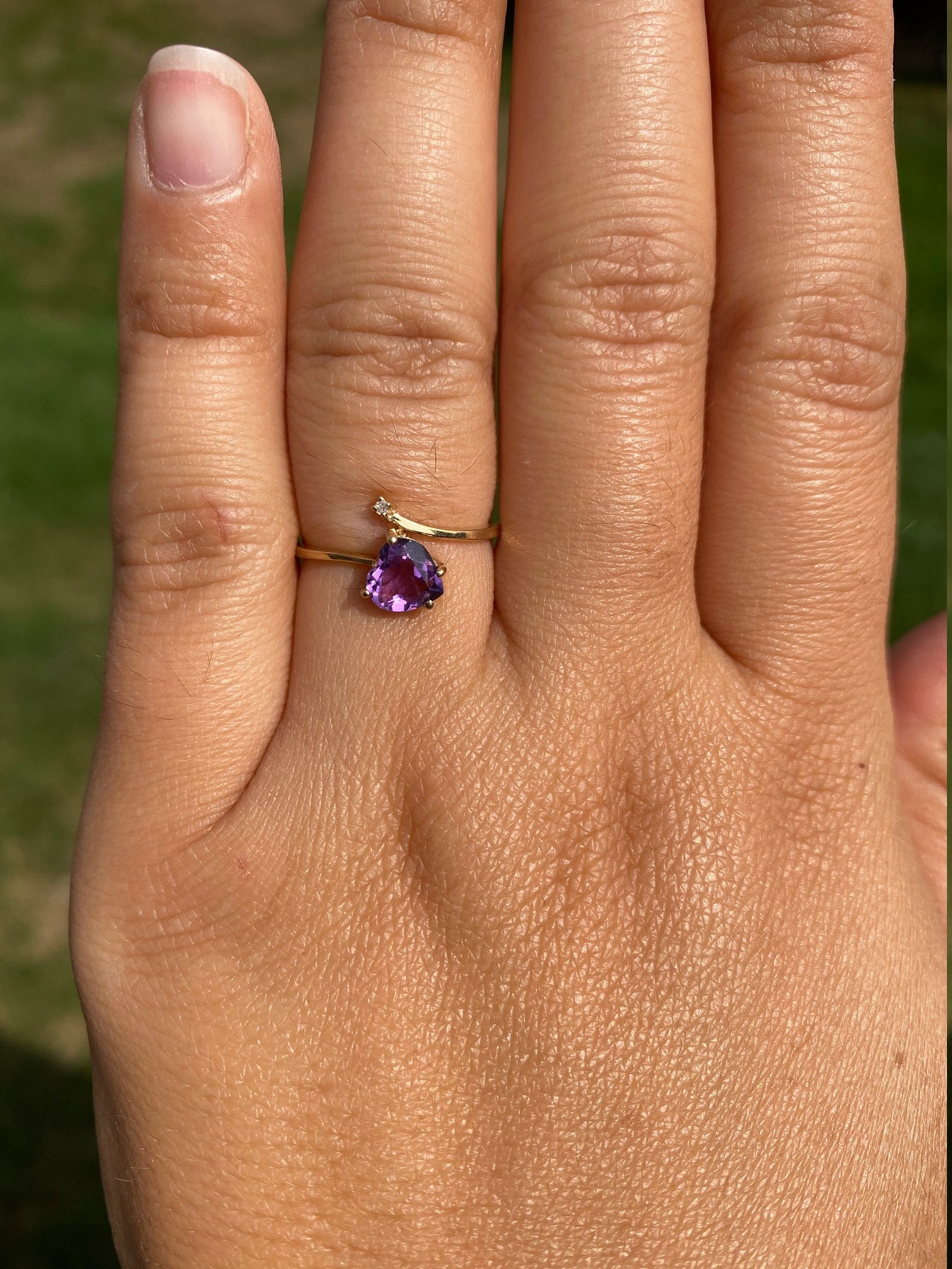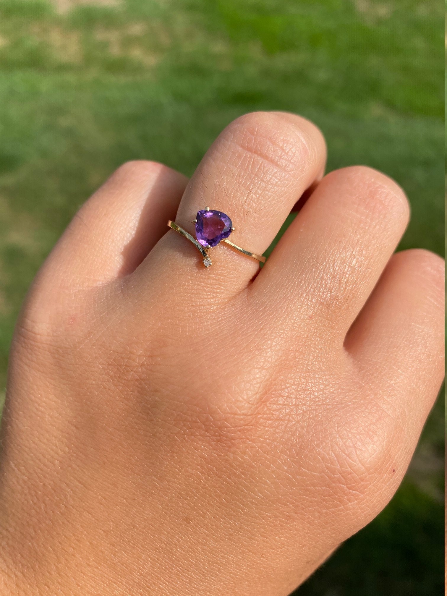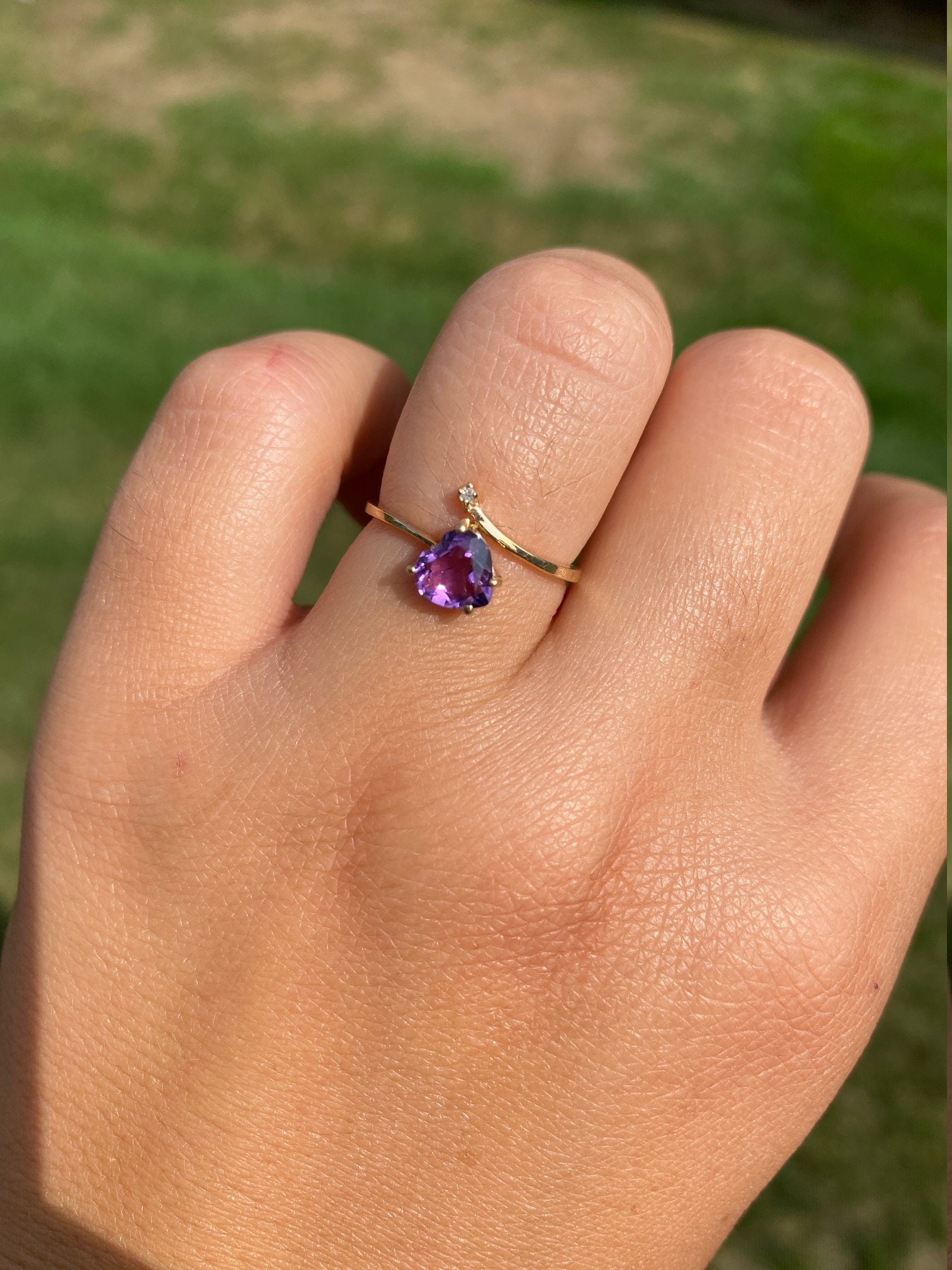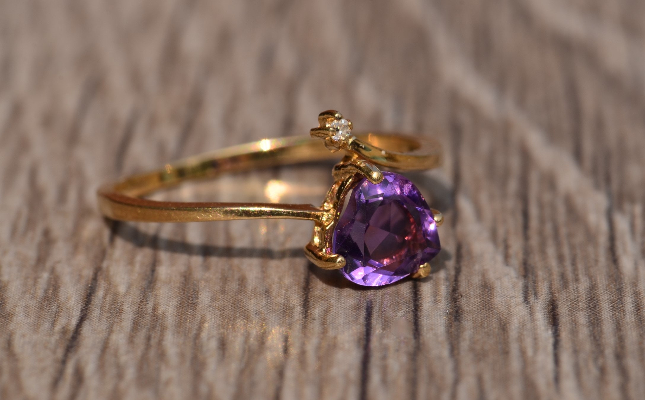 Vintage Yellow Gold Amethyst and Diamond Bypass Ring. This trendy ring features a heart shaped amethyst and small diamond in a bypass style setting. Wear this ring in either direction! Currently this ring is a finger size 6 1/4, yet can be adjusted in size.
