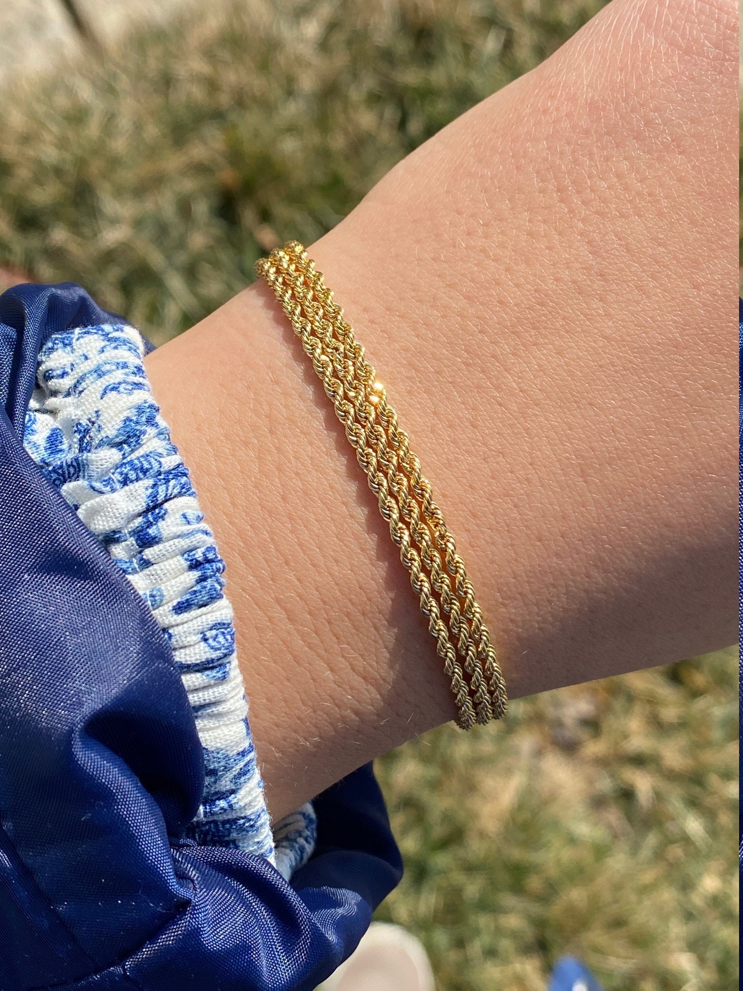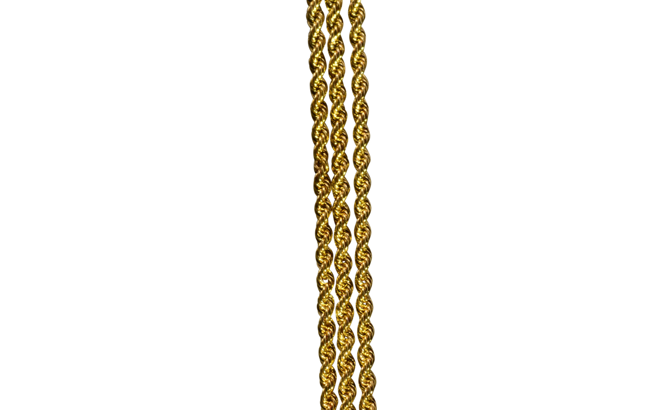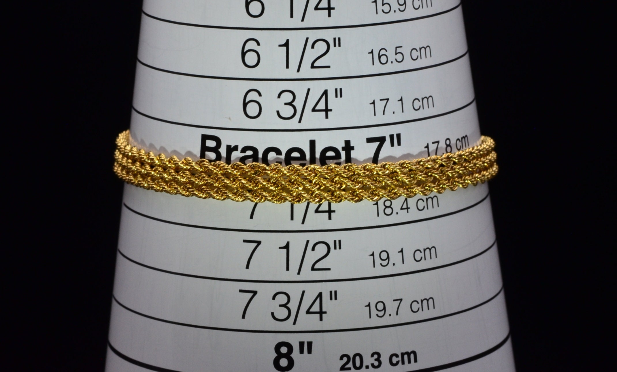 The Lowndes: Ladies 14K Yellow Gold Turkish Triple Rope Bracelet. This multistrand bracelet measures 7 inches in length and 1/4 inch in width. The bracelet features 3 rope chains brought together by a lobster claw style clasp.