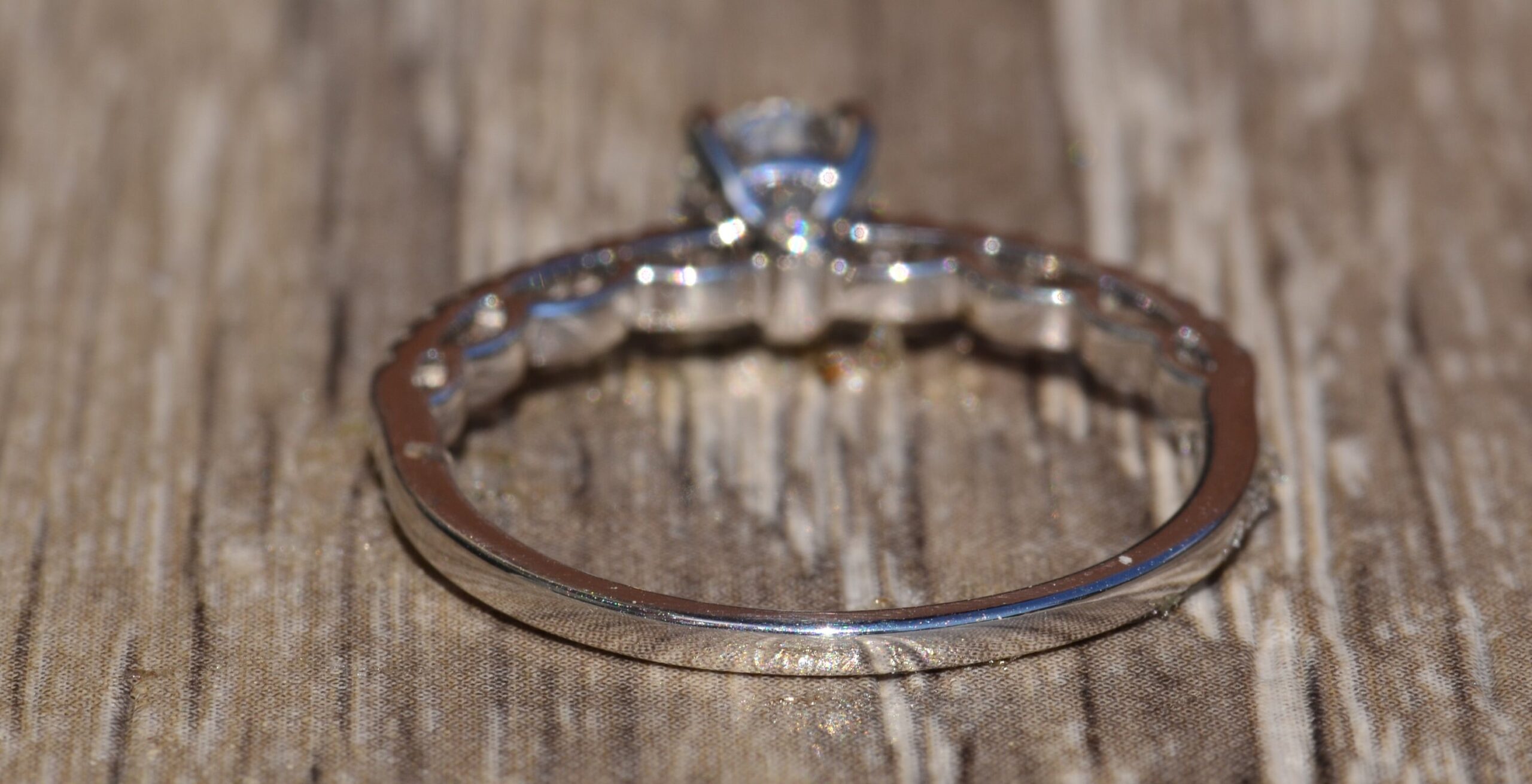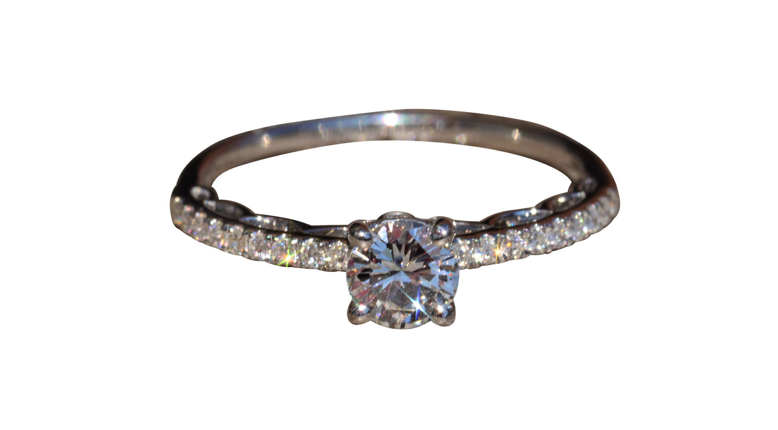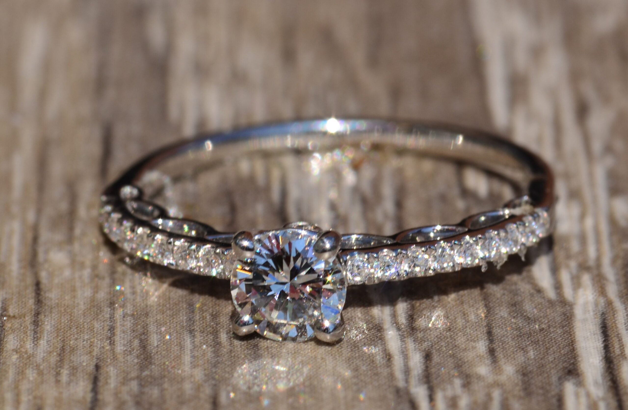 Custom White Gold Engagement Ring center set with 0.41 carat round brilliant cut diamond. The diamond has an approximate Gemological Institute of America clarity grade of Si1 and a color grade of H. On either side of the center are shared prong set diamonds. There are also scalloped and pierced edges in the through-finger view with a single diamond set below the head. Crafted in 18 karat white gold, this ring is currently a finger size 6 3/4, but can be adjusted in size.