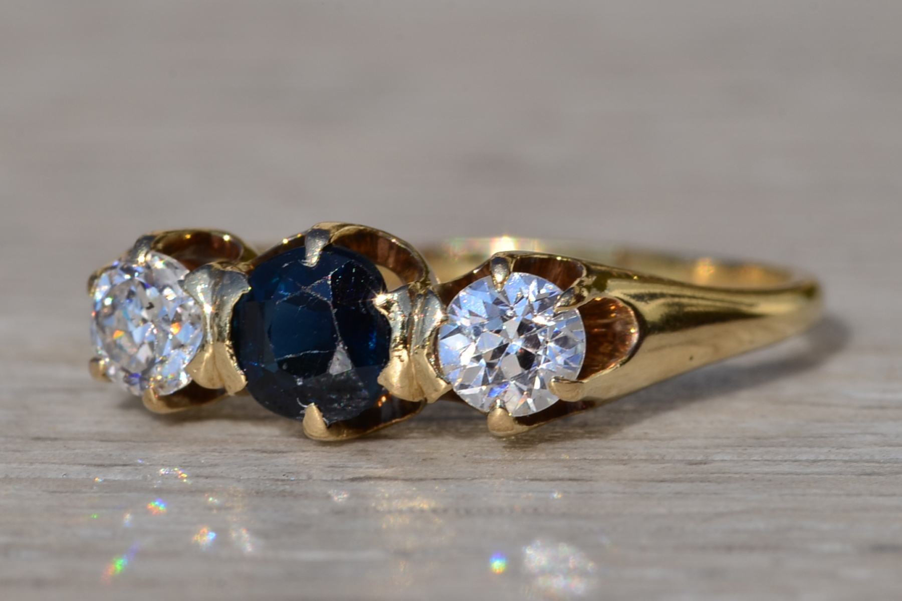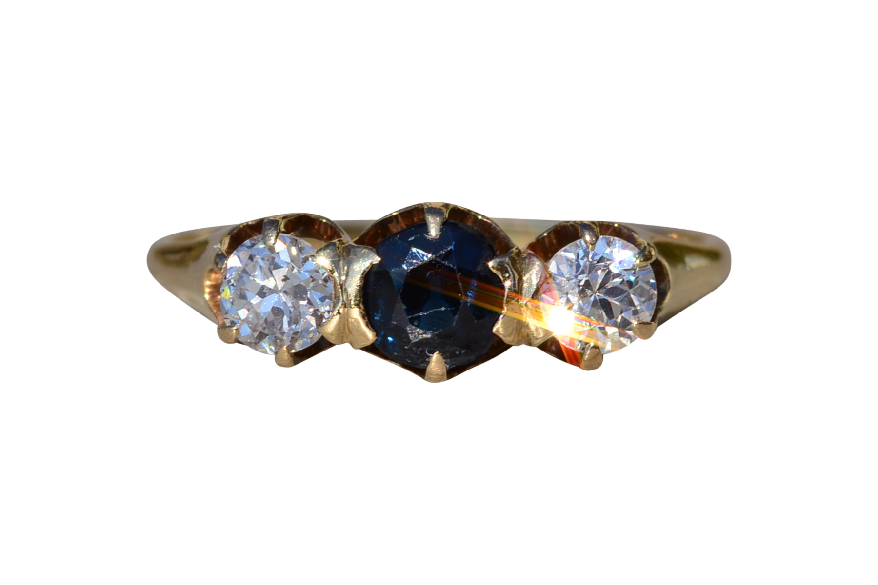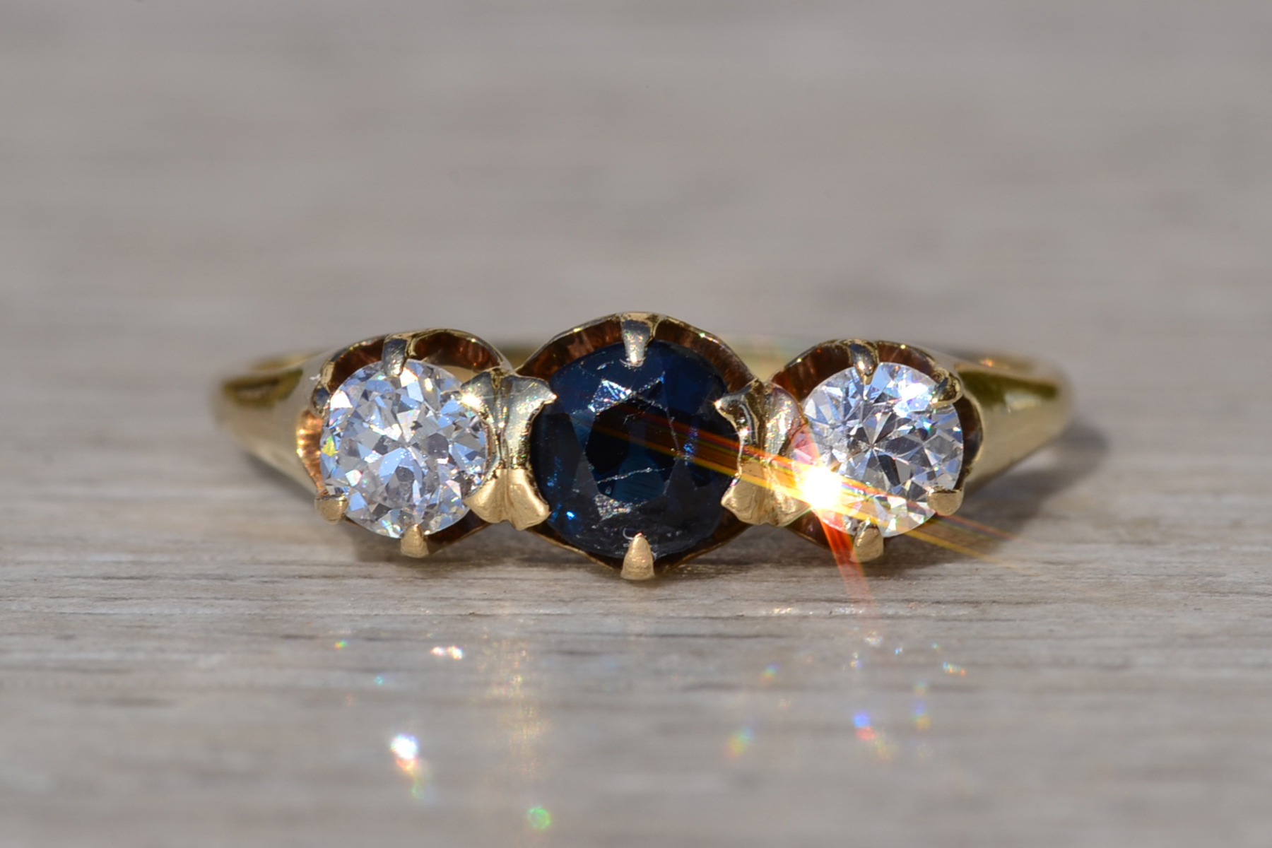The Macleay: Ladies Antique Sapphire and Diamond Trilogy Ring in Yellow Gold - Jewelry Memo