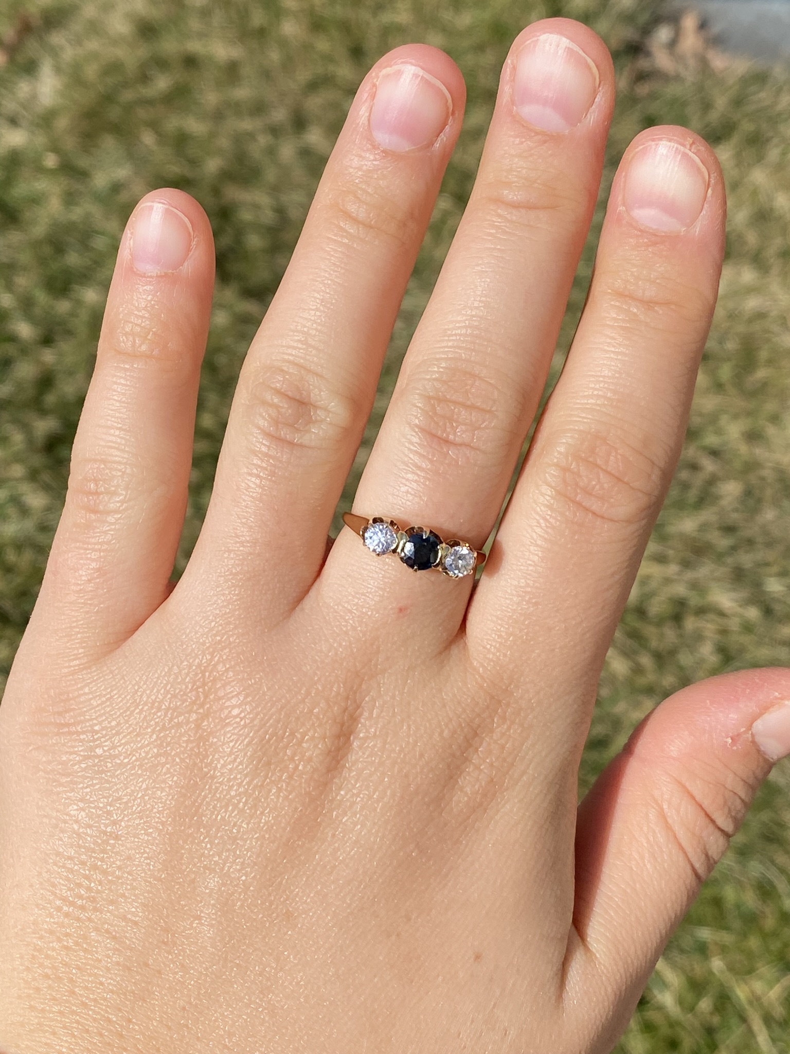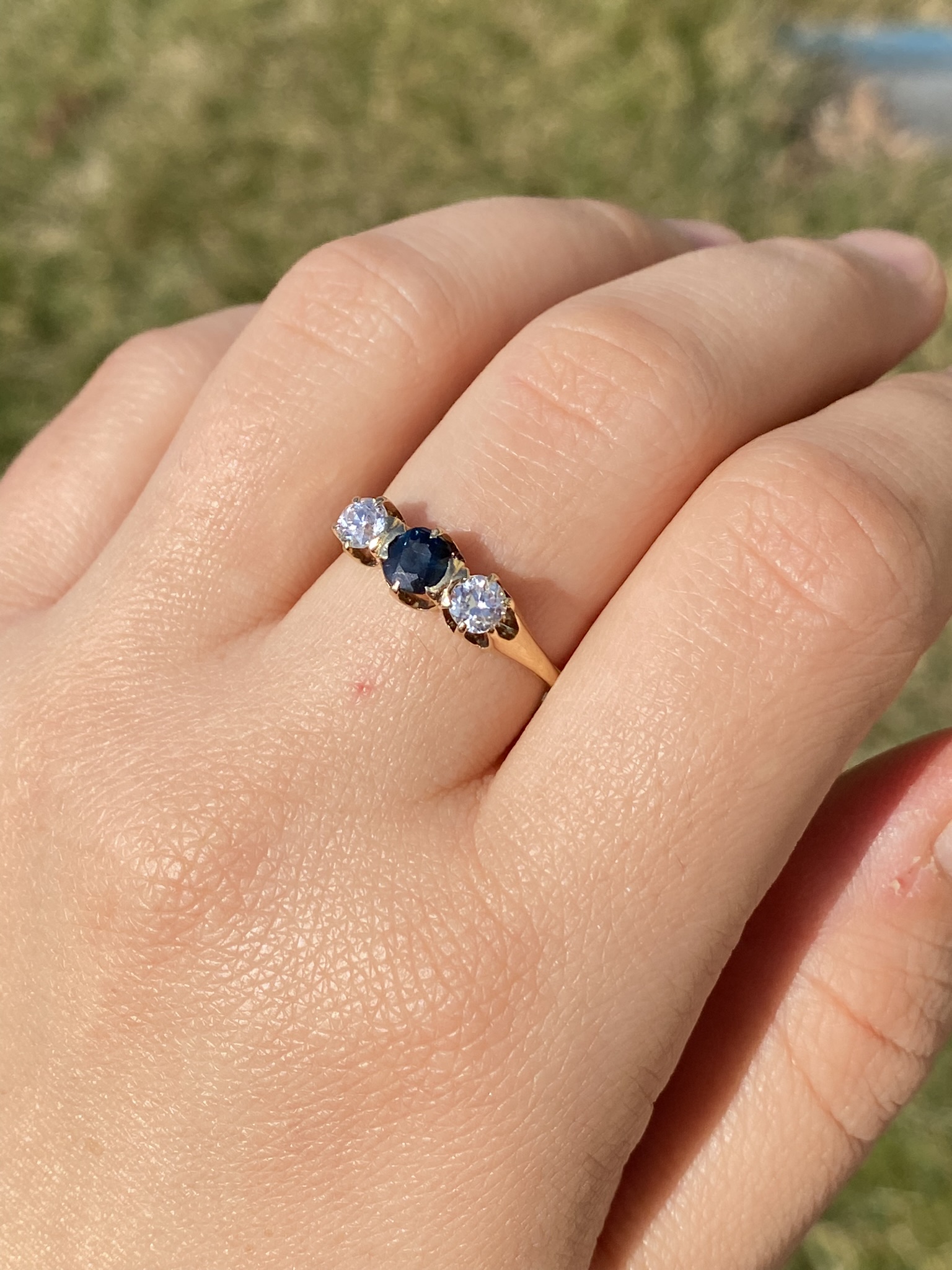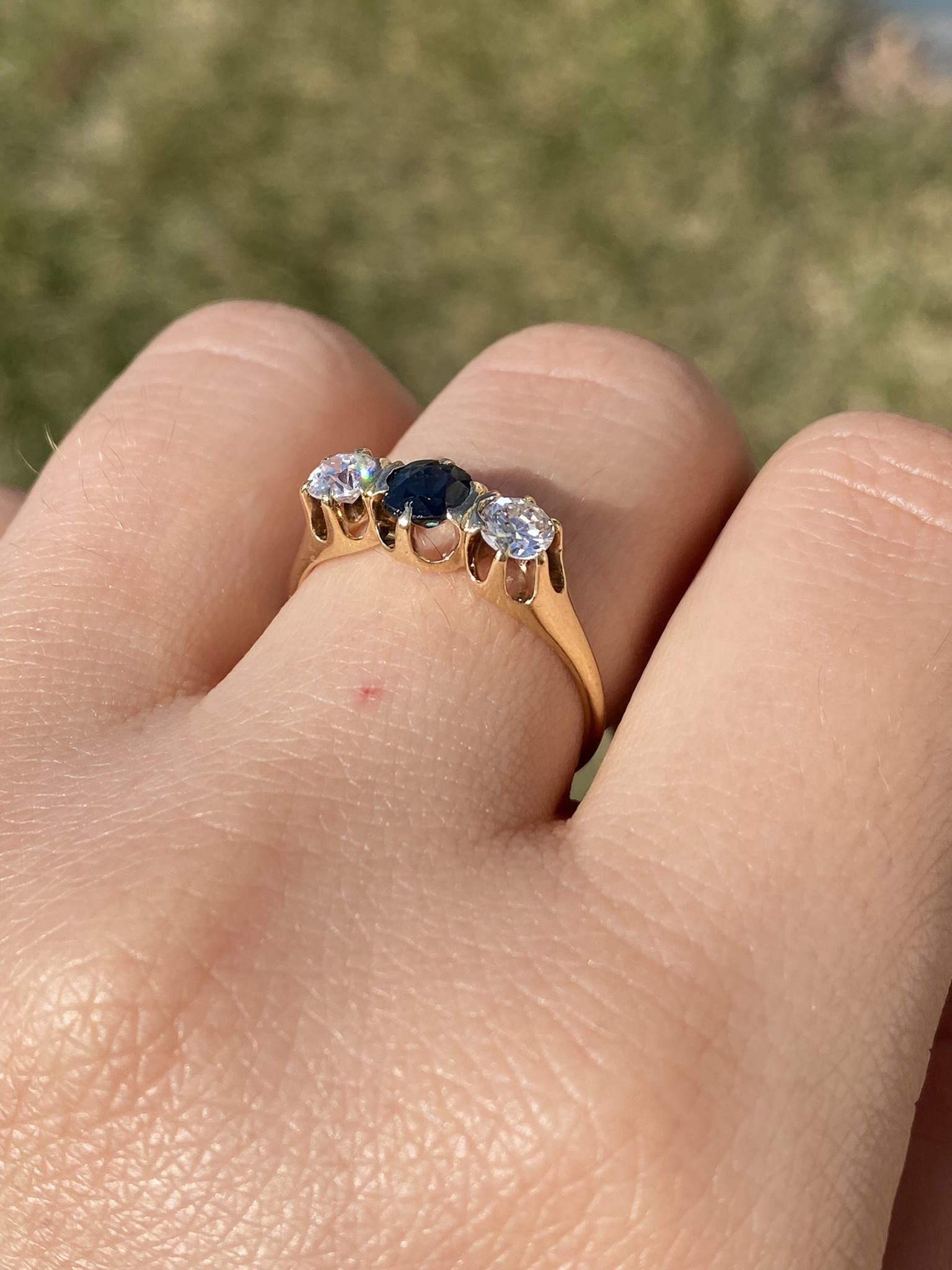 SKU: 23400718 Categories: All Antique & Vintage Engagement Rings, All Antiquities & Vintage, Anniversary Gifts, Anniversary Gifts For Her, Antique & Vintage Cocktail Rings, Antique Engagement Rings, Birthday Gifts, Birthday Gifts for Her, Cocktail Rings, Colored Stone Engagement Rings, Edwardian Jewelry, Engagement Rings, Gift Ideas, Graduation Gifts, Graduation Gifts For Her, Holiday Gift Ideas, Holiday Gifts for Her Tags: 14K, antique, antique gold ring, cocktail ring, diamond, diamond ring, engagement ring, gift for her, Gold, Gold Ring, gold trilogy ring, Ladies, past present future, ring, sapphire, sapphire ring, statement ring, three stone ring, trilogy ring, women, yellow gold