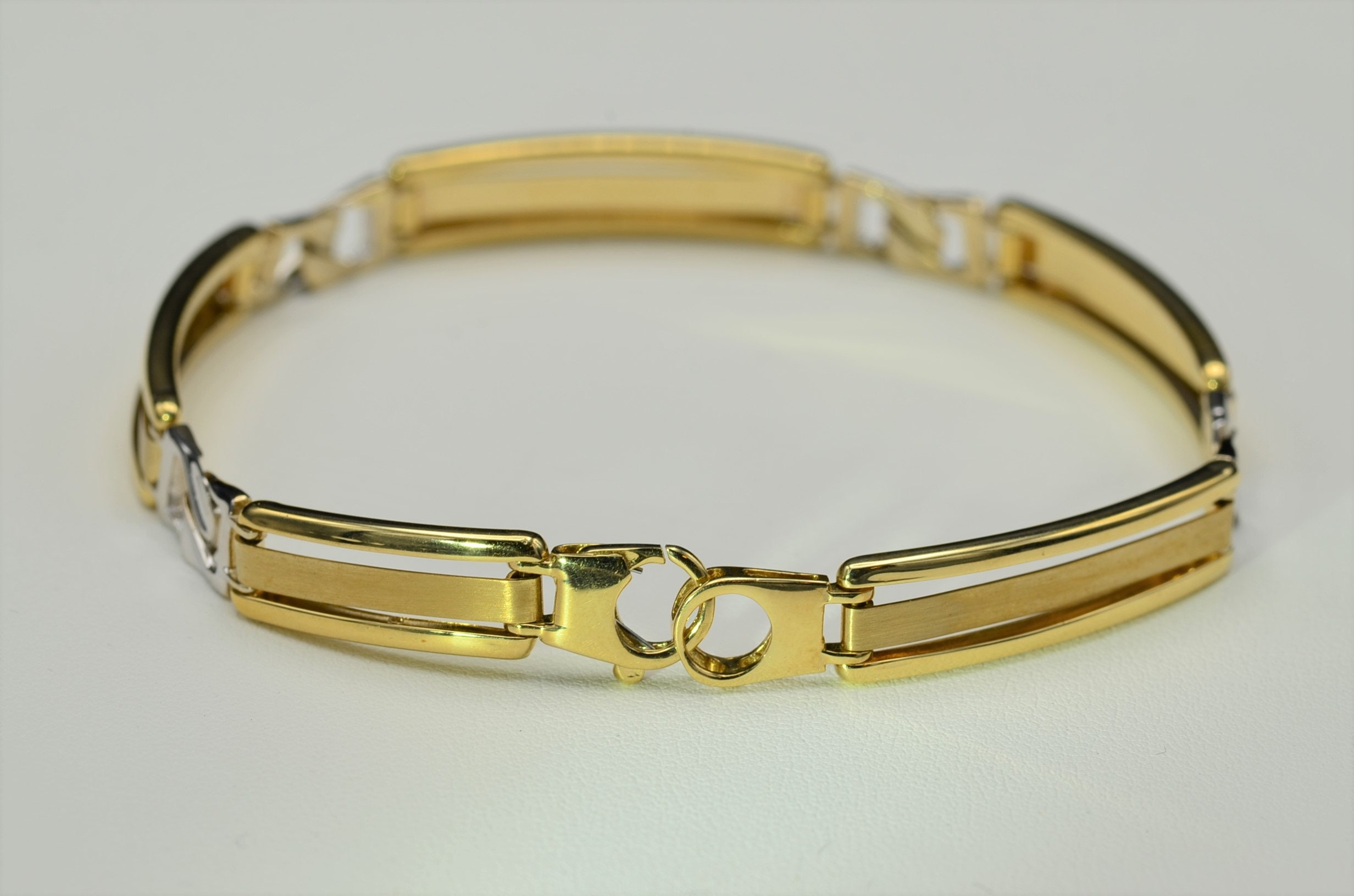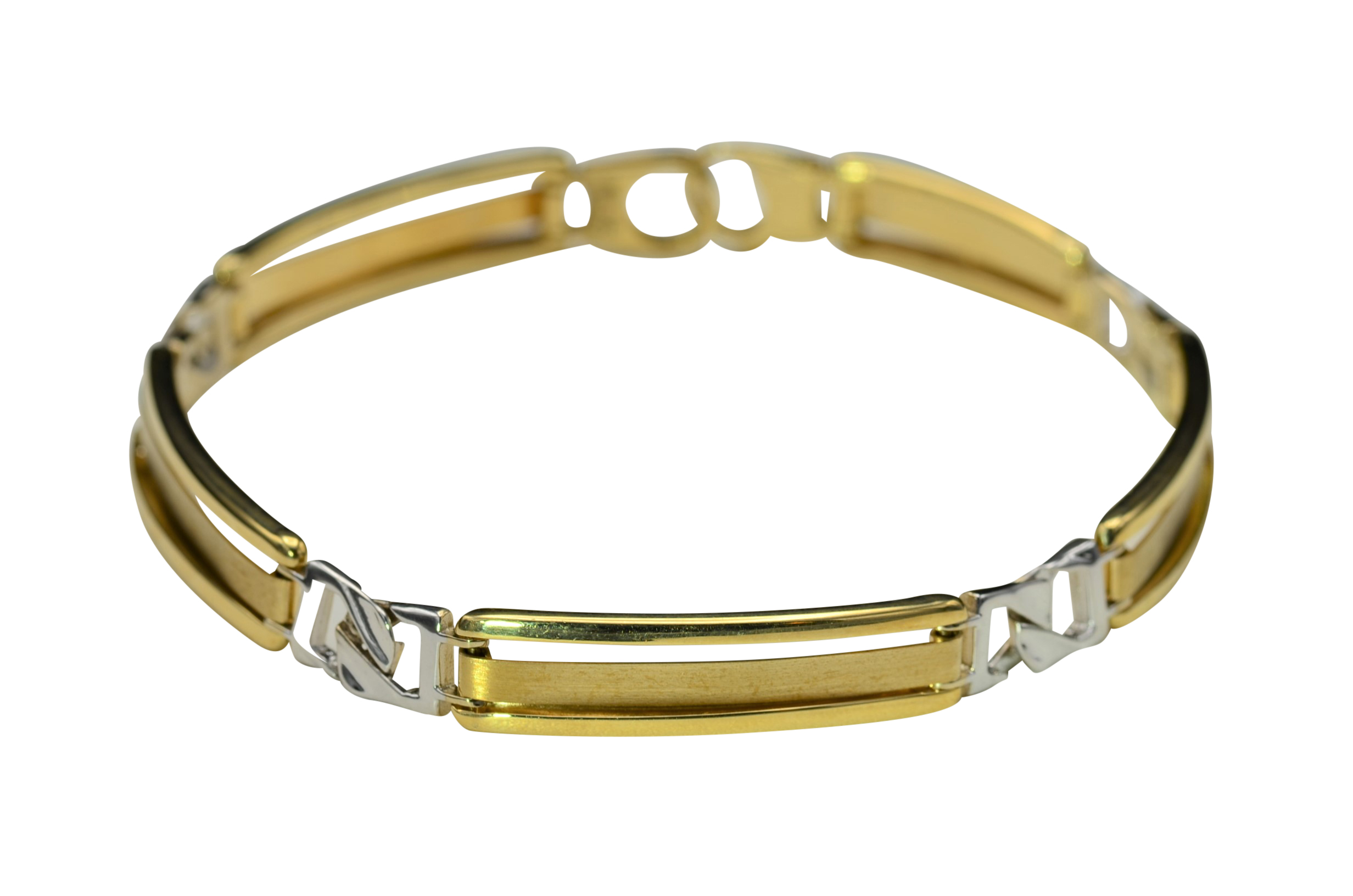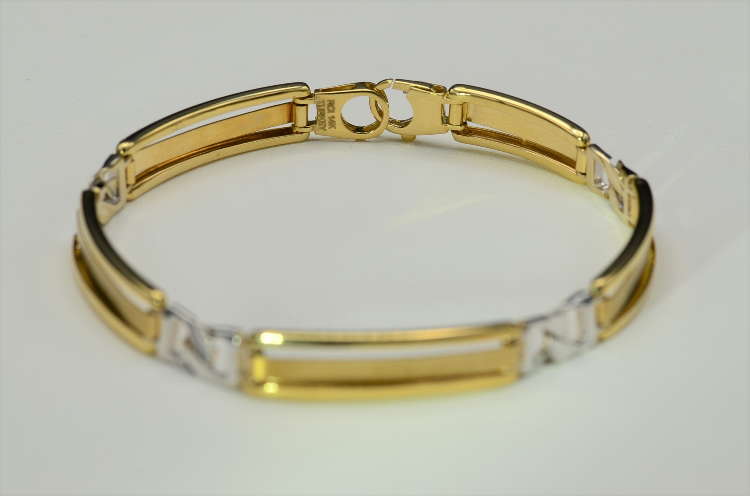 Men’s 14K Two Tone Gold Bracelet. This bold men’s bracelet is crafted in 14 karat yellow and white gold and measures 8 inches in length. A lobster style clasp completes this bracelet.