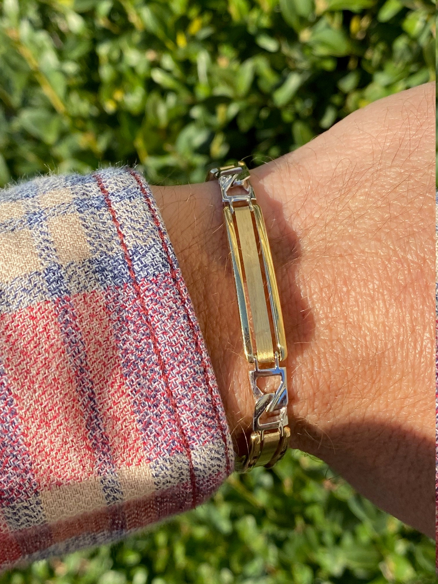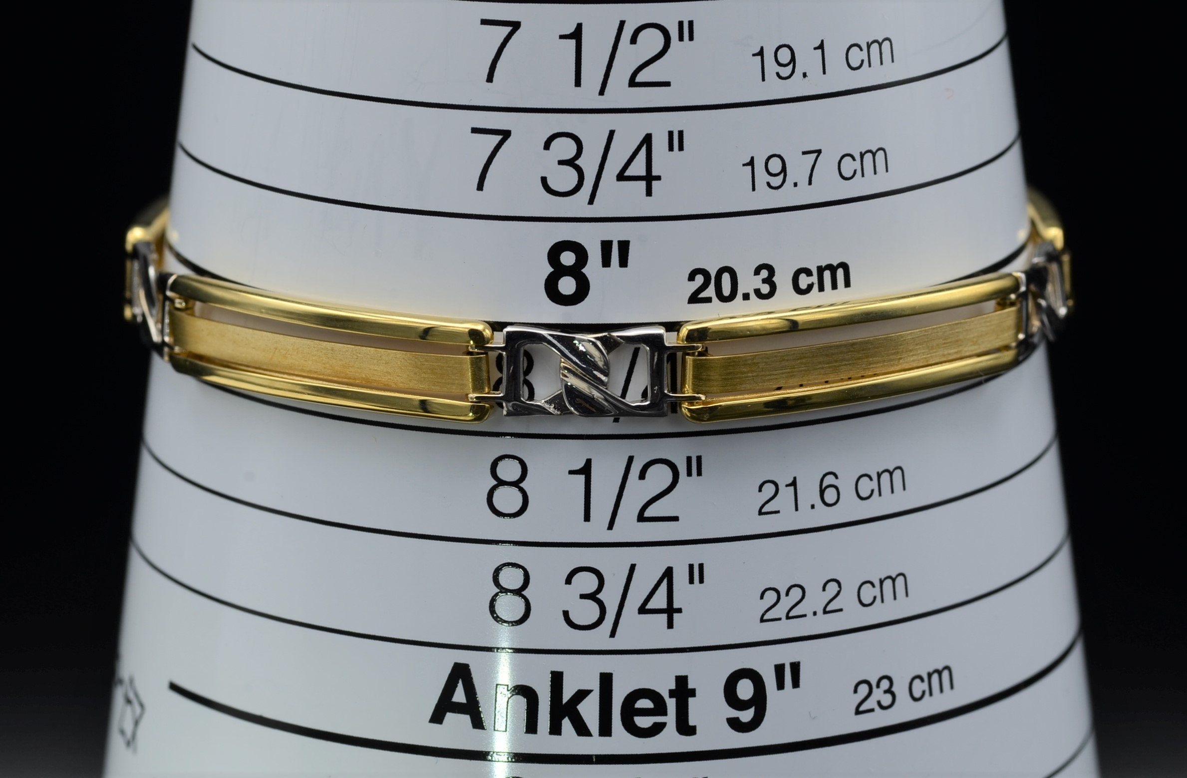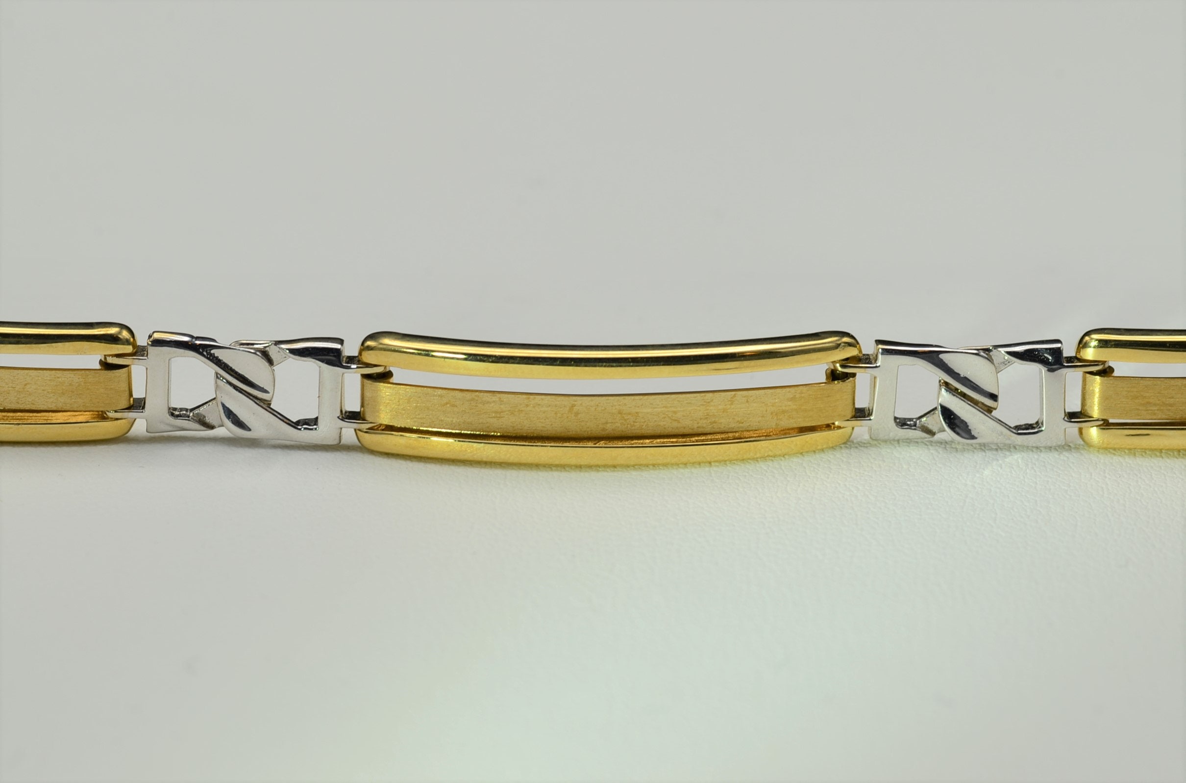 Men’s 14K Two Tone Gold Bracelet. This bold men’s bracelet is crafted in 14 karat yellow and white gold and measures 8 inches in length. A lobster style clasp completes this bracelet.