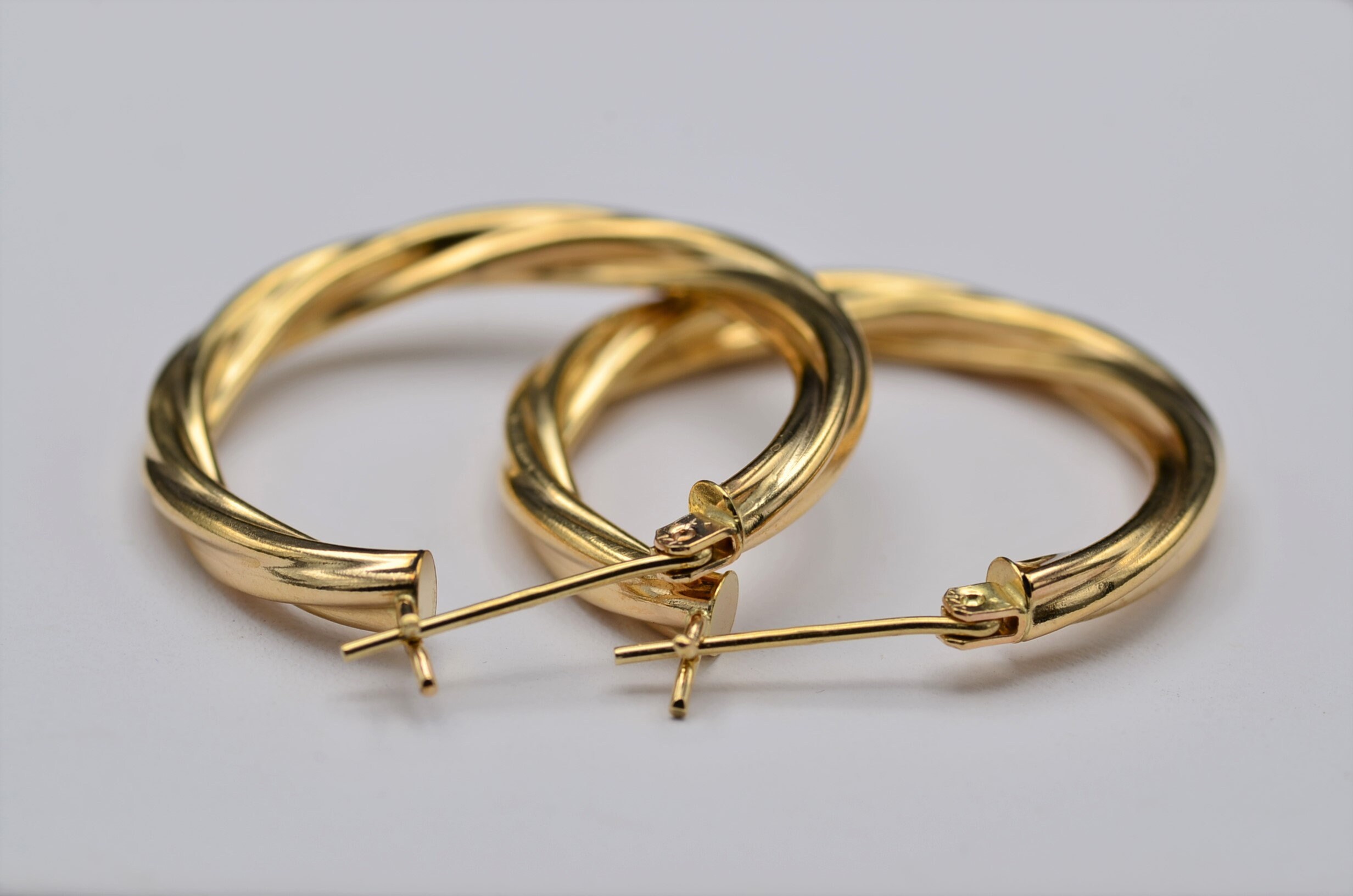 Vintage Ladies 14 Karat Gold Hoop Earrings. Crafted in 14 karat yellow gold, these hoops measure just over 1 inch in width and feature latch back closures. Dainty, classic lightweight hoops with a vintage French spiral design.
