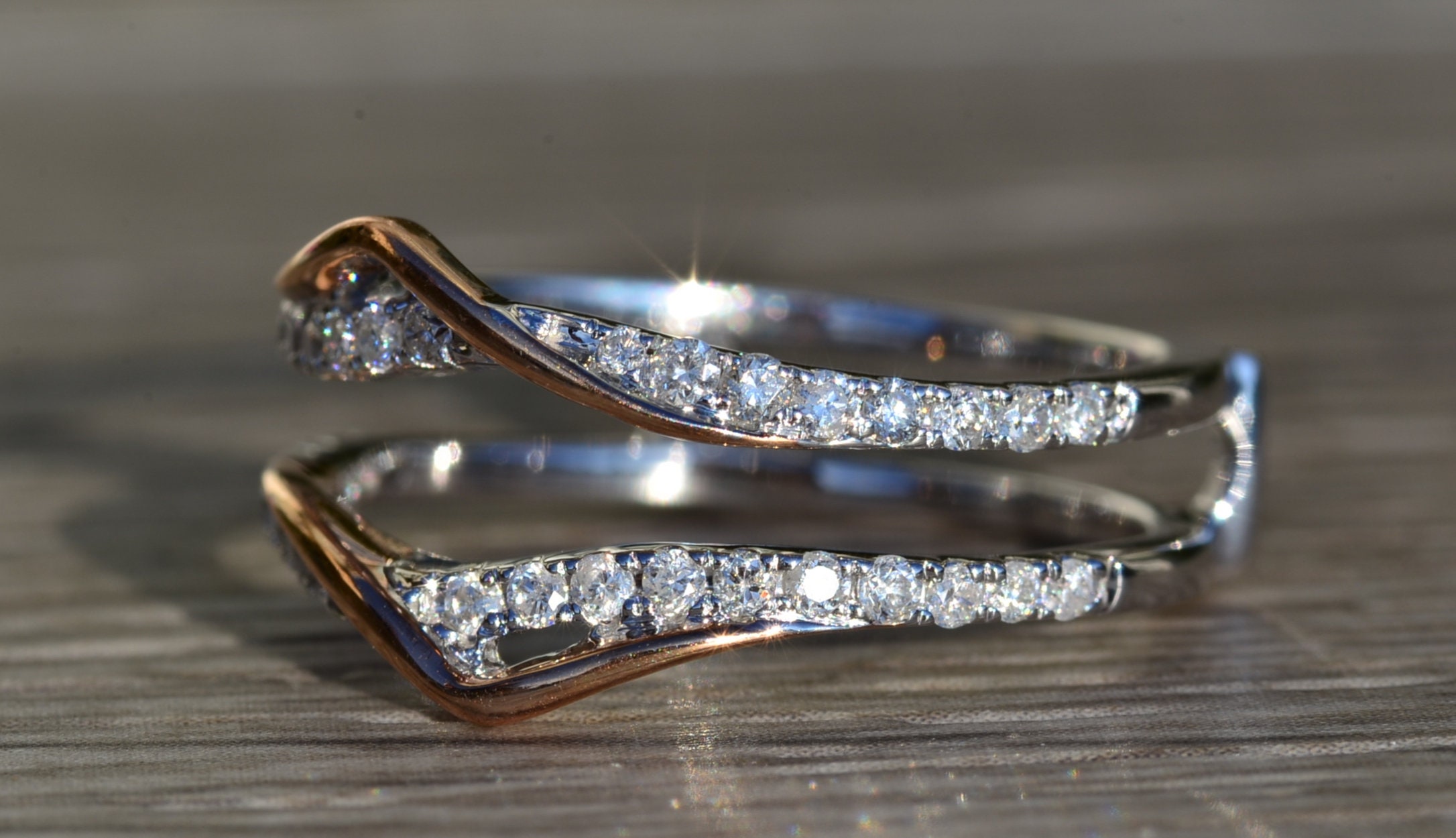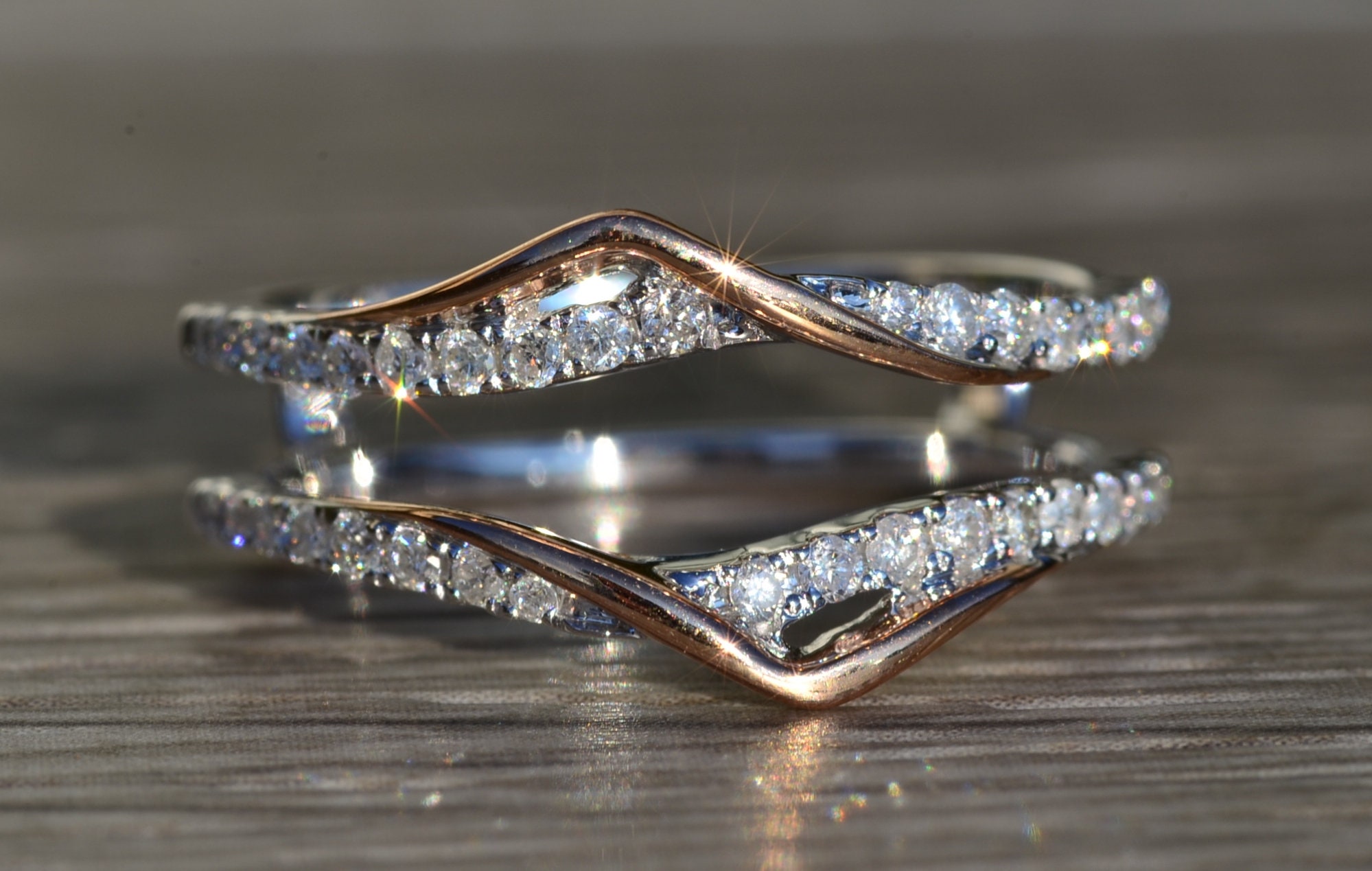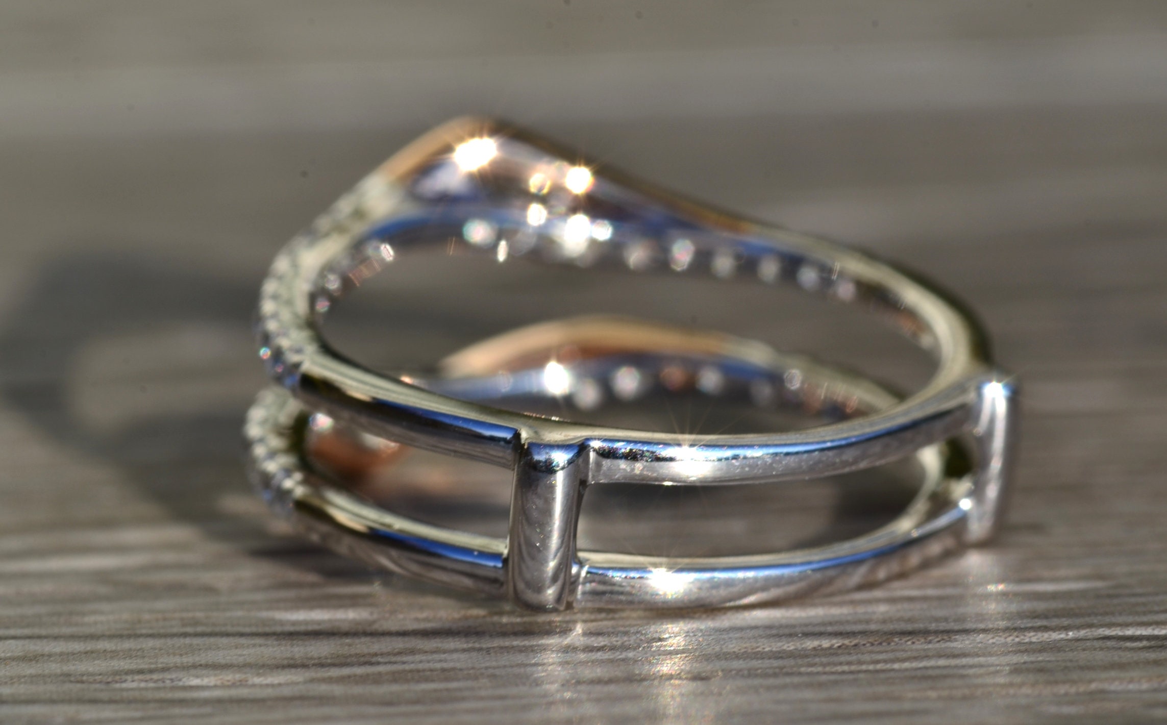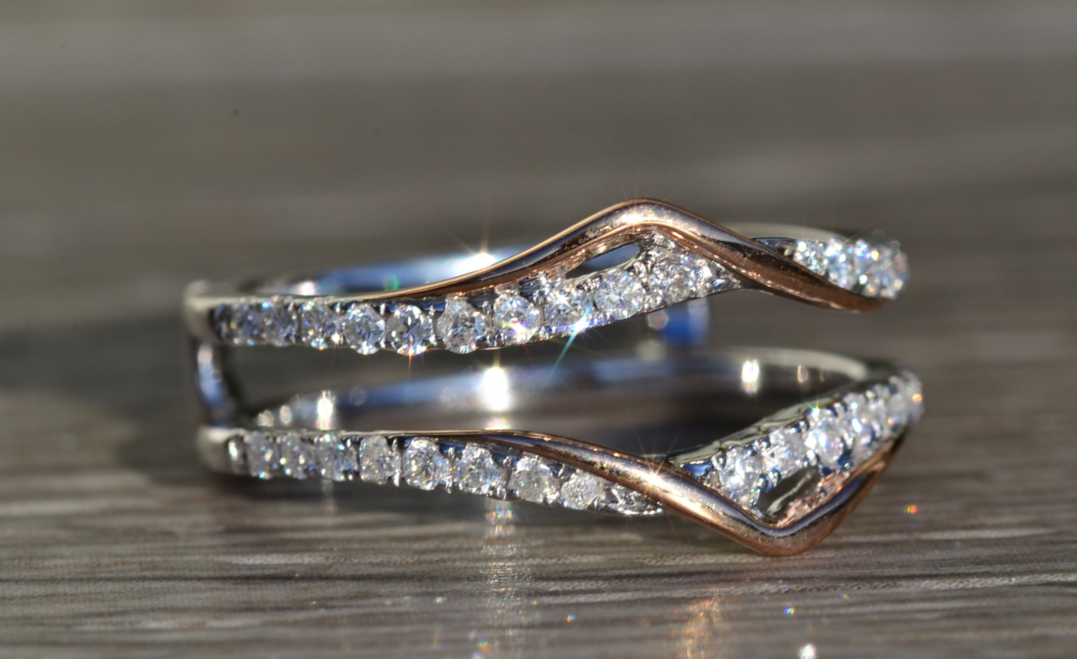 The Maynardville: Ladies 14K Two Tone Diamond Ring Jacket. Crafted in 14 karat white gold, this ring jacket features a quarter carat of diamonds set throughout with two rose gold crossover accents. Pair this jacket with your engagement ring or wear it as is! Currently a finger size 7, this ring can be resized for an additional charge.
