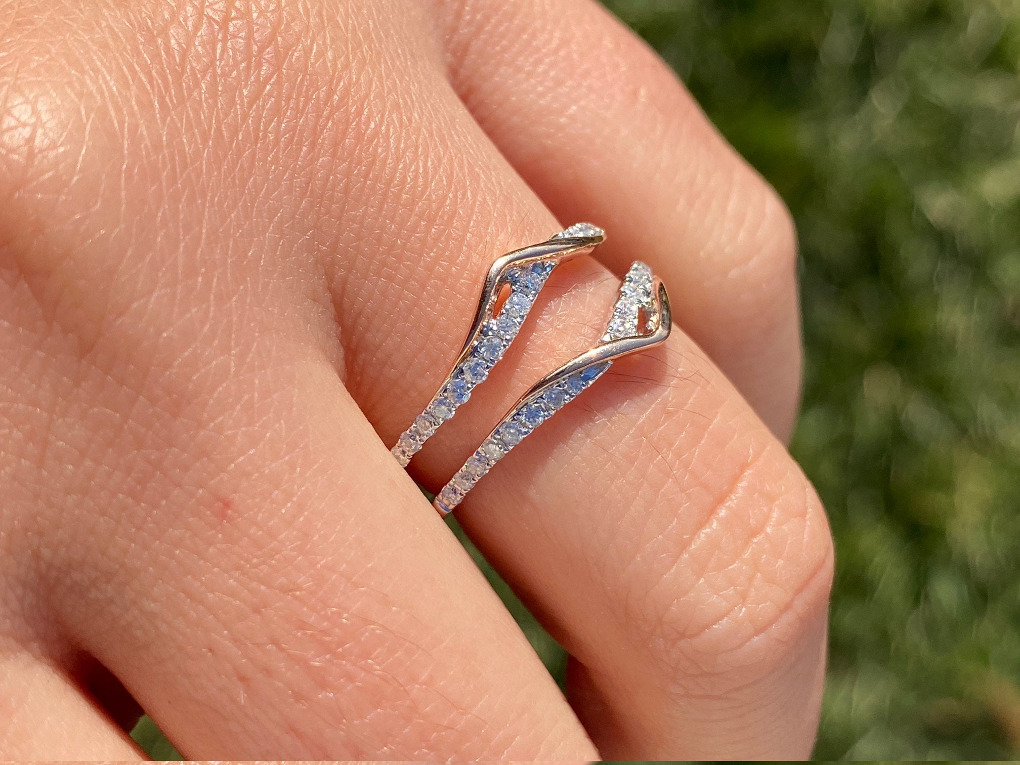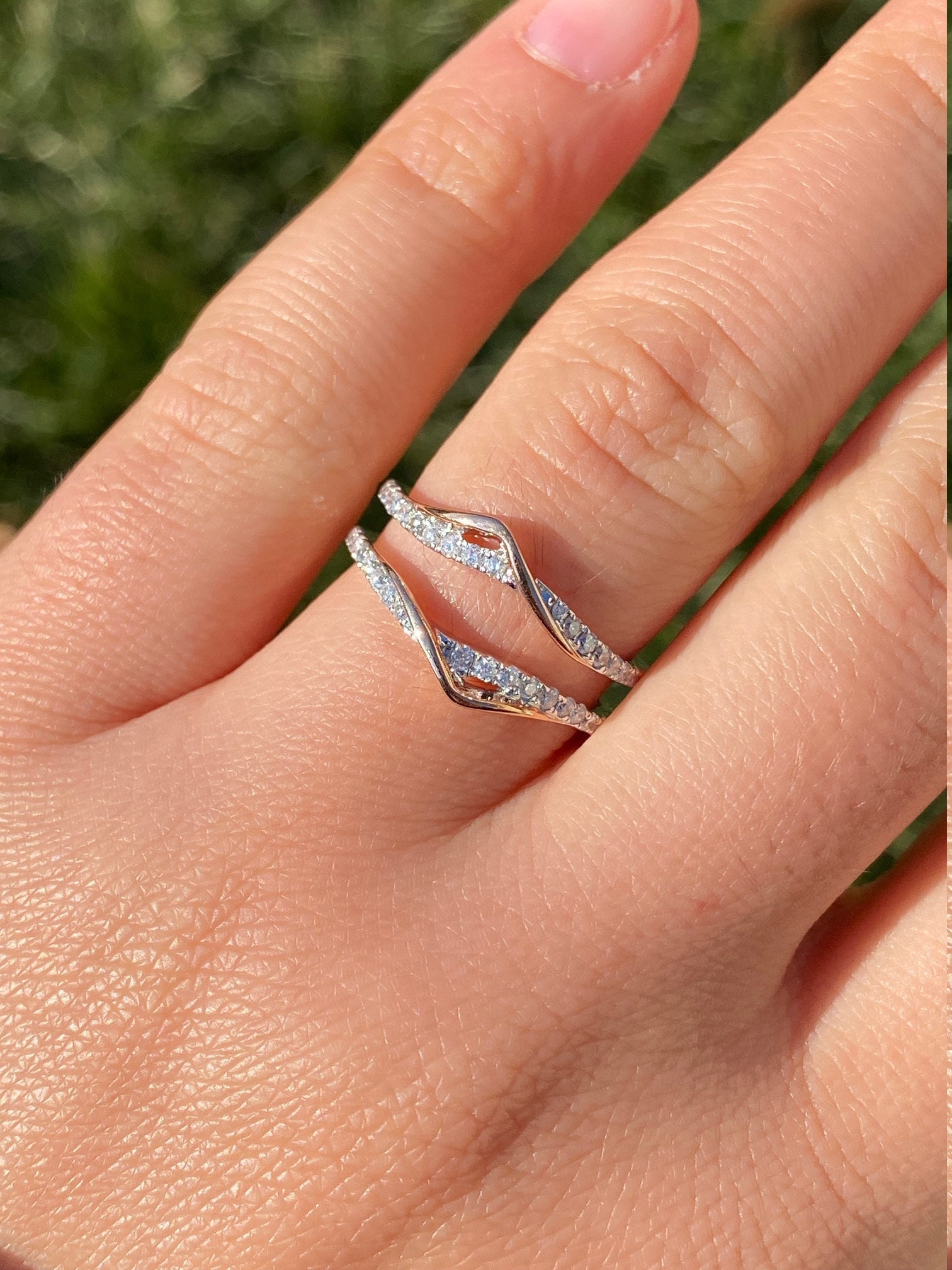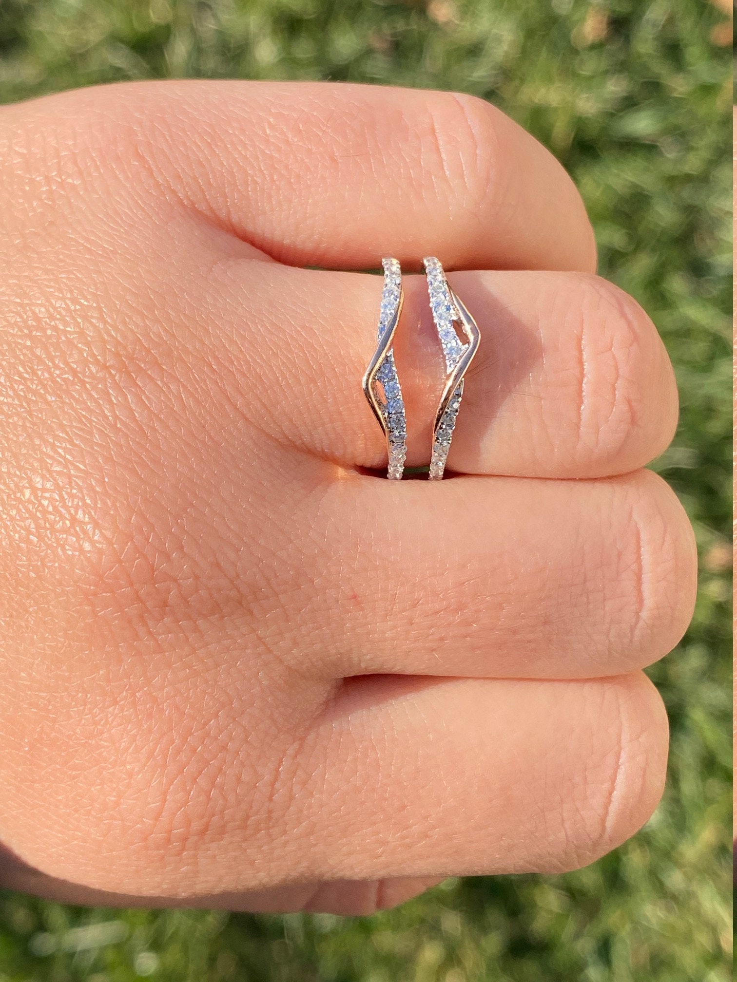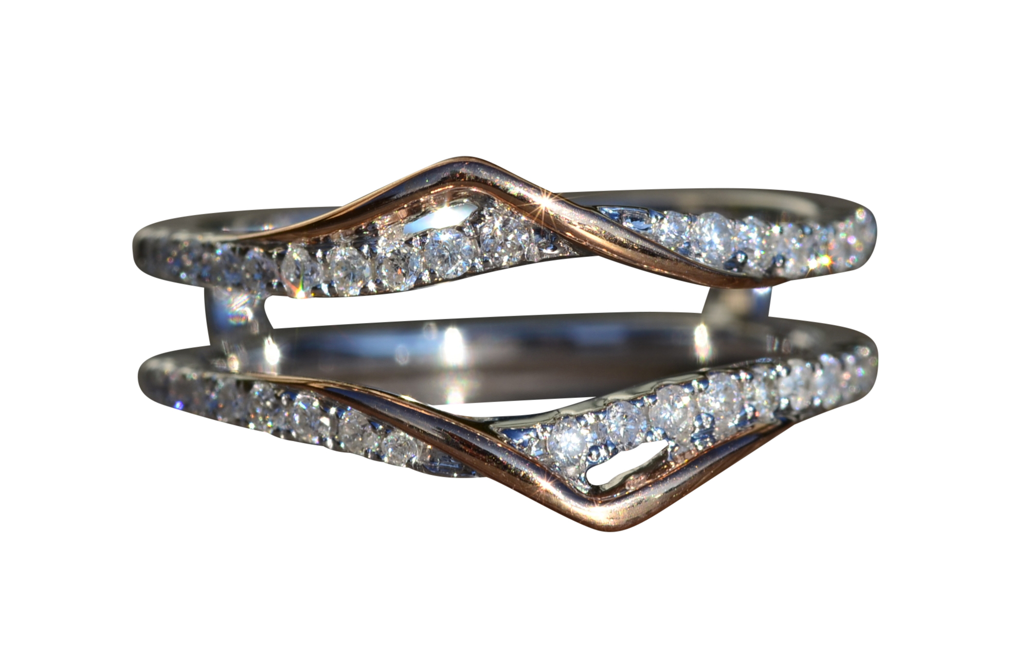 The Maynardville: Ladies 14K Two Tone Diamond Ring Jacket. Crafted in 14 karat white gold, this ring jacket features a quarter carat of diamonds set throughout with two rose gold crossover accents. Pair this jacket with your engagement ring or wear it as is! Currently a finger size 7, this ring can be resized for an additional charge.