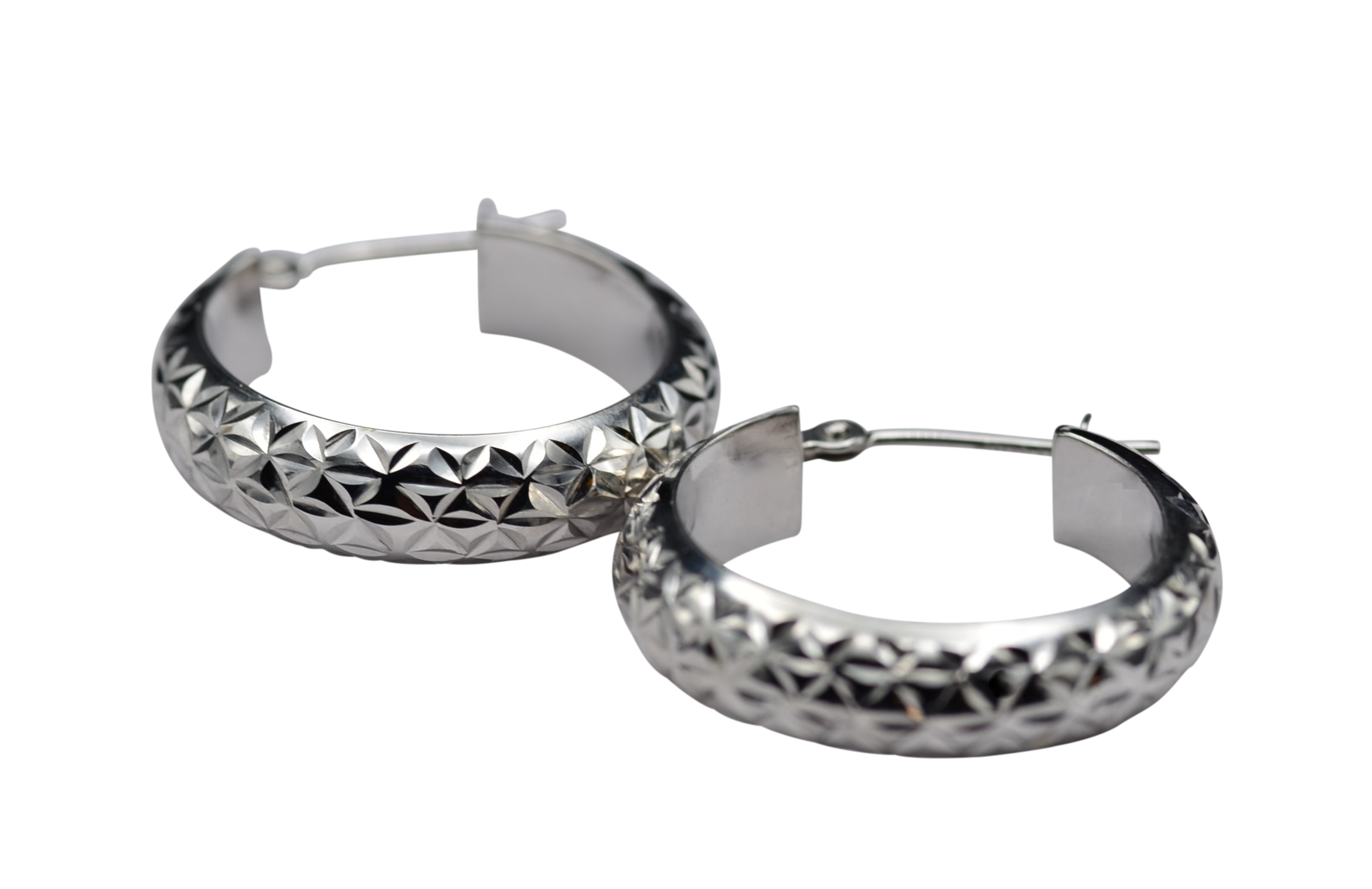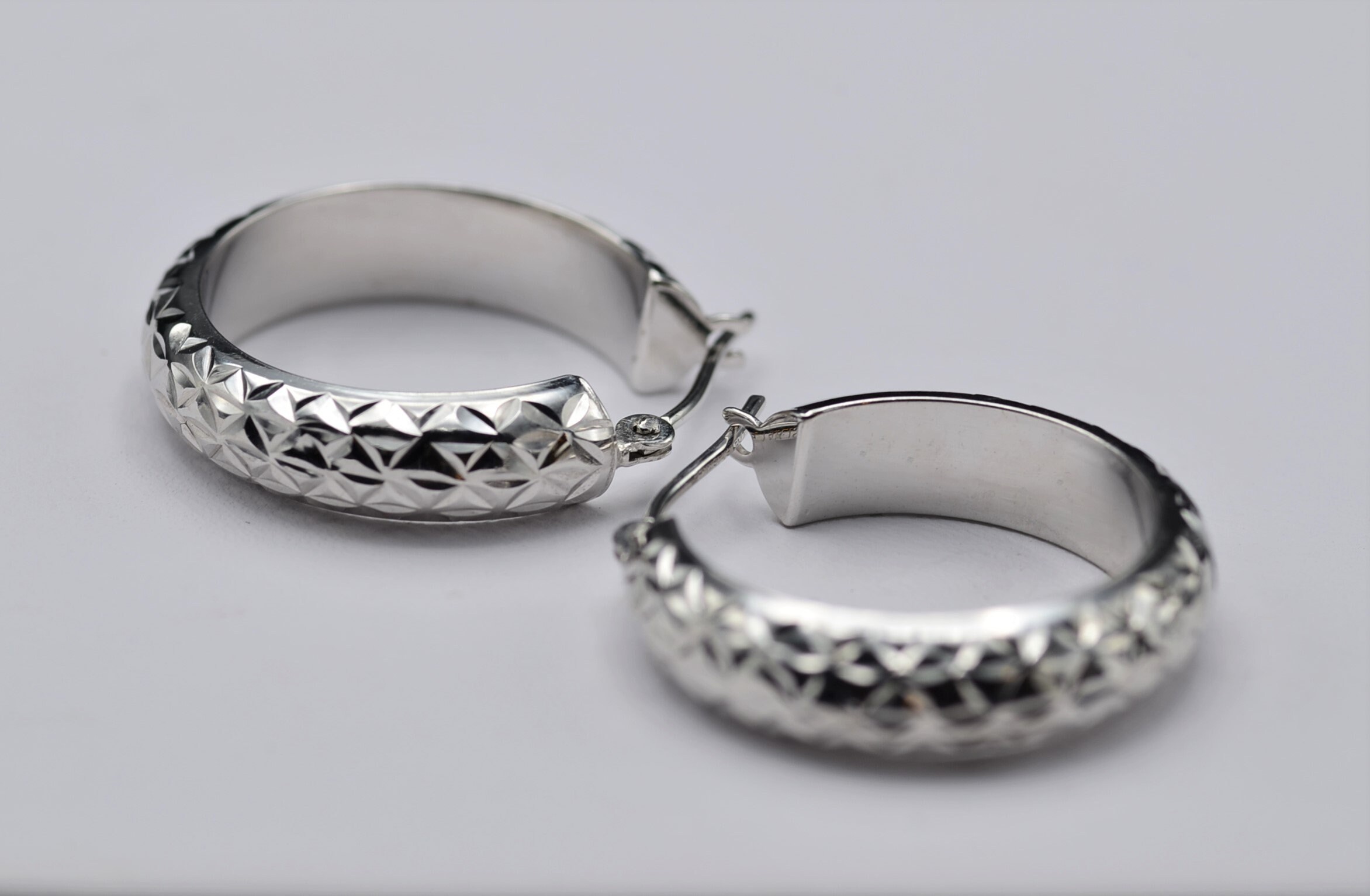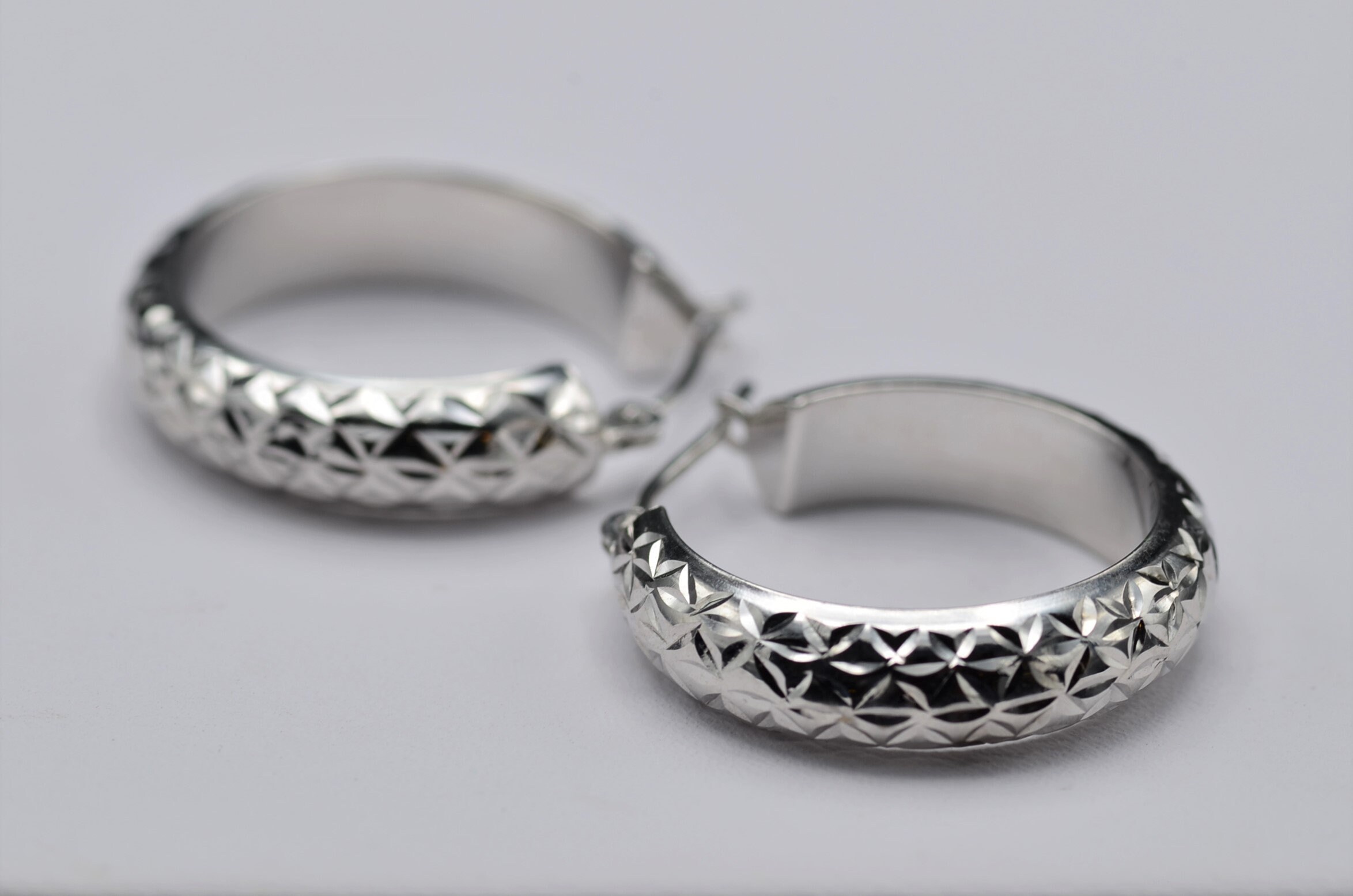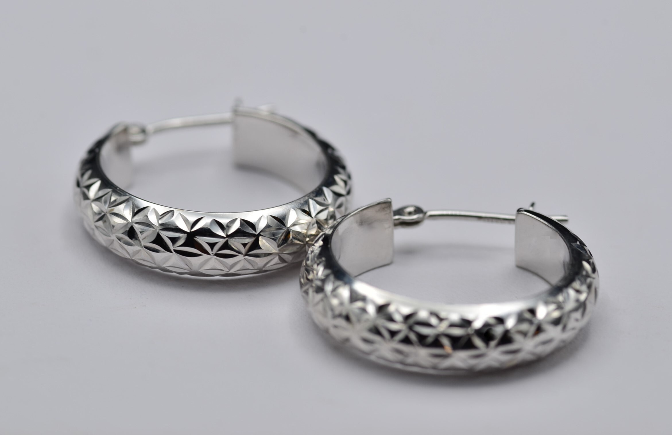 Classic 14 Karat White Gold Diamond Cut Hoops. These classic, lightweight hoops measure just over 0.75 inches in width and feature an intricate diamond cut pattern.