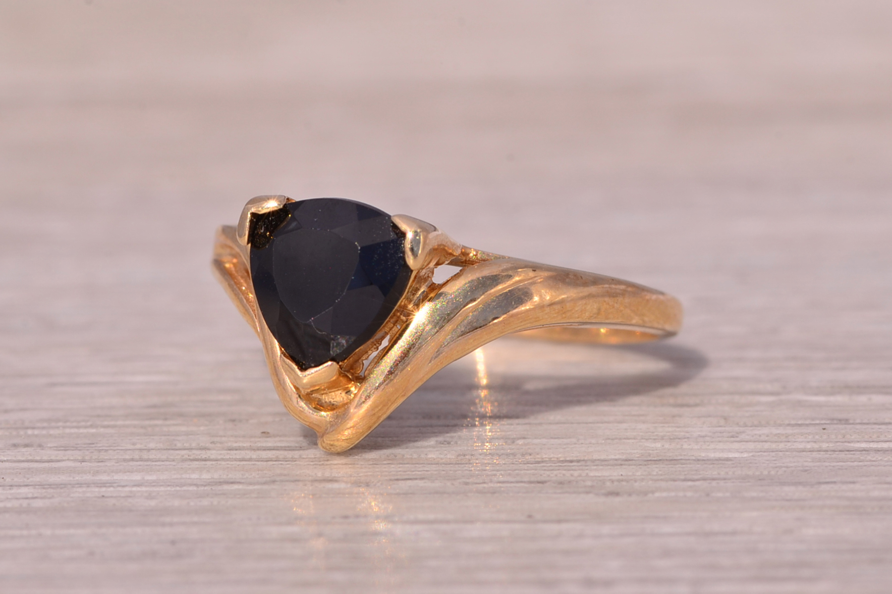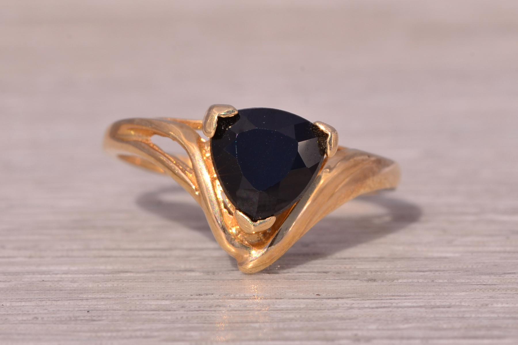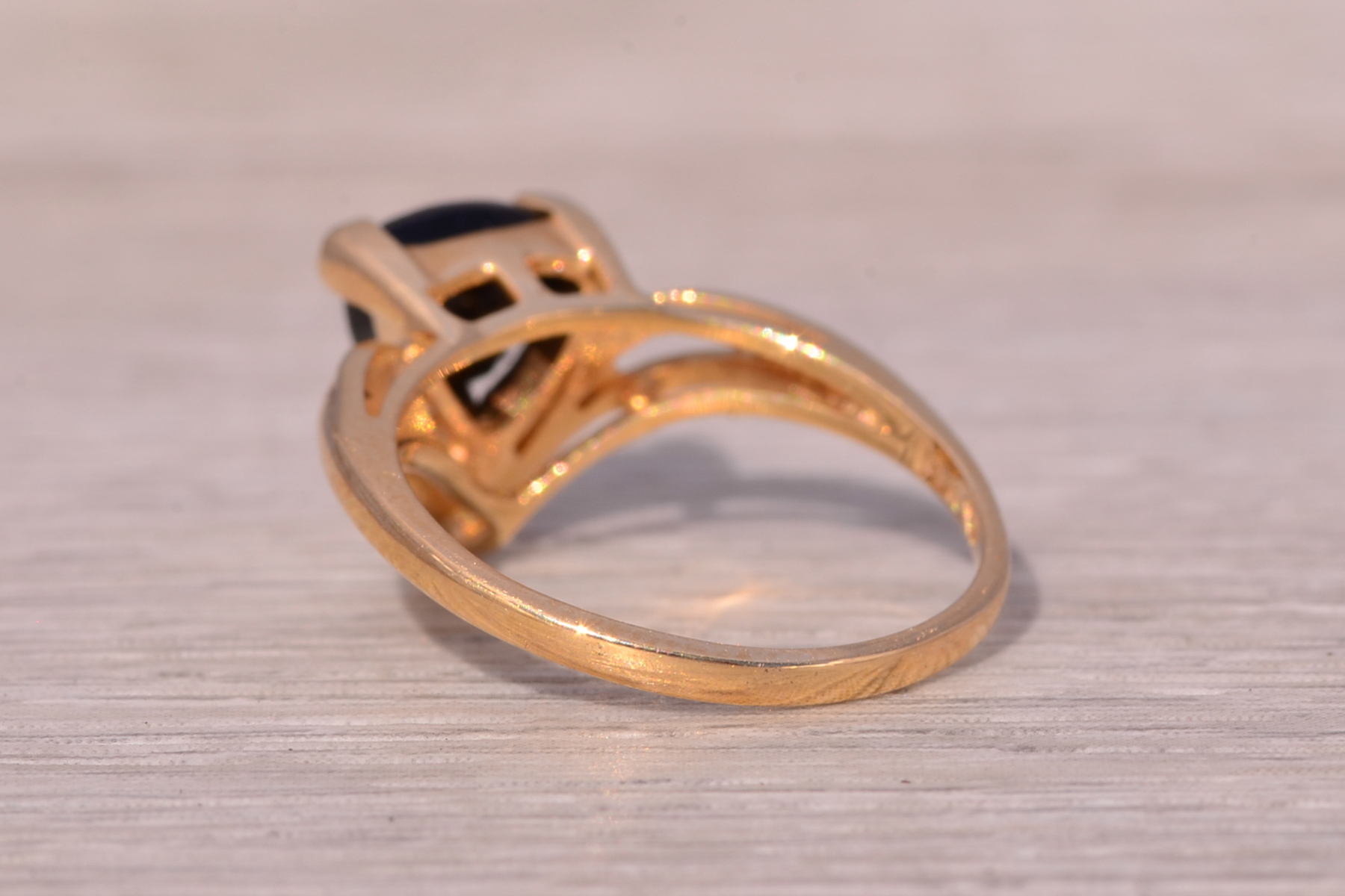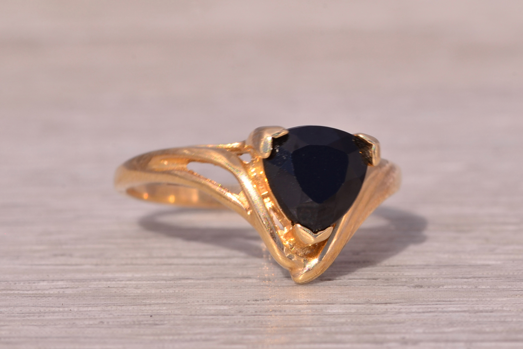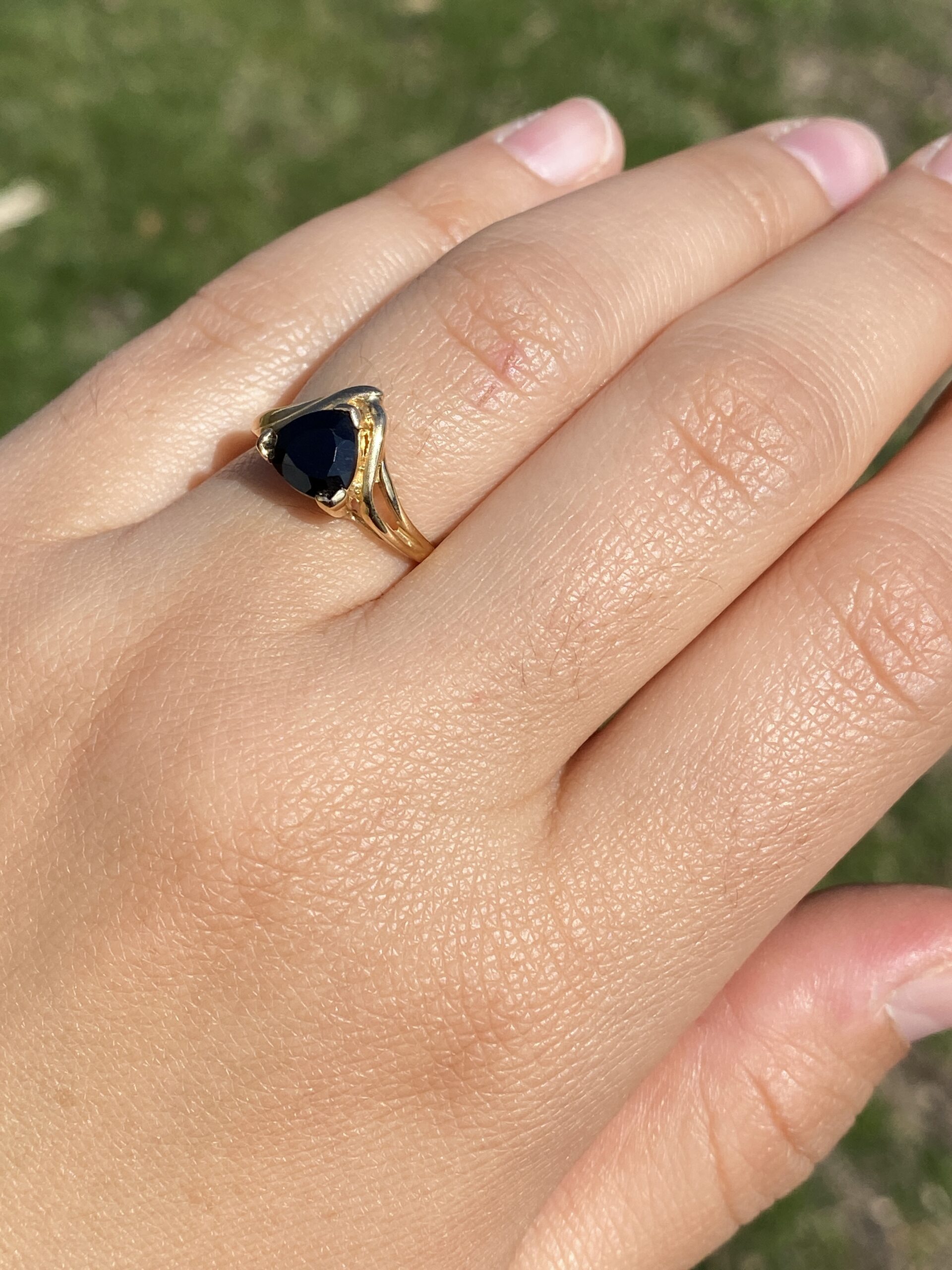 This stunning piece, known as The Midnight Grace, features a captivating triangular cut onyx at its center. The deep black onyx is elegantly set in 14 karat yellow gold, with sleek, flowing lines that accentuate the stone’s modern yet timeless beauty. The simplicity of the design allows the onyx to take center stage, making it an elegant statement piece for any occasion. The ring is crafted in 14 karat yellow gold and is currently a finger size 6 yet can be adjusted to any finger size for an additional charge upon request, ensuring a perfect fit.