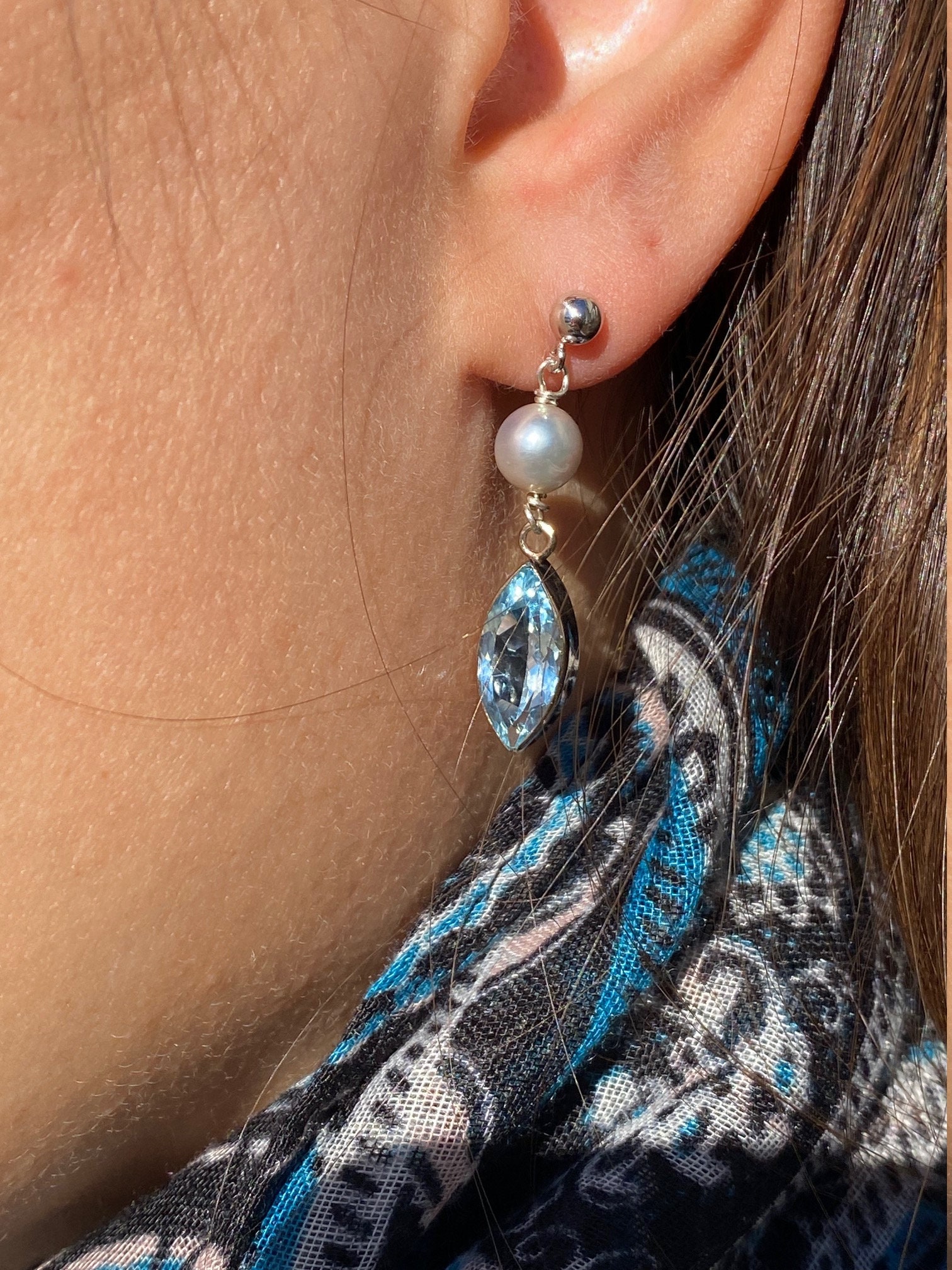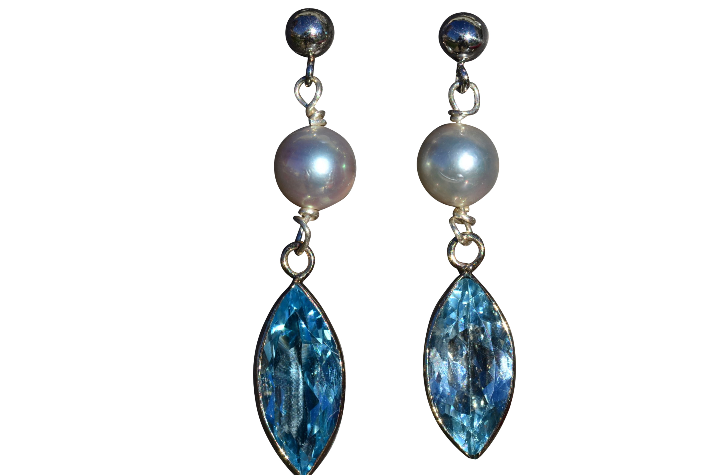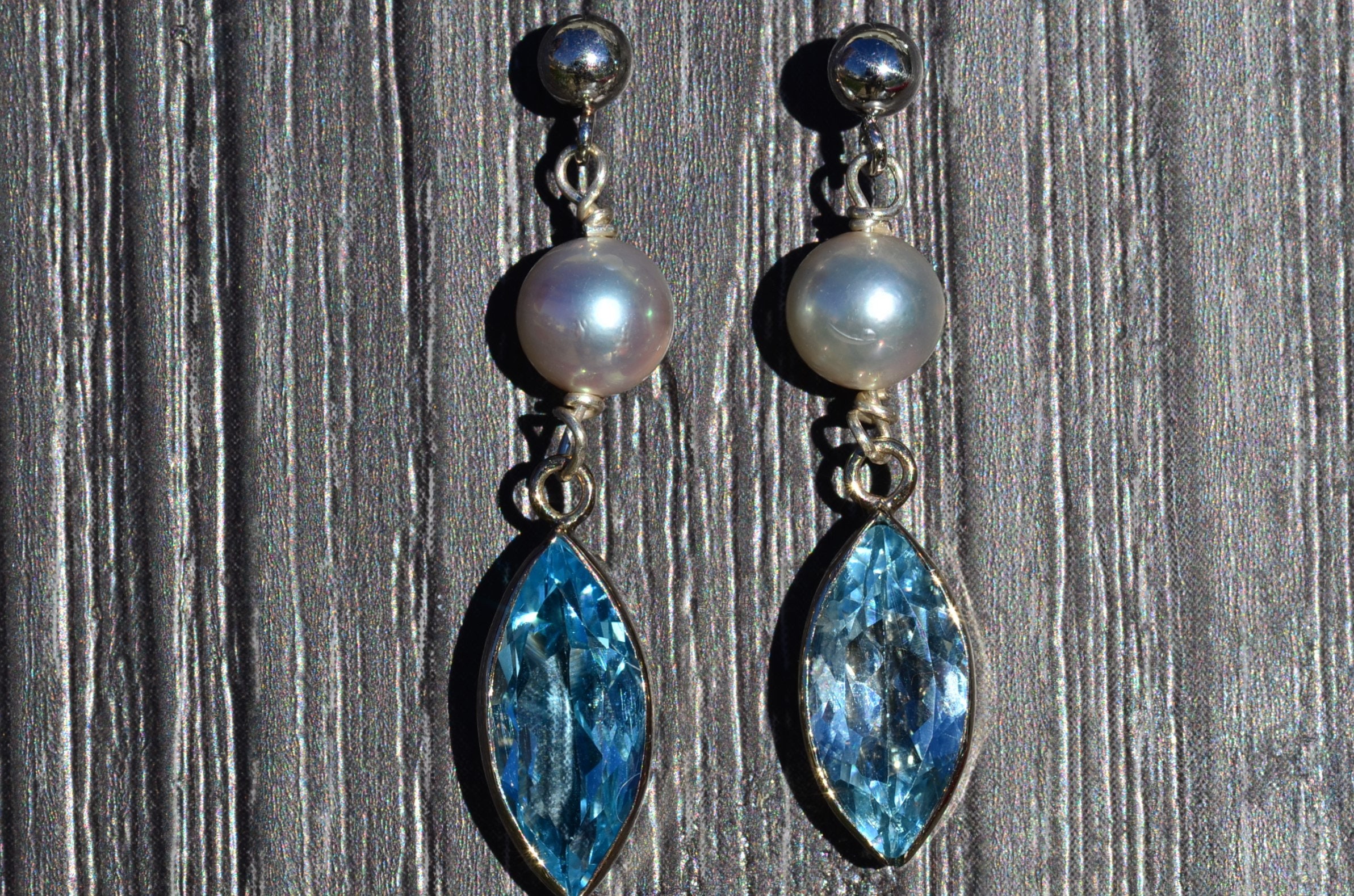 Ladies 14K White Gold Pearl and Topaz Dangler Earrings. Crafted in 14 karat white gold, these dangler earrings feature bezel set marquise cut blue topaz. A 6.5mm pearl compliments the blue topaz on either earring. The earrings measure just under 1.5 inches in length and feature push style backings.