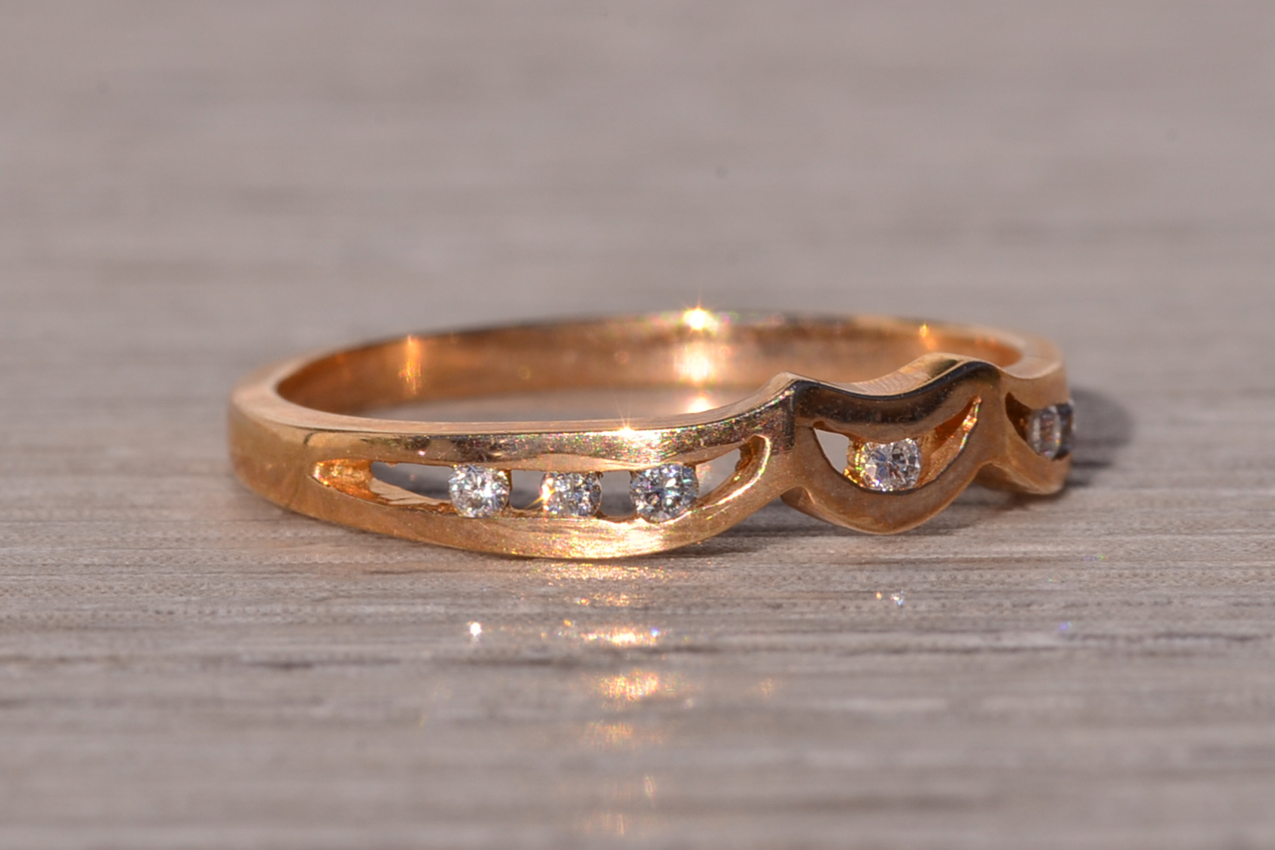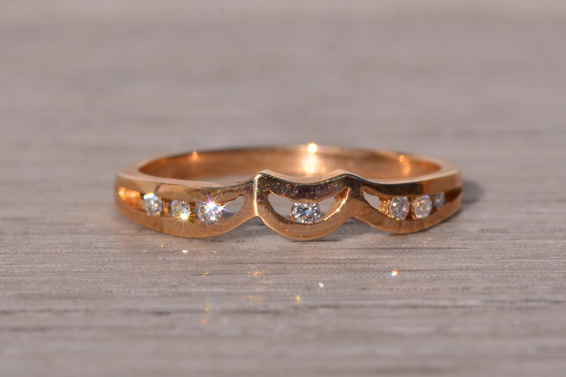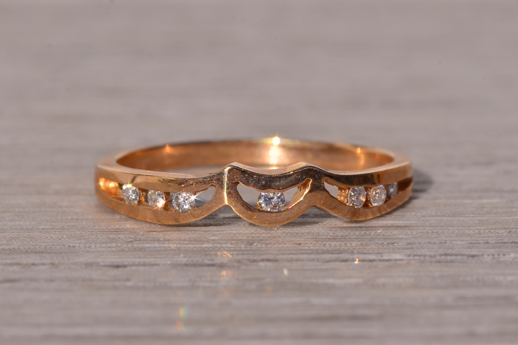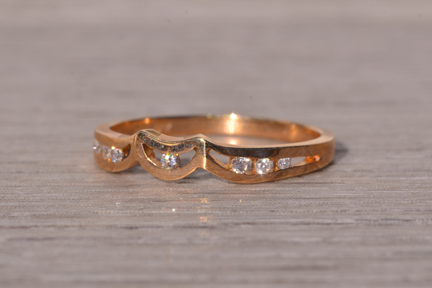 The Moda: Mid Century Modern Yellow Gold and Natural Diamond Ring. This elegant ring showcases a central half-moon channel adorned with a round brilliant-cut natural diamond at its heart. Flanking the center, three round brilliant-cut natural diamonds are channel-set on each side, adding symmetry and sparkle to the design. Crafted in lustrous 14 karat yellow gold, this exquisite piece is currently a finger size 6, with the option for adjustments to any finger size available upon request for an additional charge.