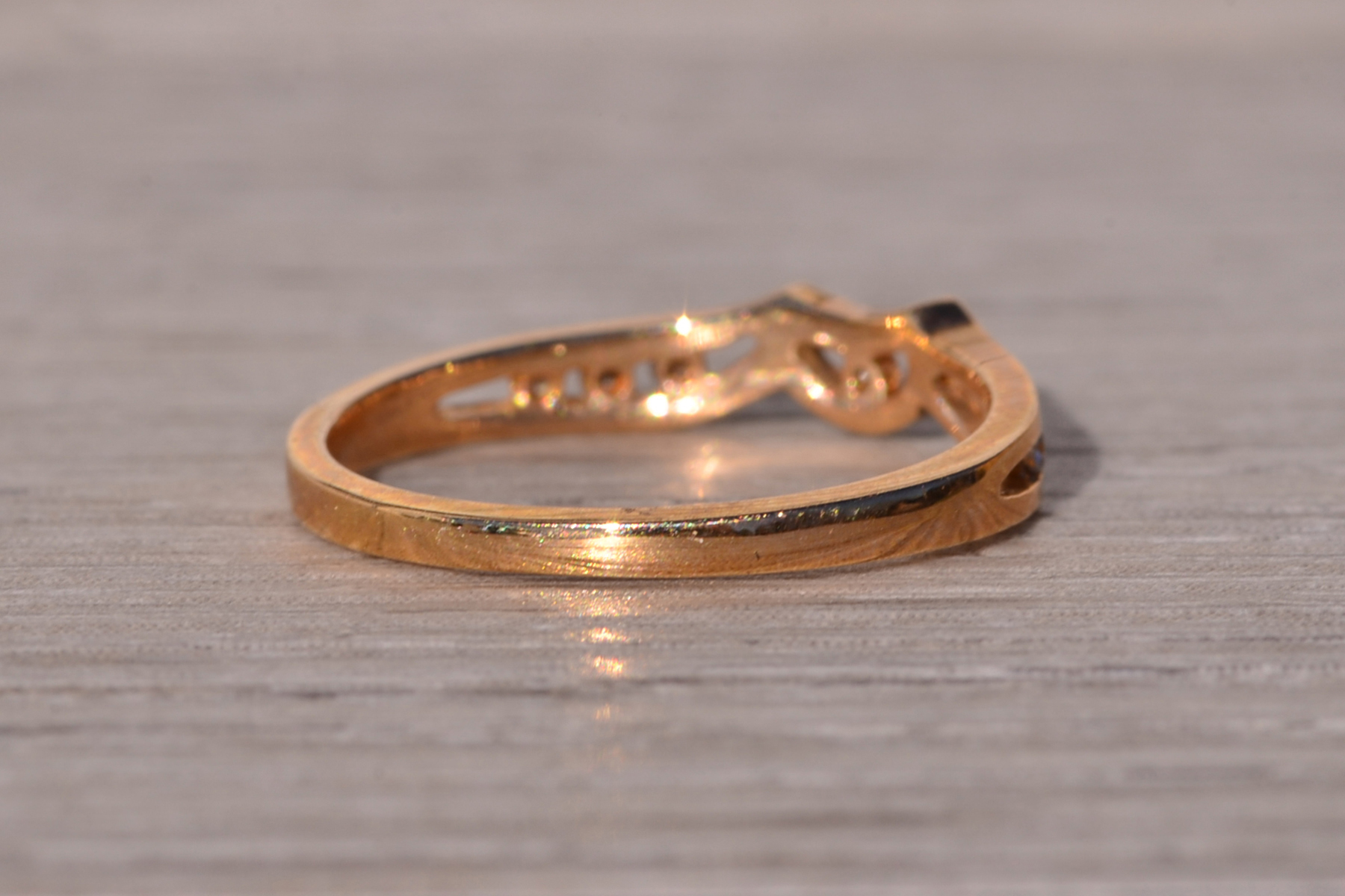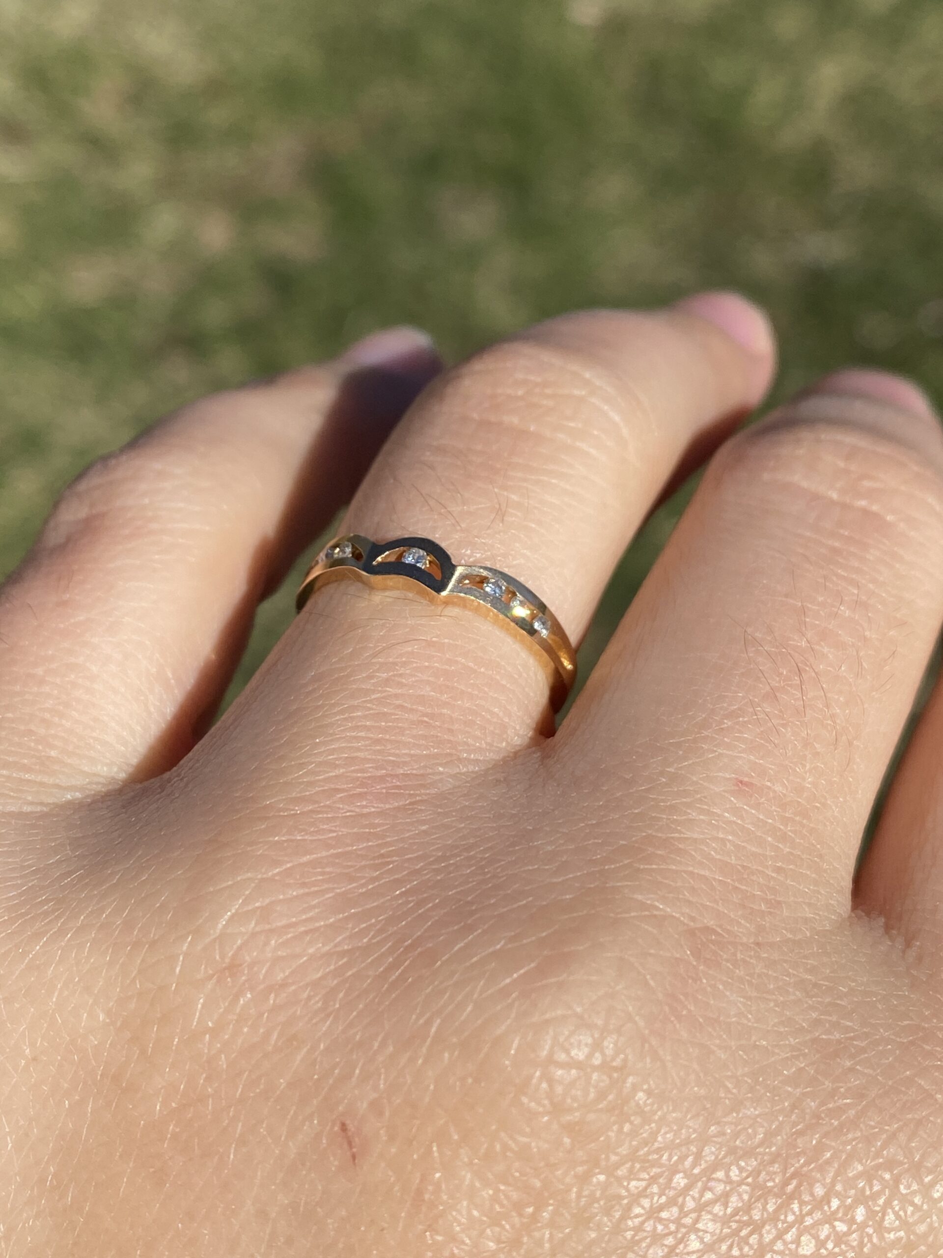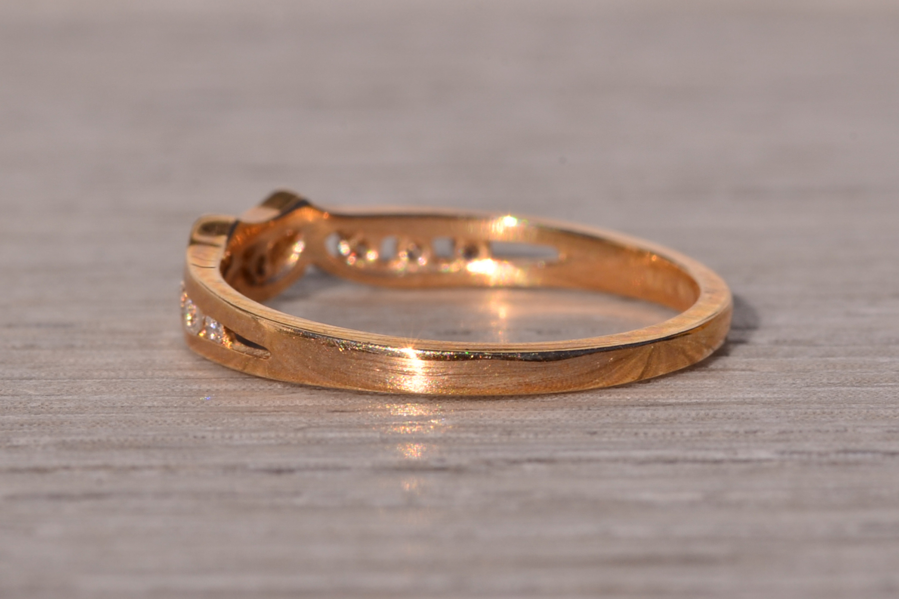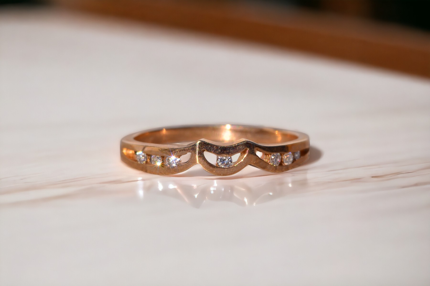 The Moda: Mid Century Modern Yellow Gold and Natural Diamond Ring. This elegant ring showcases a central half-moon channel adorned with a round brilliant-cut natural diamond at its heart. Flanking the center, three round brilliant-cut natural diamonds are channel-set on each side, adding symmetry and sparkle to the design. Crafted in lustrous 14 karat yellow gold, this exquisite piece is currently a finger size 6, with the option for adjustments to any finger size available upon request for an additional charge.