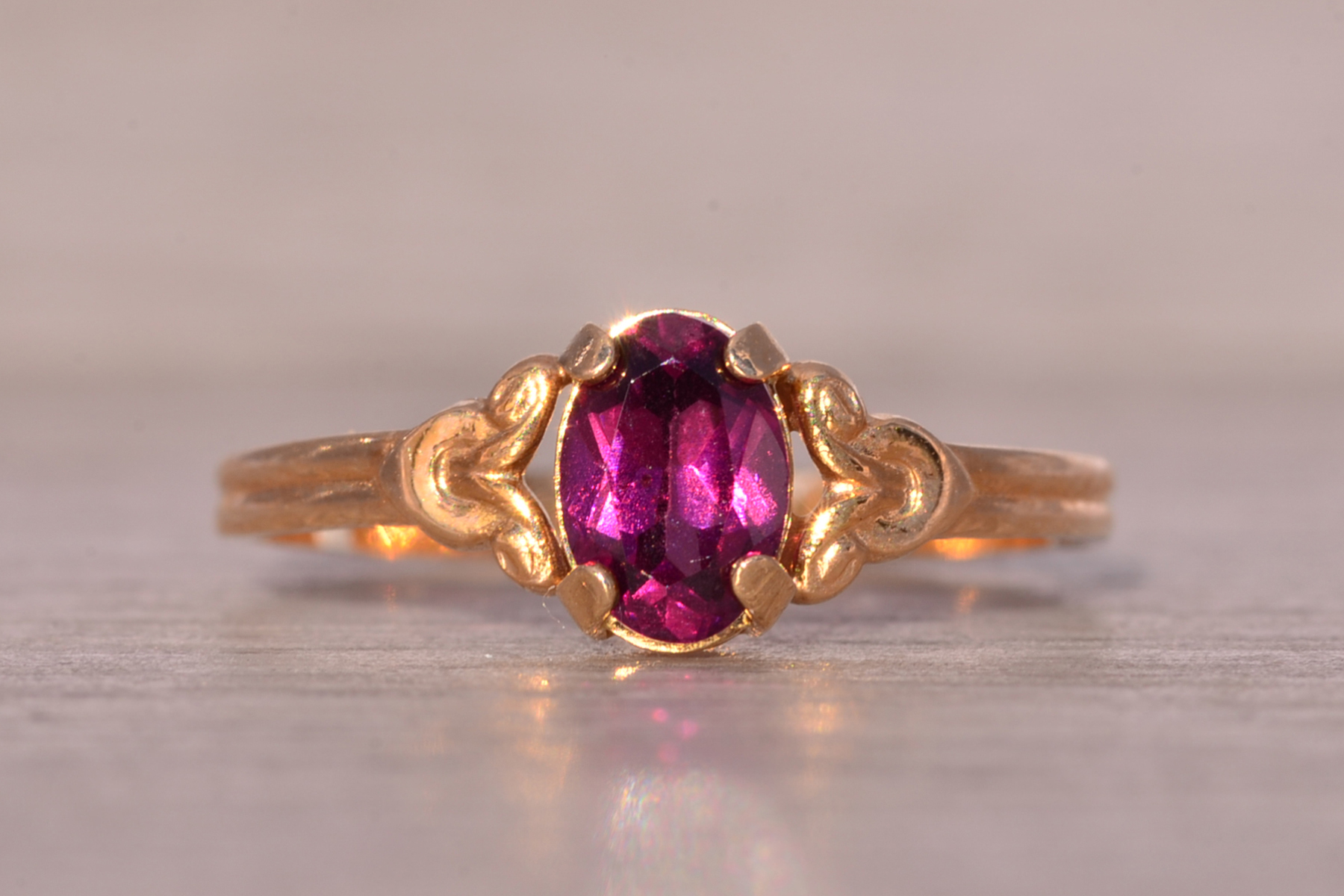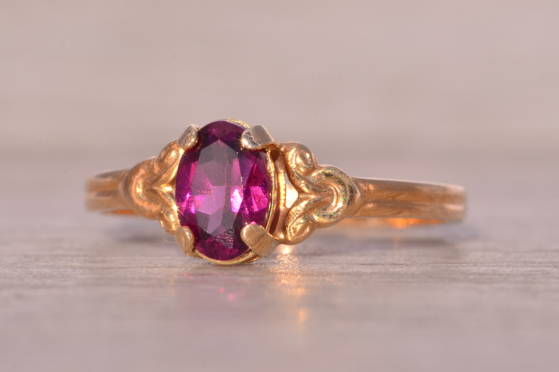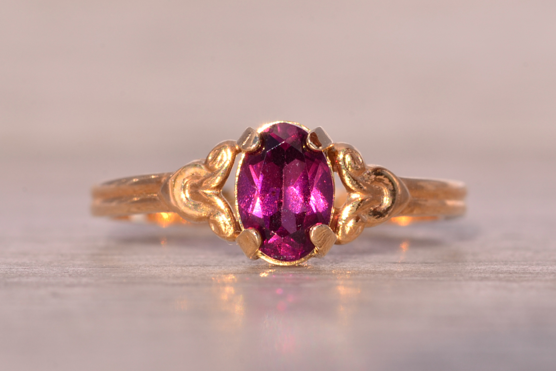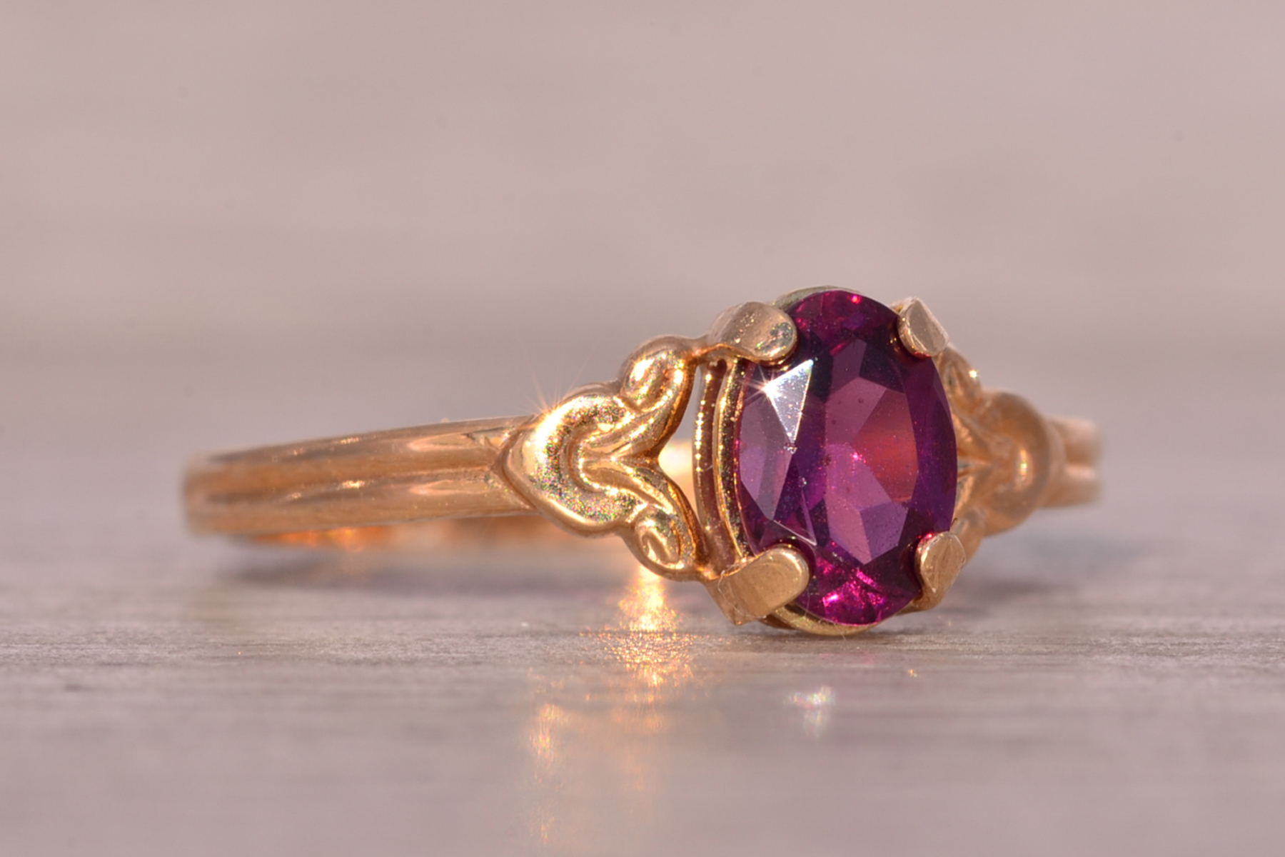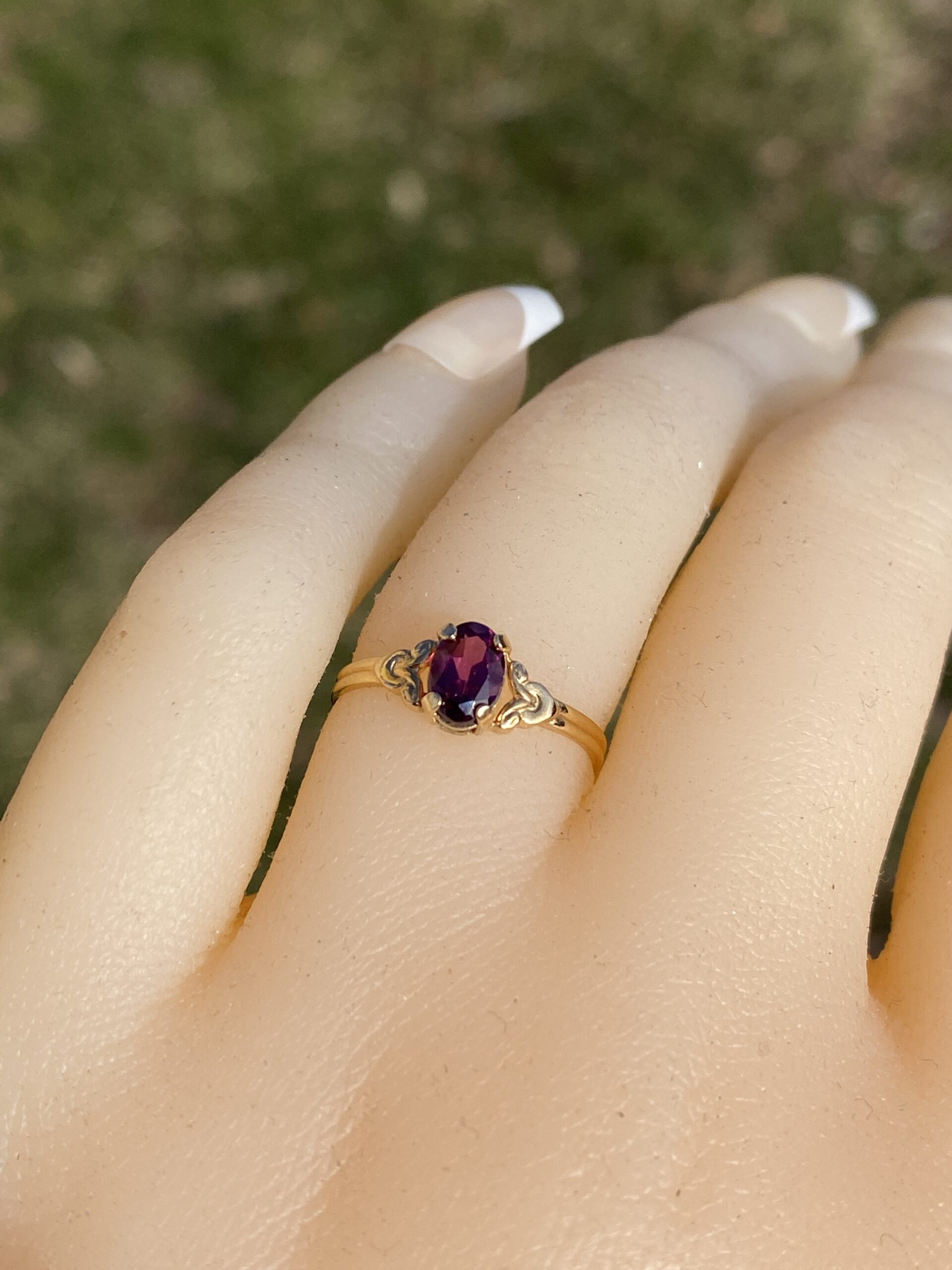 The Moncton: Amethyst Ring in Yellow Gold with Patterned Edge. This captivating ring features a stunning oval brilliant cut natural amethyst at its center, radiating beauty and allure. On either side of the center stone, scrolled tops add a touch of elegance, while the ridged shank enhances the ring’s unique charm. Crafted with care in lustrous 14 karat yellow gold, this ring exudes warmth and sophistication. Currently sized at 4.25, it offers the flexibility to be adjusted to any finger size for an additional fee upon request.