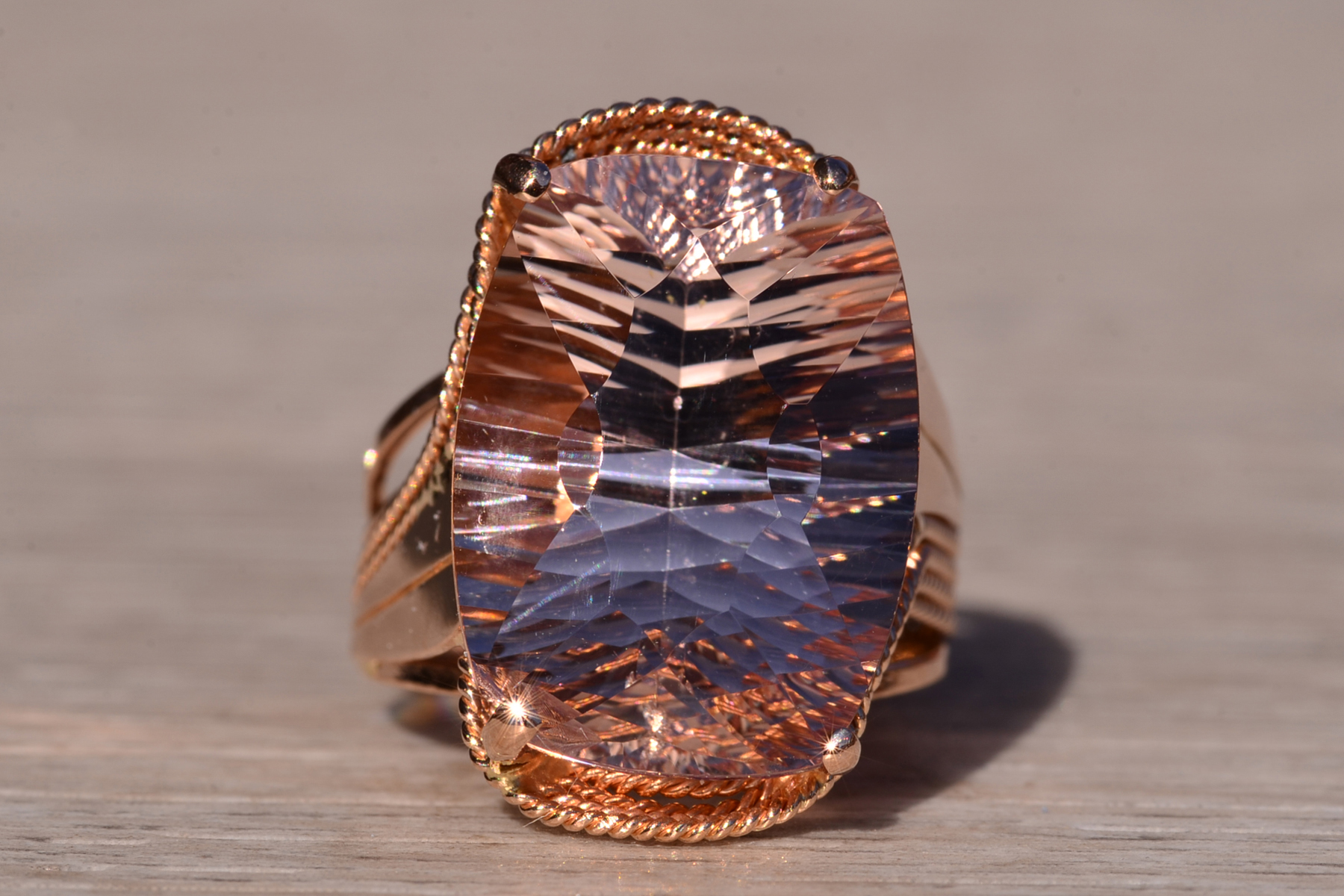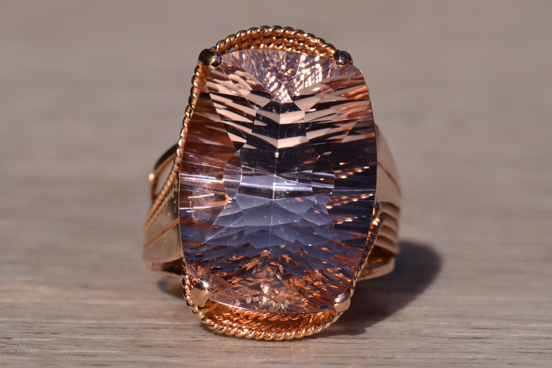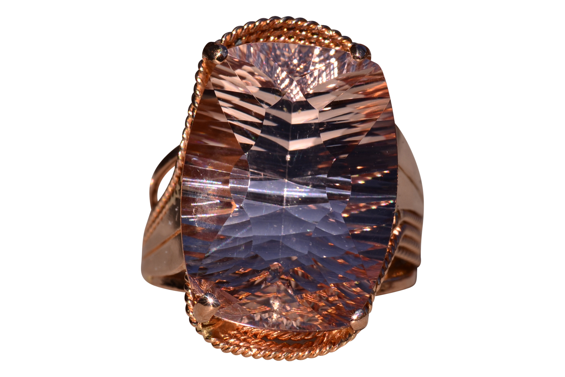 The Morg: Ladies 14K Rose Gold Elongated Cushion Morganite Cocktail Ring. This impressive cocktail ring is set with an 18.20 carat natural novelty cushion cut morganite. A multi-strand roping design wraps around the ring continuing down the shank. Currently the ring is a finger size 7.75 and is able to be resized for an additional charge upon request.