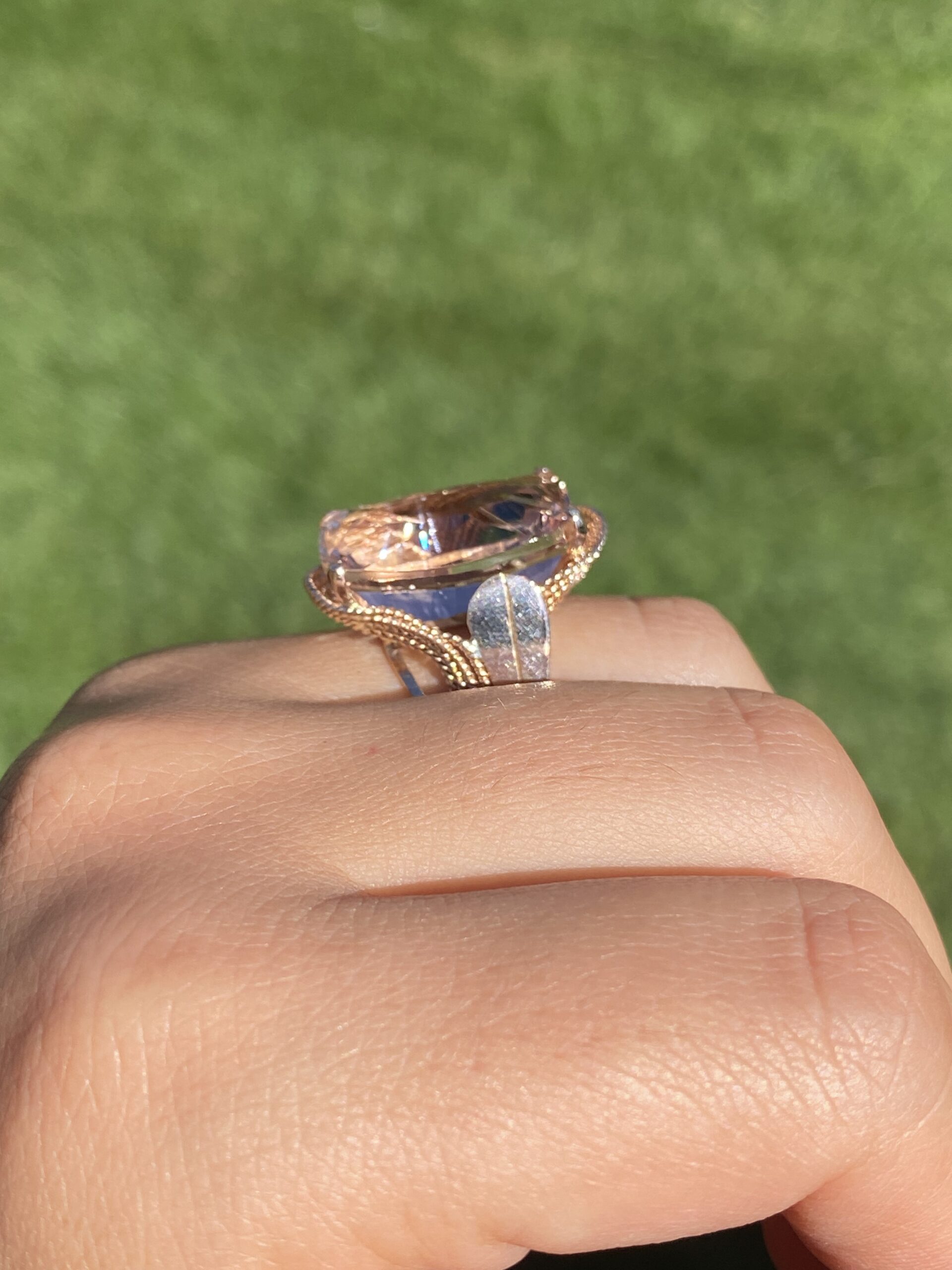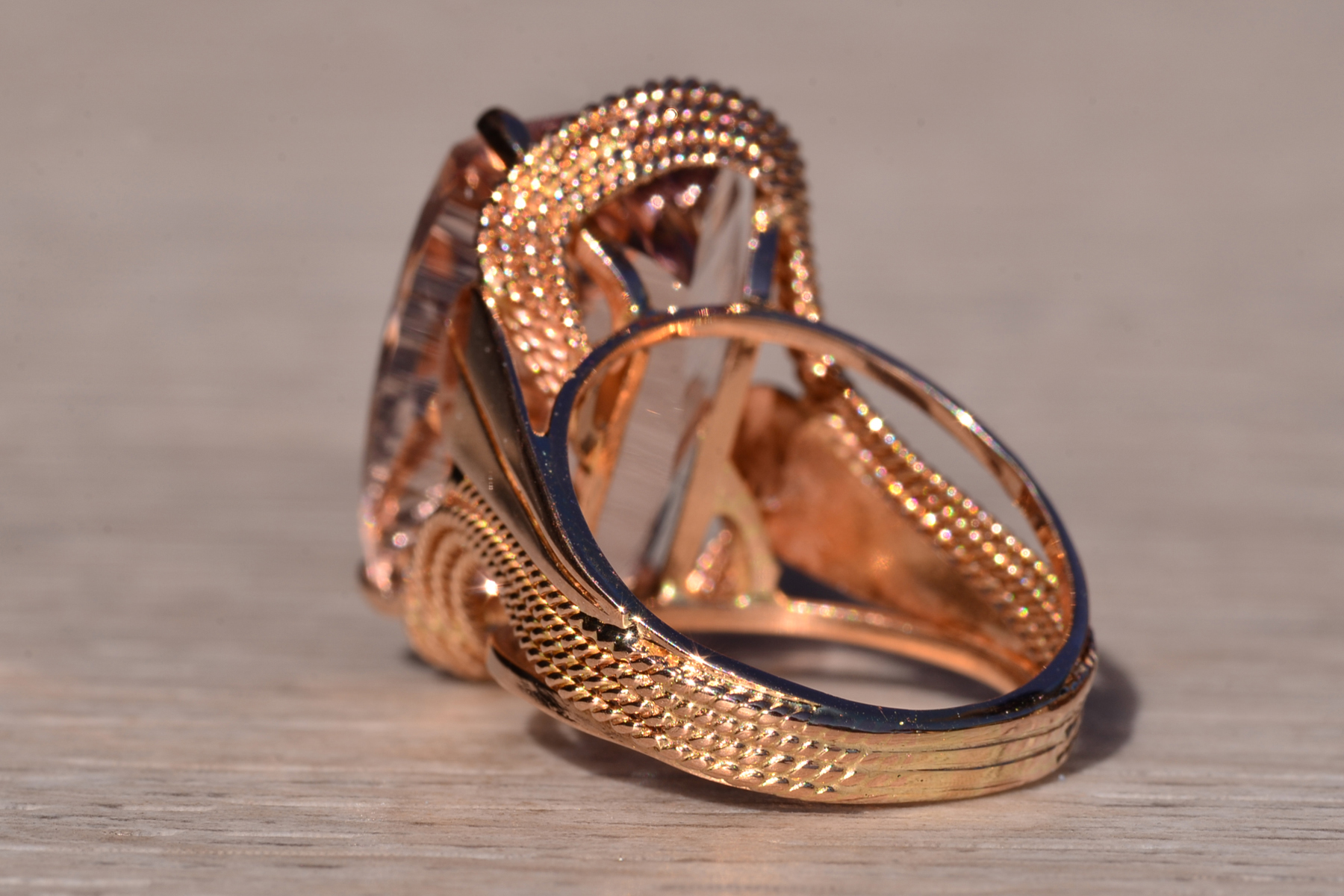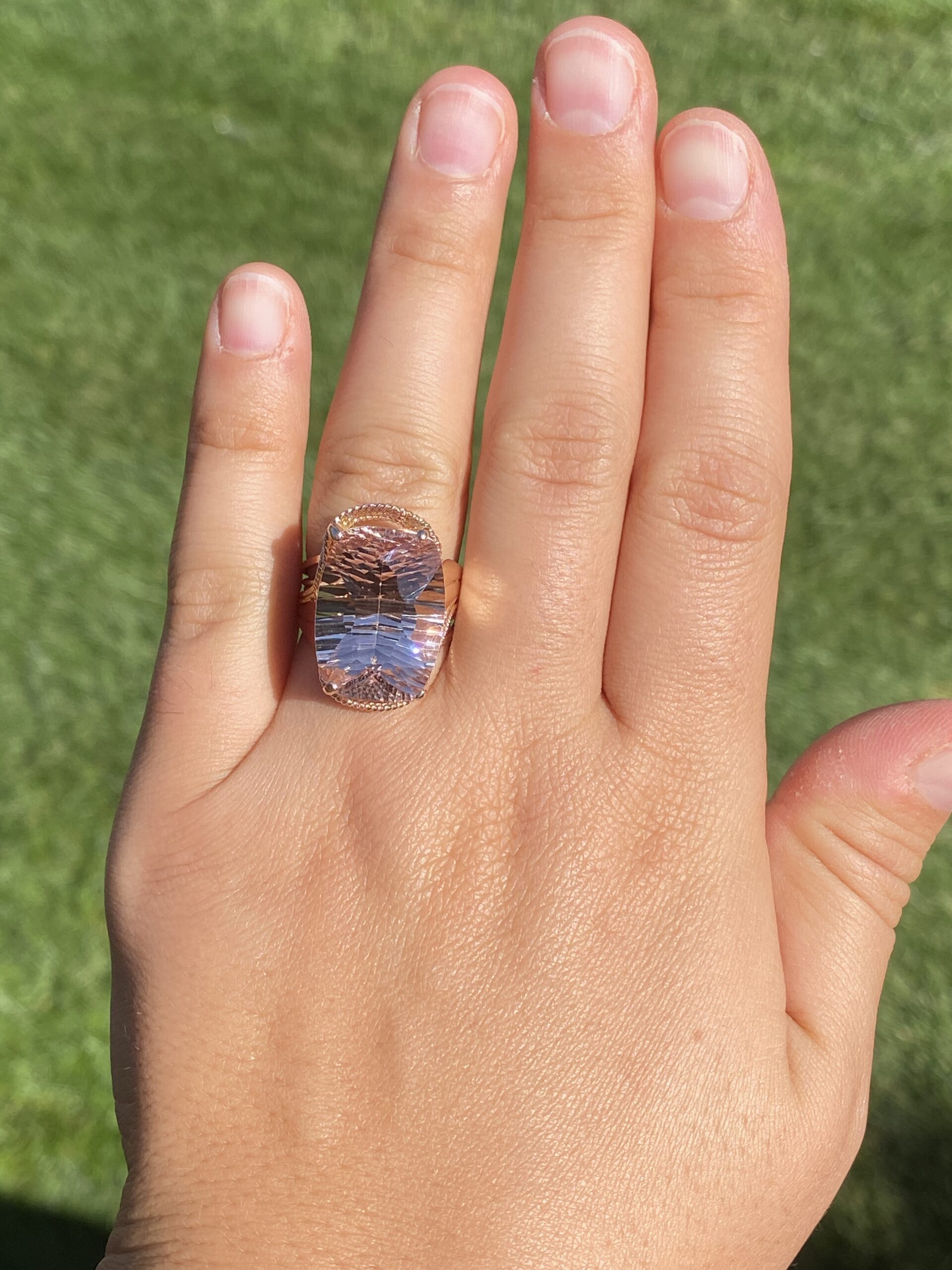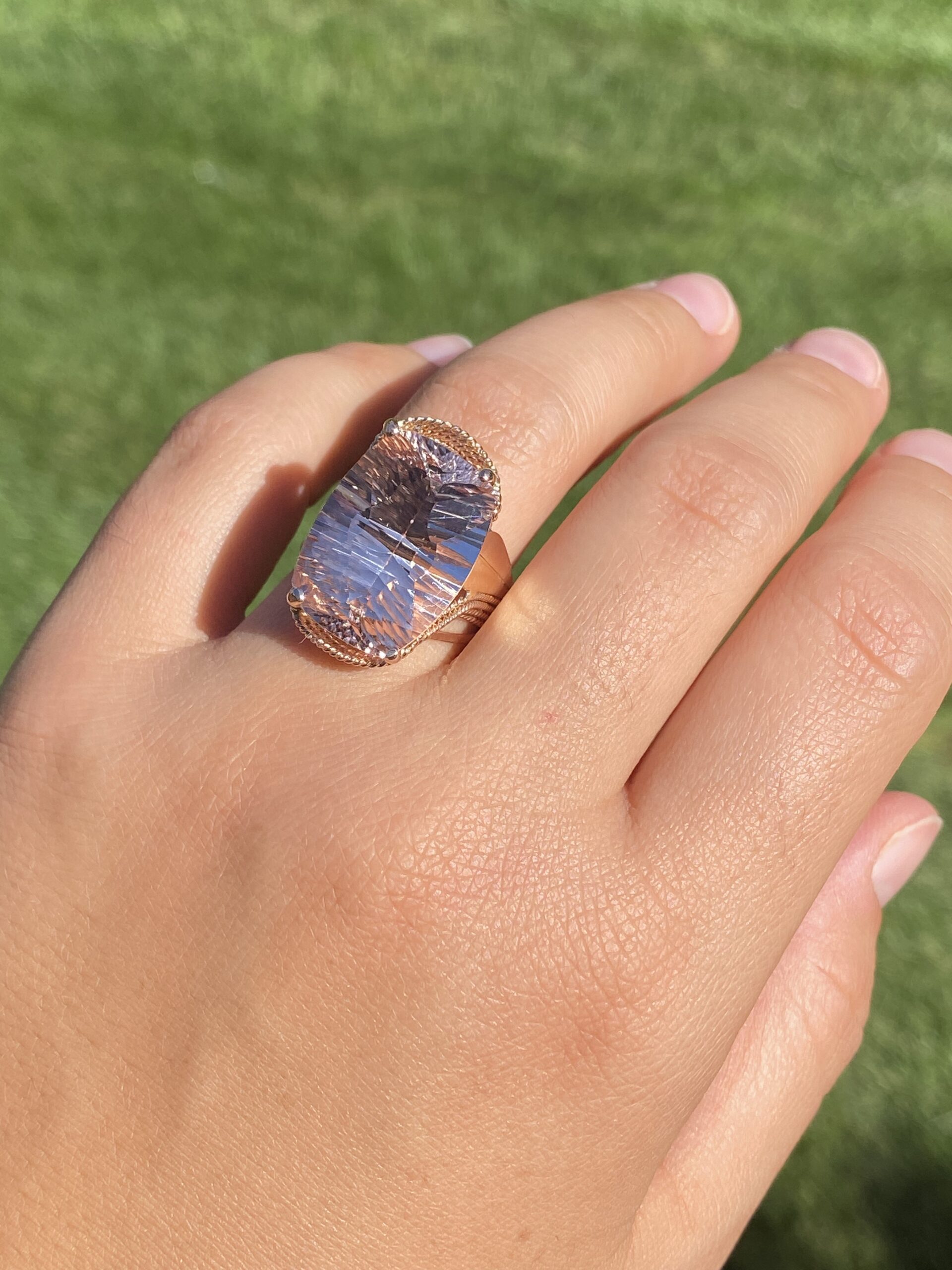 The Morg: Ladies 14K Rose Gold Elongated Cushion Morganite Cocktail Ring. This impressive cocktail ring is set with an 18.20 carat natural novelty cushion cut morganite. A multi-strand roping design wraps around the ring continuing down the shank. Currently the ring is a finger size 7.75 and is able to be resized for an additional charge upon request.