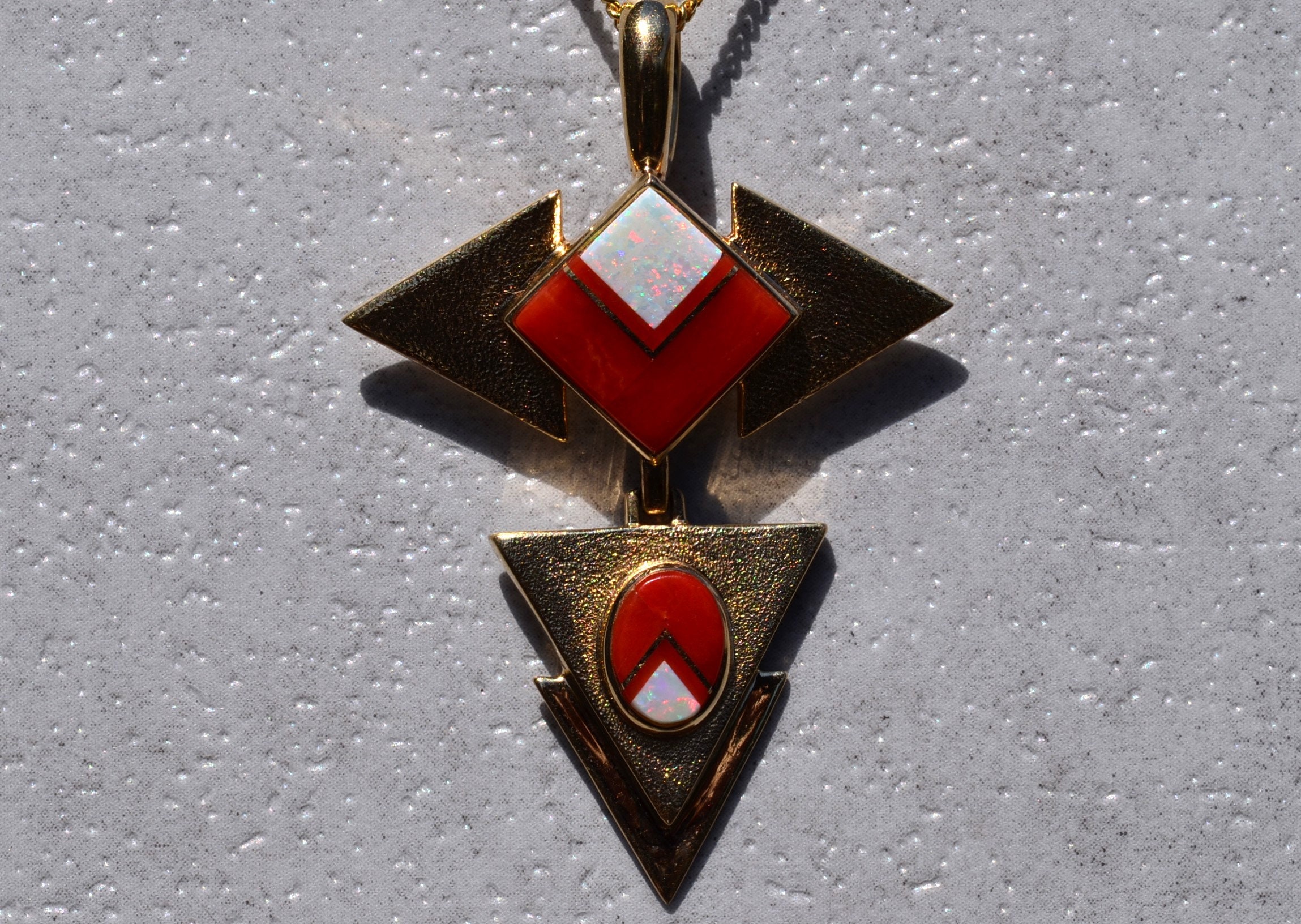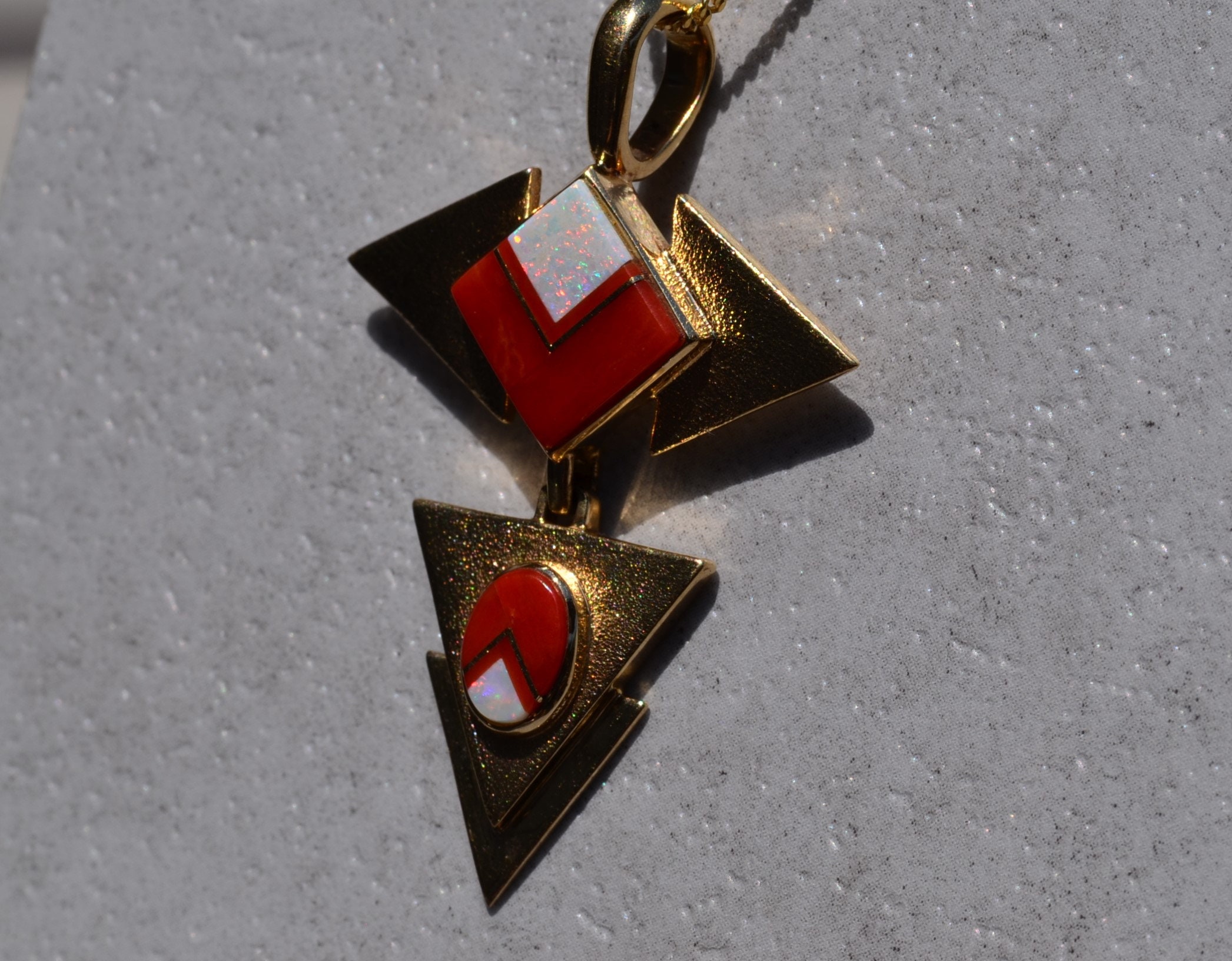 The Mudd: BG Mudd Signed Opal and Coral Inlay Pendant. The pendant features a Native American style motif with inlaid opal and coral. Below the top section is a triangular section that dangles below with opal and coral. The pendant is signed with BG Mudd hallmark and crafted in 14 karat yellow gold, measuring 2 inches in length.