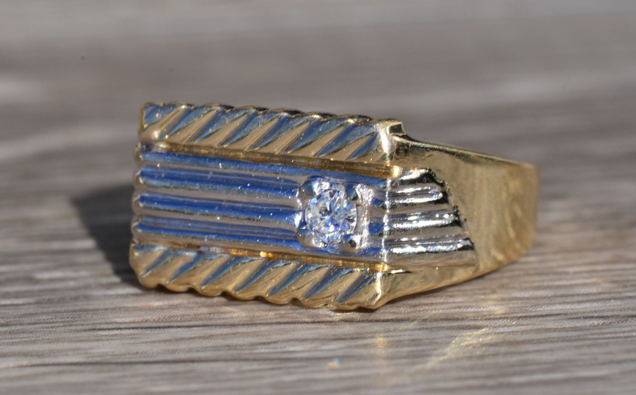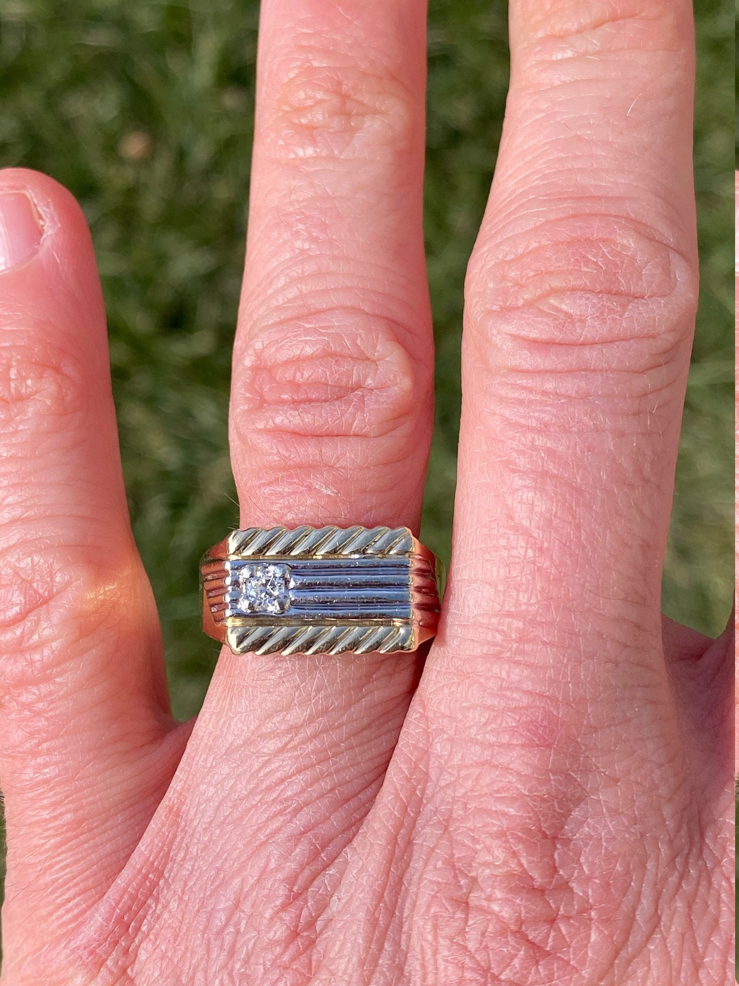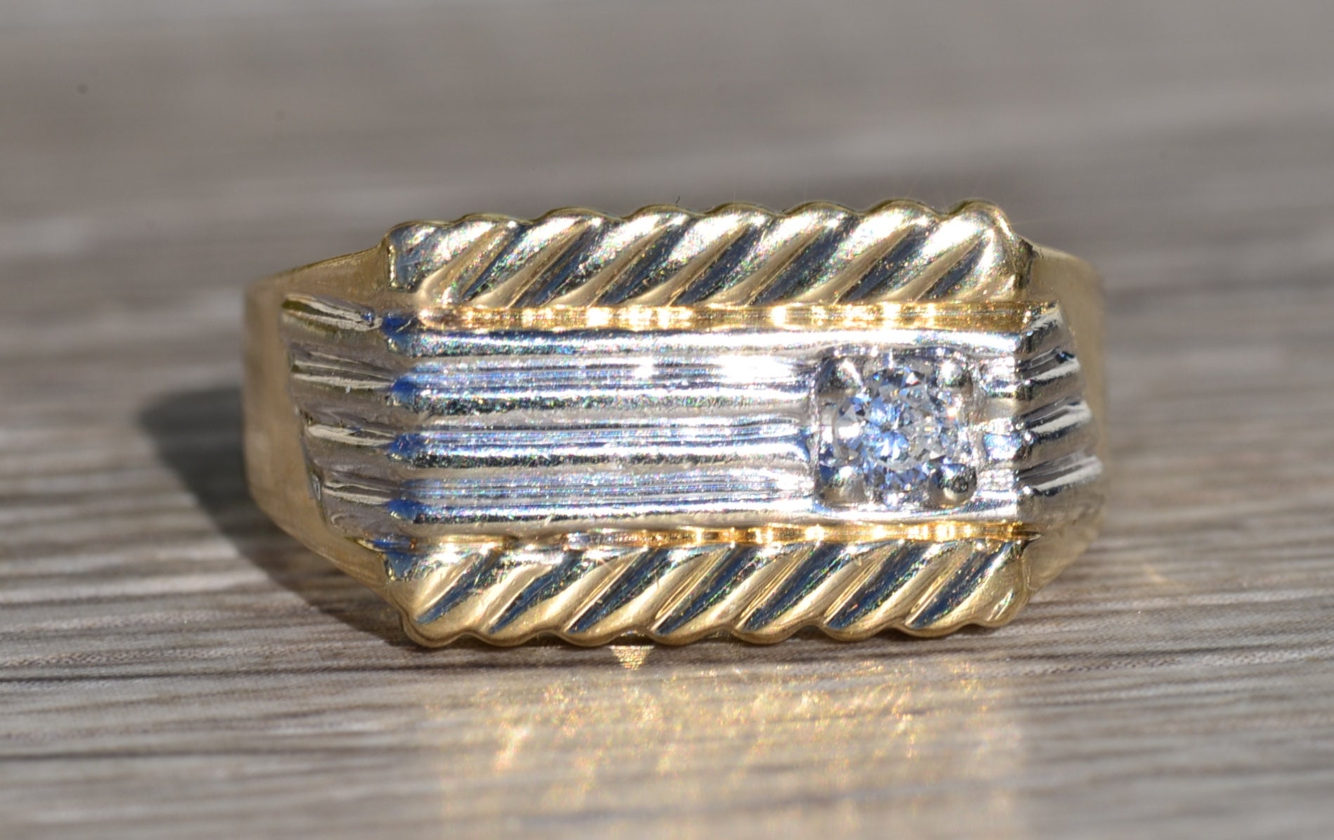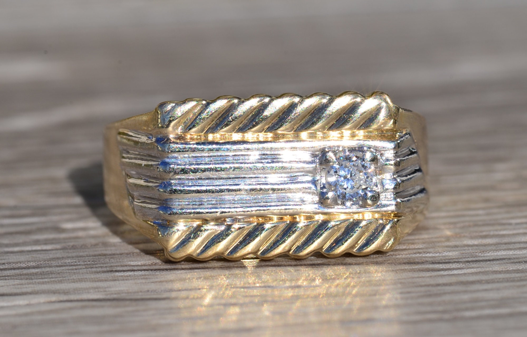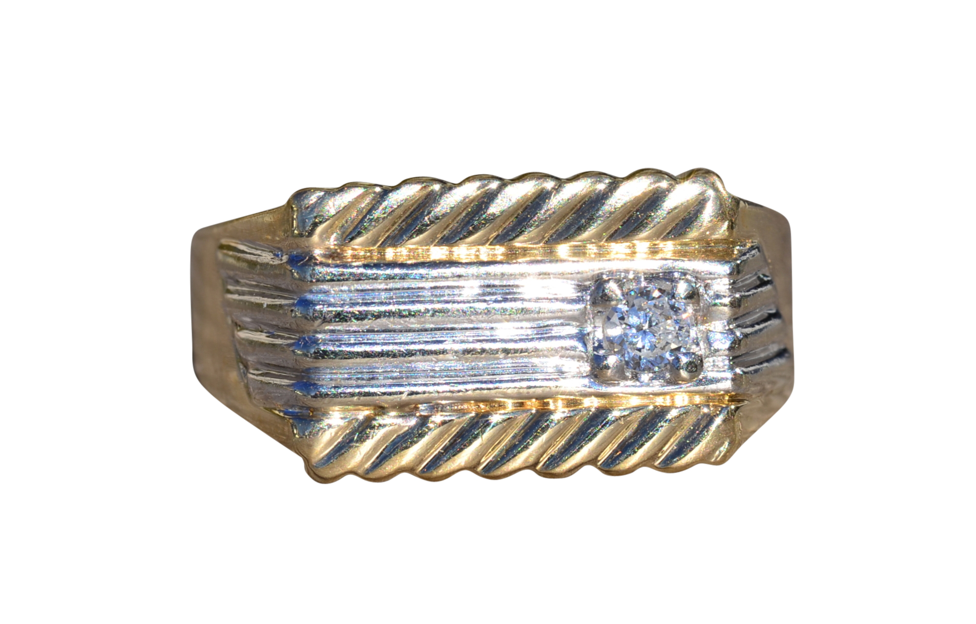 The New Brockton: Gentleman’s 14K Two Tone Diamond Cocktail Ring. Expertly crafted in 14 karat gold, this two tone ring features a 0.16 carat round diamond set in a white gold mid section. Simplicity of stripes completes the design of this ring at a finger size 9.75. The ring can be resized for an additional charge.