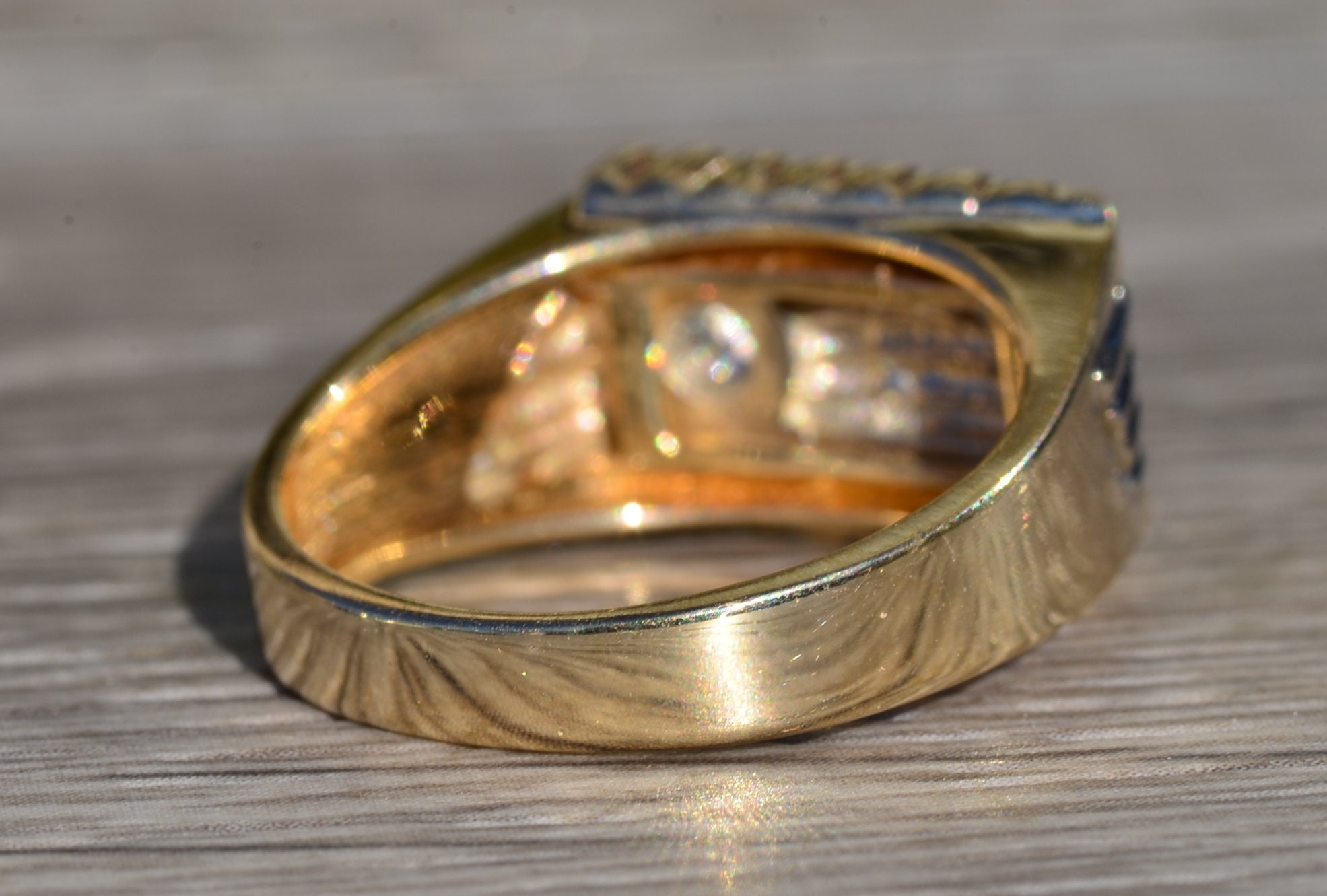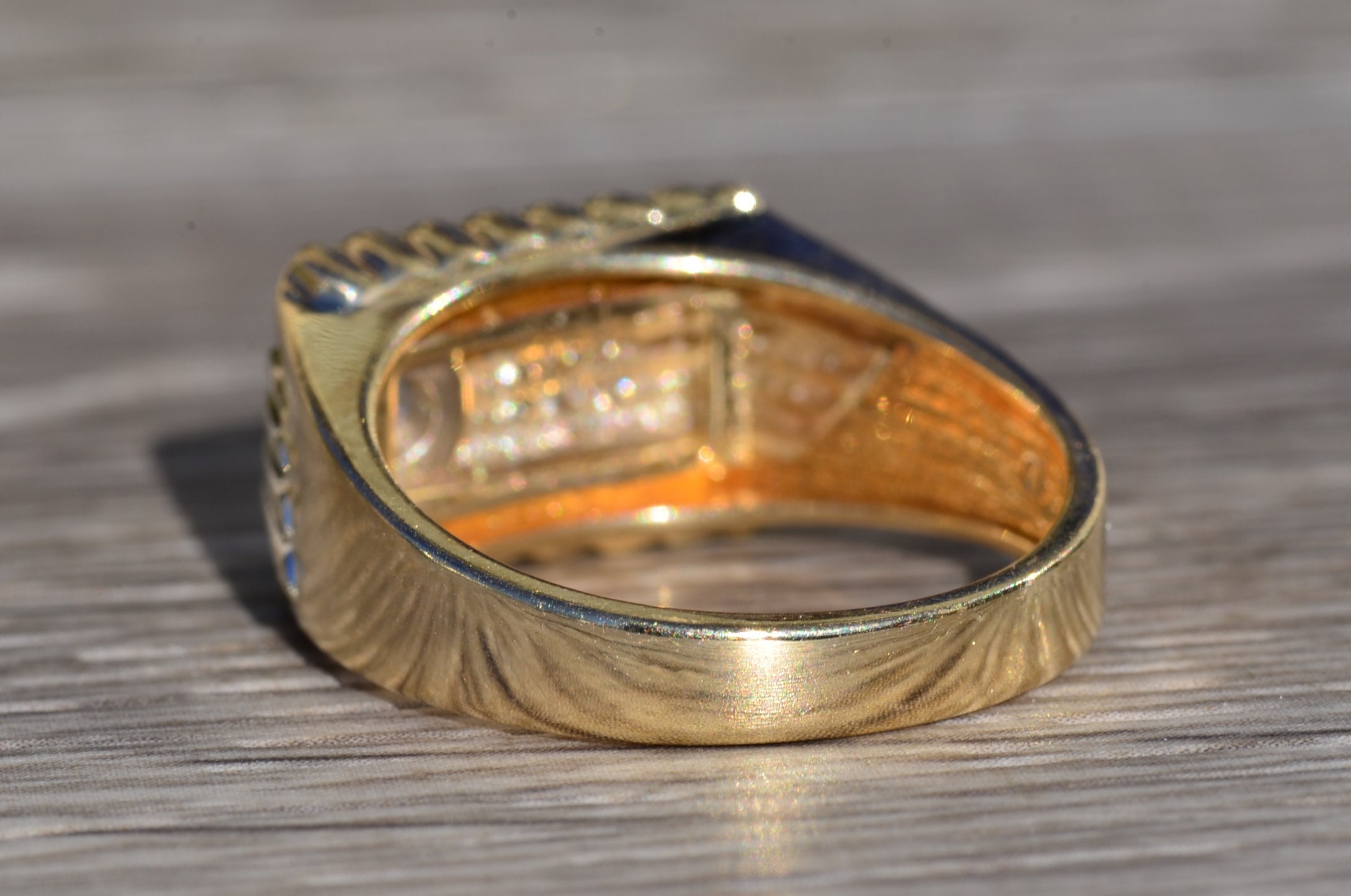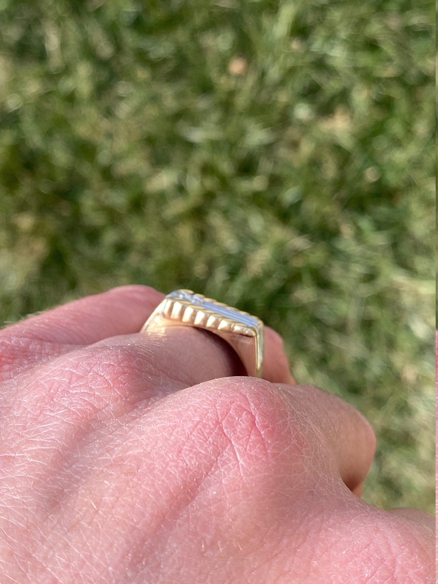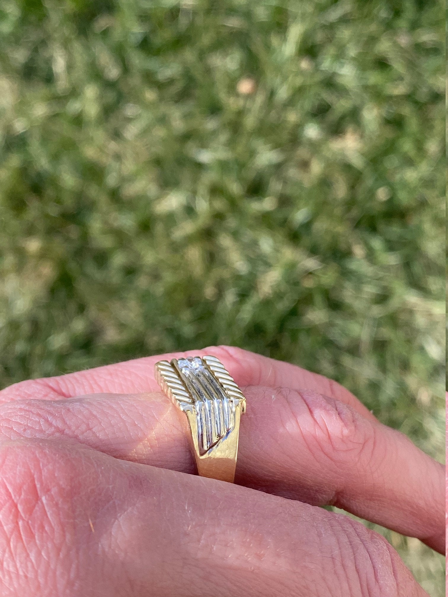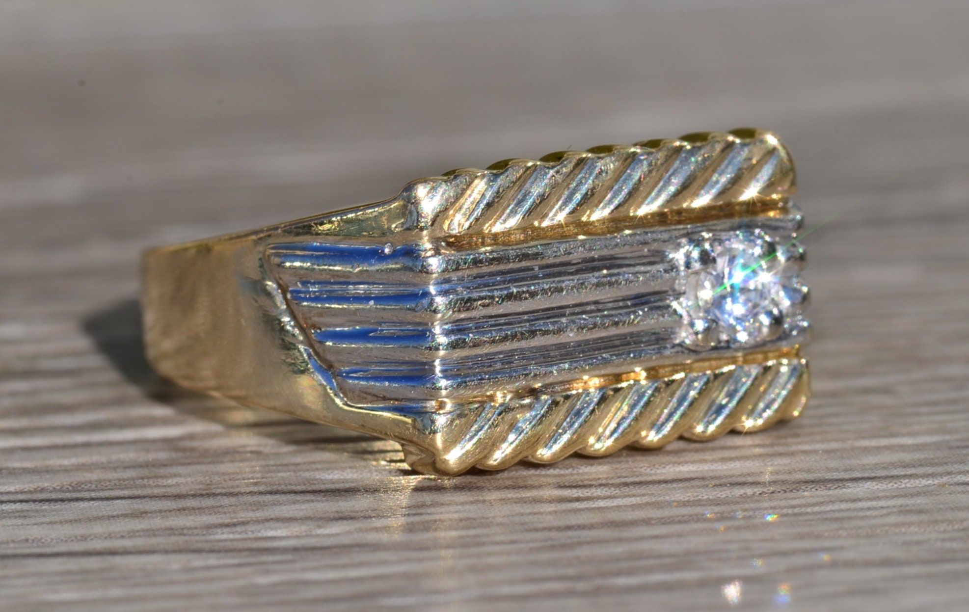 The New Brockton: Gentleman’s 14K Two Tone Diamond Cocktail Ring. Expertly crafted in 14 karat gold, this two tone ring features a 0.16 carat round diamond set in a white gold mid section. Simplicity of stripes completes the design of this ring at a finger size 9.75. The ring can be resized for an additional charge.