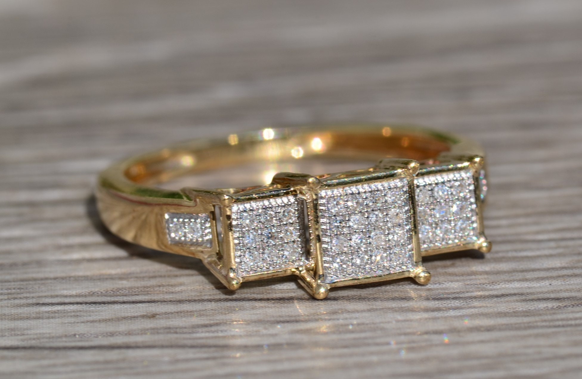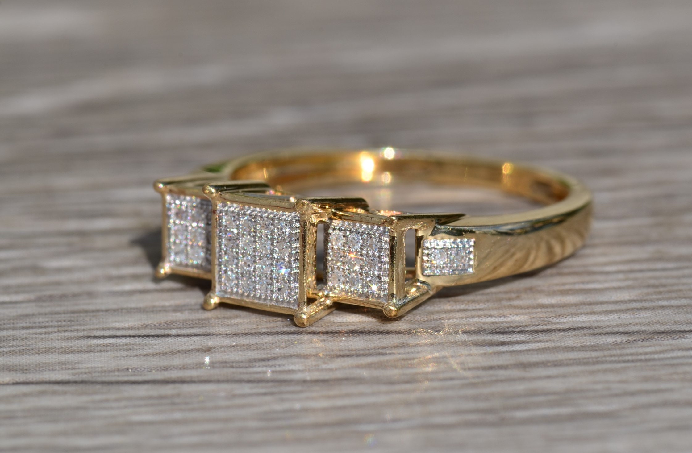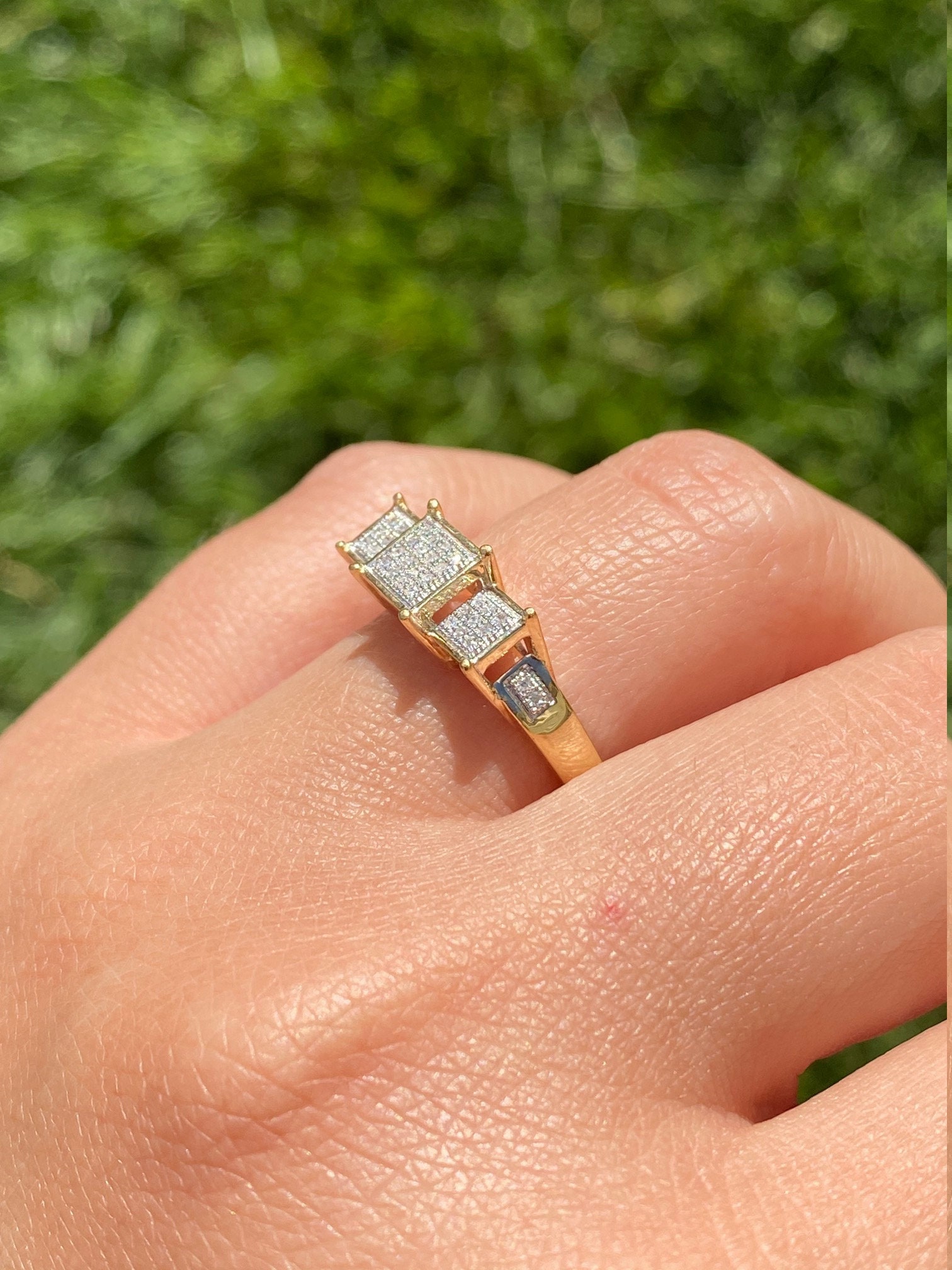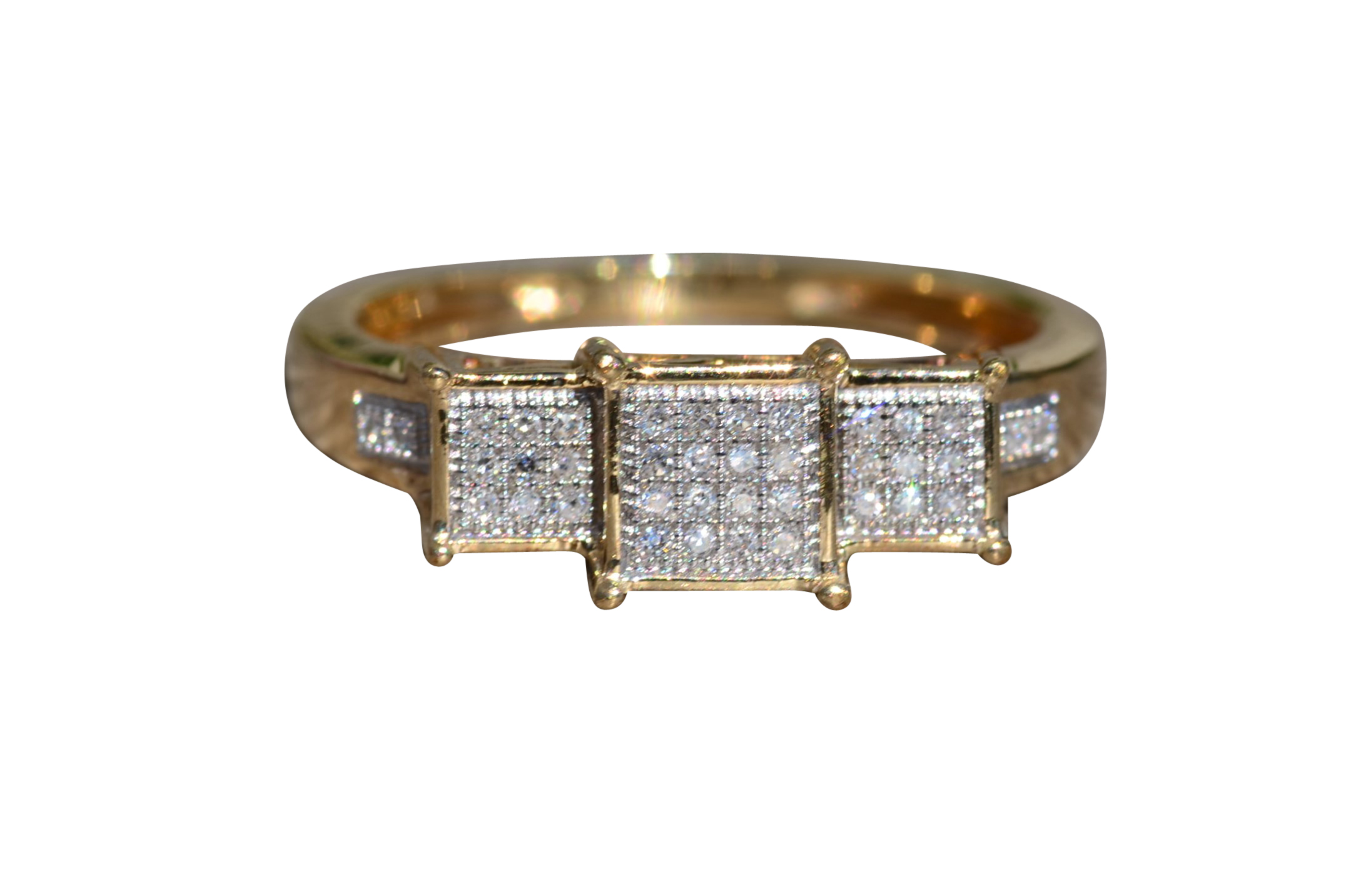Ladies Diamond Engagement Style Ring in Yellow Gold. This ladies ring features 0.15 total carats of diamonds throughout in a past, present and future style setting. Crafted in yellow gold, this contemporary ring is a finger size 8.25 yet is able to be resized for an additional charge.