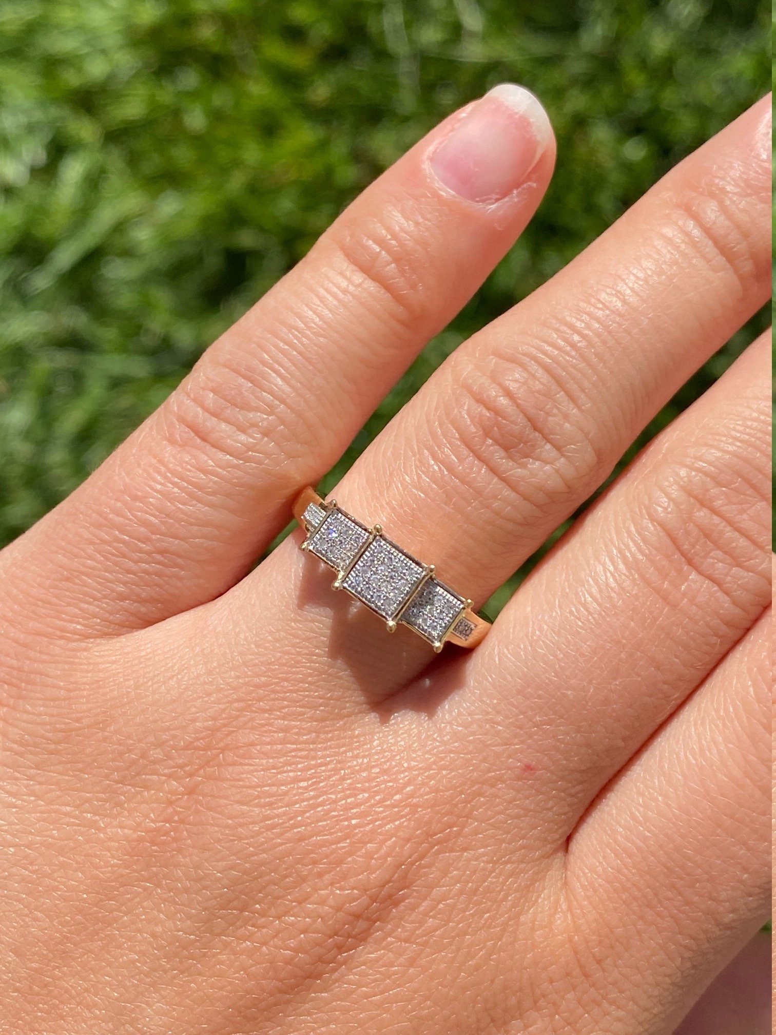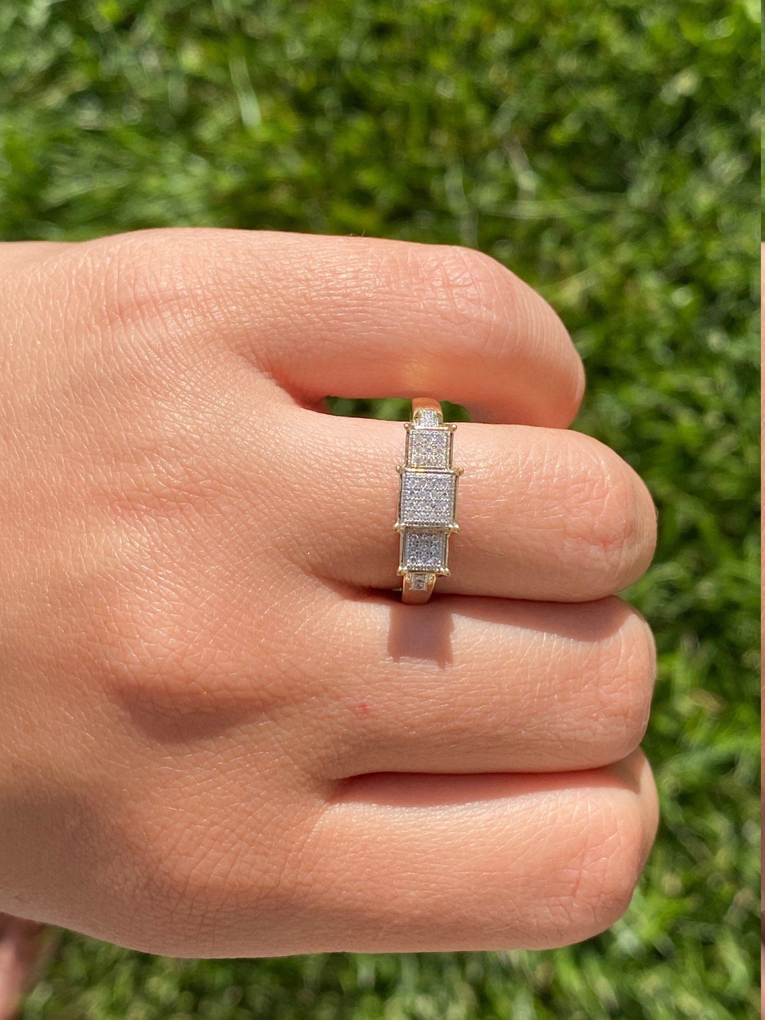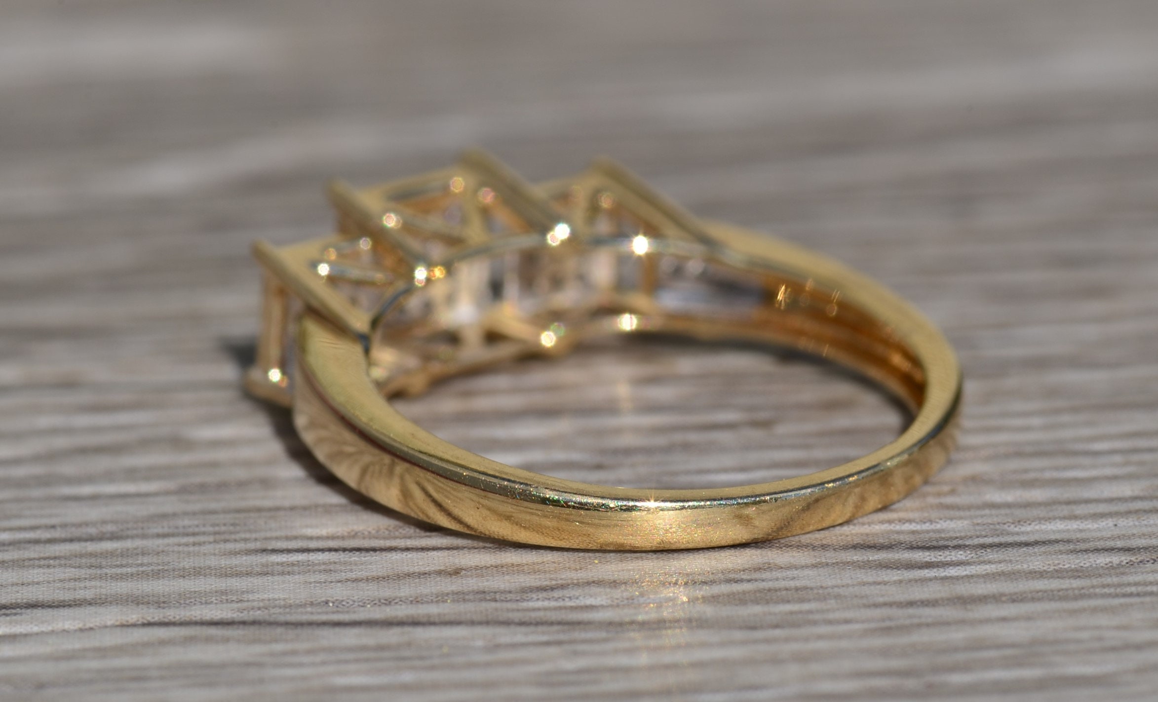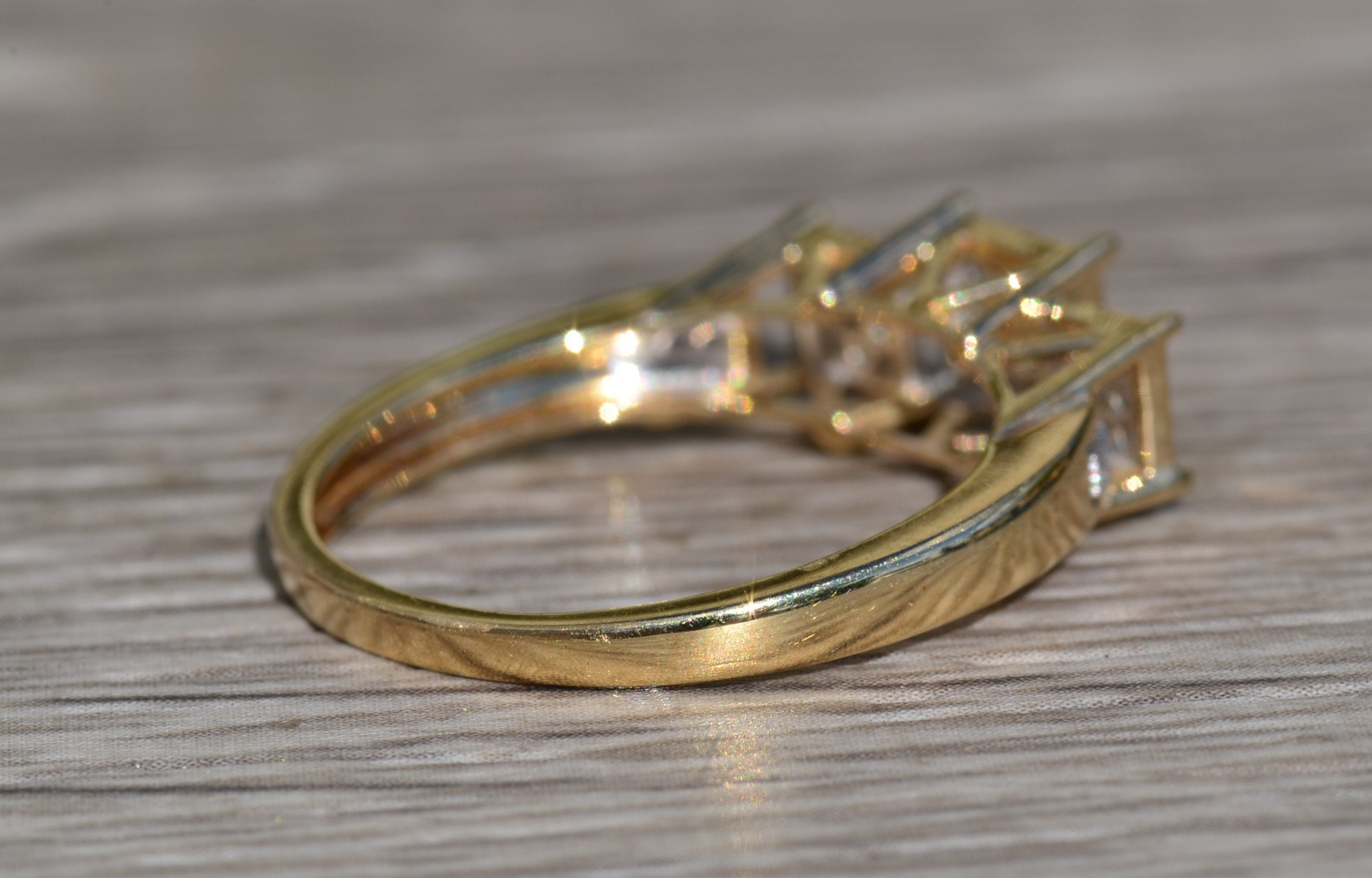 Ladies Diamond Engagement Style Ring in Yellow Gold. This ladies ring features 0.15 total carats of diamonds throughout in a past, present and future style setting. Crafted in yellow gold, this contemporary ring is a finger size 8.25 yet is able to be resized for an additional charge.