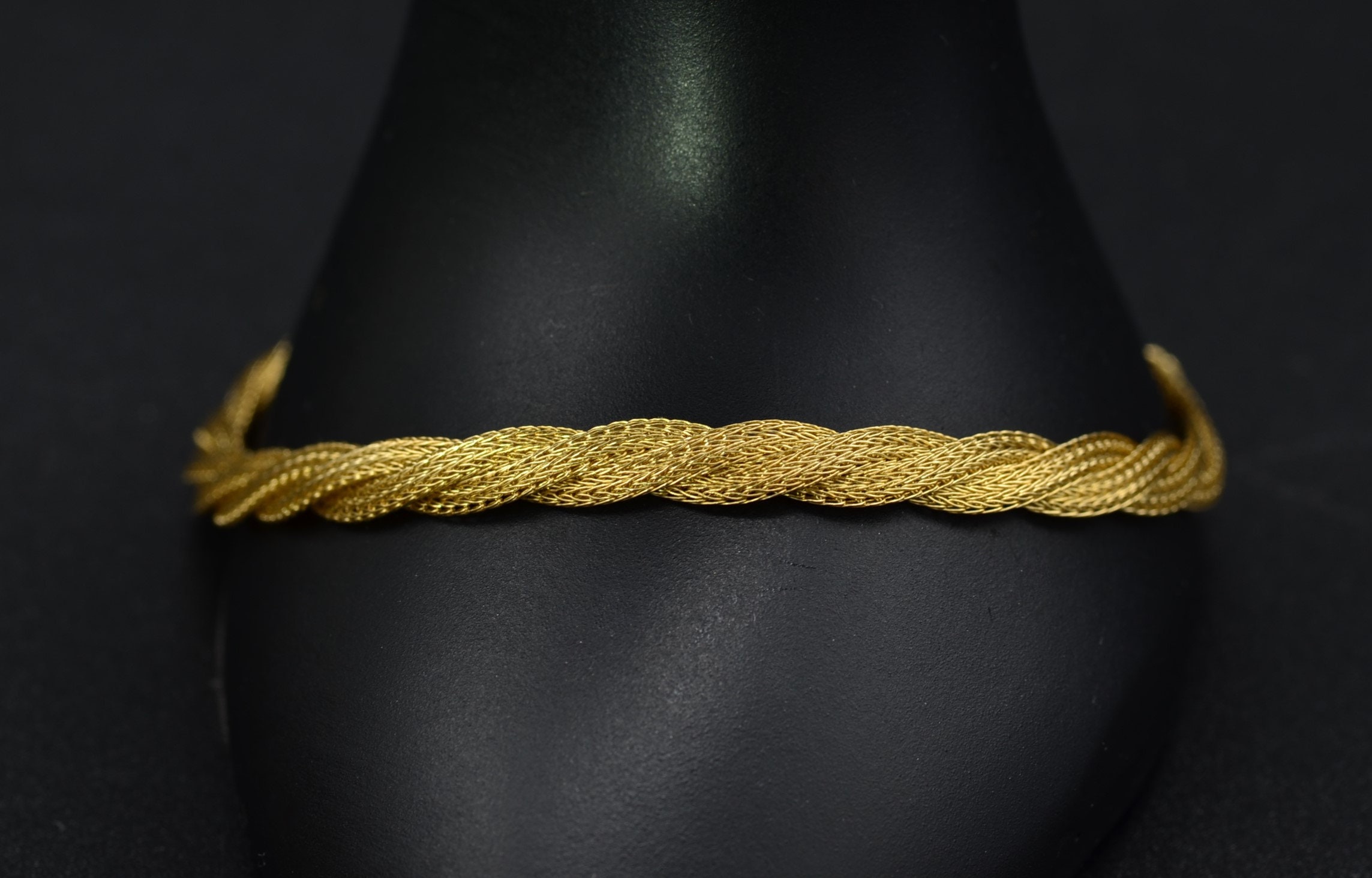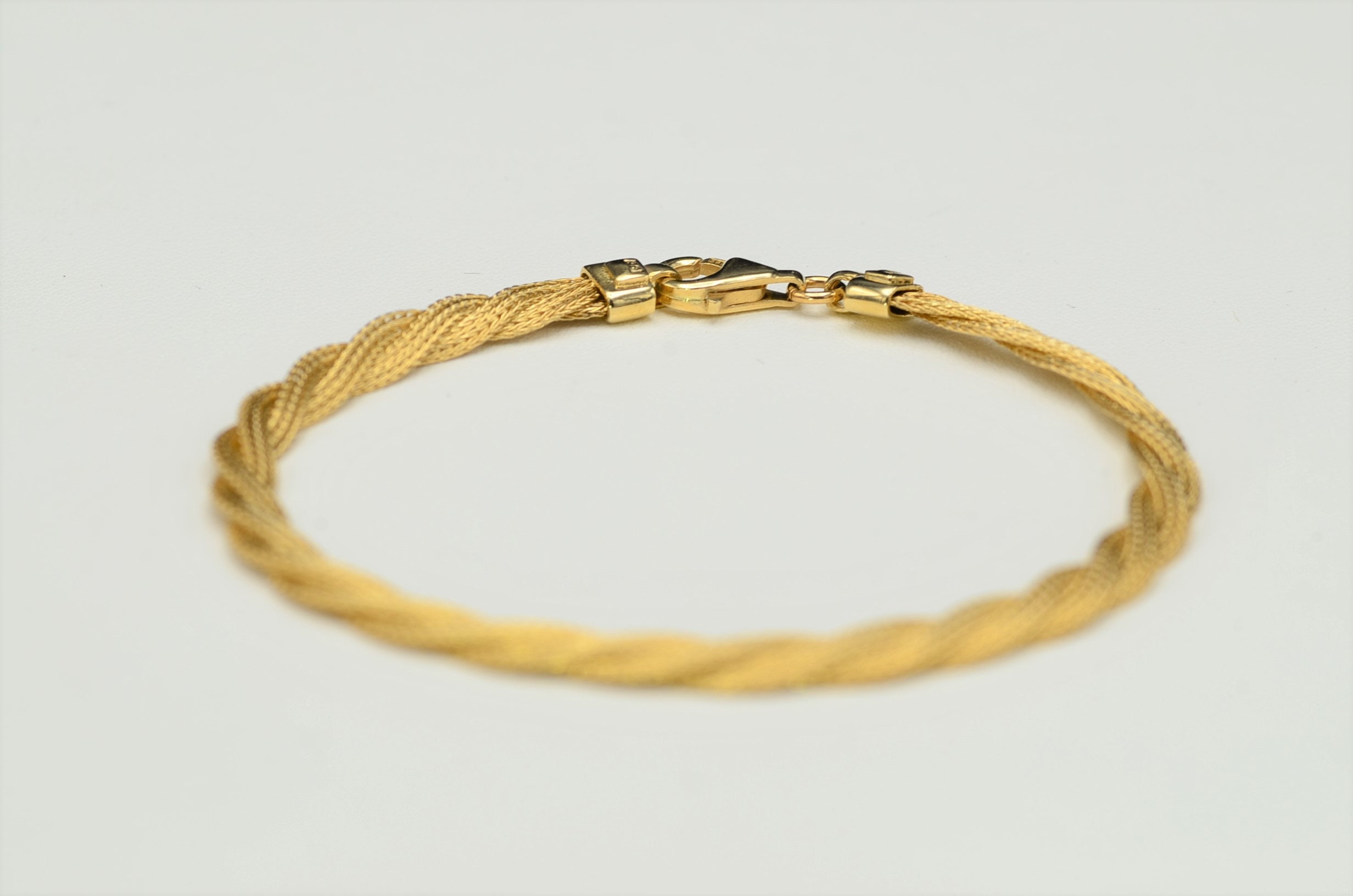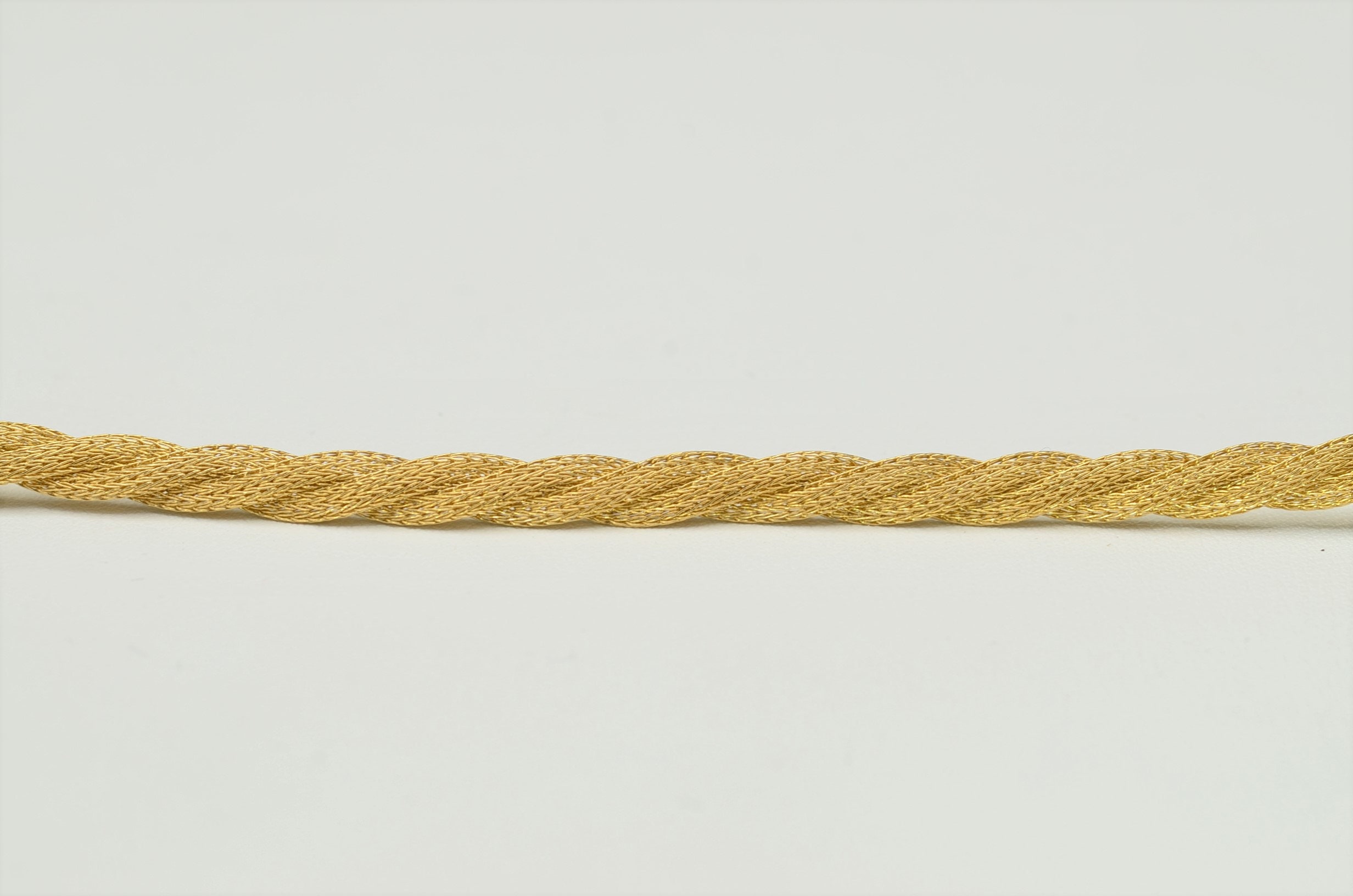 Ladies Twisted Mesh Style Bracelet in 14K Gold. This silky smooth bracelet features an easy to open lobster style clasp and measures 7.25 inches in length. Three separate mesh links are weaved together and wear silky smooth to the wearer.