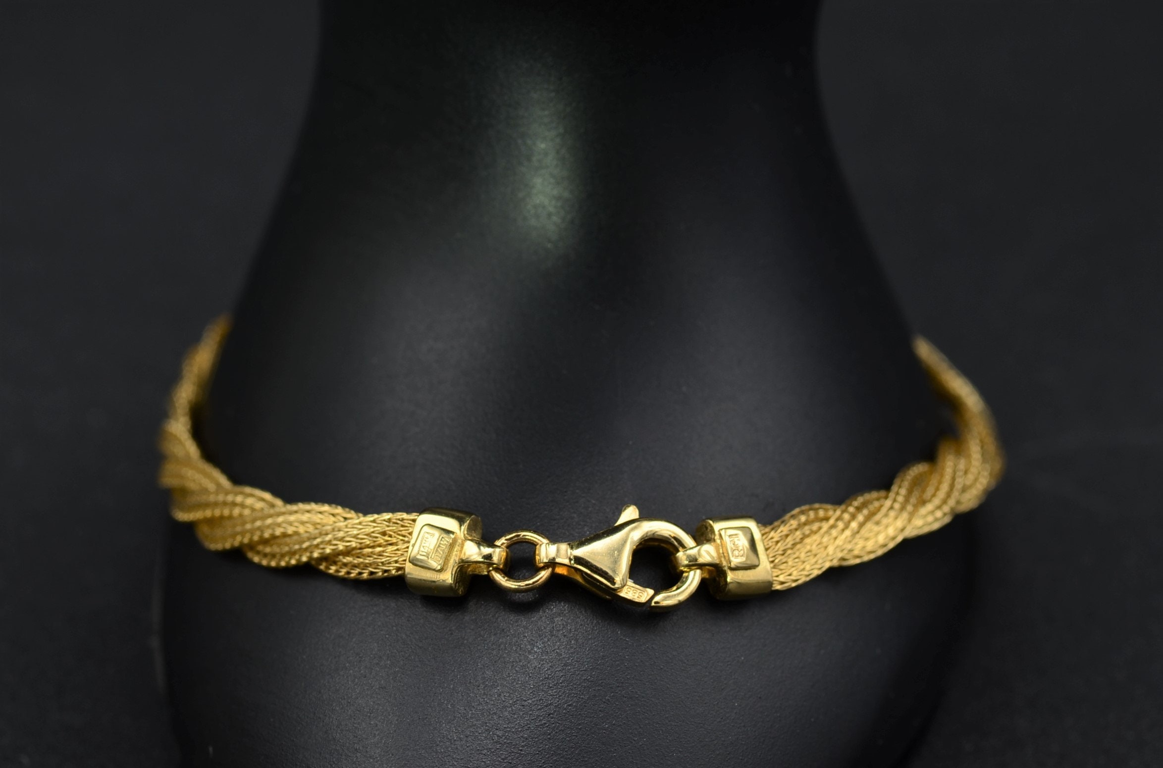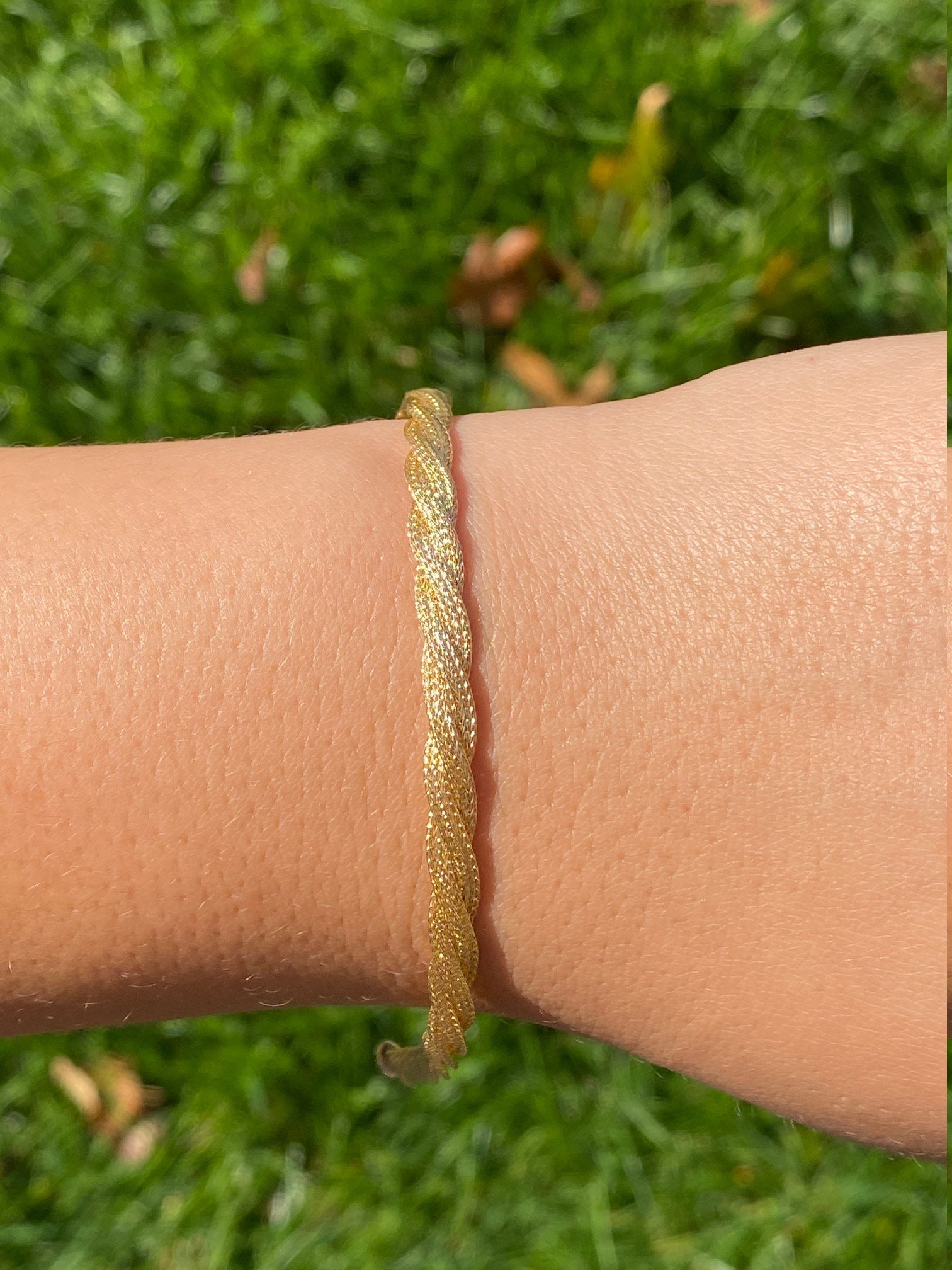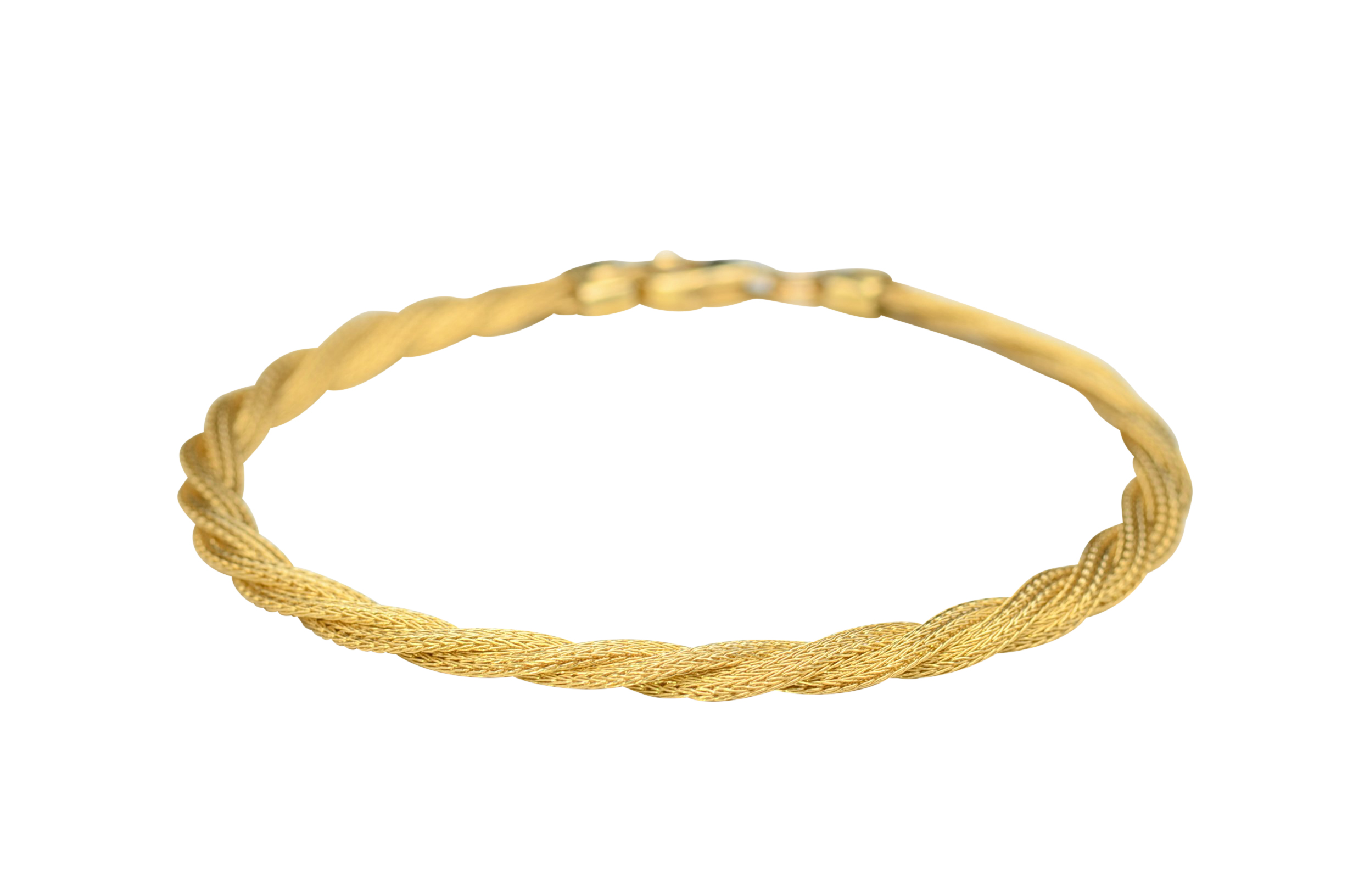 Ladies Twisted Mesh Style Bracelet in 14K Gold. This silky smooth bracelet features an easy to open lobster style clasp and measures 7.25 inches in length. Three separate mesh links are weaved together and wear silky smooth to the wearer.