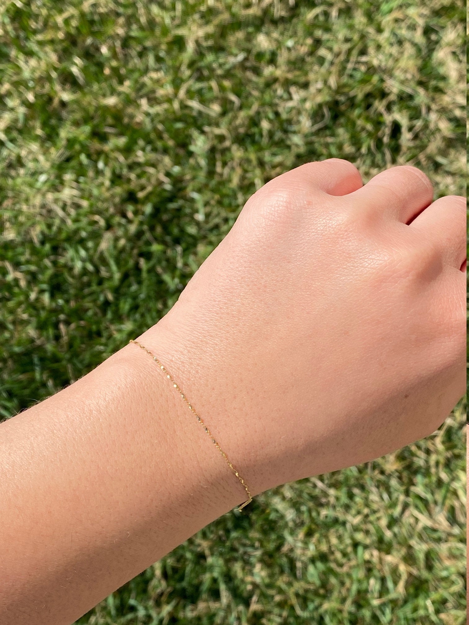 Thin 14 Karat Yellow Gold Twisted Bracelet. This delicate bracelet can be worn by itself or with your favorite stack. The bracelet measures 7 inches in length.