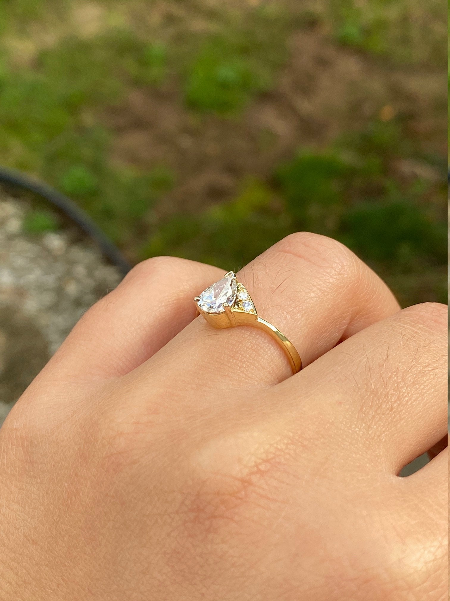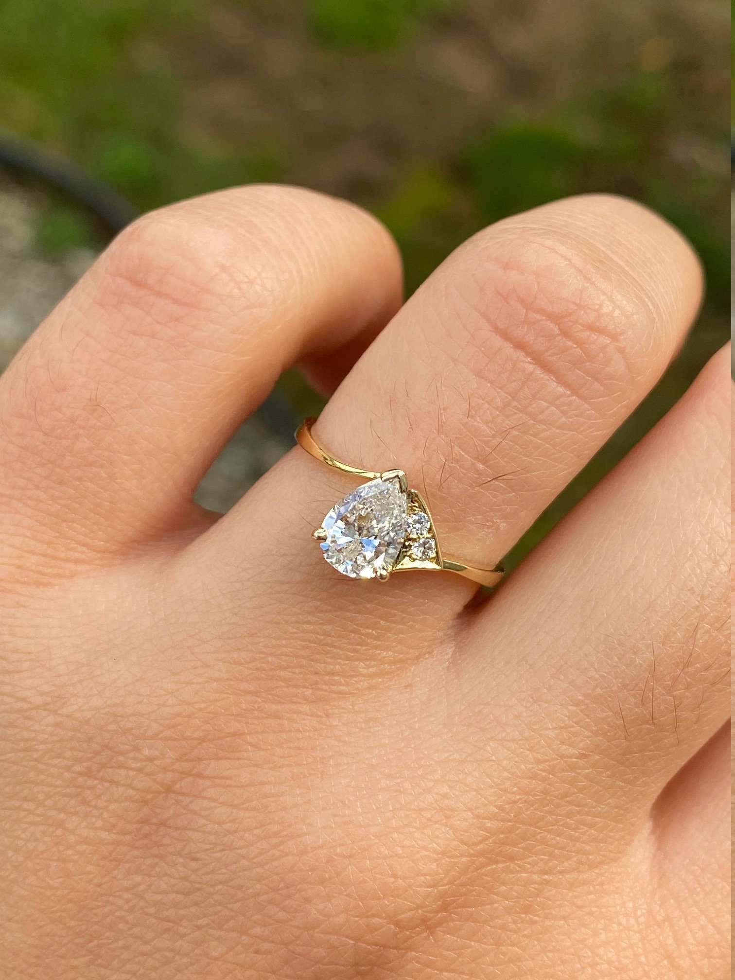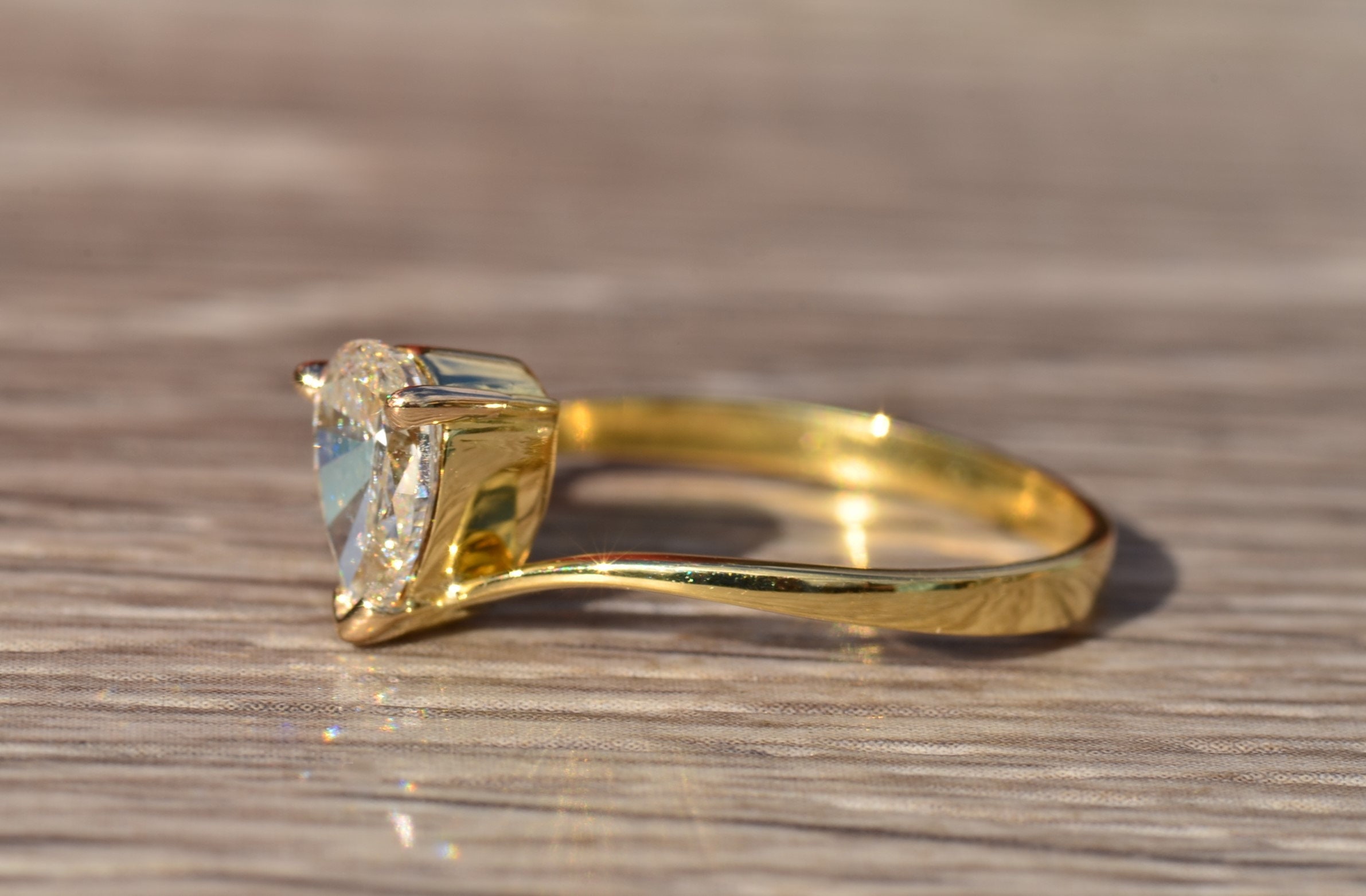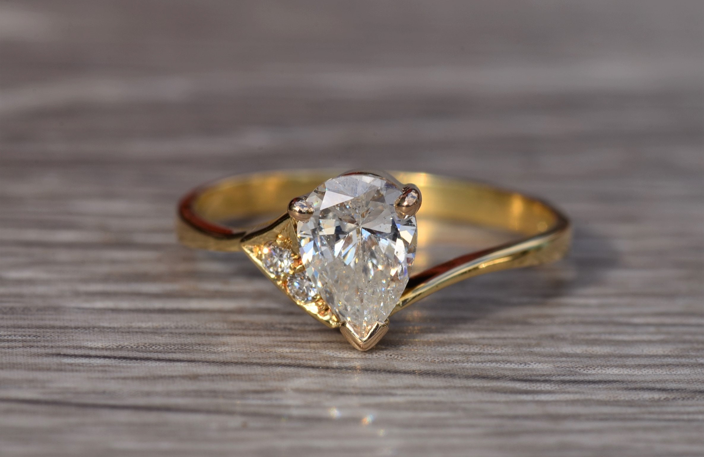 18 Karat Yellow Gold Custom Modified Modern Bypass Diamond Ring. This contemporary ring features a 0.94 carat pear shaped diamond. This diamond has an approximate Gemological Institute of America clarity grade of I1, a color grade of I. Sweeping to one side of low set pear is a flaired triangular section set with 0.03ctw in side diamonds. This unique ring is a finger size 7 1/2, yet can be adjusted in size and is crafted in 18 karat yellow gold.