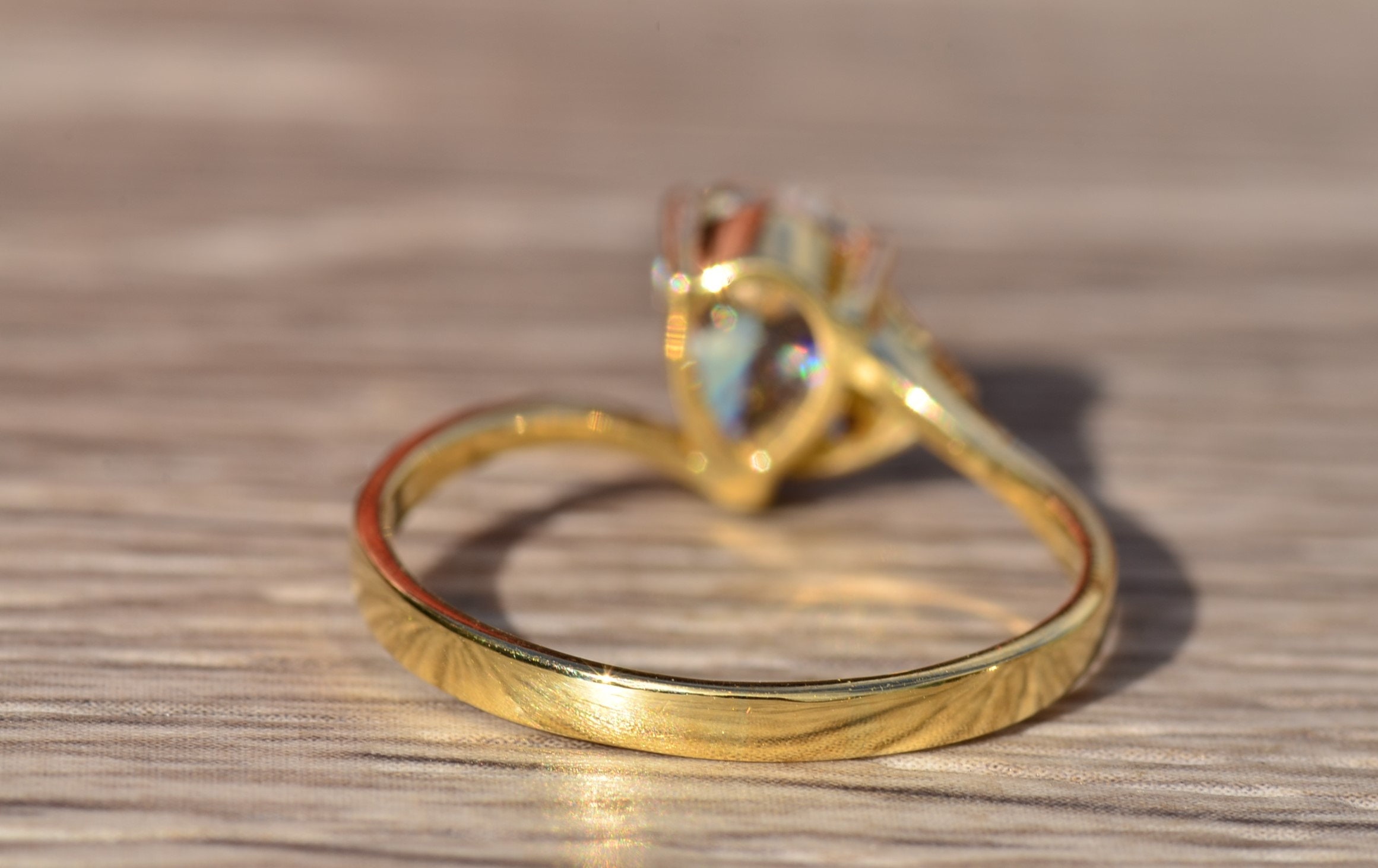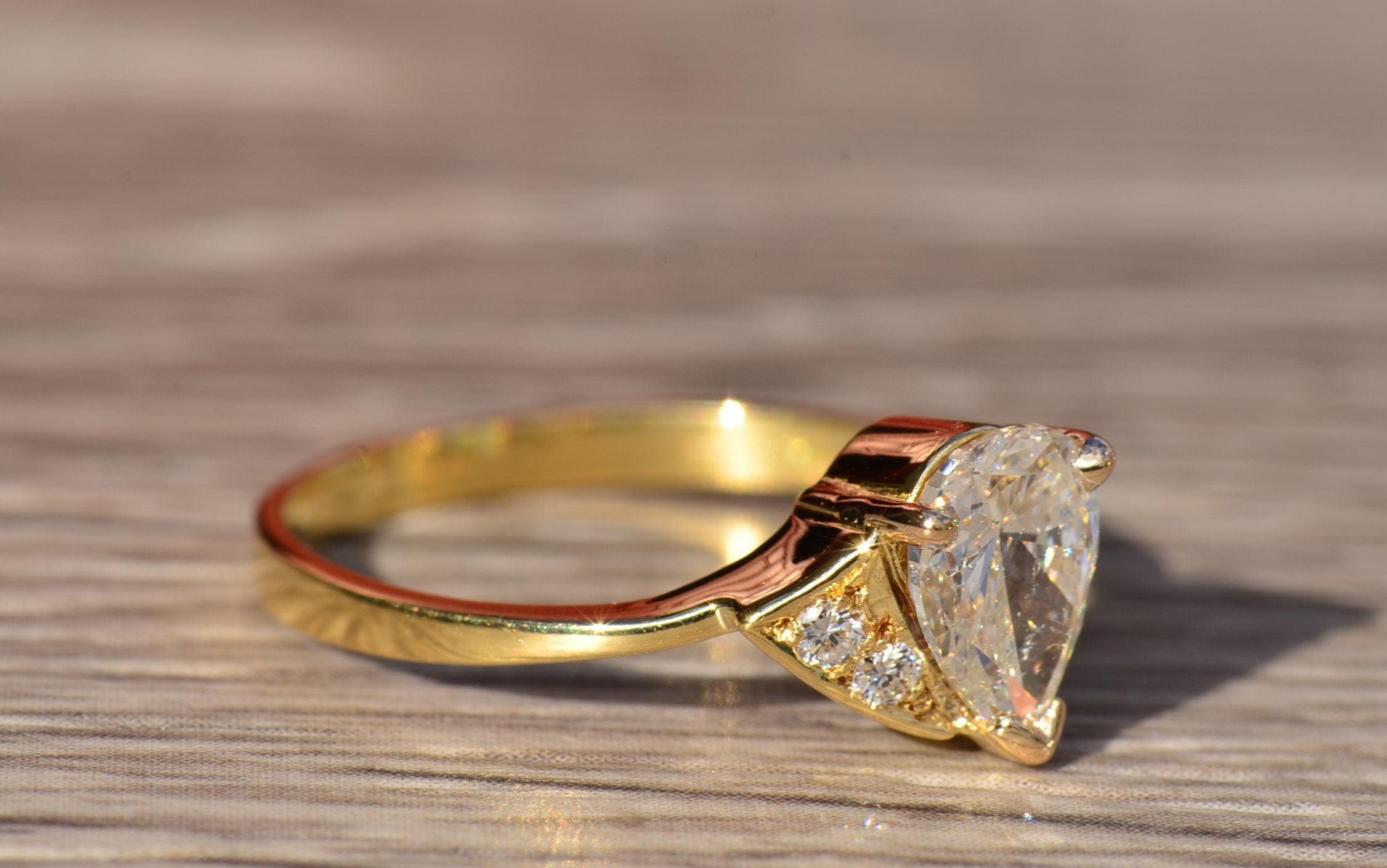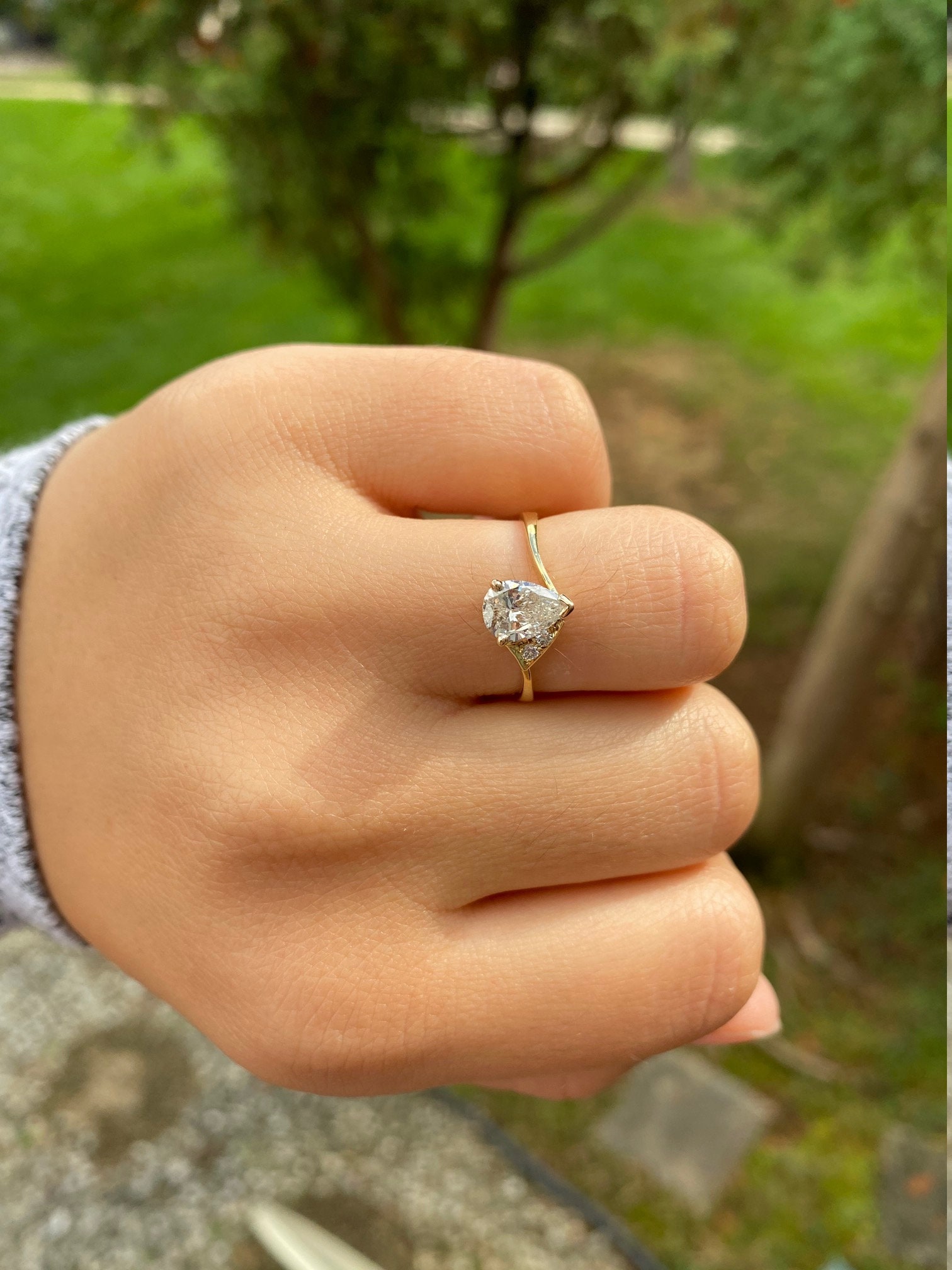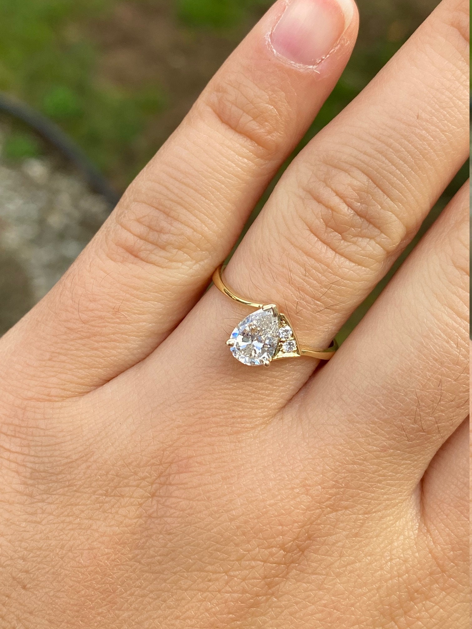 18 Karat Yellow Gold Custom Modified Modern Bypass Diamond Ring. This contemporary ring features a 0.94 carat pear shaped diamond. This diamond has an approximate Gemological Institute of America clarity grade of I1, a color grade of I. Sweeping to one side of low set pear is a flaired triangular section set with 0.03ctw in side diamonds. This unique ring is a finger size 7 1/2, yet can be adjusted in size and is crafted in 18 karat yellow gold.
