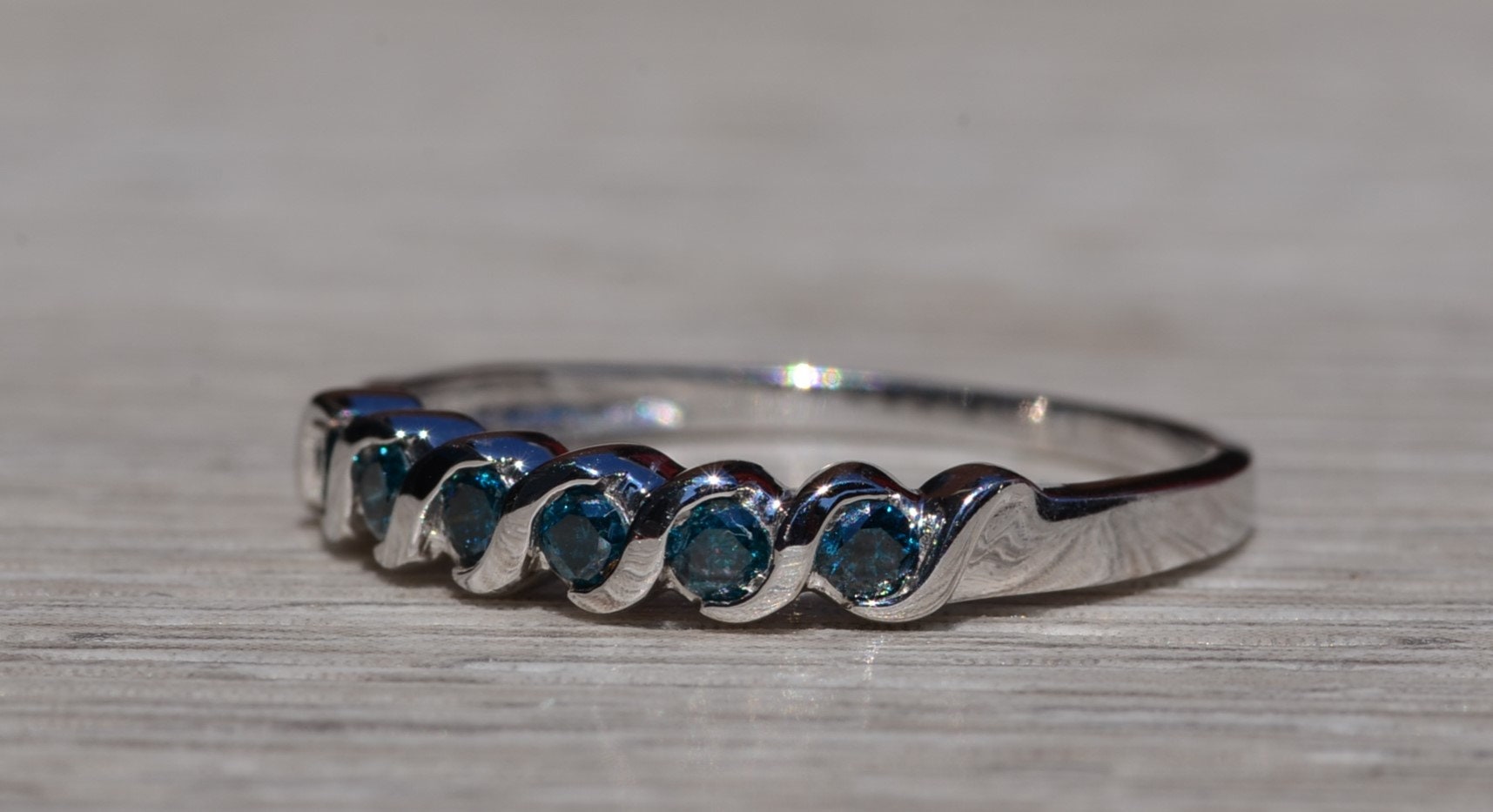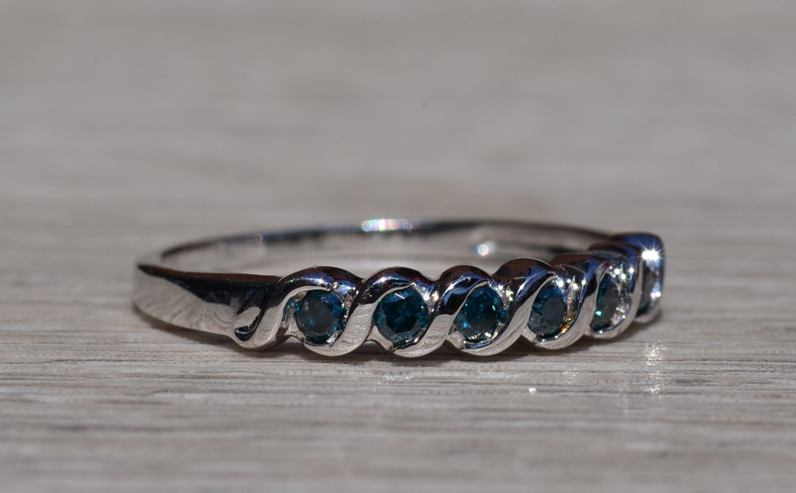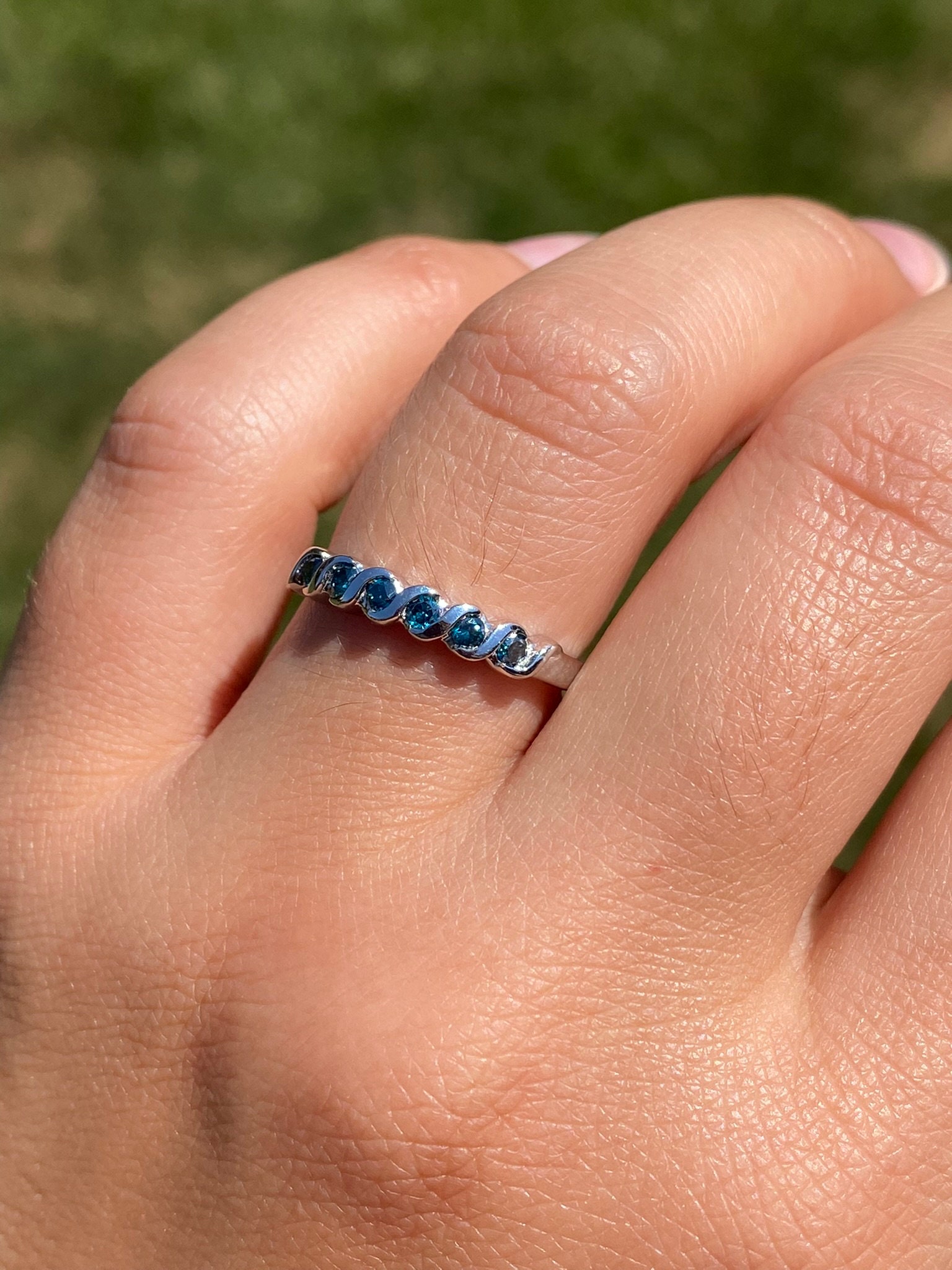The Pleasant Grove: Waved Blue Diamond Stackable Band. The band features round brilliant-cut blue diamonds with a total carat weight of 0.18 carats across the center. Between each blue diamond is a waved white gold section to complete the look. The ring is crafted in white gold and is currently a finger size 7 yet can be adjusted to any finger size for an additional charge on request.