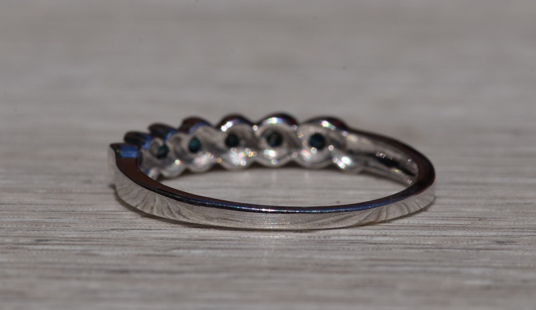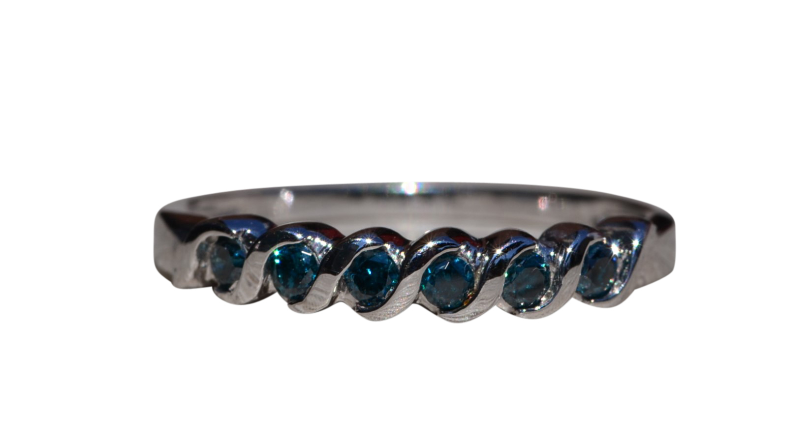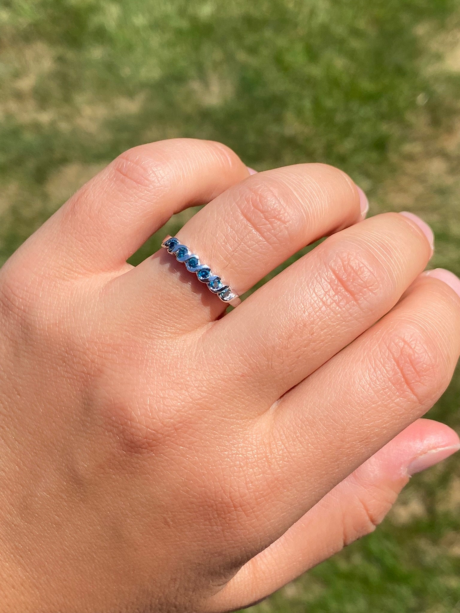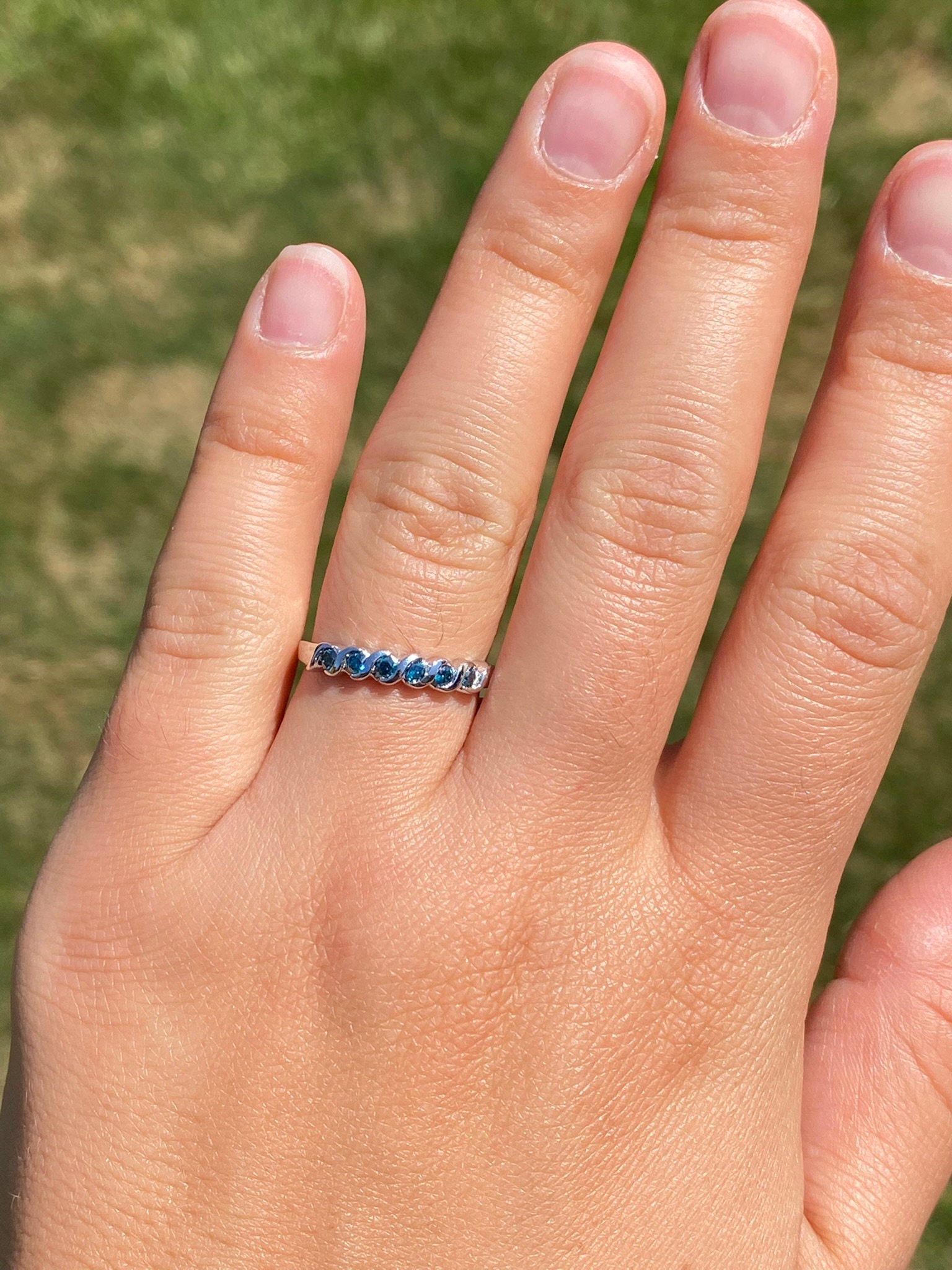 The Pleasant Grove: Waved Blue Diamond Stackable Band. The band features round brilliant-cut blue diamonds with a total carat weight of 0.18 carats across the center. Between each blue diamond is a waved white gold section to complete the look. The ring is crafted in white gold and is currently a finger size 7 yet can be adjusted to any finger size for an additional charge on request.
