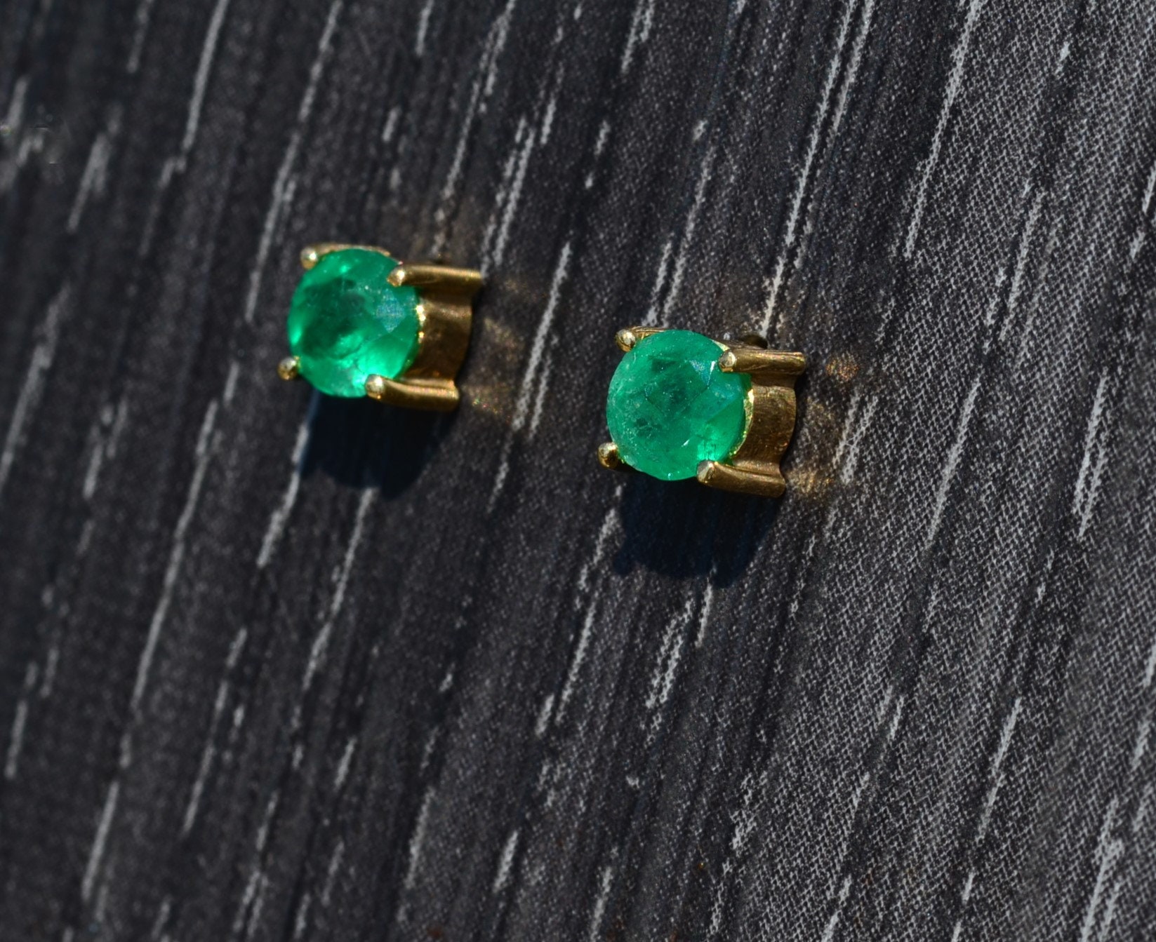 Natural Colombian Emerald Studs in Yellow Gold. The studs are crafted in rich 18 karat yellow gold and are very solid in form for a nice weight in studs. Each ear features a Natural Colombian Emerald that is vivid in saturation with a weight of approximately 0.50 carats each. The total estimated carat weight is 1.00 carats. The earrings are finished with heavy gauge push style backings.
